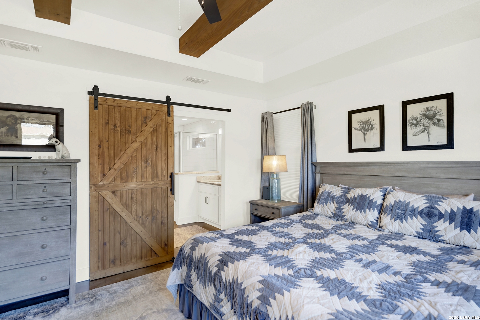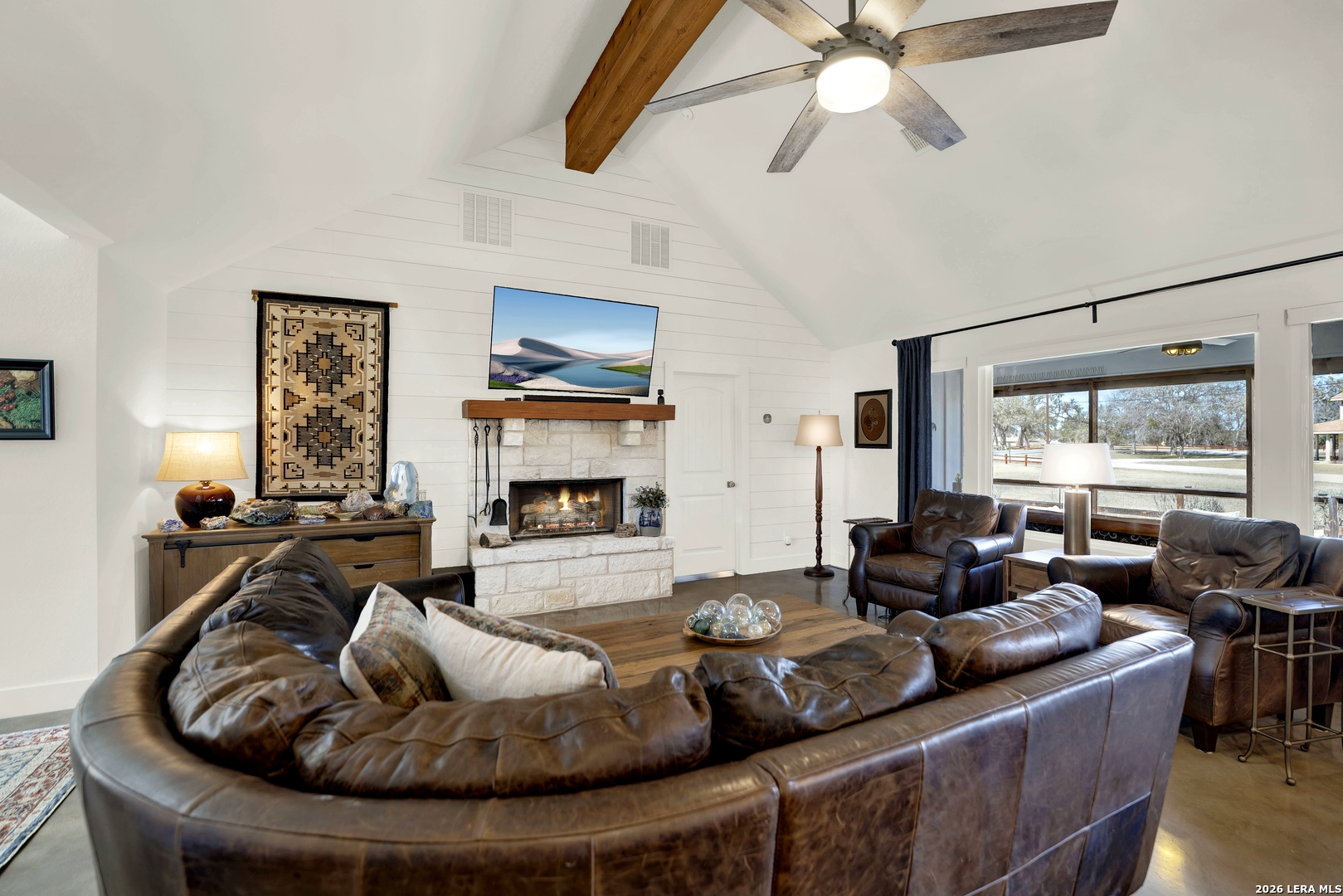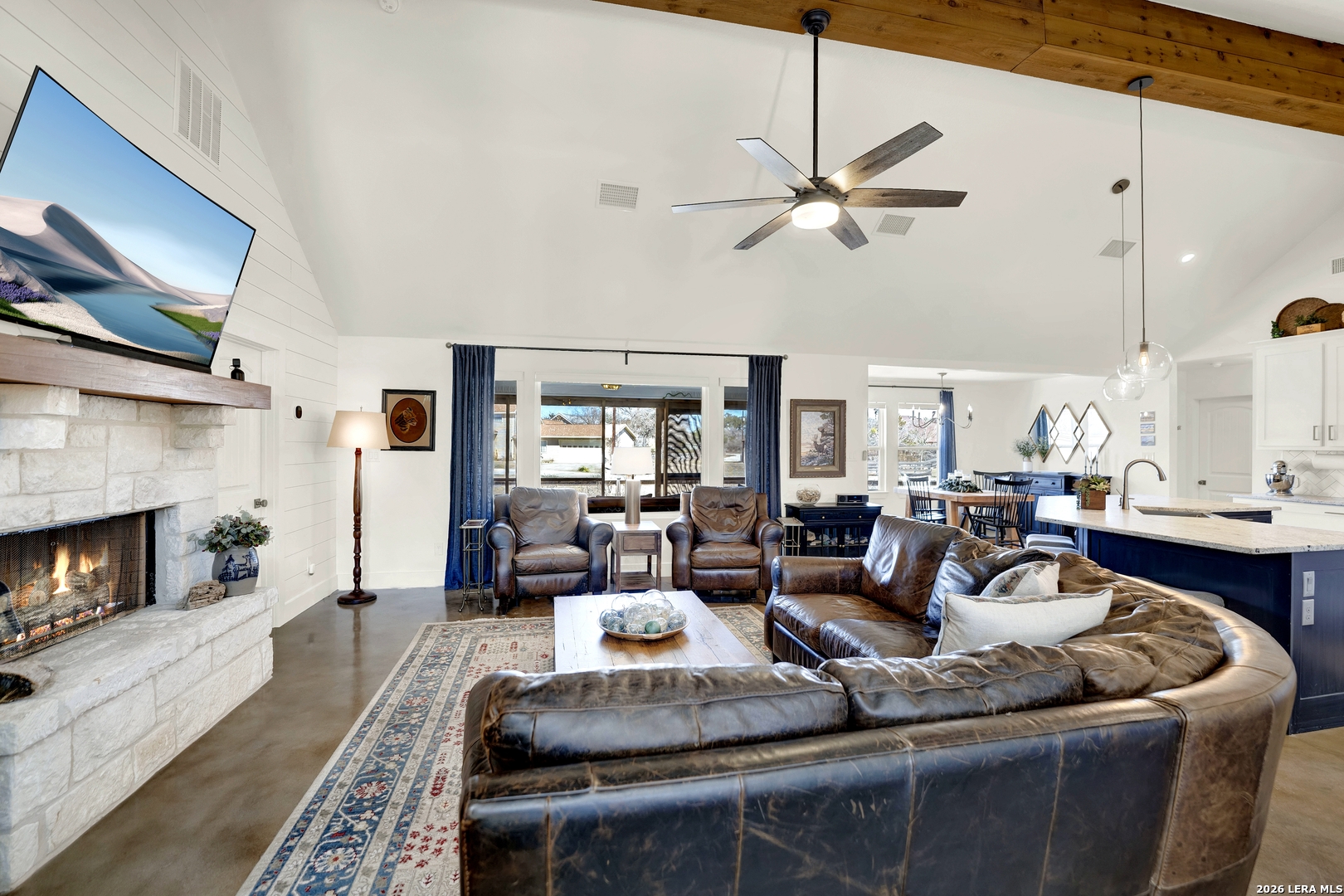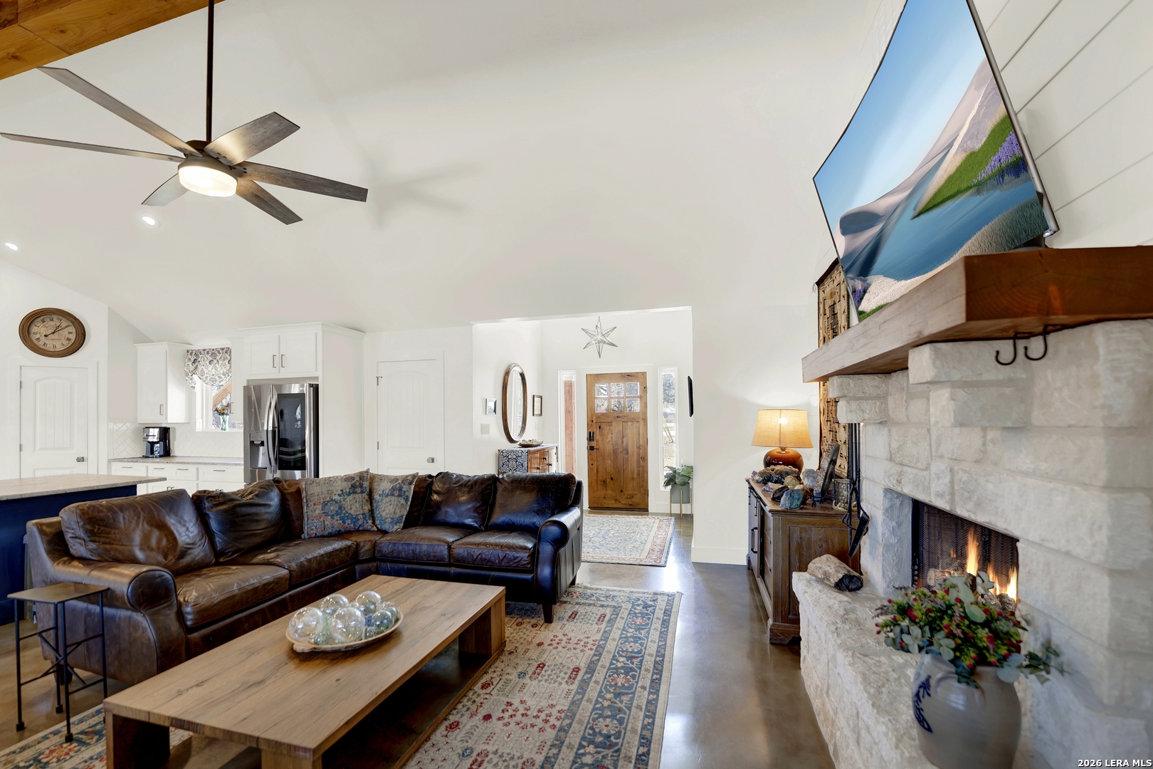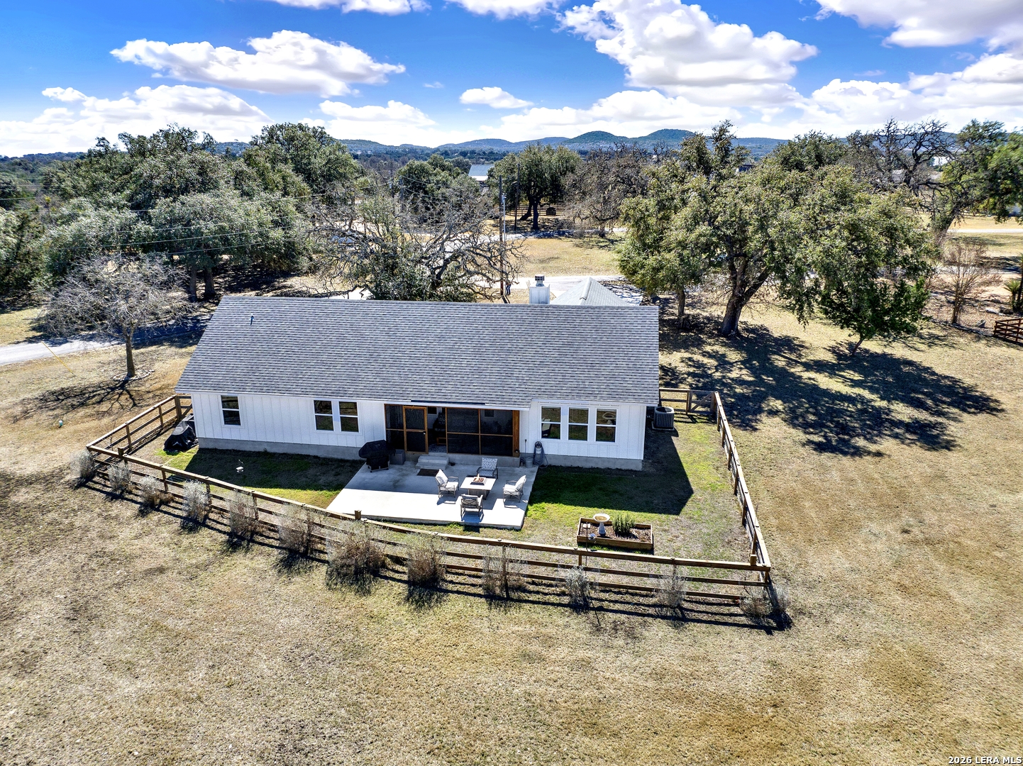 Located on the 15th hole in the sought-after Flying L Ranch community, this stunning 4-bedroom, 2-bath custom-built home offers exceptional Hill Country living with golf course views and thoughtful upgrades throughout. Inside, you'll find an open-concept design highlighted by a striking stone fireplace with a wood beam in the living room, creating a warm and inviting focal point. Tall window treatments and drapes remain, adding elegance and privacy to the abundant natural light. The kitchen is designed for both beauty and convenience, featuring touchless sink, ample cabinetry, and an LG stainless steel refrigerator that conveys with the home. A built-in mudroom connects seamlessly to the laundry area for added functionality. The spacious primary suite offers a peaceful retreat with a sliding barn door leading into the ensuite bath, complete with separate vanities and sinks. Additional bedrooms feature deep closets with built-ins and pull-up/pull-down shades. One guest bedroom even includes direct attic access for convenient extra storage. Additional highlights include; Owned water softener, Insulated garage door, Dedicated golf cart parking area in the garage, Garage shelving to remain and Extra-wide driveway. Step outside to enjoy the extended covered patio-perfect for relaxing or entertaining-with the option to purchase the patio furniture. All of this and offering beautiful views, a true resort-style atmosphere that is situated in Bandera, known as the "Cowboy Capital of the World," this home blends luxury details with small-town charm.