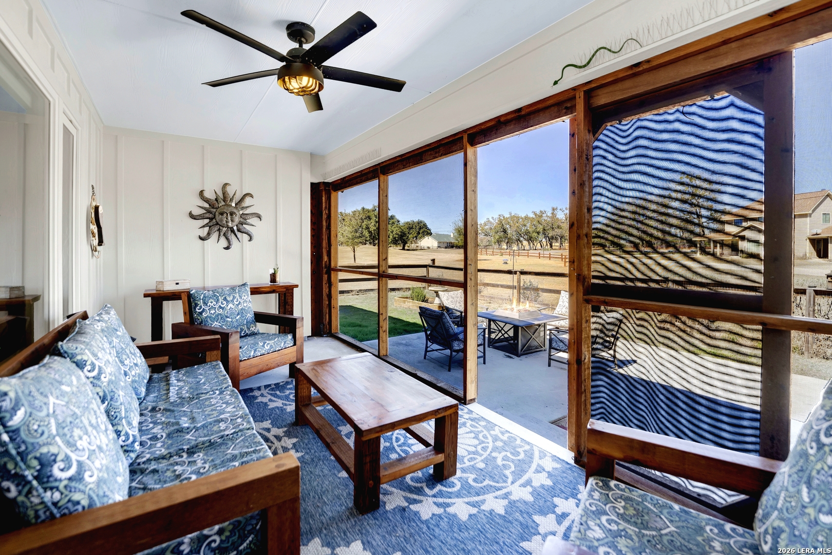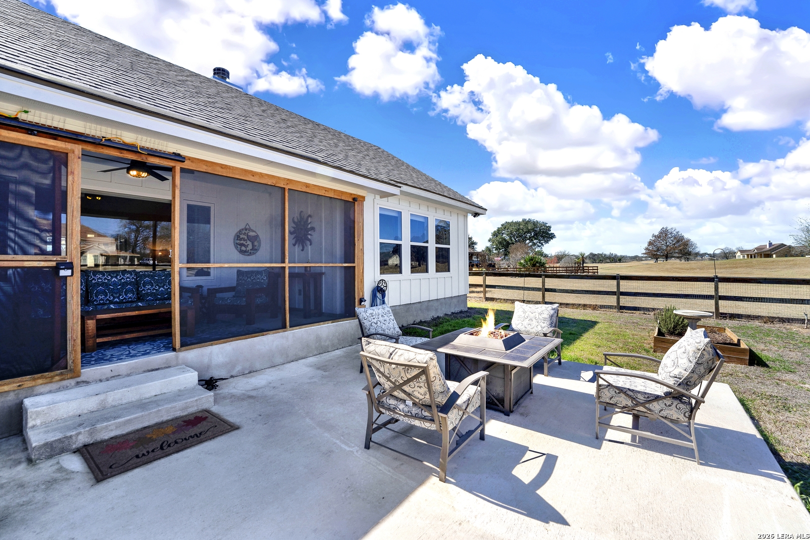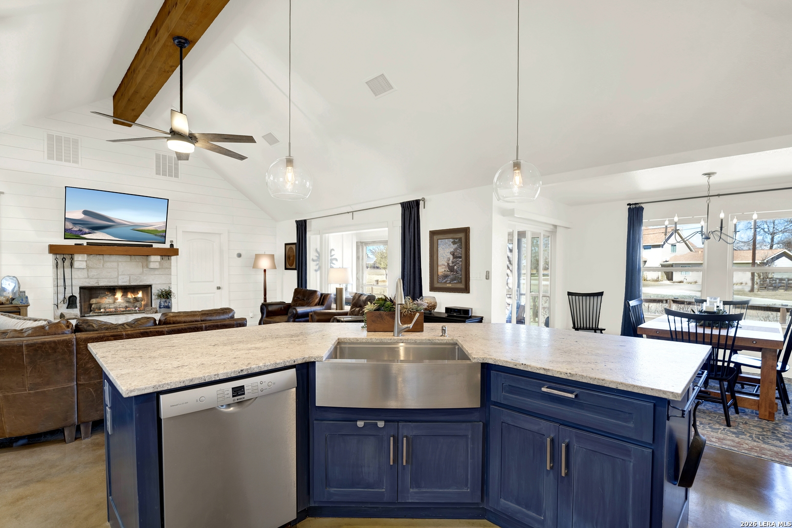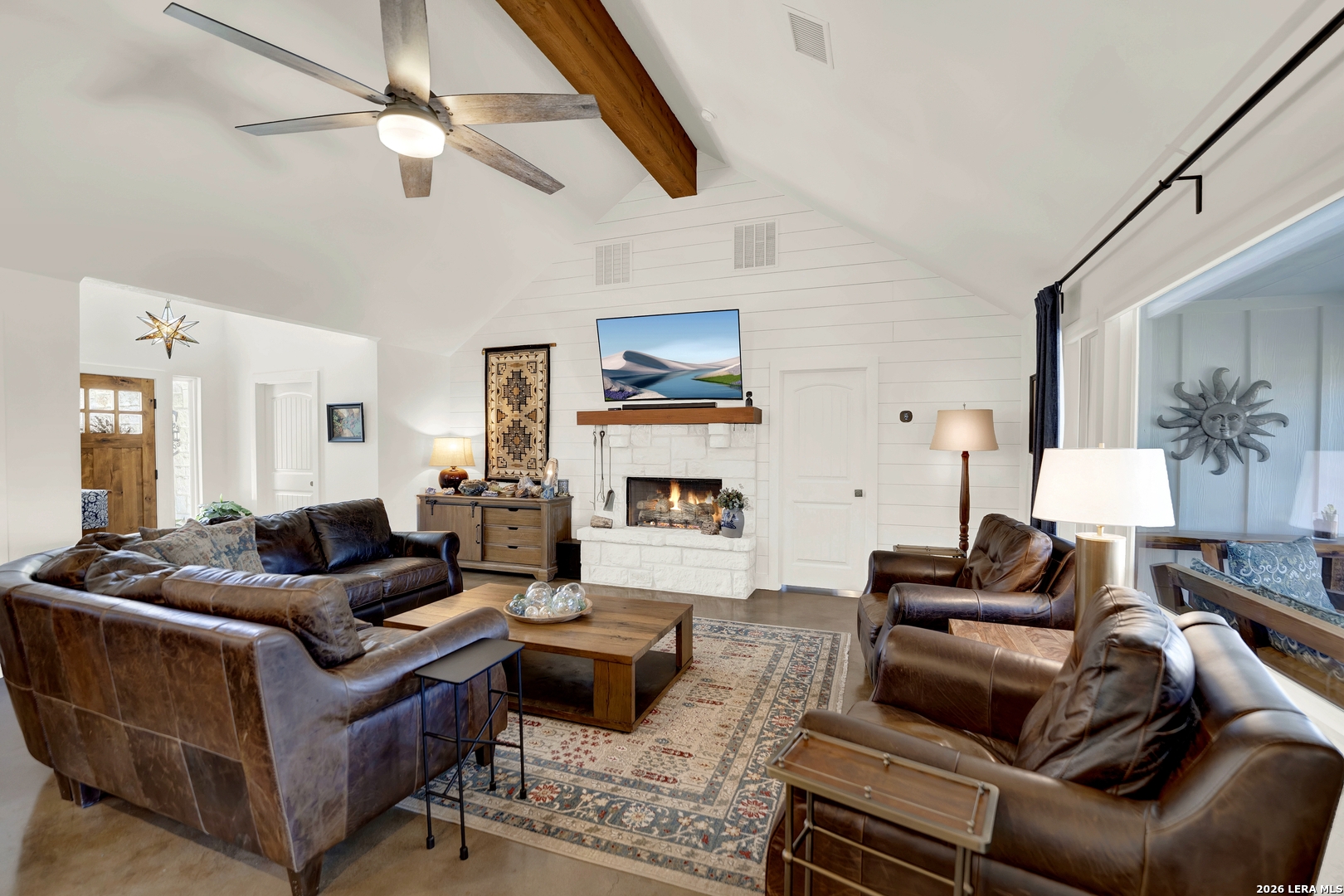 Located on the 15th hole in the sought-after Flying L Ranch community, this stunning 4-bedroom, 2-bath custom-built home offers exceptional Hill Country living with golf course views and thoughtful upgrades throughout. Inside, you'll find an open-concept design highlighted by a striking stone fireplace with a wood beam in the living room, creating a warm and inviting focal point. Tall window treatments and drapes remain, adding elegance and privacy to the abundant natural light. The kitchen is designed for both beauty and convenience, featuring touchless sink, ample cabinetry, and an LG stainless steel refrigerator that conveys with the home. A built-in mudroom connects seamlessly to the laundry area for added functionality. The spacious primary suite offers a peaceful retreat with a sliding barn door leading into the ensuite bath, complete with separate vanities and sinks. Additional bedrooms feature deep closets with built-ins and pull-up/pull-down shades. One guest bedroom even includes direct attic access for convenient extra storage. Additional highlights include; Owned water softener, Insulated garage door, Dedicated golf cart parking area in the garage, Garage shelving to remain and Extra-wide driveway. Step outside to enjoy the extended covered patio-perfect for relaxing or entertaining-with the option to purchase the patio furniture. All of this and offering beautiful views, a true resort-style atmosphere that is situated in Bandera, known as the "Cowboy Capital of the World," this home blends luxury details with small-town charm.