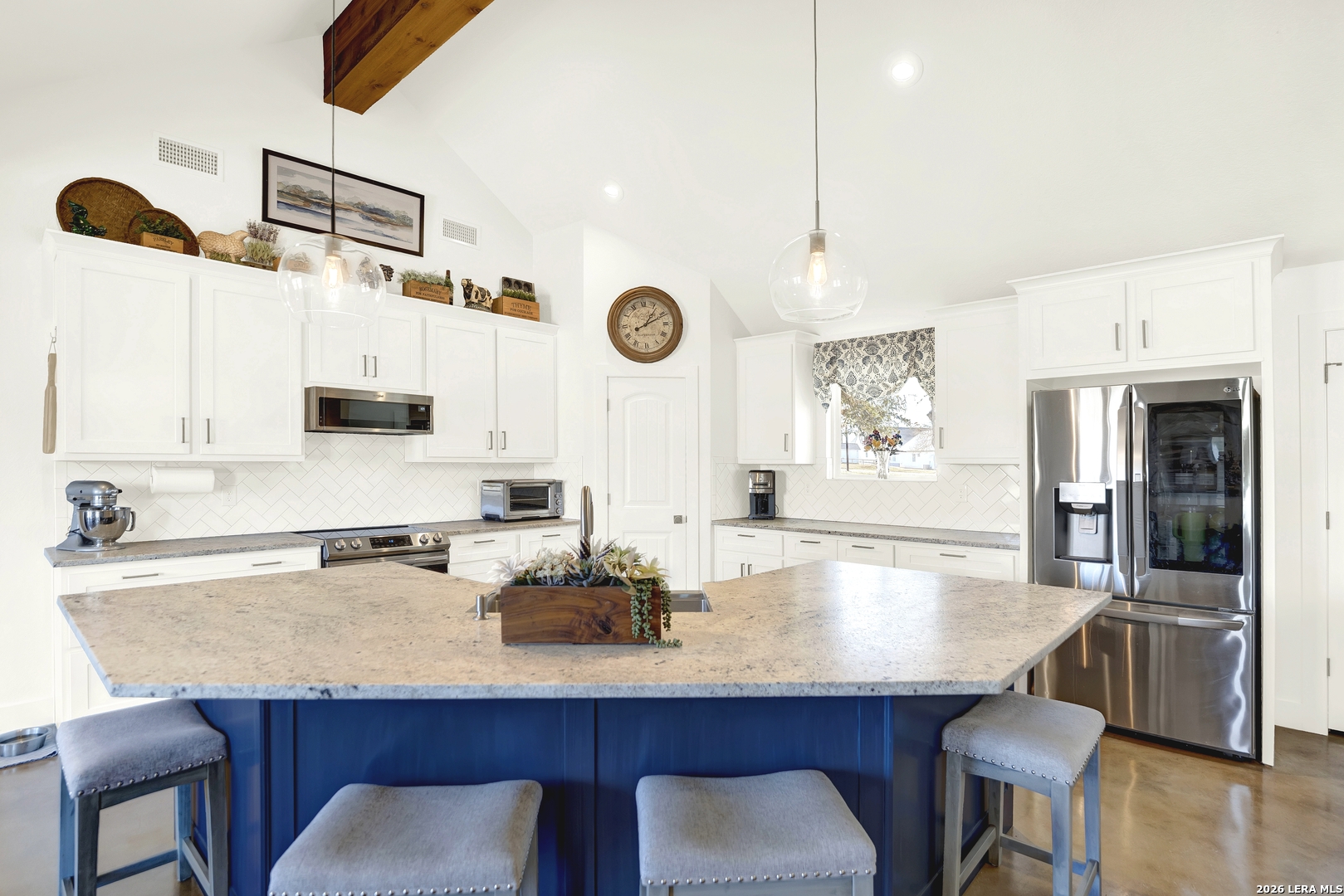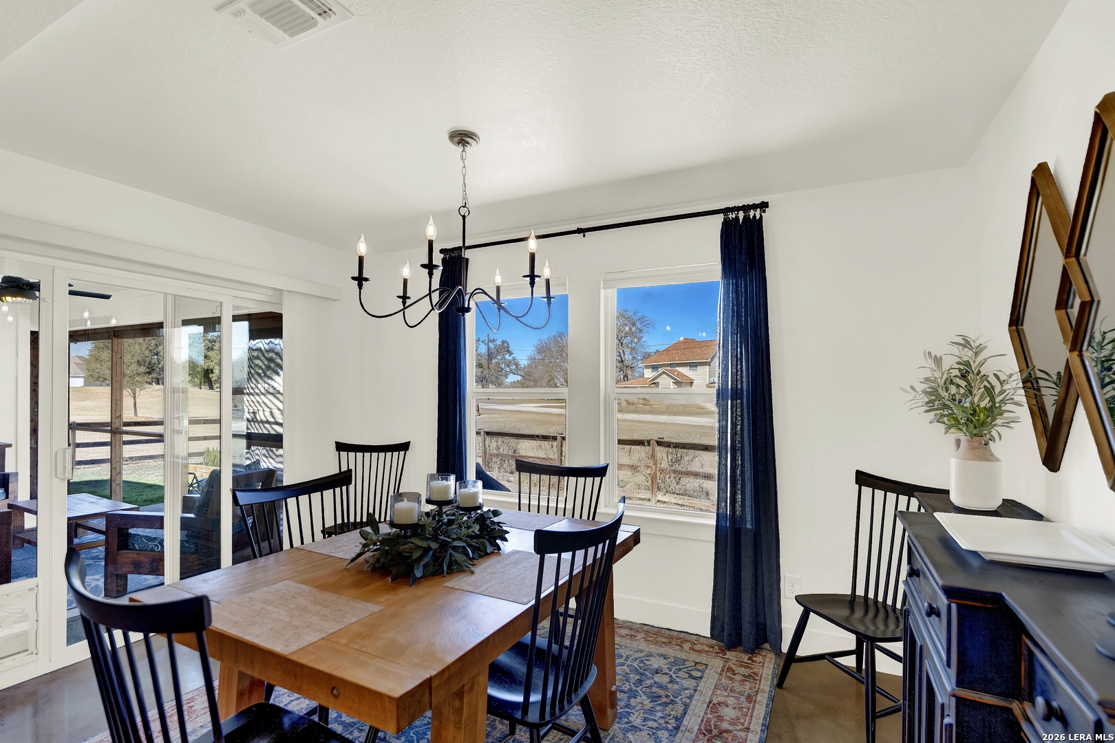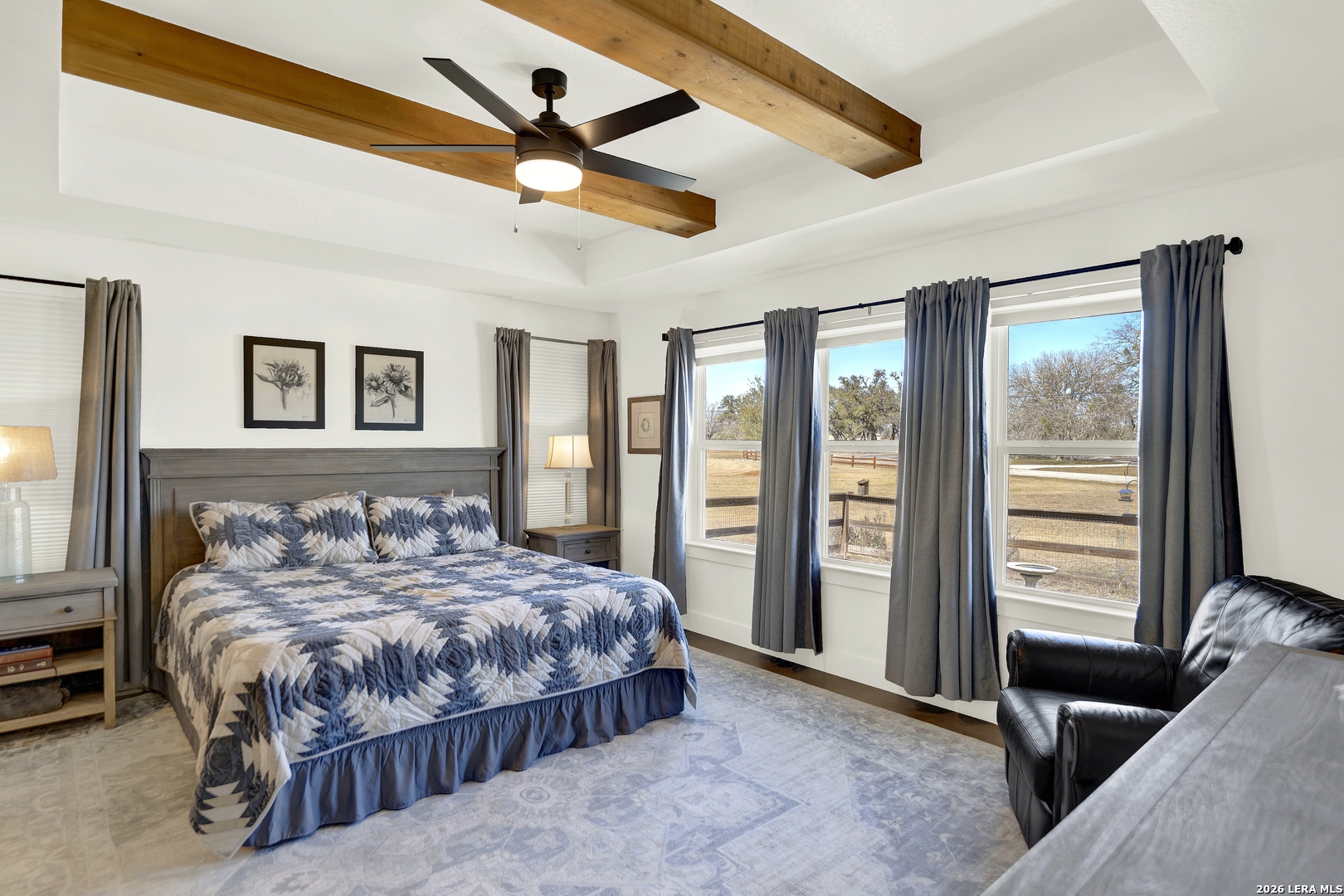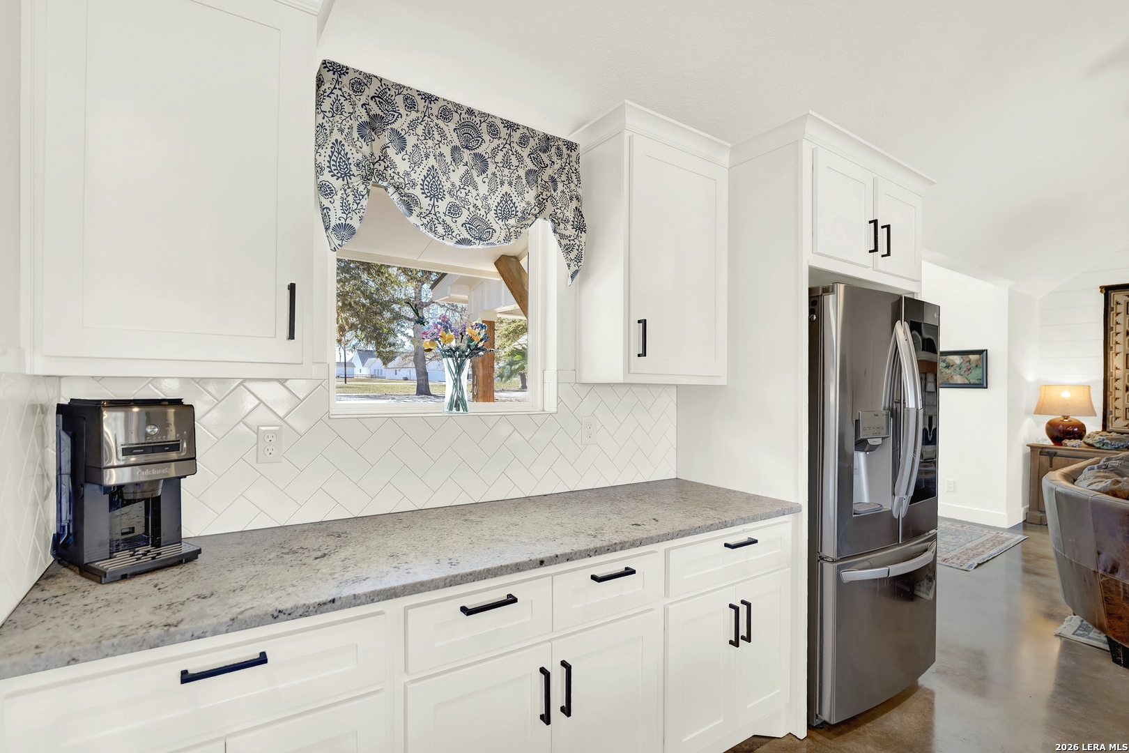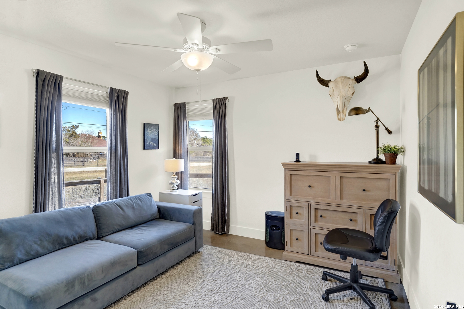 Located on the 15th hole in the sought-after Flying L Ranch community, this stunning 4-bedroom, 2-bath custom-built home offers exceptional Hill Country living with golf course views and thoughtful upgrades throughout. Inside, you'll find an open-concept design highlighted by a striking stone fireplace with a wood beam in the living room, creating a warm and inviting focal point. Tall window treatments and drapes remain, adding elegance and privacy to the abundant natural light. The kitchen is designed for both beauty and convenience, featuring touchless sink, ample cabinetry, and an LG stainless steel refrigerator that conveys with the home. A built-in mudroom connects seamlessly to the laundry area for added functionality. The spacious primary suite offers a peaceful retreat with a sliding barn door leading into the ensuite bath, complete with separate vanities and sinks. Additional bedrooms feature deep closets with built-ins and pull-up/pull-down shades. One guest bedroom even includes direct attic access for convenient extra storage. Additional highlights include; Owned water softener, Insulated garage door, Dedicated golf cart parking area in the garage, Garage shelving to remain and Extra-wide driveway. Step outside to enjoy the extended covered patio-perfect for relaxing or entertaining-with the option to purchase the patio furniture. All of this and offering beautiful views, a true resort-style atmosphere that is situated in Bandera, known as the "Cowboy Capital of the World," this home blends luxury details with small-town charm.
