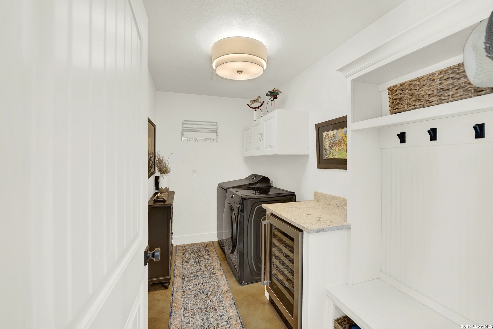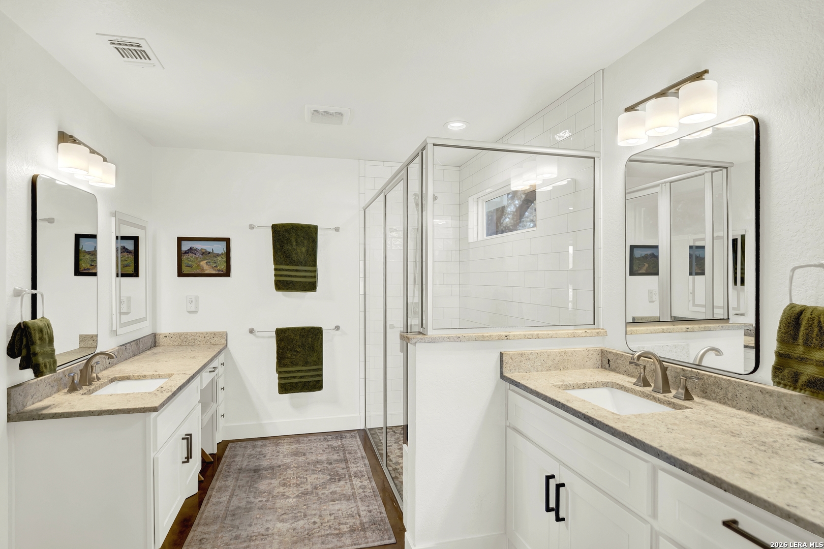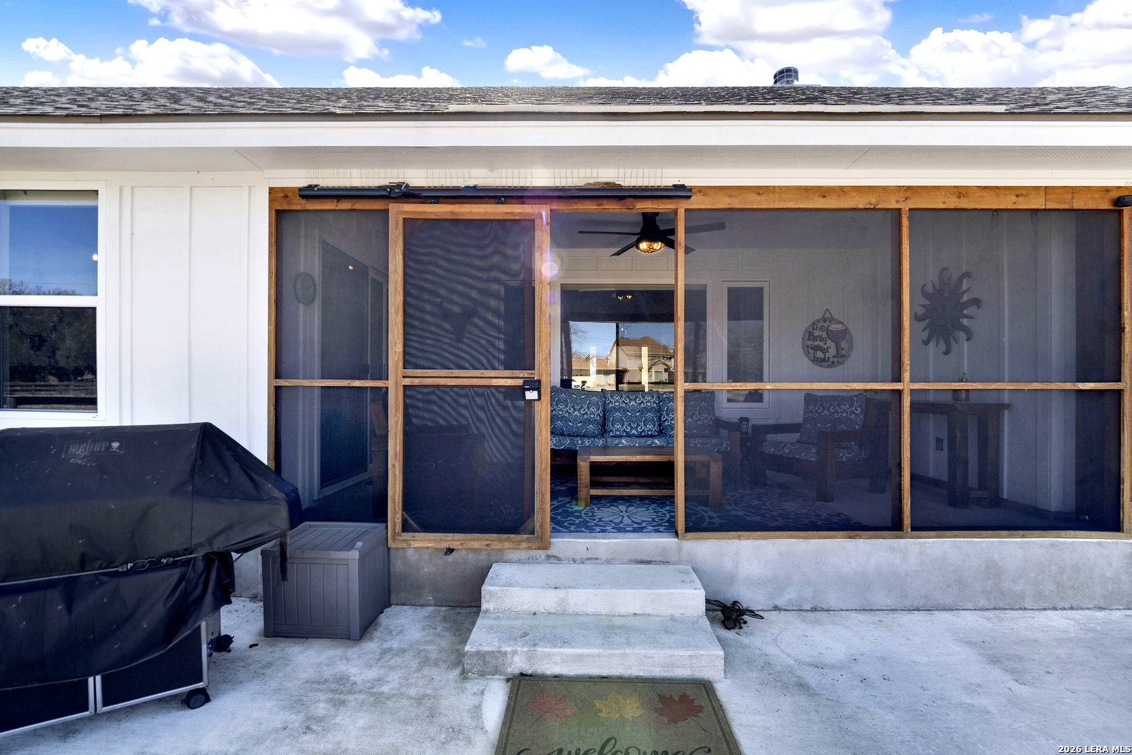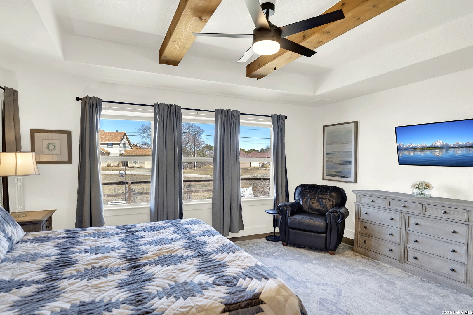 Located on the 15th hole in the sought-after Flying L Ranch community, this stunning 4-bedroom, 2-bath custom-built home offers exceptional Hill Country living with golf course views and thoughtful upgrades throughout. Inside, you'll find an open-concept design highlighted by a striking stone fireplace with a wood beam in the living room, creating a warm and inviting focal point. Tall window treatments and drapes remain, adding elegance and privacy to the abundant natural light. The kitchen is designed for both beauty and convenience, featuring touchless sink, ample cabinetry, and an LG stainless steel refrigerator that conveys with the home. A built-in mudroom connects seamlessly to the laundry area for added functionality. The spacious primary suite offers a peaceful retreat with a sliding barn door leading into the ensuite bath, complete with separate vanities and sinks. Additional bedrooms feature deep closets with built-ins and pull-up/pull-down shades. One guest bedroom even includes direct attic access for convenient extra storage. Additional highlights include; Owned water softener, Insulated garage door, Dedicated golf cart parking area in the garage, Garage shelving to remain and Extra-wide driveway. Step outside to enjoy the extended covered patio-perfect for relaxing or entertaining-with the option to purchase the patio furniture. All of this and offering beautiful views, a true resort-style atmosphere that is situated in Bandera, known as the "Cowboy Capital of the World," this home blends luxury details with small-town charm.
