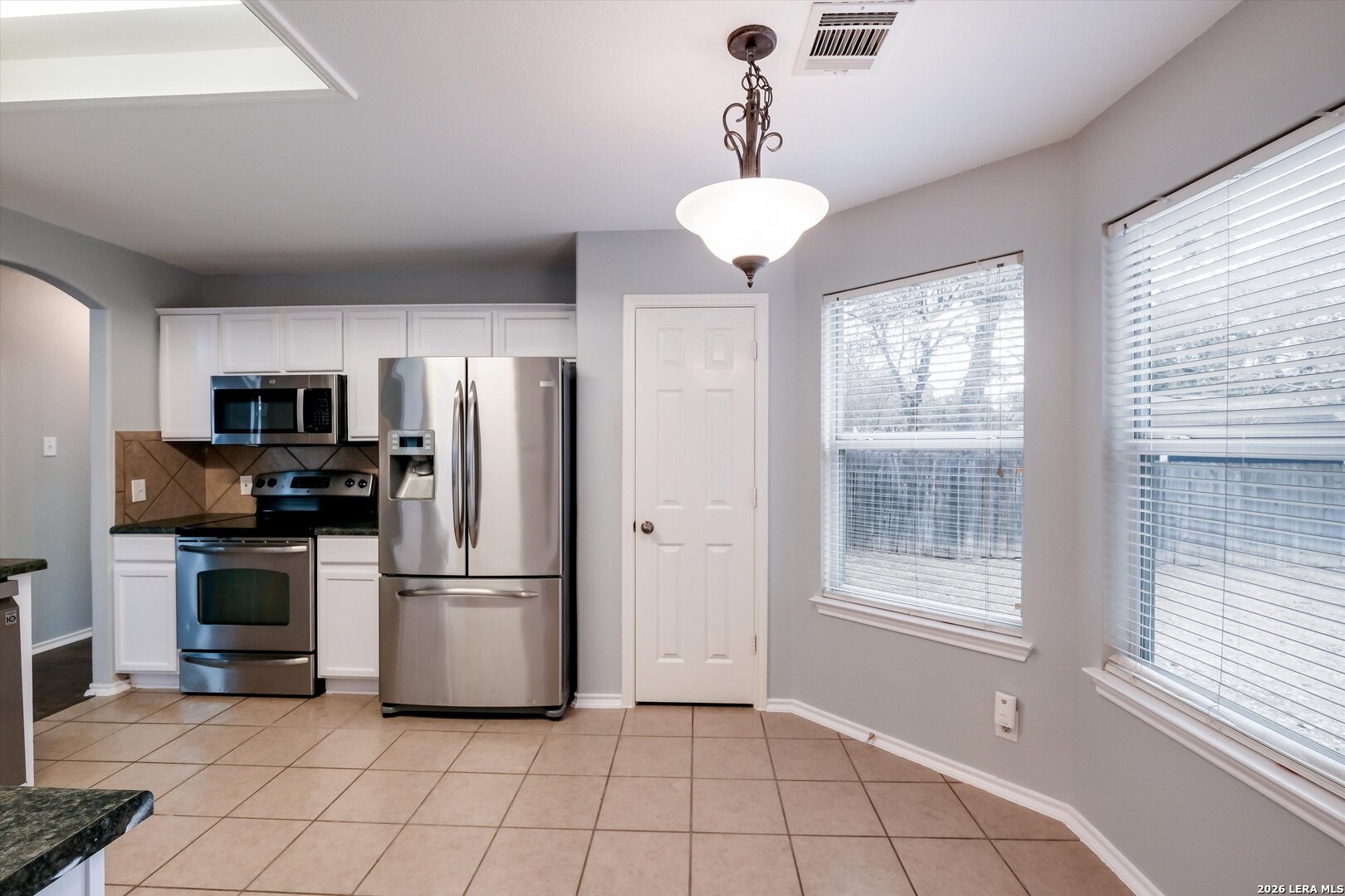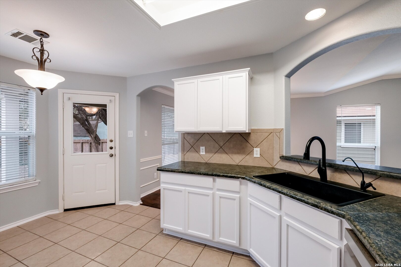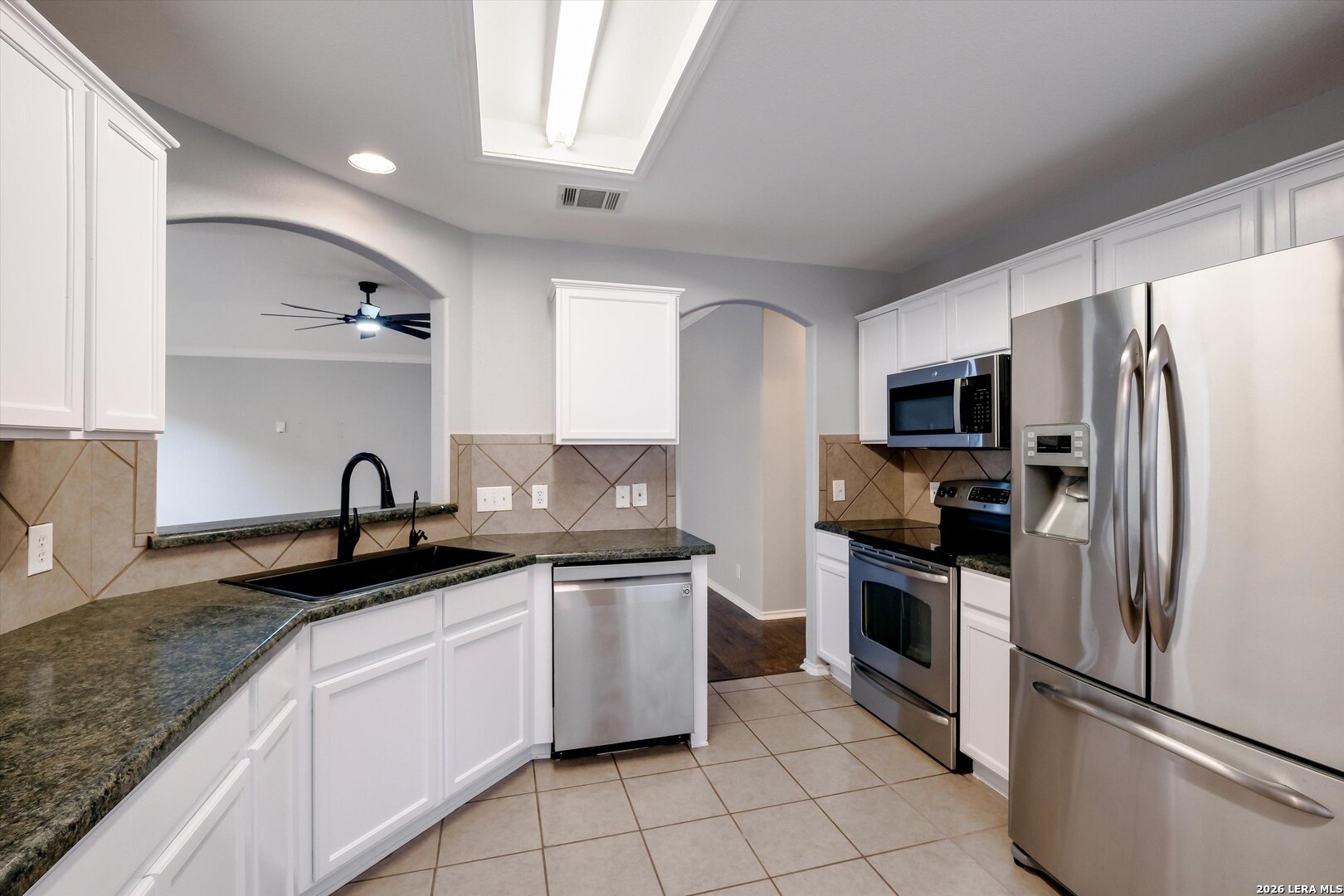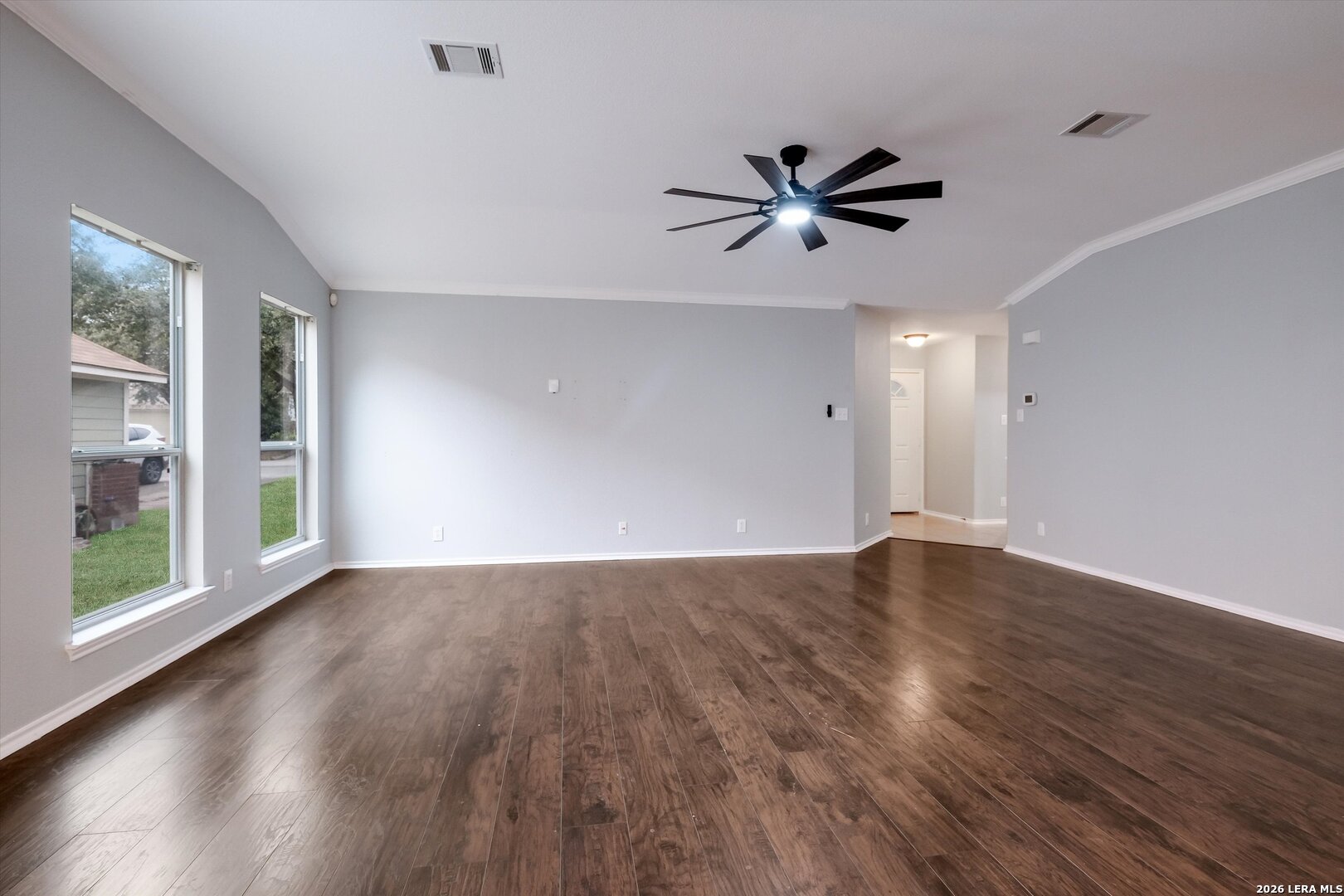 Don't miss this beautifully updated 3-bed, 2-bath home - 1,508 sq ft - priced under $255K. A brand-new 30-year roof lowers your insurance costs, and new wood floors span the living room and all three bedrooms (no carpet except in closet). Freshly painted cabinets give the kitchen a modern feel, which features an open layout, stainless steel appliances, and Fridge (Conveys). The primary suite includes a ceiling fan, spacious walk-in closet, and a private bath with a garden tub, and dual vanities. Thoughtful finishes include crown molding, rounded corners, and decorative art niches. Exterior and curb appeal have been refreshed - driveway and patio professionally power-washed and windows professionally cleaned - plus a charming front porch and covered patio for outdoor living. Conveniently located inside Loop 1604 on Potranco, close to major highways, H-E-B, shopping, and just 18 minutes from Lackland AFB. Ready for a new Homeowner!
