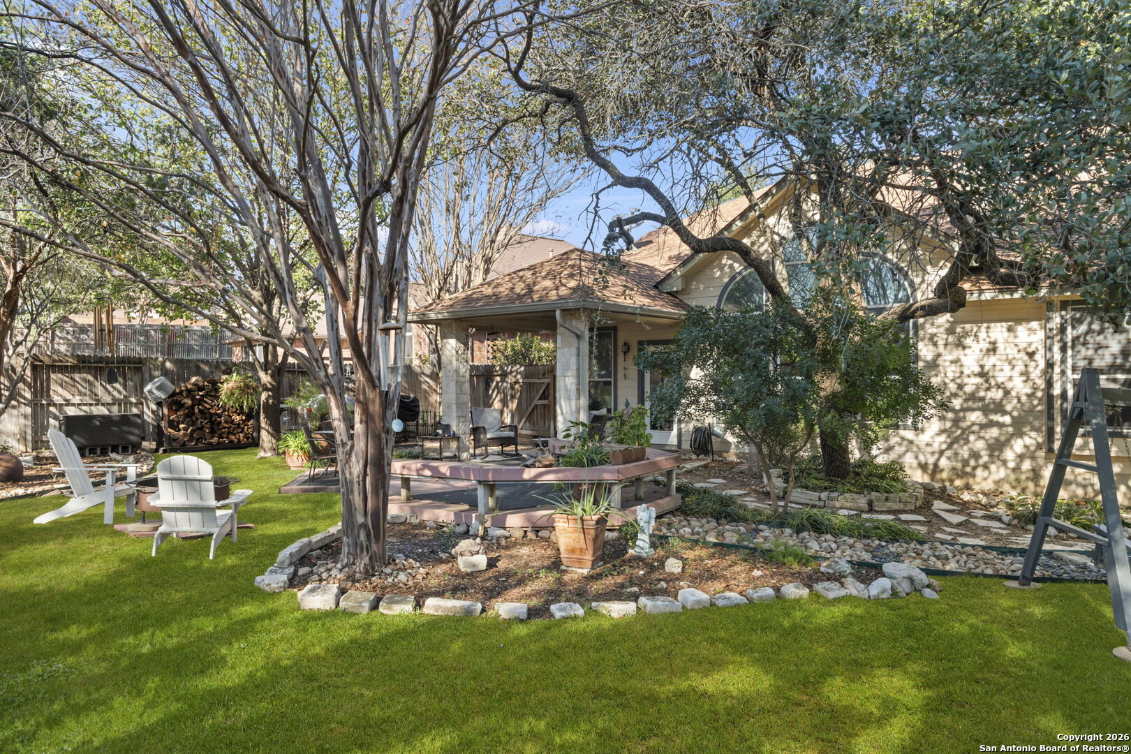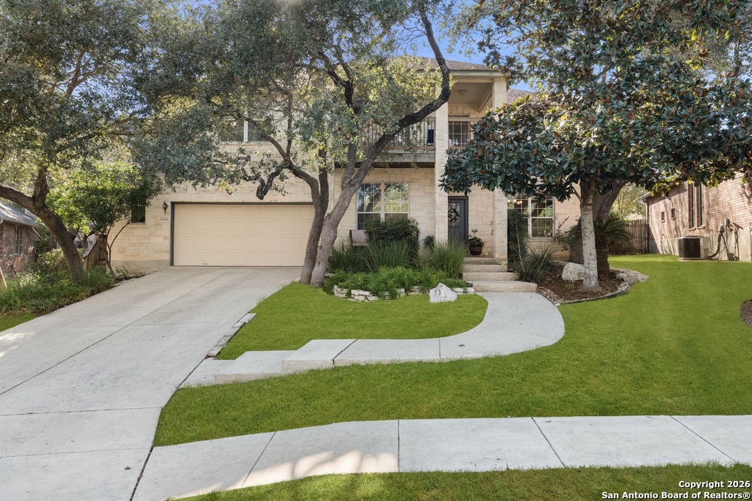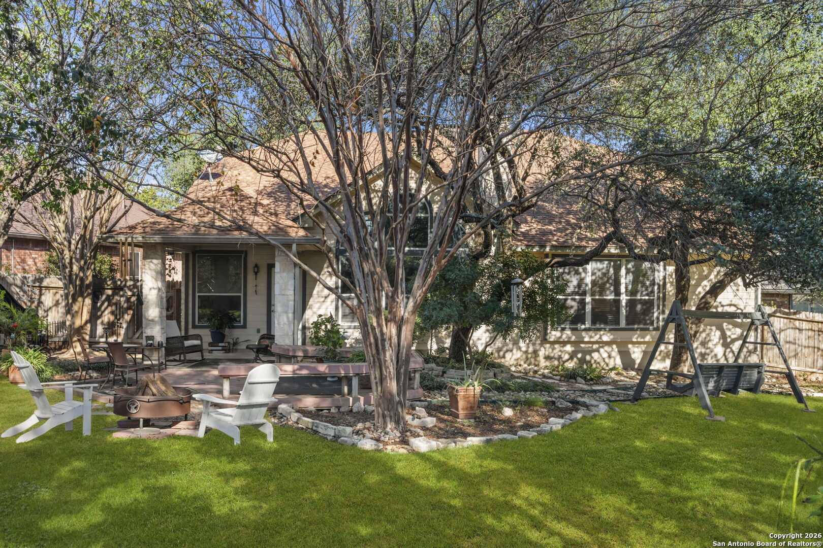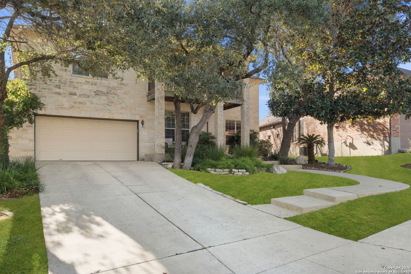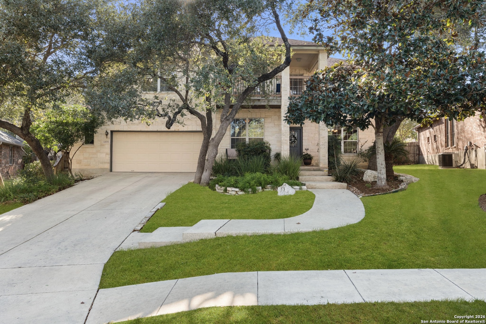 Texas Hill Country Classic in Iron Horse Canyon - Helotes. Welcome to this stunning former Ryland model home nestled in the highly sought-after Iron Horse Canyon community. Featuring a timeless stone exterior with breathtaking balcony views, this 4-bedroom, 2.5-bath residence sits on an expansive, nearly one-third-acre lot surrounded by mature trees and professionally designed landscaping. Step inside to a bright, inviting entry with soaring ceilings that immediately set the tone for this warm and welcoming home. Elegant spaces include a formal dining room, private study, and a spacious family room anchored by a cozy fireplace. The island kitchen is designed for both function and entertaining, offering generous counter space, abundant cabinetry, stainless steel appliances, and a breakfast bar that opens seamlessly to the living area. The primary suite is conveniently located on the main level, providing privacy and comfort with a spa-like bath featuring a double vanity, walk-in shower, garden tub, and an oversized walk-in closet. Upstairs, you'll find a large game room and spacious secondary bedrooms, perfect for family, guests, or flexible living needs. Outdoor living truly shines with covered front and back patios, and lush Texas size yard, with multiple spaces ideal for entertaining or relaxing while enjoying Hill Country views. Additional highlights include an oversized 2 car garage, sprinkler system, water softener, and pride of ownership throughout. Located in Northside ISD with exemplary-rated schools and access to excellent HOA amenities, this exceptional home offers comfort, functionality, and an unbeatable location close to shopping, dining, and entertainment. A must-see, this former model home is truly something special!