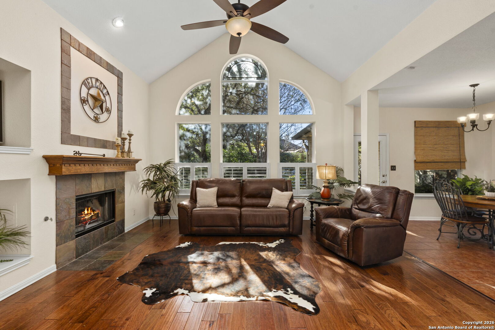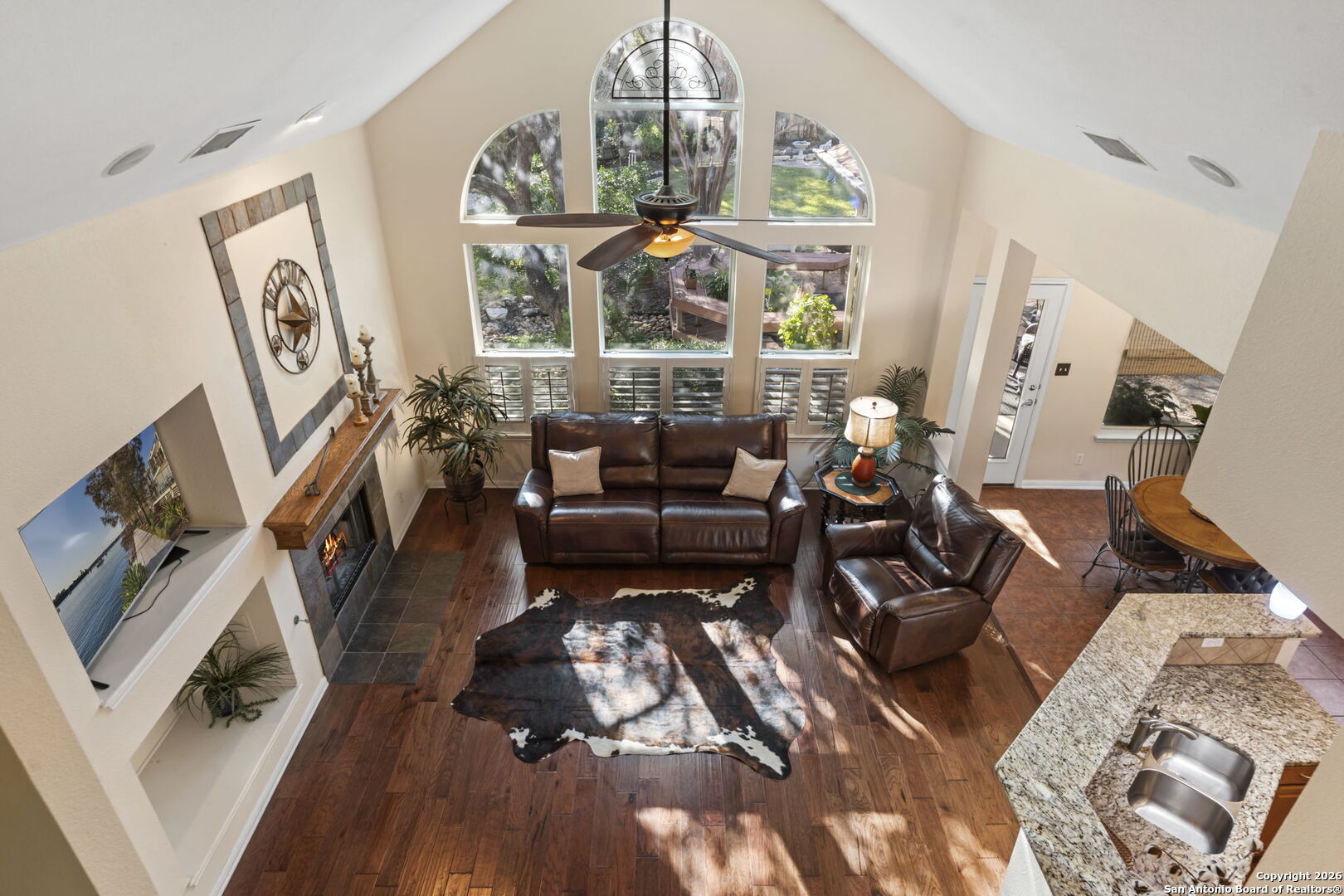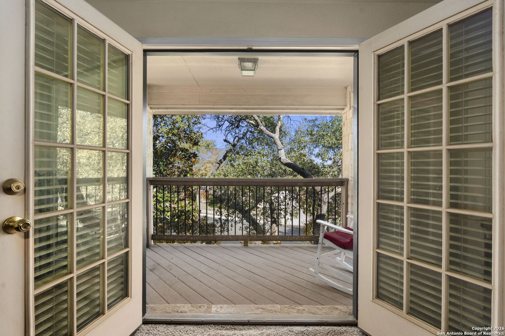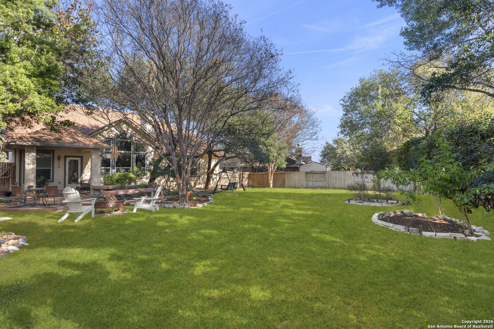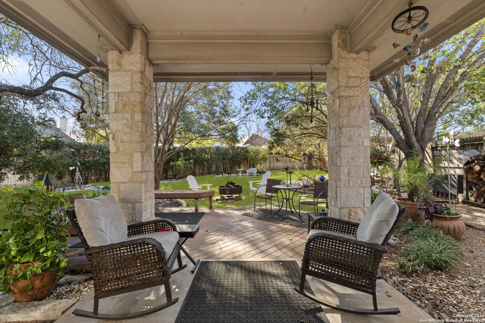 Texas Hill Country Classic in Iron Horse Canyon - Helotes. Welcome to this stunning former Ryland model home nestled in the highly sought-after Iron Horse Canyon community. Featuring a timeless stone exterior with breathtaking balcony views, this 4-bedroom, 2.5-bath residence sits on an expansive, nearly one-third-acre lot surrounded by mature trees and professionally designed landscaping. Step inside to a bright, inviting entry with soaring ceilings that immediately set the tone for this warm and welcoming home. Elegant spaces include a formal dining room, private study, and a spacious family room anchored by a cozy fireplace. The island kitchen is designed for both function and entertaining, offering generous counter space, abundant cabinetry, stainless steel appliances, and a breakfast bar that opens seamlessly to the living area. The primary suite is conveniently located on the main level, providing privacy and comfort with a spa-like bath featuring a double vanity, walk-in shower, garden tub, and an oversized walk-in closet. Upstairs, you'll find a large game room and spacious secondary bedrooms, perfect for family, guests, or flexible living needs. Outdoor living truly shines with covered front and back patios, and lush Texas size yard, with multiple spaces ideal for entertaining or relaxing while enjoying Hill Country views. Additional highlights include an oversized 2 car garage, sprinkler system, water softener, and pride of ownership throughout. Located in Northside ISD with exemplary-rated schools and access to excellent HOA amenities, this exceptional home offers comfort, functionality, and an unbeatable location close to shopping, dining, and entertainment. A must-see, this former model home is truly something special!