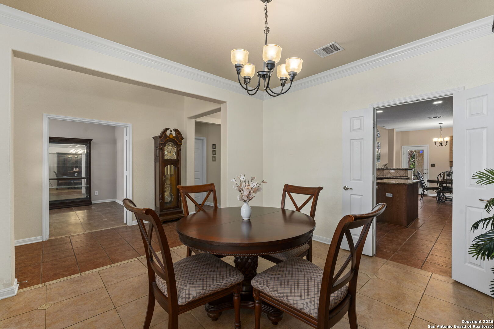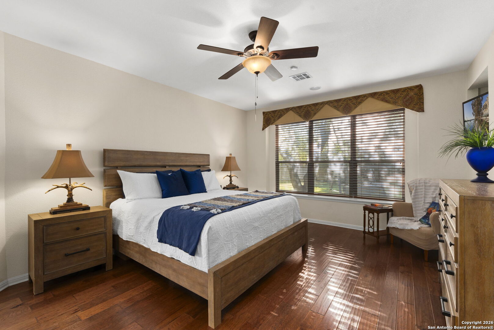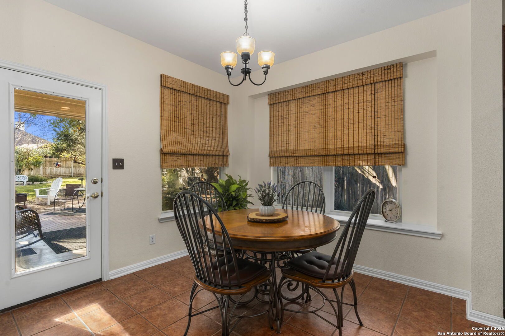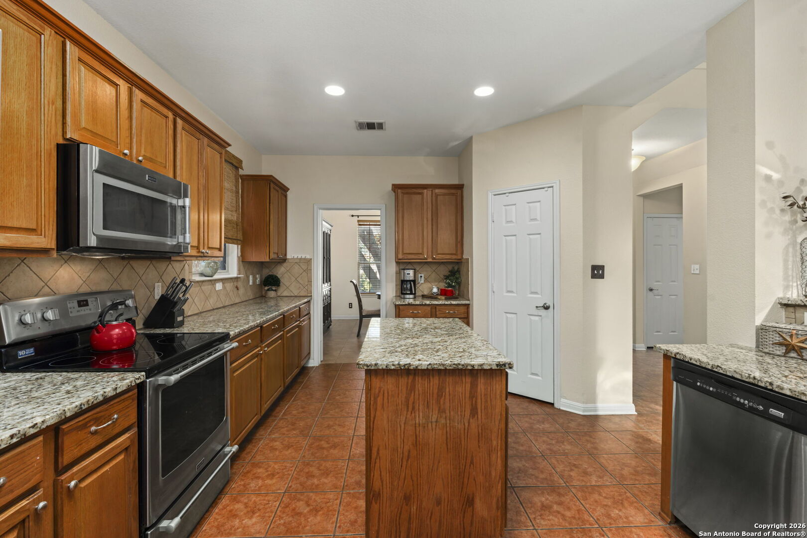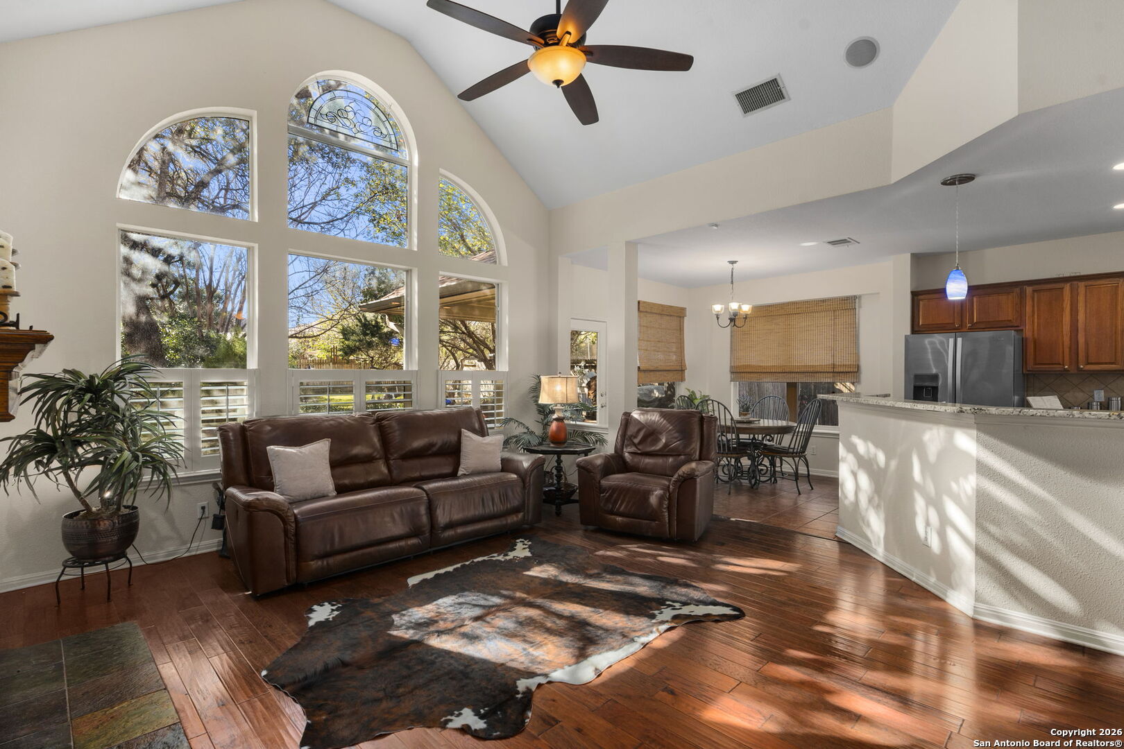Texas Hill Country Classic in Iron Horse Canyon - Helotes. Welcome to this stunning former Ryland model home nestled in the highly sought-after Iron Horse Canyon community. Featuring a timeless stone exterior with breathtaking balcony views, this 4-bedroom, 2.5-bath residence sits on an expansive, nearly one-third-acre lot surrounded by mature trees and professionally designed landscaping. Step inside to a bright, inviting entry with soaring ceilings that immediately set the tone for this warm and welcoming home. Elegant spaces include a formal dining room, private study, and a spacious family room anchored by a cozy fireplace. The island kitchen is designed for both function and entertaining, offering generous counter space, abundant cabinetry, stainless steel appliances, and a breakfast bar that opens seamlessly to the living area. The primary suite is conveniently located on the main level, providing privacy and comfort with a spa-like bath featuring a double vanity, walk-in shower, garden tub, and an oversized walk-in closet. Upstairs, you'll find a large game room and spacious secondary bedrooms, perfect for family, guests, or flexible living needs. Outdoor living truly shines with covered front and back patios, and lush Texas size yard, with multiple spaces ideal for entertaining or relaxing while enjoying Hill Country views. Additional highlights include an oversized 2 car garage, sprinkler system, water softener, and pride of ownership throughout. Located in Northside ISD with exemplary-rated schools and access to excellent HOA amenities, this exceptional home offers comfort, functionality, and an unbeatable location close to shopping, dining, and entertainment. A must-see, this former model home is truly something special!