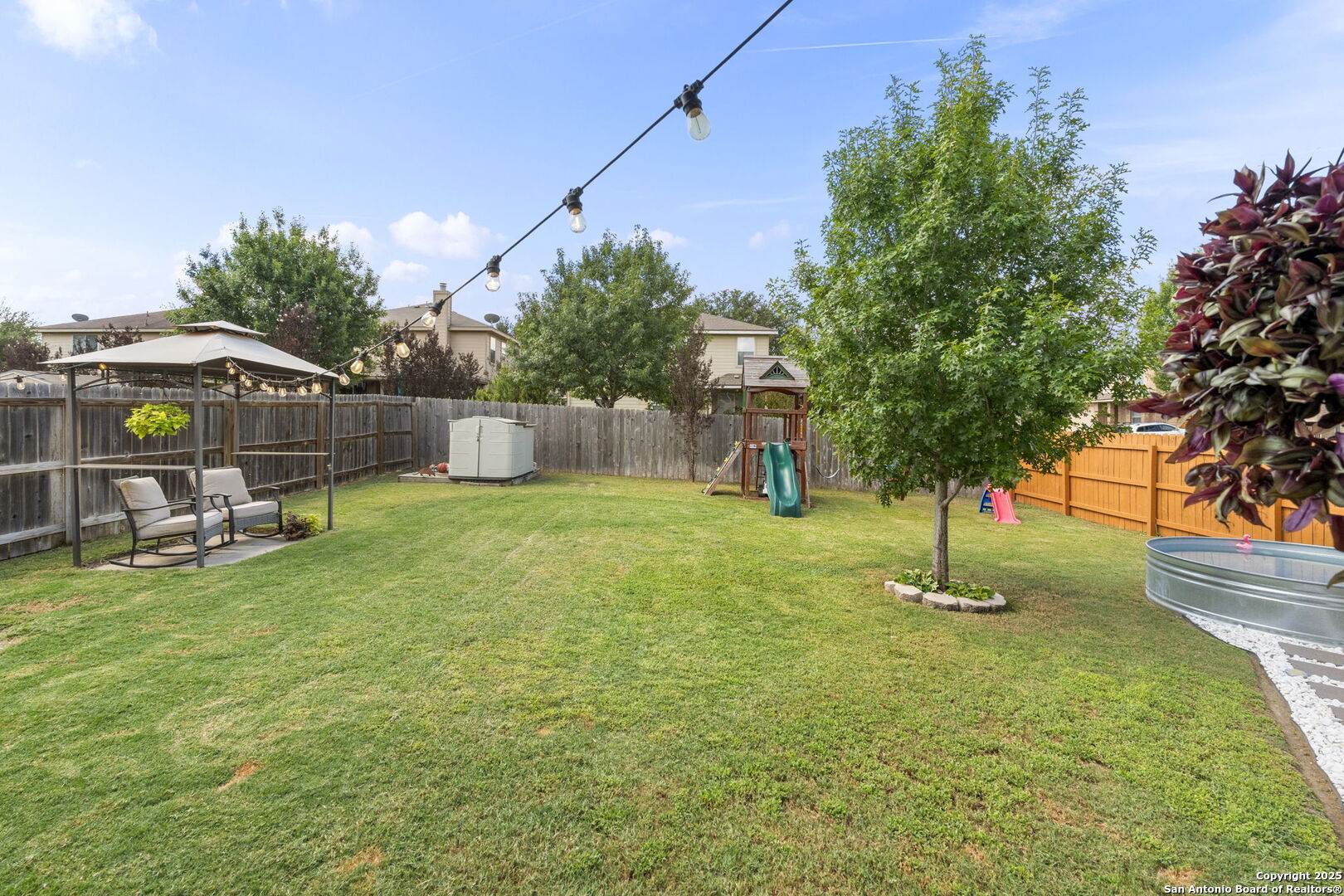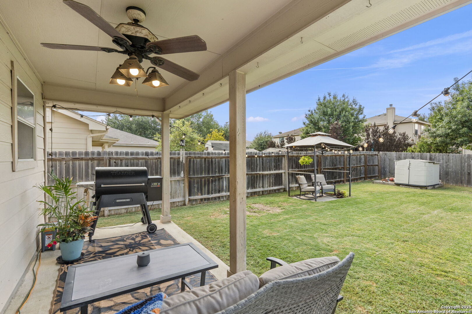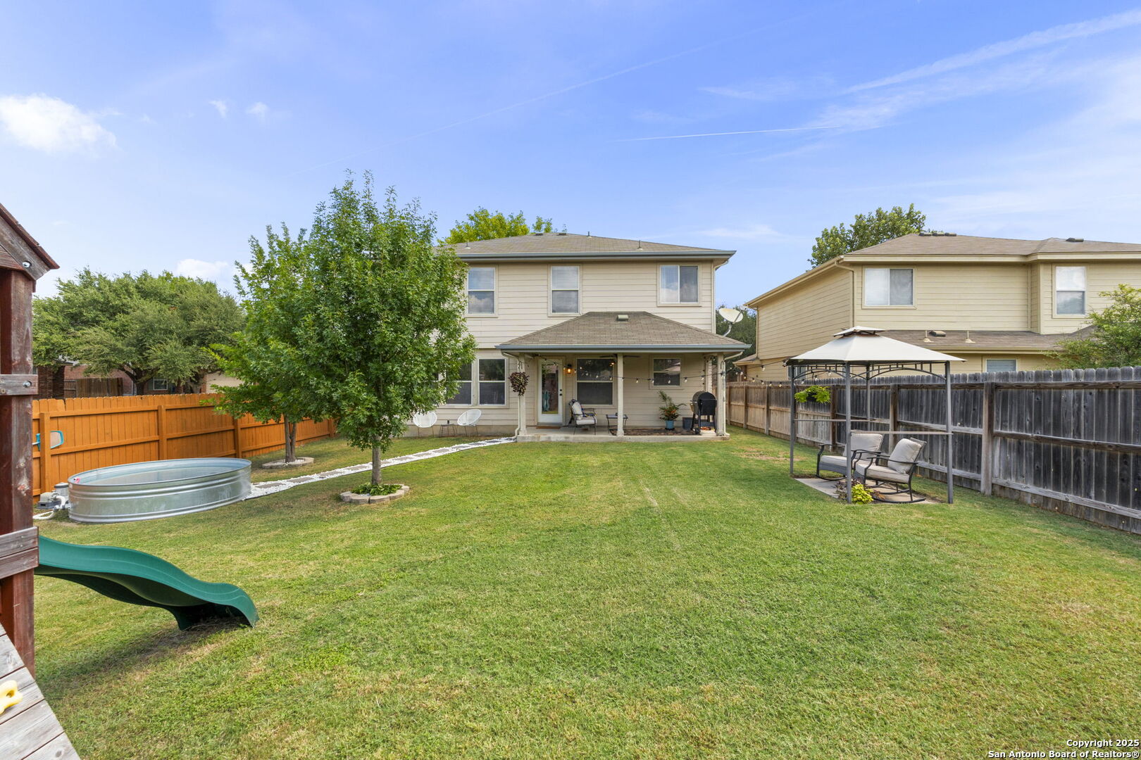 Welcome to this inviting two-story home on a desirable corner lot in the sought-after Wildhorse neighborhood! Modern touches and a neutral color scheme flow throughout, creating a warm and timeless feel. The cozy living room, highlighted by a stylish accent wall, opens seamlessly to the breakfast area and island kitchen. The kitchen is a chef's delight with stainless steel appliances, a double oven, abundant counter and cabinet space, and crisp white cabinetry. A formal dining room offers the perfect space for gatherings. Upstairs, you'll find three spacious bedrooms and a versatile loft. The primary suite features a luxurious bath with dual vanities, a separate tub and shower, and a generous walk-in closet. Step outside to a backyard oasis designed for relaxation and fun! Enjoy the covered patio, storage shed, gazebo, fully filtered above-ground tank pool and charming string lighting-perfect for entertaining year-round. With quick access to Loop 1604, shopping, and dining, this home is as convenient as it is comfortable.