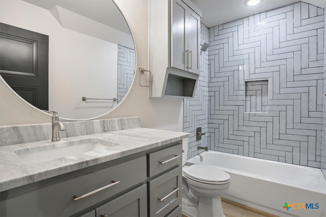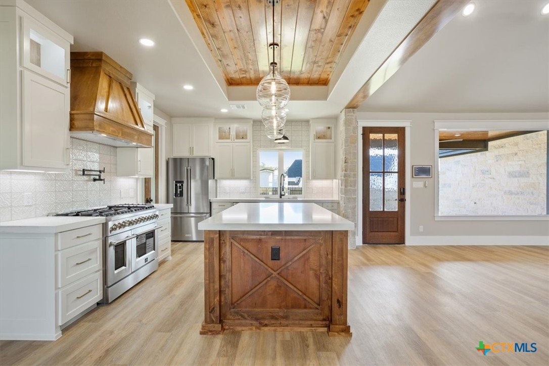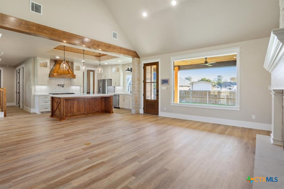 Stunning 4BR/4BA Modern Farmhouse in Belton’s Tennessee Valley Estates! This 3,267 sq ft home blends style and function with an office, media room w/ kitchenette, and 3-car garage. Highlights include an open floor plan, soaring ceilings, 48” gas range w/ double oven, oversized butler’s pantry (2nd fridge space), quartz counters, custom cabinets, LVP flooring, pine ceilings w/ beams, rock accents, smart home tech, and foam insulation throughout (incl. garage). Enjoy 881 sq ft of covered porch space with stained pine ceilings. Backyard designed for easy pool installation. Located in Lake Belton ISD, in Tennessee Valley Estates HOA, and less than 1 mile from Temple Lake Park and Arrowhead Point boat ramp. Built for modern family living — don’t miss this one!