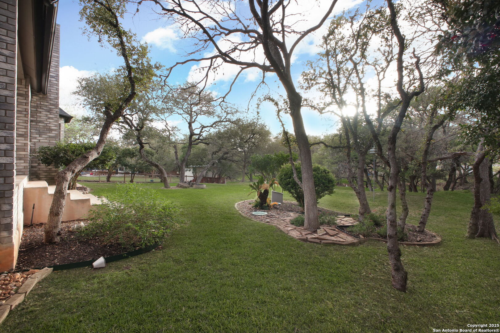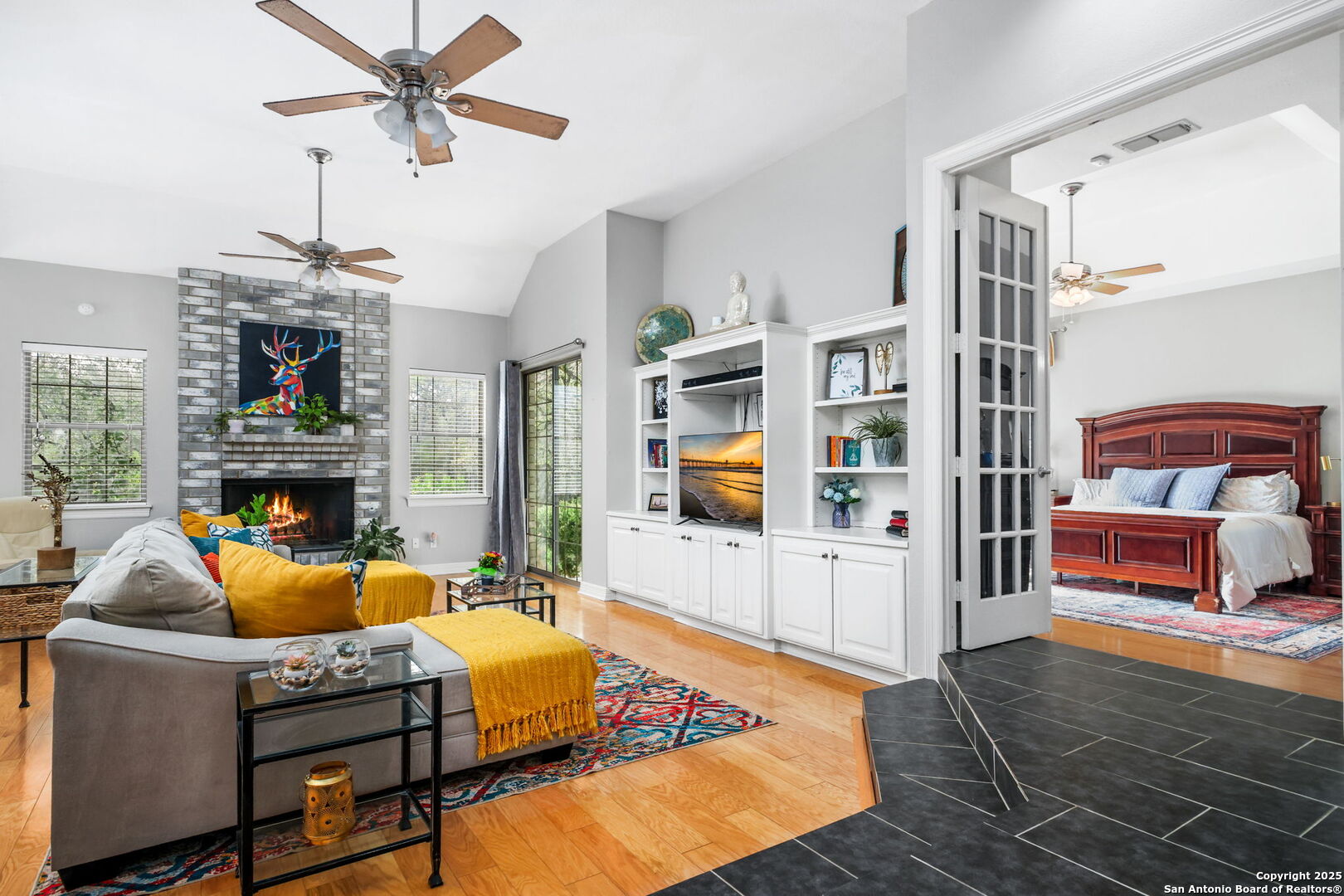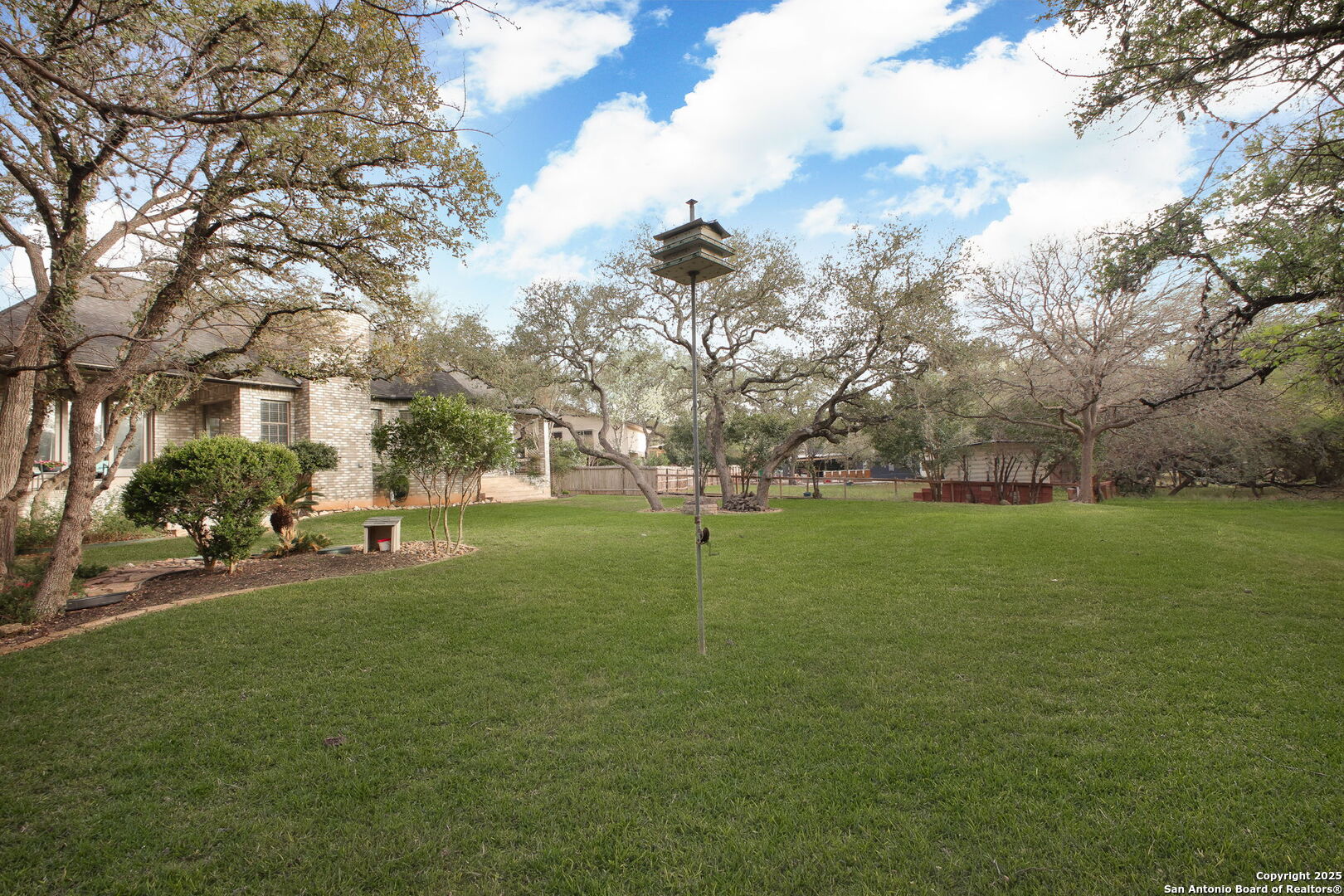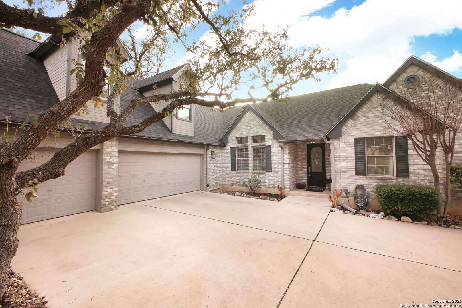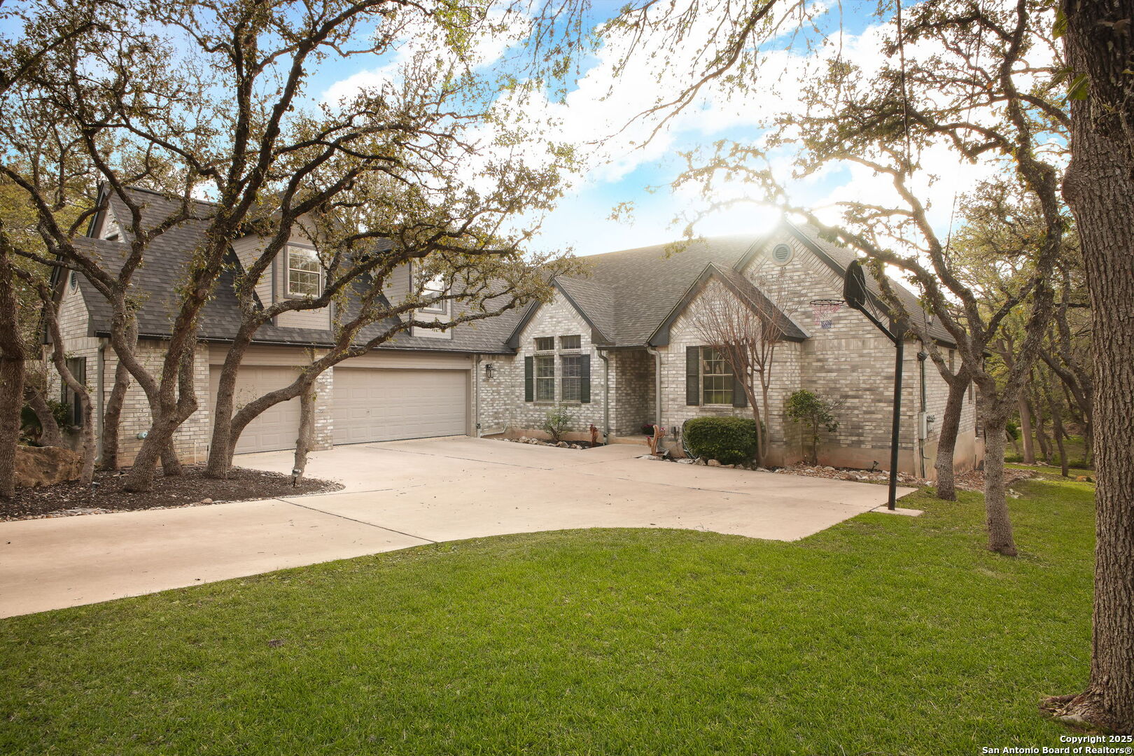 This home is a former Spurs players home #30, Paul Griffin (1979-1983) standing out from the other homes w custom 9 Ft doors and tall ceilings. Nestled on a picturesque half-acre lot in the heart of Hollywood Park, this stunning 1992 custom-built home offers the perfect blend of privacy, elegance, and convenience. Designed for a former San Antonio Spur, this one-and-a-half-story, all-brick residence is a nature lover's paradise, boasting over 50 mature live oak trees and backing up to a tranquil greenbelt. With double patios and breathtaking views, this property provides a peaceful retreat while remaining just minutes from city amenities. Step inside to discover an open floor plan with soaring ceilings, 8-foot interior wood doors, and abundant natural light. The spacious living area features a charming brick fireplace and built-in storage, seamlessly connecting to the formal dining room and eat-in kitchen. The kitchen is a chef's dream, showcasing an all-brick hearth alcove surrounding the cooktop, double ovens, granite countertops, a center island, and a built-in multipurpose desk. The well-designed split floor plan offers exceptional privacy, with a generous primary suite on the north wing of the home. This serene retreat features floor-to-ceiling windows, access to a private patio, dual walk-in closets, a double vanity, a jacuzzi tub, and a separate walk-in shower. On the opposite end of the home, two spacious guest bedrooms share a Jack-and-Jill bath. The large laundry center includes a utility sink, storage closet, and additional cabinetry for convenience. Above the attached three-car garage, a private guest suite with a full bath and walk-in closet offers flexible space for visitors offering two primary en suites Which is rare for this Hollywood Park neighborhood. Throughout the home, wood and tile flooring add warmth and character. Recent updates include a new roof (2024), new septic aerator (Dec 2024), 5-ton compressor (2024), new air handler (Dec 2024), and a new water heater (2024). Hollywood Park offers an incredible lifestyle with a $5 million resort-style facility featuring a clubhouse, covered pavilion with grills, three pools, a splash area, a playground, two tennis courts, a full-size basketball court, and a sand volleyball court. The neighborhood hosts over 20 community events throughout the year, including Santa personally delivering gifts to homes, a Fourth of July parade, Halloween festivities, Easter celebrations, Cookies with Santa, back-to-school and end-of-the-year swim parties, and so much more