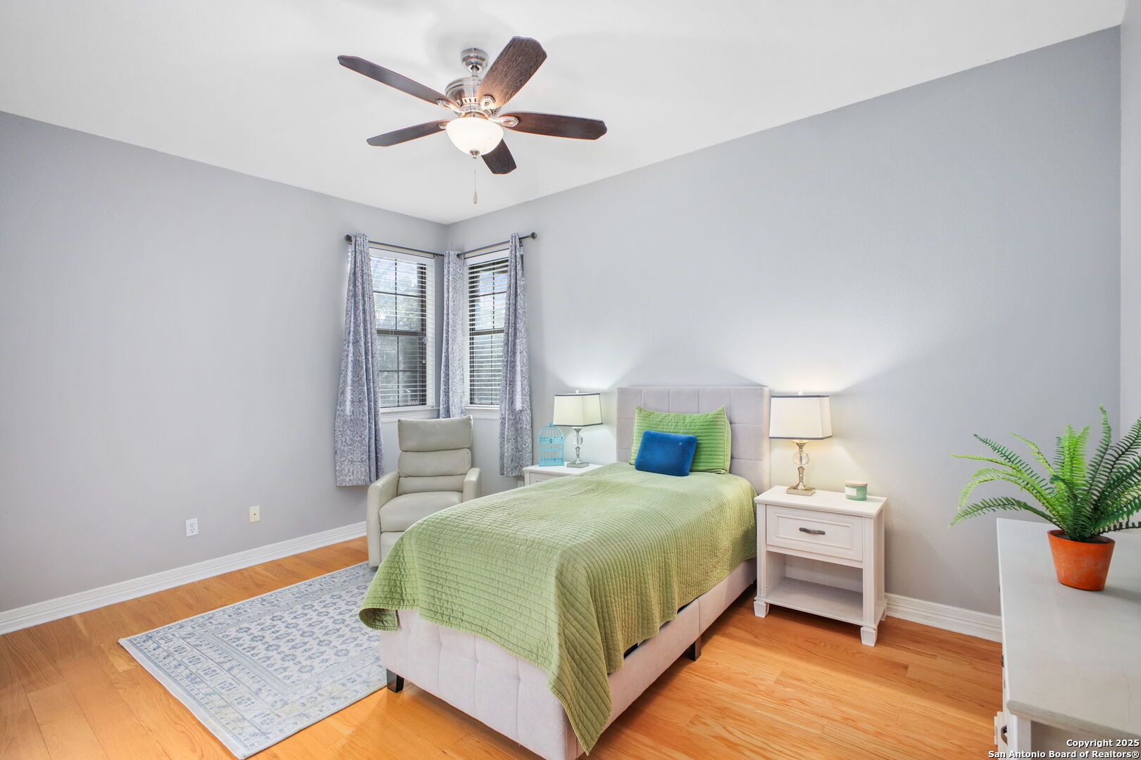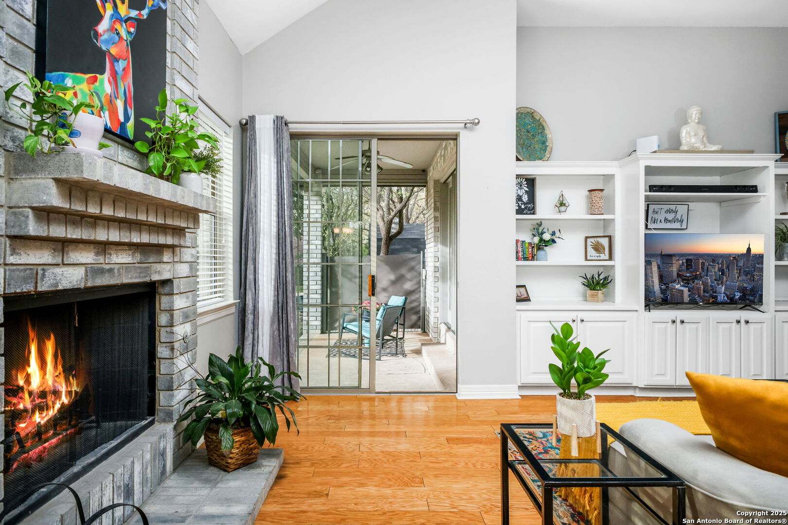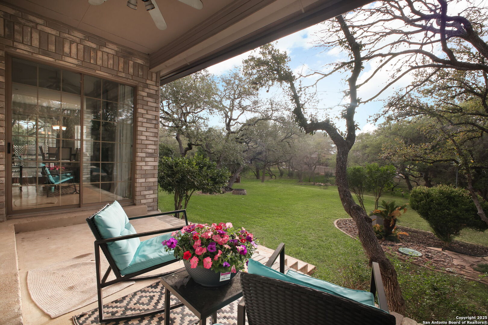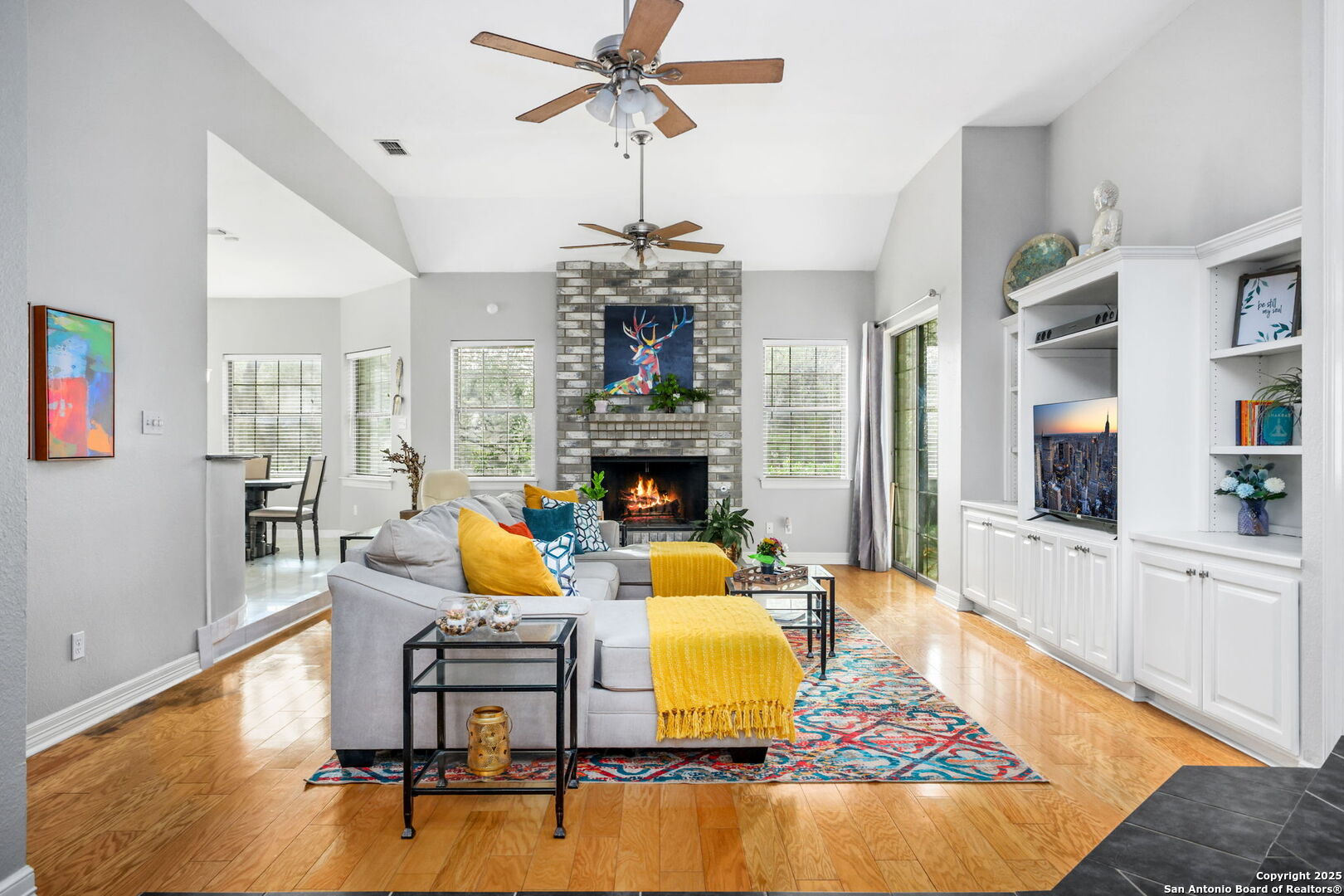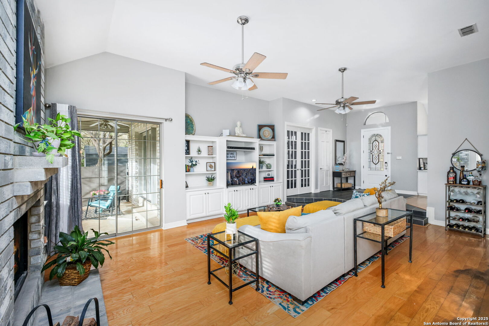 This home is a former Spurs players home #30, Paul Griffin (1979-1983) standing out from the other homes w custom 9 Ft doors and tall ceilings. Nestled on a picturesque half-acre lot in the heart of Hollywood Park, this stunning 1992 custom-built home offers the perfect blend of privacy, elegance, and convenience. Designed for a former San Antonio Spur, this one-and-a-half-story, all-brick residence is a nature lover's paradise, boasting over 50 mature live oak trees and backing up to a tranquil greenbelt. With double patios and breathtaking views, this property provides a peaceful retreat while remaining just minutes from city amenities. Step inside to discover an open floor plan with soaring ceilings, 8-foot interior wood doors, and abundant natural light. The spacious living area features a charming brick fireplace and built-in storage, seamlessly connecting to the formal dining room and eat-in kitchen. The kitchen is a chef's dream, showcasing an all-brick hearth alcove surrounding the cooktop, double ovens, granite countertops, a center island, and a built-in multipurpose desk. The well-designed split floor plan offers exceptional privacy, with a generous primary suite on the north wing of the home. This serene retreat features floor-to-ceiling windows, access to a private patio, dual walk-in closets, a double vanity, a jacuzzi tub, and a separate walk-in shower. On the opposite end of the home, two spacious guest bedrooms share a Jack-and-Jill bath. The large laundry center includes a utility sink, storage closet, and additional cabinetry for convenience. Above the attached three-car garage, a private guest suite with a full bath and walk-in closet offers flexible space for visitors offering two primary en suites Which is rare for this Hollywood Park neighborhood. Throughout the home, wood and tile flooring add warmth and character. Recent updates include a new roof (2024), new septic aerator (Dec 2024), 5-ton compressor (2024), new air handler (Dec 2024), and a new water heater (2024). Hollywood Park offers an incredible lifestyle with a $5 million resort-style facility featuring a clubhouse, covered pavilion with grills, three pools, a splash area, a playground, two tennis courts, a full-size basketball court, and a sand volleyball court. The neighborhood hosts over 20 community events throughout the year, including Santa personally delivering gifts to homes, a Fourth of July parade, Halloween festivities, Easter celebrations, Cookies with Santa, back-to-school and end-of-the-year swim parties, and so much more