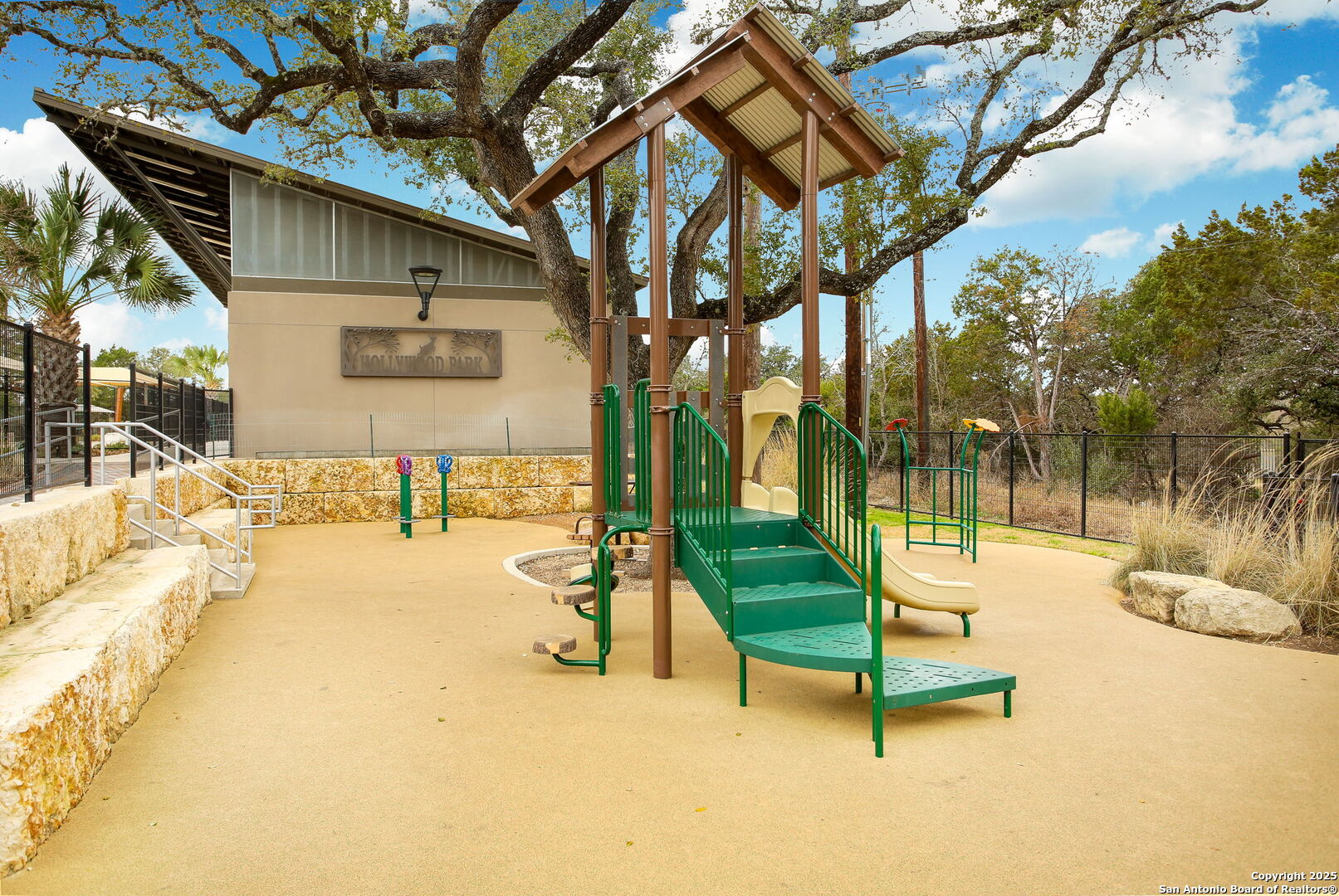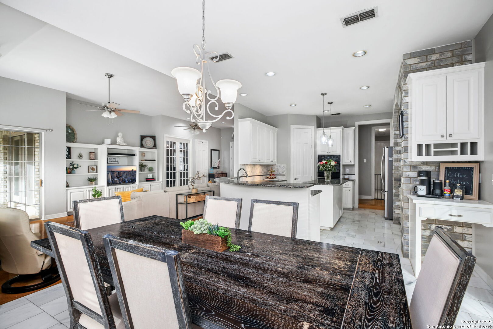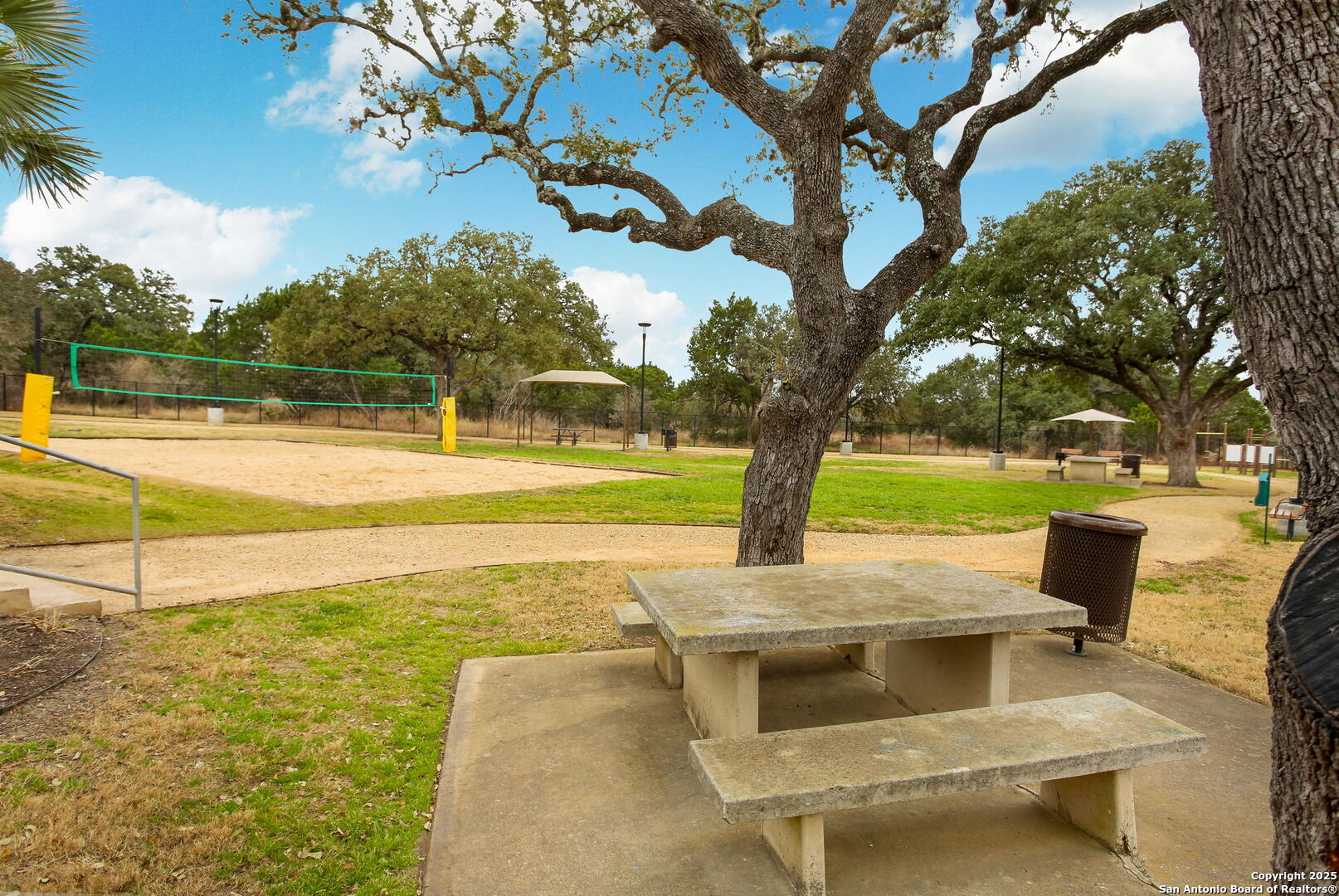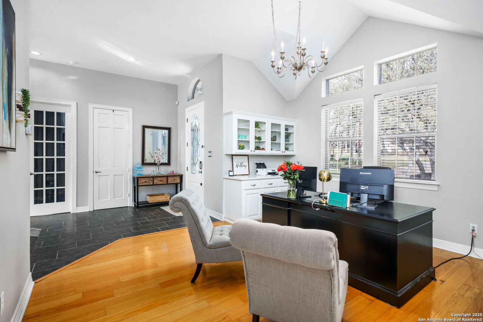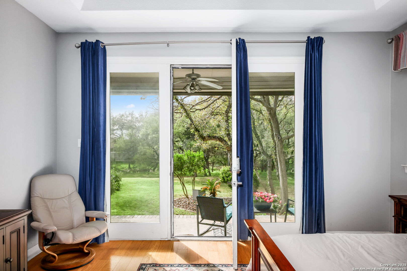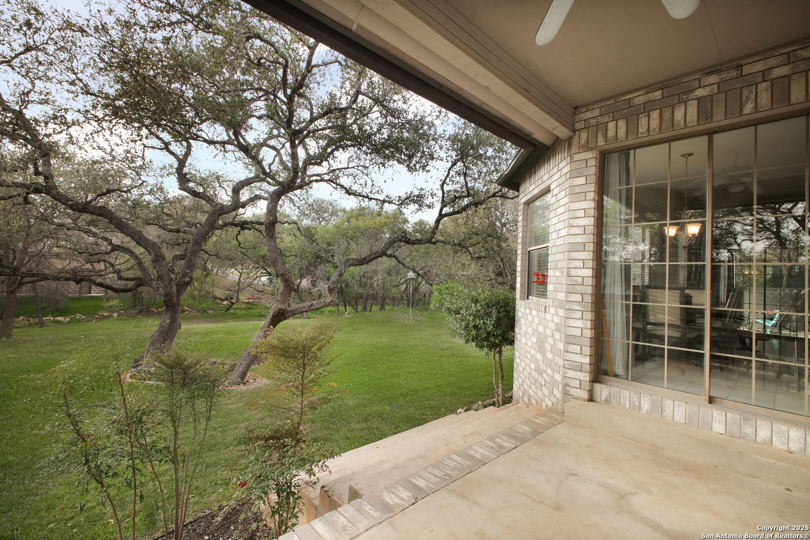 This home is a former Spurs players home #30, Paul Griffin (1979-1983) standing out from the other homes w custom 9 Ft doors and tall ceilings. Nestled on a picturesque half-acre lot in the heart of Hollywood Park, this stunning 1992 custom-built home offers the perfect blend of privacy, elegance, and convenience. Designed for a former San Antonio Spur, this one-and-a-half-story, all-brick residence is a nature lover's paradise, boasting over 50 mature live oak trees and backing up to a tranquil greenbelt. With double patios and breathtaking views, this property provides a peaceful retreat while remaining just minutes from city amenities. Step inside to discover an open floor plan with soaring ceilings, 8-foot interior wood doors, and abundant natural light. The spacious living area features a charming brick fireplace and built-in storage, seamlessly connecting to the formal dining room and eat-in kitchen. The kitchen is a chef's dream, showcasing an all-brick hearth alcove surrounding the cooktop, double ovens, granite countertops, a center island, and a built-in multipurpose desk. The well-designed split floor plan offers exceptional privacy, with a generous primary suite on the north wing of the home. This serene retreat features floor-to-ceiling windows, access to a private patio, dual walk-in closets, a double vanity, a jacuzzi tub, and a separate walk-in shower. On the opposite end of the home, two spacious guest bedrooms share a Jack-and-Jill bath. The large laundry center includes a utility sink, storage closet, and additional cabinetry for convenience. Above the attached three-car garage, a private guest suite with a full bath and walk-in closet offers flexible space for visitors offering two primary en suites Which is rare for this Hollywood Park neighborhood. Throughout the home, wood and tile flooring add warmth and character. Recent updates include a new roof (2024), new septic aerator (Dec 2024), 5-ton compressor (2024), new air handler (Dec 2024), and a new water heater (2024). Hollywood Park offers an incredible lifestyle with a $5 million resort-style facility featuring a clubhouse, covered pavilion with grills, three pools, a splash area, a playground, two tennis courts, a full-size basketball court, and a sand volleyball court. The neighborhood hosts over 20 community events throughout the year, including Santa personally delivering gifts to homes, a Fourth of July parade, Halloween festivities, Easter celebrations, Cookies with Santa, back-to-school and end-of-the-year swim parties, and so much more
