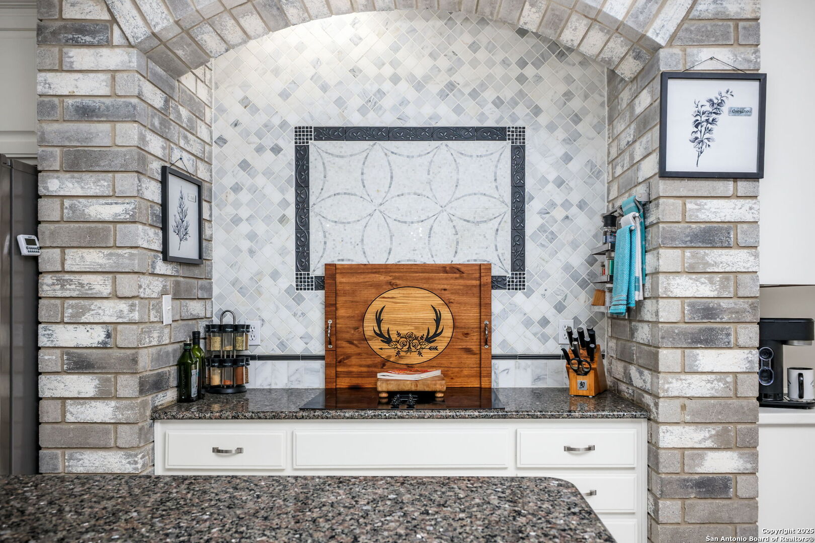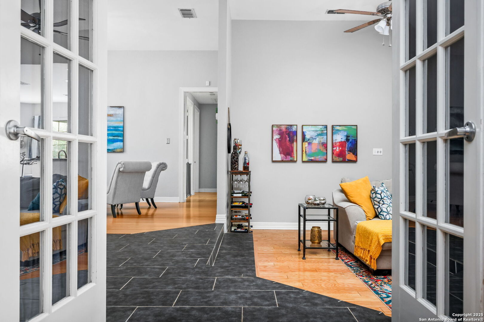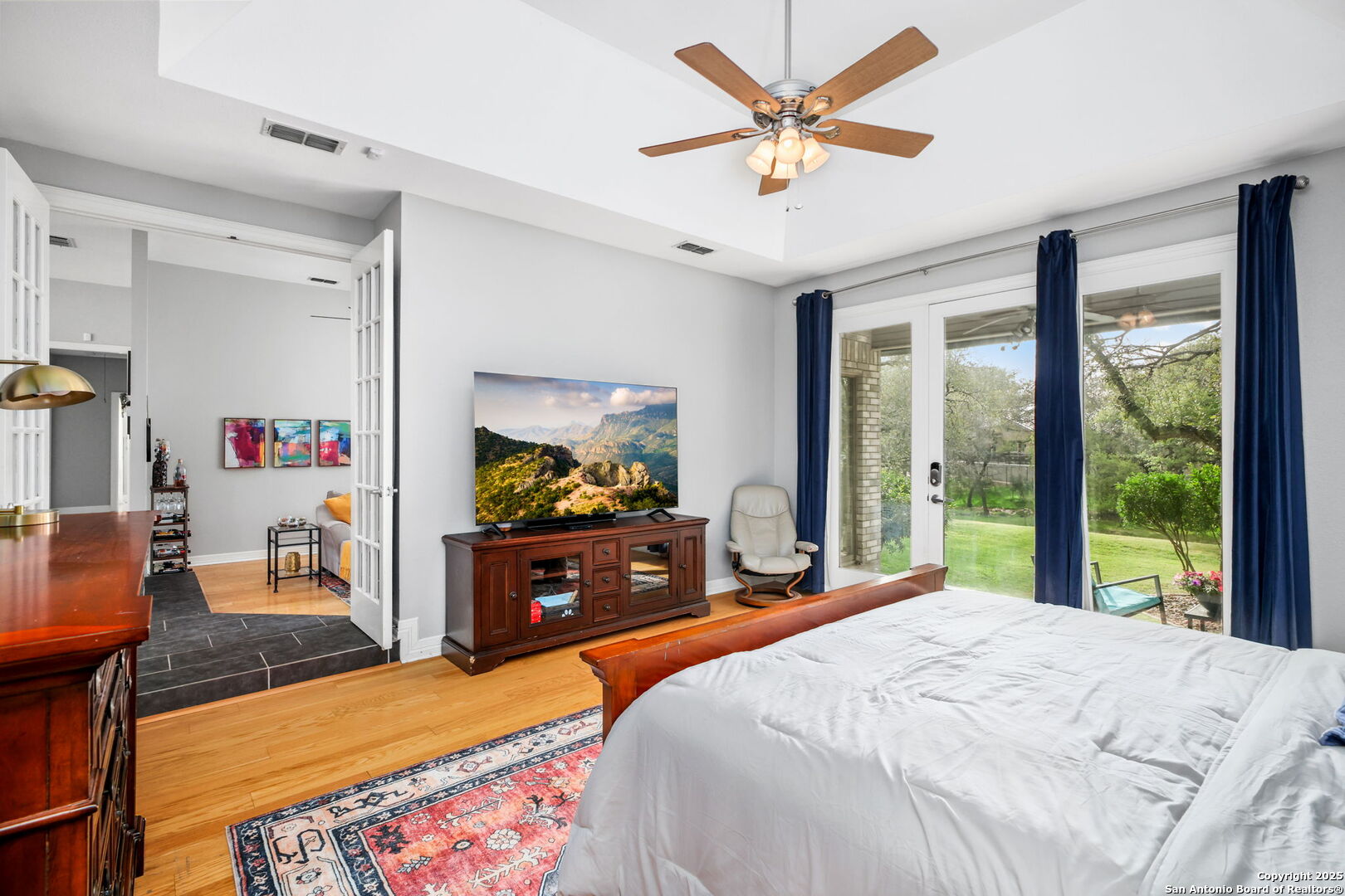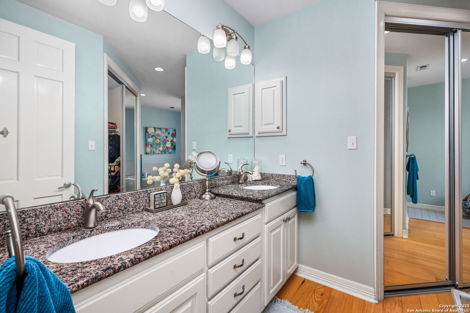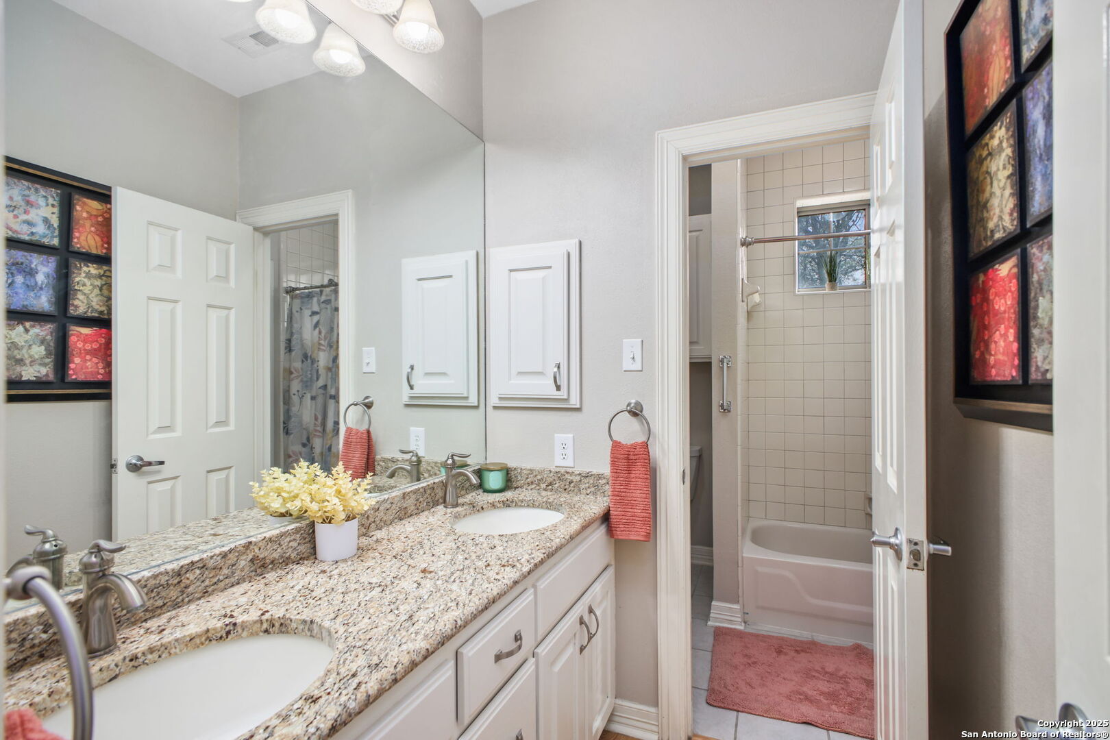 This home is a former Spurs players home #30, Paul Griffin (1979-1983) standing out from the other homes w custom 9 Ft doors and tall ceilings. Nestled on a picturesque half-acre lot in the heart of Hollywood Park, this stunning 1992 custom-built home offers the perfect blend of privacy, elegance, and convenience. Designed for a former San Antonio Spur, this one-and-a-half-story, all-brick residence is a nature lover's paradise, boasting over 50 mature live oak trees and backing up to a tranquil greenbelt. With double patios and breathtaking views, this property provides a peaceful retreat while remaining just minutes from city amenities. Step inside to discover an open floor plan with soaring ceilings, 8-foot interior wood doors, and abundant natural light. The spacious living area features a charming brick fireplace and built-in storage, seamlessly connecting to the formal dining room and eat-in kitchen. The kitchen is a chef's dream, showcasing an all-brick hearth alcove surrounding the cooktop, double ovens, granite countertops, a center island, and a built-in multipurpose desk. The well-designed split floor plan offers exceptional privacy, with a generous primary suite on the north wing of the home. This serene retreat features floor-to-ceiling windows, access to a private patio, dual walk-in closets, a double vanity, a jacuzzi tub, and a separate walk-in shower. On the opposite end of the home, two spacious guest bedrooms share a Jack-and-Jill bath. The large laundry center includes a utility sink, storage closet, and additional cabinetry for convenience. Above the attached three-car garage, a private guest suite with a full bath and walk-in closet offers flexible space for visitors offering two primary en suites Which is rare for this Hollywood Park neighborhood. Throughout the home, wood and tile flooring add warmth and character. Recent updates include a new roof (2024), new septic aerator (Dec 2024), 5-ton compressor (2024), new air handler (Dec 2024), and a new water heater (2024). Hollywood Park offers an incredible lifestyle with a $5 million resort-style facility featuring a clubhouse, covered pavilion with grills, three pools, a splash area, a playground, two tennis courts, a full-size basketball court, and a sand volleyball court. The neighborhood hosts over 20 community events throughout the year, including Santa personally delivering gifts to homes, a Fourth of July parade, Halloween festivities, Easter celebrations, Cookies with Santa, back-to-school and end-of-the-year swim parties, and so much more
