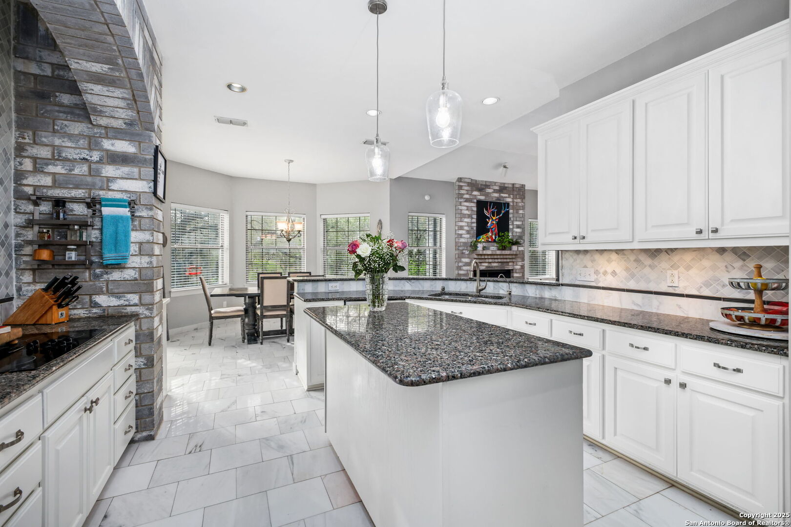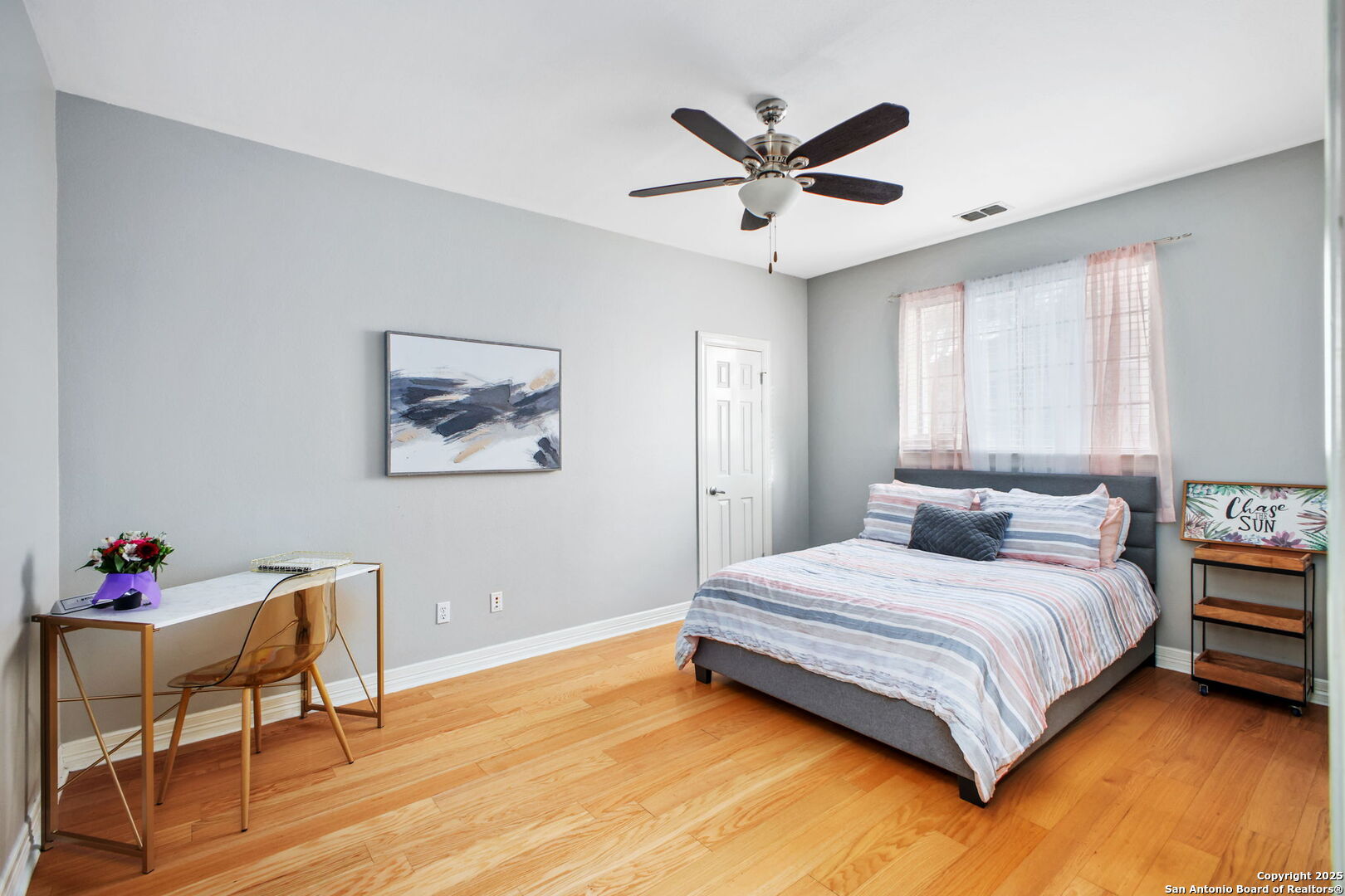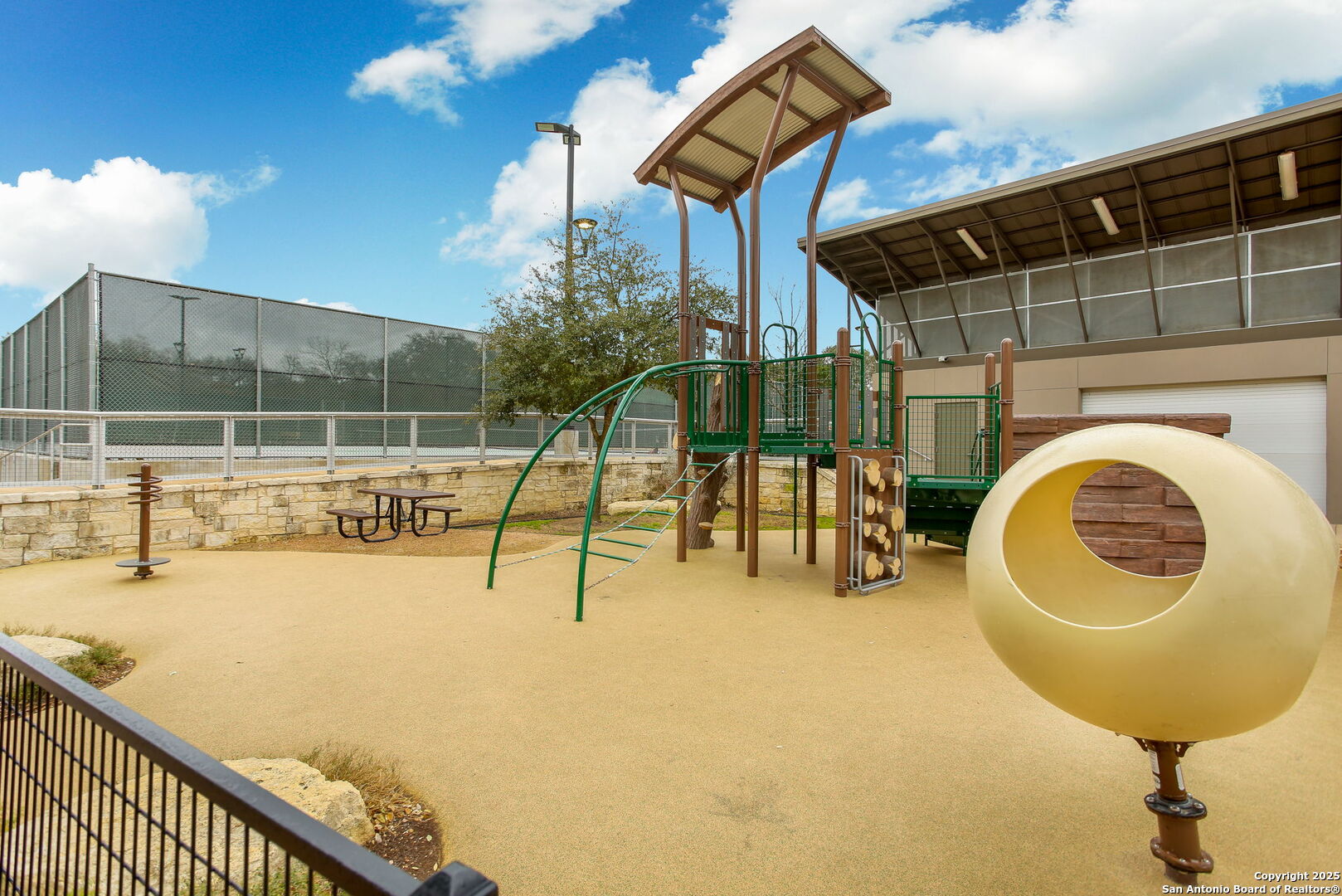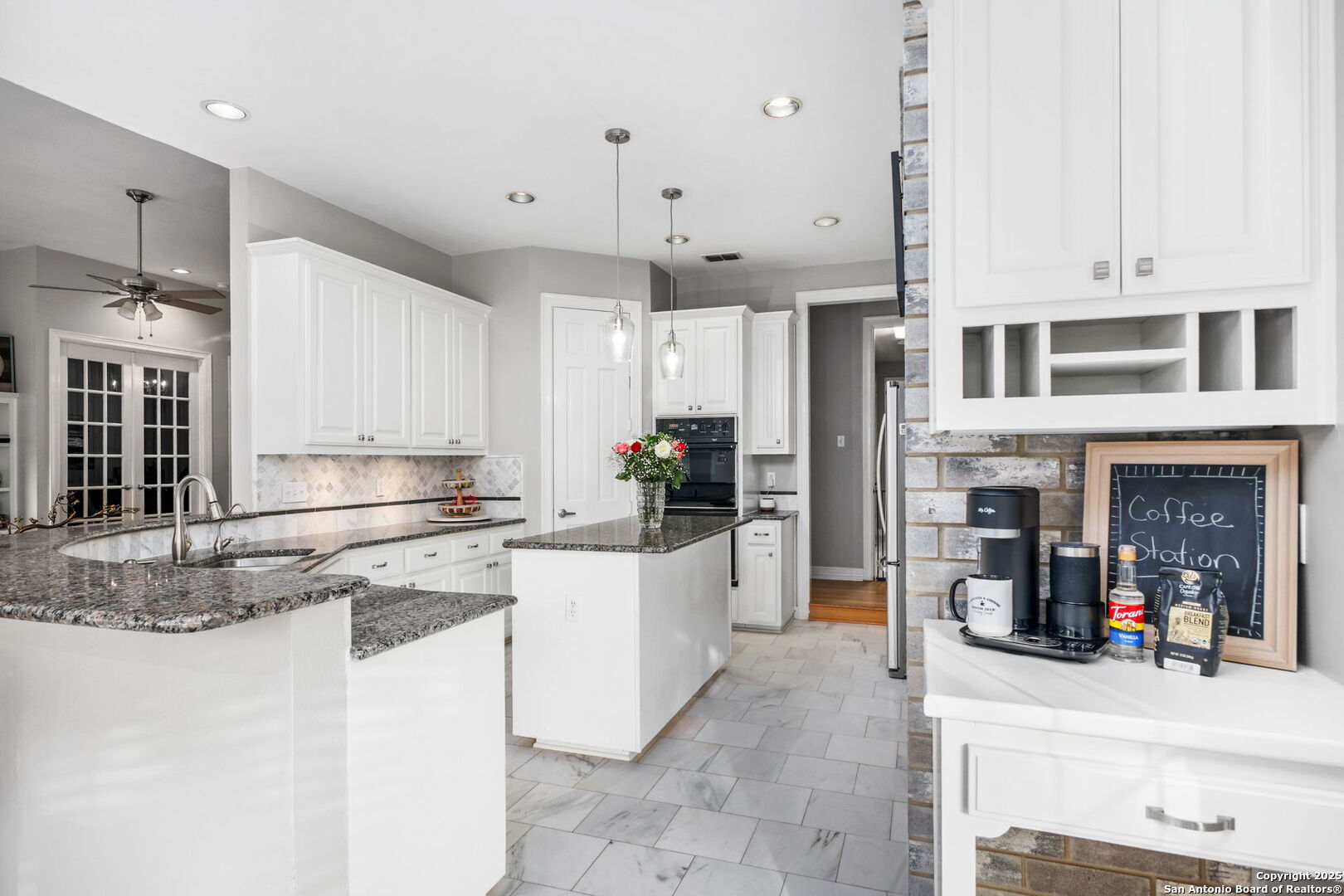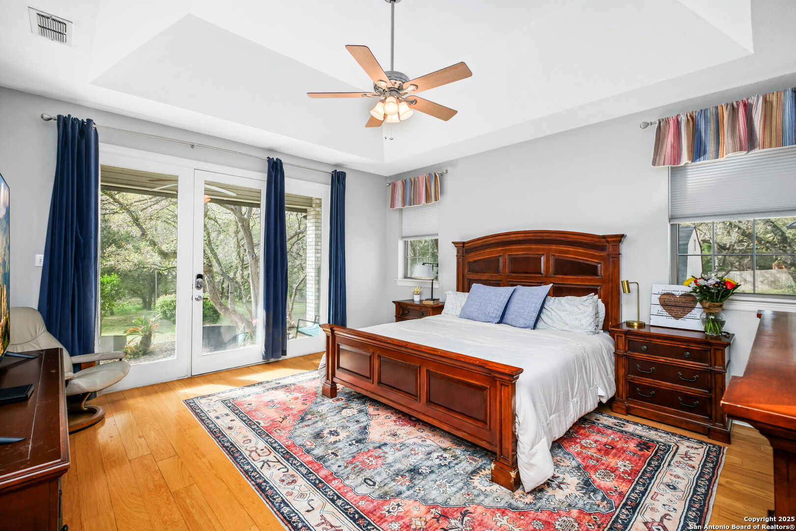 This home is a former Spurs players home #30, Paul Griffin (1979-1983) standing out from the other homes w custom 9 Ft doors and tall ceilings. Nestled on a picturesque half-acre lot in the heart of Hollywood Park, this stunning 1992 custom-built home offers the perfect blend of privacy, elegance, and convenience. Designed for a former San Antonio Spur, this one-and-a-half-story, all-brick residence is a nature lover's paradise, boasting over 50 mature live oak trees and backing up to a tranquil greenbelt. With double patios and breathtaking views, this property provides a peaceful retreat while remaining just minutes from city amenities. Step inside to discover an open floor plan with soaring ceilings, 8-foot interior wood doors, and abundant natural light. The spacious living area features a charming brick fireplace and built-in storage, seamlessly connecting to the formal dining room and eat-in kitchen. The kitchen is a chef's dream, showcasing an all-brick hearth alcove surrounding the cooktop, double ovens, granite countertops, a center island, and a built-in multipurpose desk. The well-designed split floor plan offers exceptional privacy, with a generous primary suite on the north wing of the home. This serene retreat features floor-to-ceiling windows, access to a private patio, dual walk-in closets, a double vanity, a jacuzzi tub, and a separate walk-in shower. On the opposite end of the home, two spacious guest bedrooms share a Jack-and-Jill bath. The large laundry center includes a utility sink, storage closet, and additional cabinetry for convenience. Above the attached three-car garage, a private guest suite with a full bath and walk-in closet offers flexible space for visitors offering two primary en suites Which is rare for this Hollywood Park neighborhood. Throughout the home, wood and tile flooring add warmth and character. Recent updates include a new roof (2024), new septic aerator (Dec 2024), 5-ton compressor (2024), new air handler (Dec 2024), and a new water heater (2024). Hollywood Park offers an incredible lifestyle with a $5 million resort-style facility featuring a clubhouse, covered pavilion with grills, three pools, a splash area, a playground, two tennis courts, a full-size basketball court, and a sand volleyball court. The neighborhood hosts over 20 community events throughout the year, including Santa personally delivering gifts to homes, a Fourth of July parade, Halloween festivities, Easter celebrations, Cookies with Santa, back-to-school and end-of-the-year swim parties, and so much more