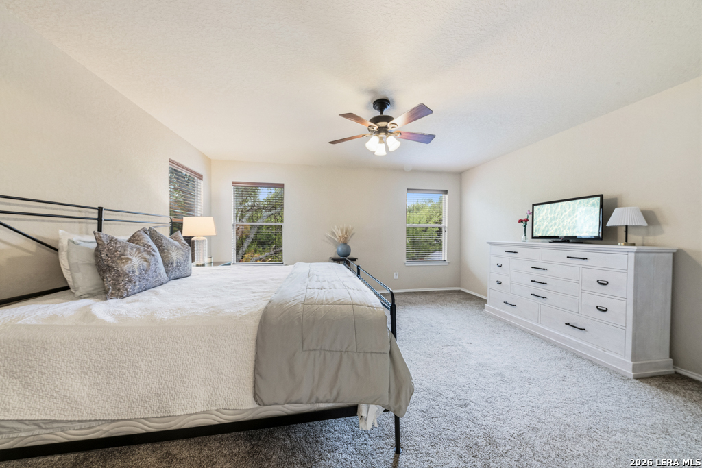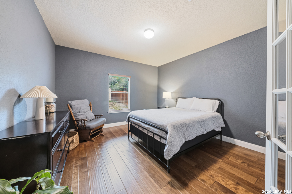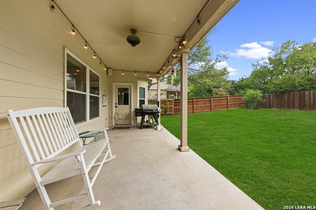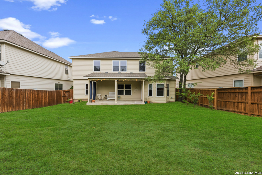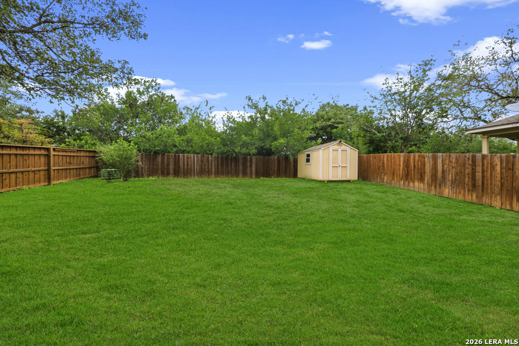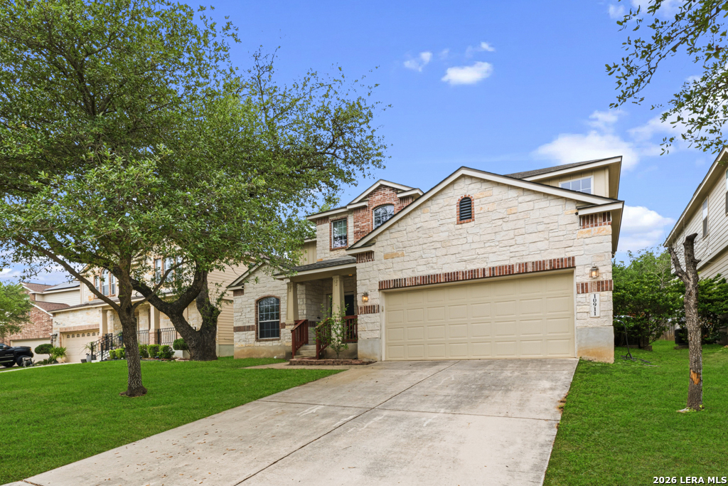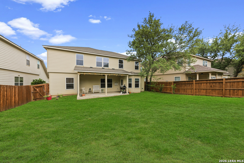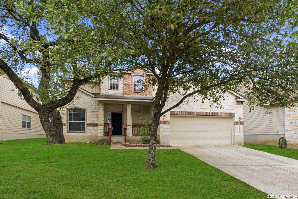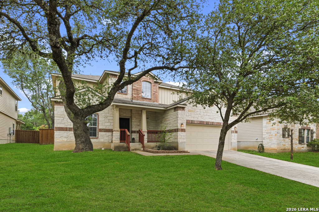 4-bedroom home with flexible floorplan in Helotes featuring a downstairs secondary bedroom, cul-de-sac location, and 20-ft greenbelt for added privacy! Enjoy relaxing on the covered front porch while taking in the cul-de-sac setting, plus access to neighborhood pool and park. ~ Step inside to a dramatic 2-story foyer and versatile layout with a formal dining that can easily function as a home office or flex space. Hardwood floors flow through the dining and walkways, leading to a spacious family room with crown molding, surround sound, and floor plug-ideal for everyday living and entertaining. ~ Bright, open kitchen offers granite countertops, large island, stainless steel appliances, double ovens, and a walk-in pantry with floor-to-ceiling storage. ~ Wrought iron staircase leads to a generous gameroom, creating separation between 2 secondary bedrooms and the private primary suite. All bedrooms feature walk-in closets. Primary suite includes double vanities, oversized walk-in shower, and a large walk-in closet. ~ Enjoy outdoor relaxation or entertaining with a covered back patio, added privacy from the greenbelt, and a storage shed to keep lawn equipment out of the garage. Garage includes space for ceiling storage and water softener. ~ Additional features include a 15 SEER Lennox HVAC system with UV light. ~ Conveniently located near 1604, shopping, dining, and major routes-this home offers space, flexibility, room to grow and functionality for a variety of lifestyles.