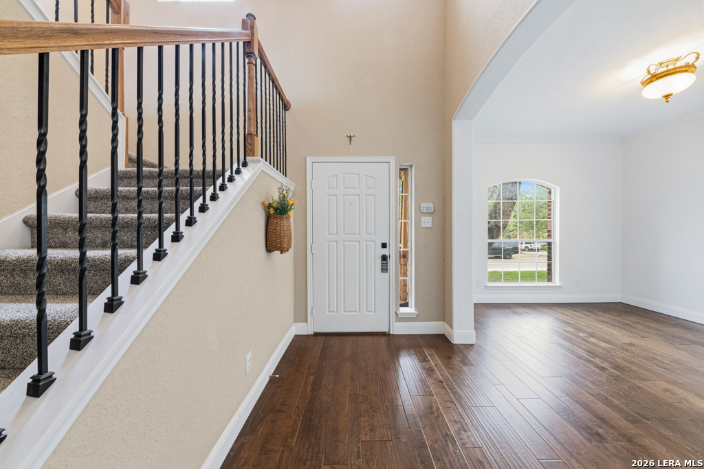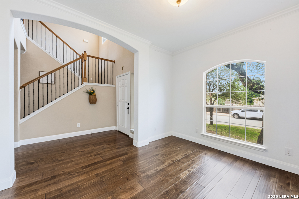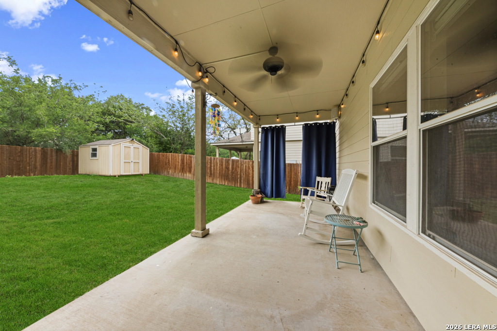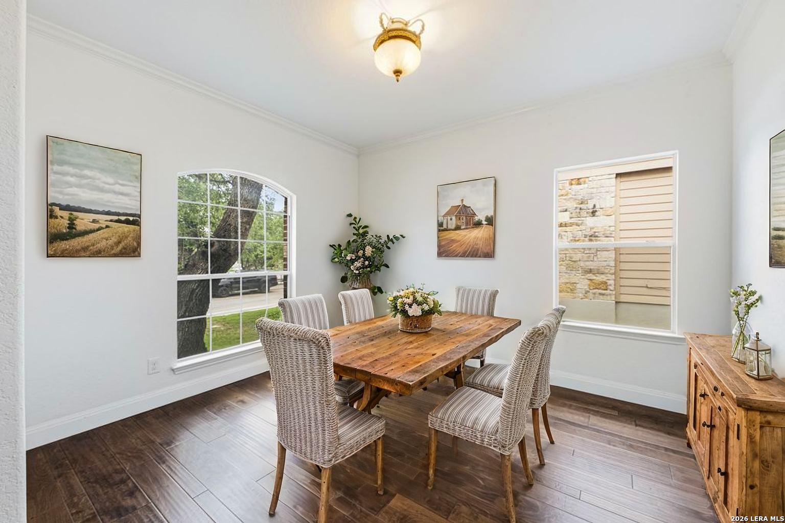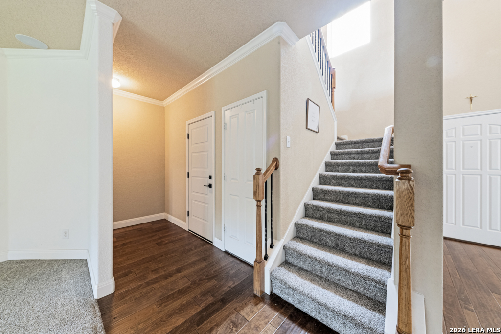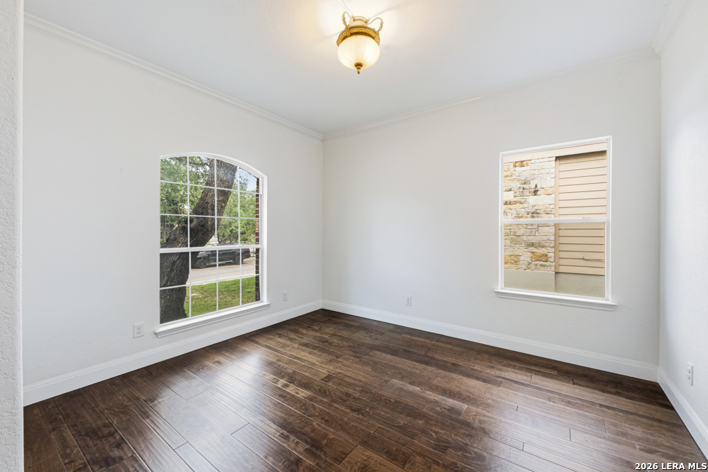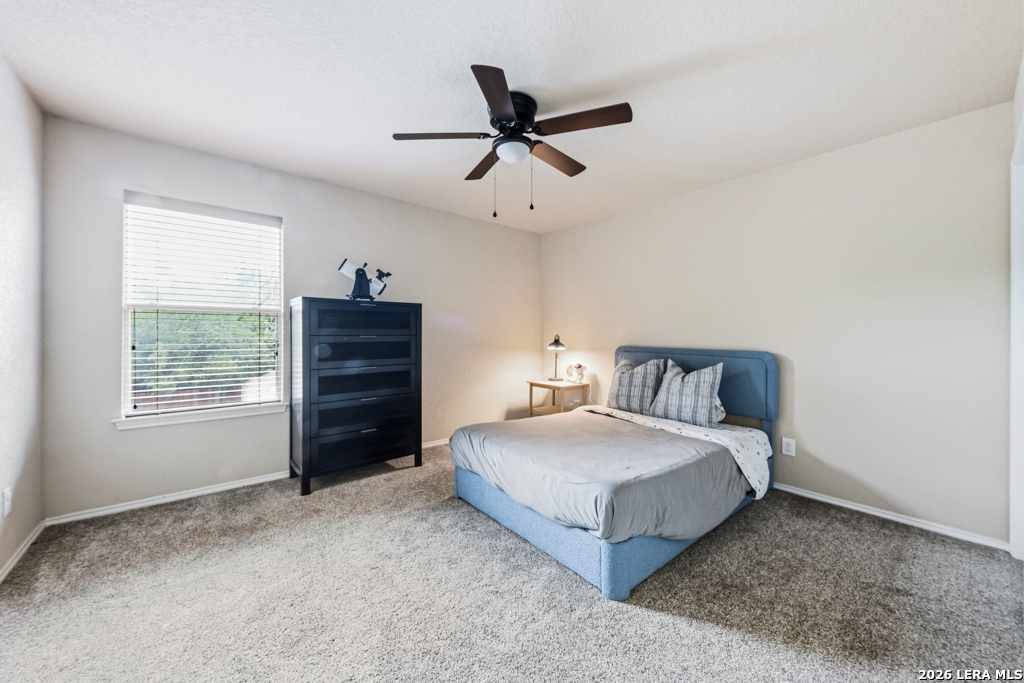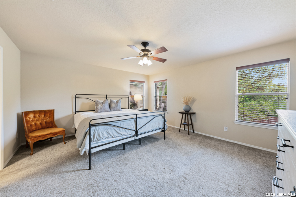4-bedroom home with flexible floorplan in Helotes featuring a downstairs secondary bedroom, cul-de-sac location, and 20-ft greenbelt for added privacy! Enjoy relaxing on the covered front porch while taking in the cul-de-sac setting, plus access to neighborhood pool and park. ~ Step inside to a dramatic 2-story foyer and versatile layout with a formal dining that can easily function as a home office or flex space. Hardwood floors flow through the dining and walkways, leading to a spacious family room with crown molding, surround sound, and floor plug-ideal for everyday living and entertaining. ~ Bright, open kitchen offers granite countertops, large island, stainless steel appliances, double ovens, and a walk-in pantry with floor-to-ceiling storage. ~ Wrought iron staircase leads to a generous gameroom, creating separation between 2 secondary bedrooms and the private primary suite. All bedrooms feature walk-in closets. Primary suite includes double vanities, oversized walk-in shower, and a large walk-in closet. ~ Enjoy outdoor relaxation or entertaining with a covered back patio, added privacy from the greenbelt, and a storage shed to keep lawn equipment out of the garage. Garage includes space for ceiling storage and water softener. ~ Additional features include a 15 SEER Lennox HVAC system with UV light. ~ Conveniently located near 1604, shopping, dining, and major routes-this home offers space, flexibility, room to grow and functionality for a variety of lifestyles.