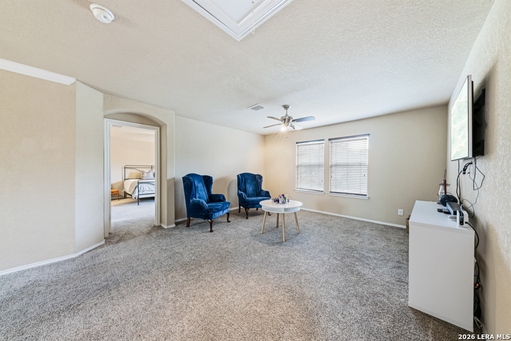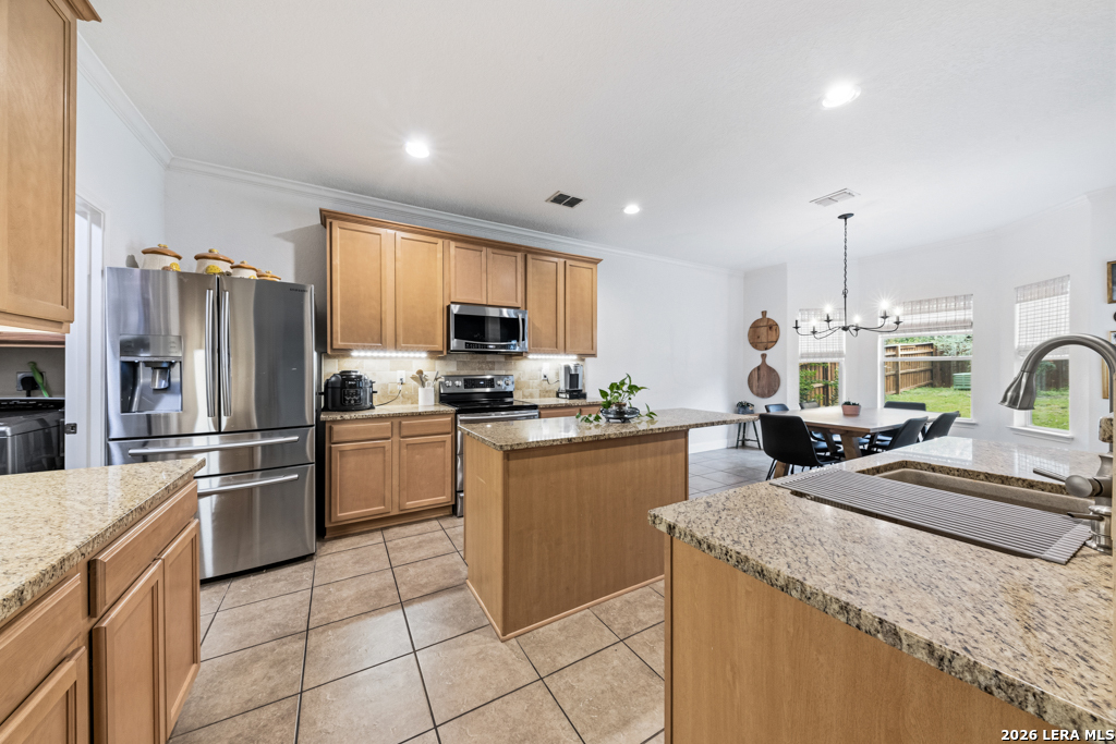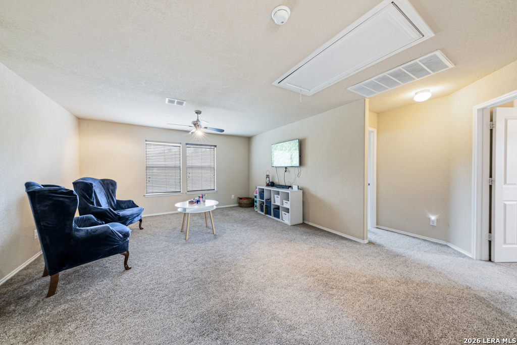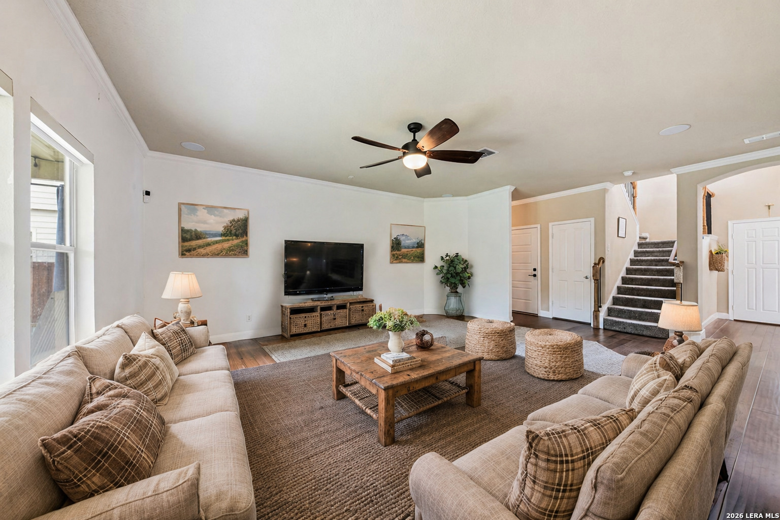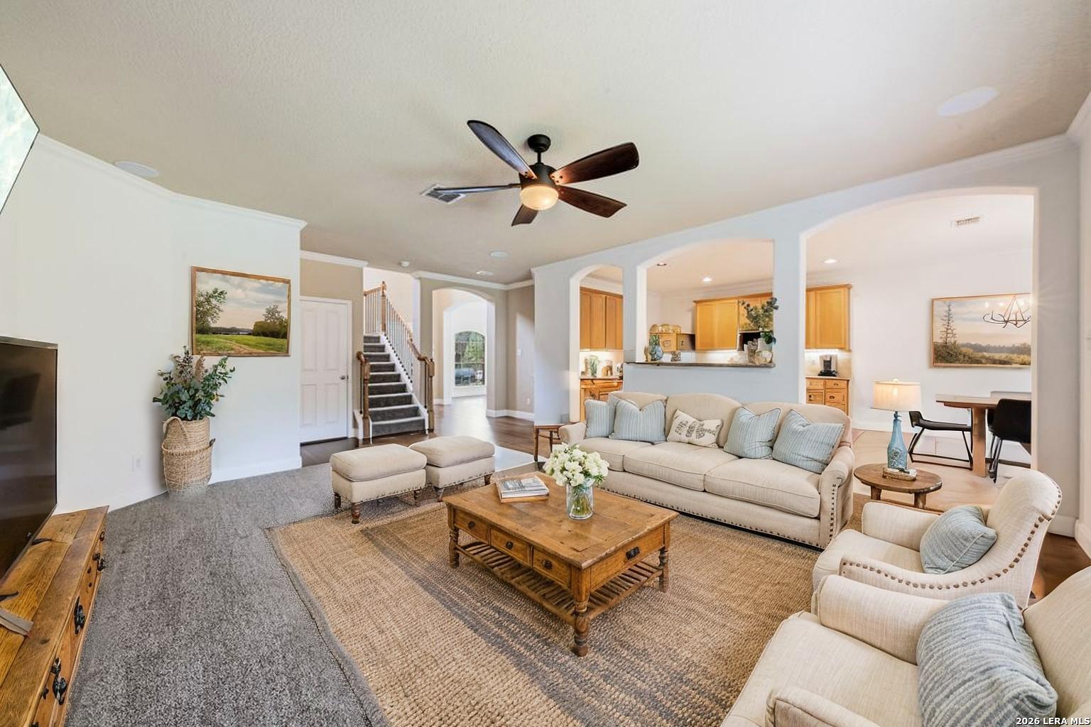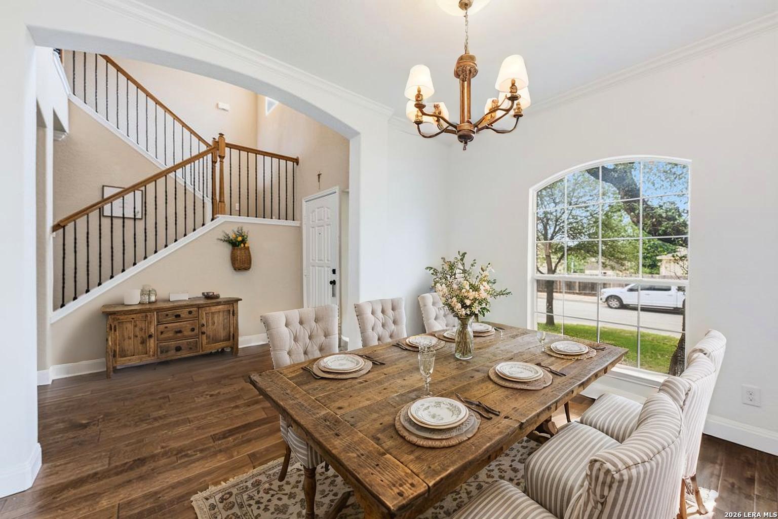 4-bedroom home with flexible floorplan in Helotes featuring a downstairs secondary bedroom, cul-de-sac location, and 20-ft greenbelt for added privacy! Enjoy relaxing on the covered front porch while taking in the cul-de-sac setting, plus access to neighborhood pool and park. ~ Step inside to a dramatic 2-story foyer and versatile layout with a formal dining that can easily function as a home office or flex space. Hardwood floors flow through the dining and walkways, leading to a spacious family room with crown molding, surround sound, and floor plug-ideal for everyday living and entertaining. ~ Bright, open kitchen offers granite countertops, large island, stainless steel appliances, double ovens, and a walk-in pantry with floor-to-ceiling storage. ~ Wrought iron staircase leads to a generous gameroom, creating separation between 2 secondary bedrooms and the private primary suite. All bedrooms feature walk-in closets. Primary suite includes double vanities, oversized walk-in shower, and a large walk-in closet. ~ Enjoy outdoor relaxation or entertaining with a covered back patio, added privacy from the greenbelt, and a storage shed to keep lawn equipment out of the garage. Garage includes space for ceiling storage and water softener. ~ Additional features include a 15 SEER Lennox HVAC system with UV light. ~ Conveniently located near 1604, shopping, dining, and major routes-this home offers space, flexibility, room to grow and functionality for a variety of lifestyles.