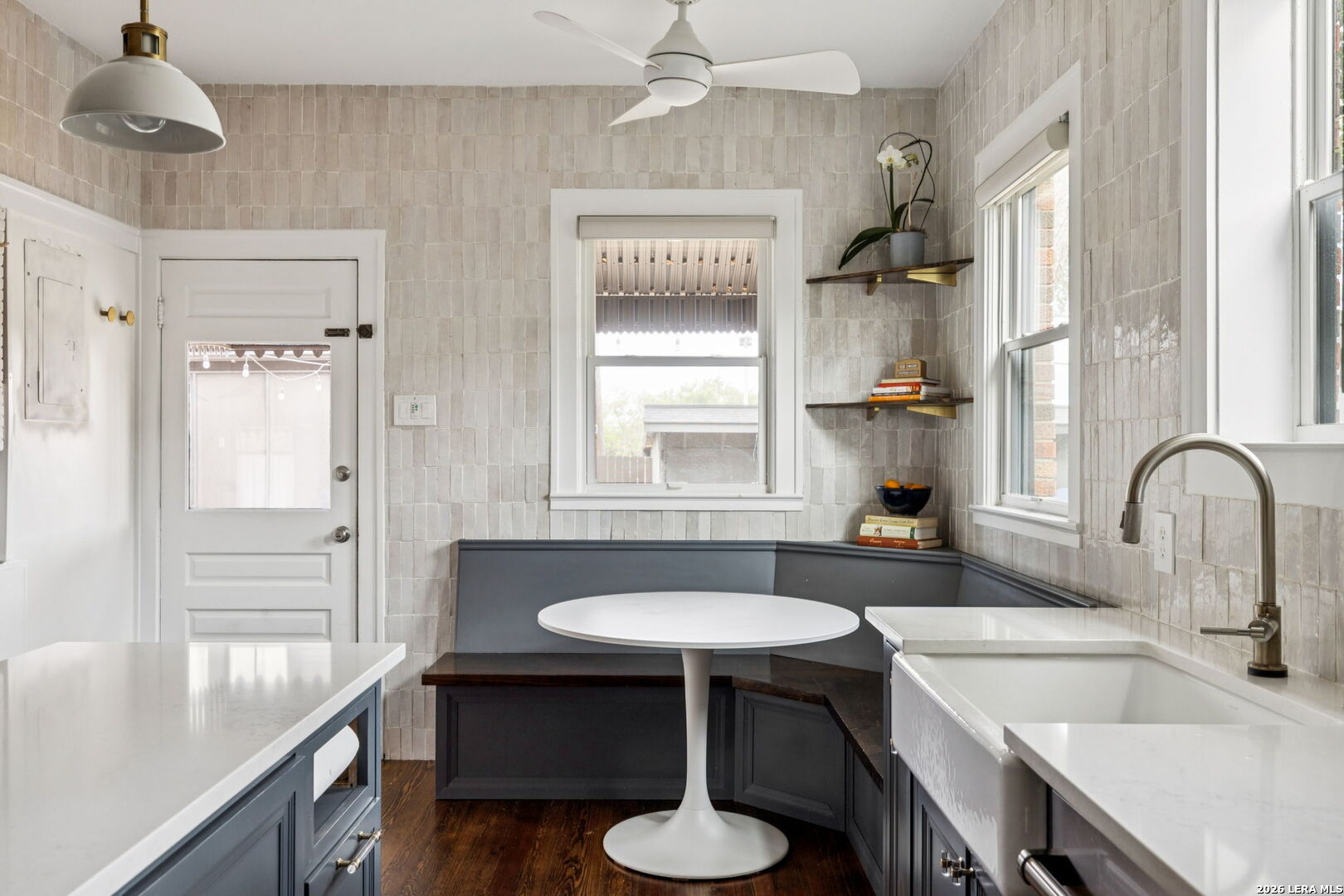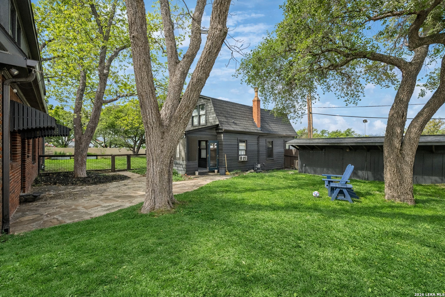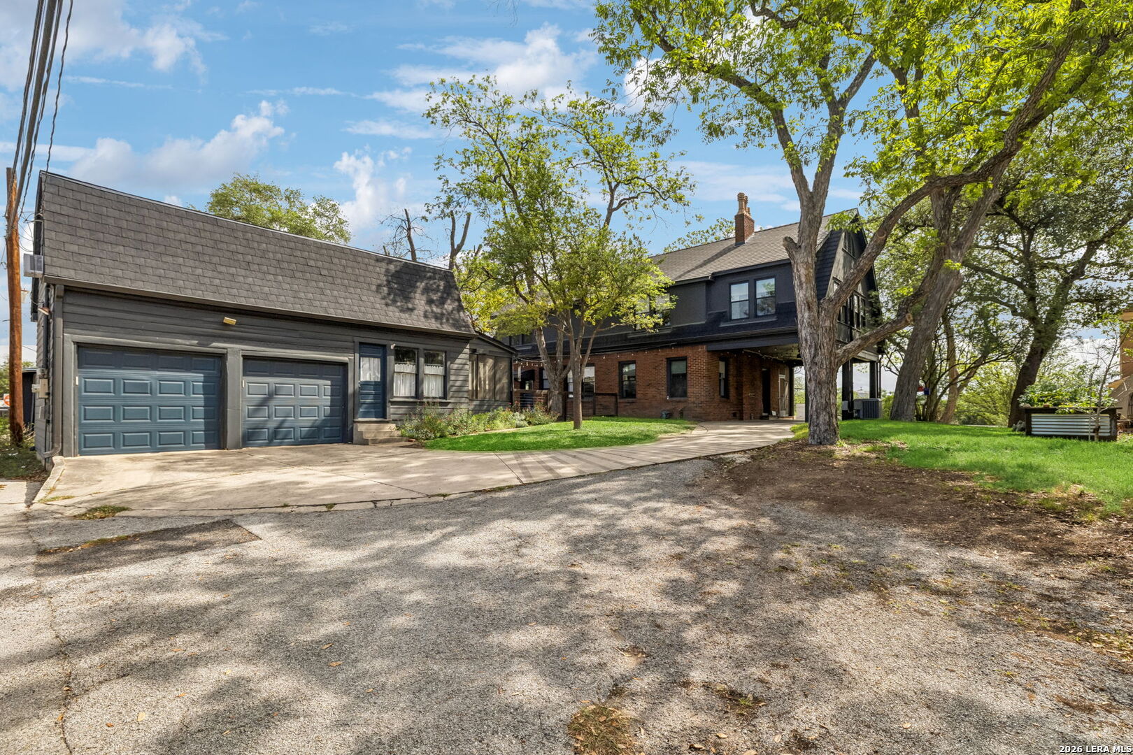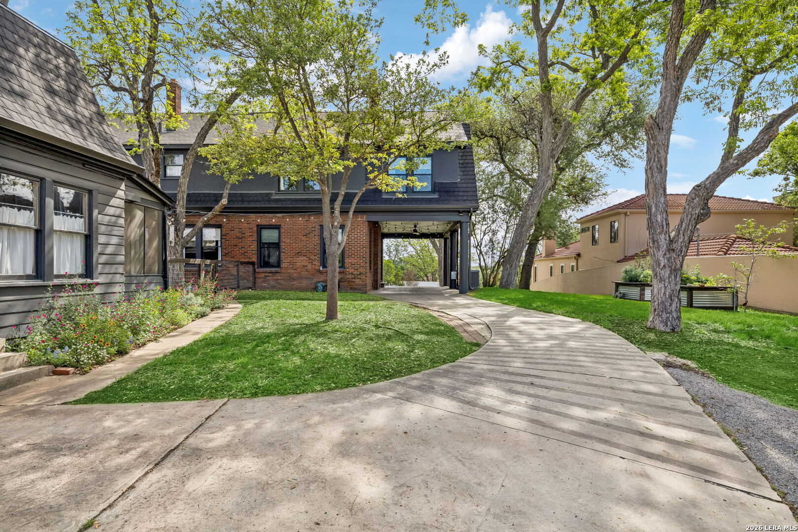 Step back in time with today's modern amenities! This historic Alamo Heights home sits on one of the highest points in '09, with views of the Tower of the Americas and downtown. Mixing 1920s heritage with handmade details from today creates a seamless story of high-end touches and compelling architecture. Each room effortlessly flows with a traditional floor plan, rotating around a central staircase. Its striking curb appeal starts with a strong brick exterior, original wood windows, slate roof, and massive yard. The custom kitchen boasts of floor-to-ceiling Zellige tile, modern appliances, custom cabinetry, and an eat-in banquette. The spacious living room (with fireplace), dining room, office, and half bath round out the ground floor. Upstairs, the bedrooms are accessed from a central landing. A spacious primary suite includes built-ins and closets (with laundry). Its spa-like bath showcases a double vanity and fully tiled walk-in shower. Two vintage guest baths each contain a tub/shower, adjacent to the guest bedrooms. A former sleeping porch was transformed to a joyful playroom (and could also be a 4th bedroom). Outside, a farmhouse-style detached two car garage includes unique first and second floor living spaces (342 sf), ready for your imagination to transform. The back yard includes a fully-fenced portion, additional detached storage sheds, vegetable garden, and a drive-through porte cochere. Steps from Alamo Heights City Hall, shopping, dining, and Cambridge Elementary, live at the top of '09, in the heart of the most desirable part of San Antonio.