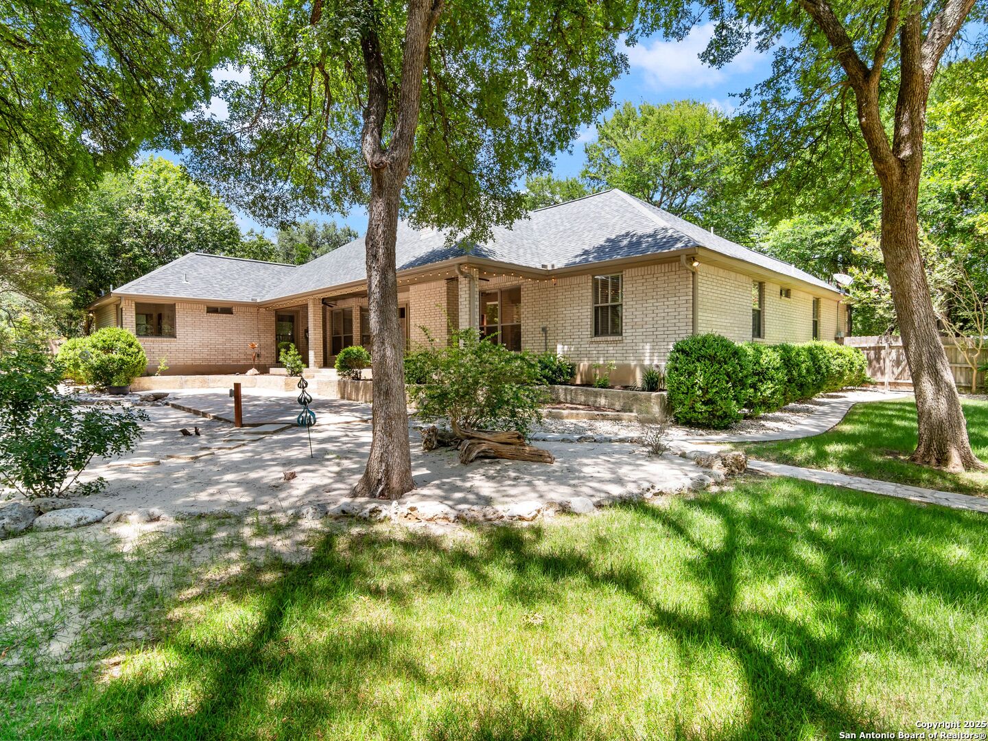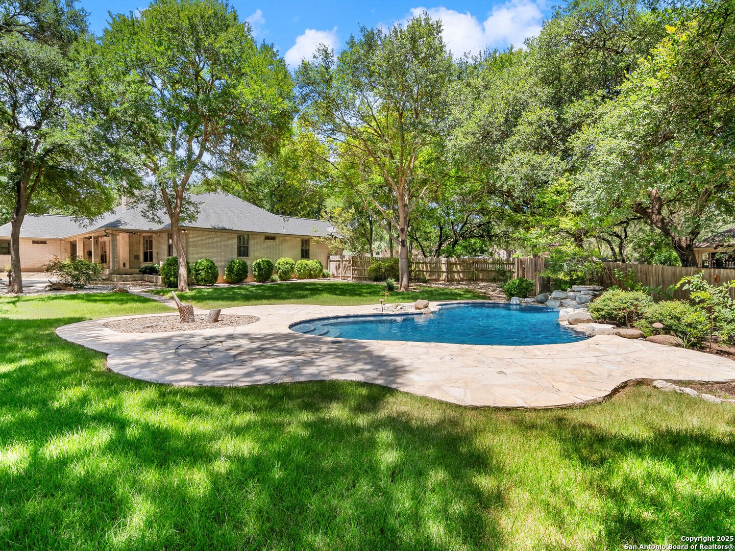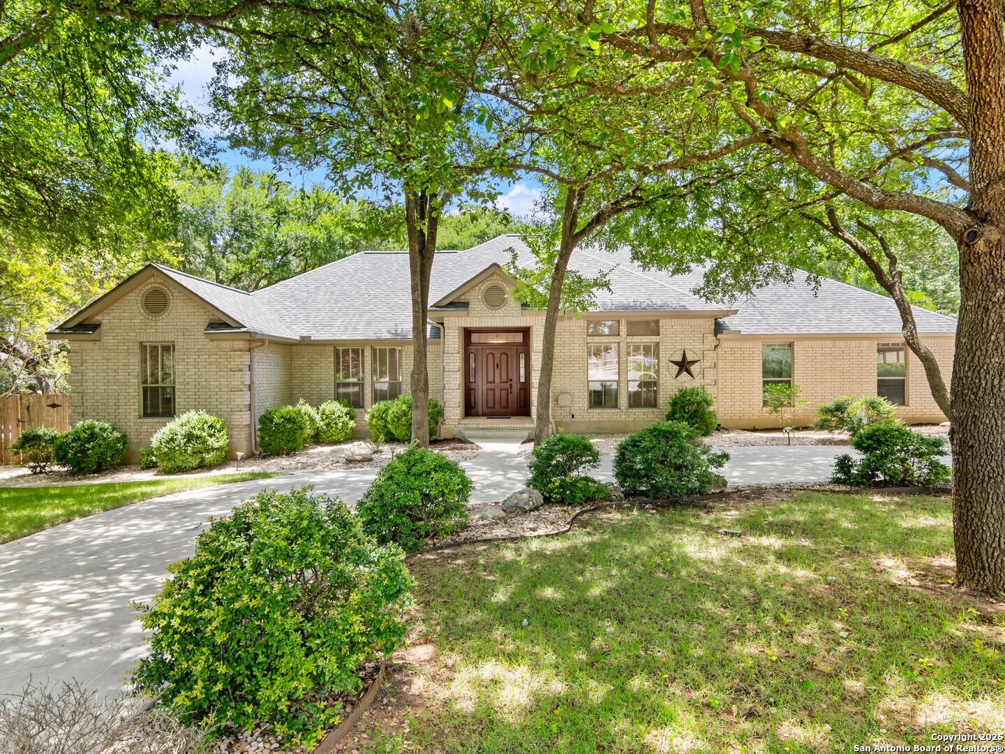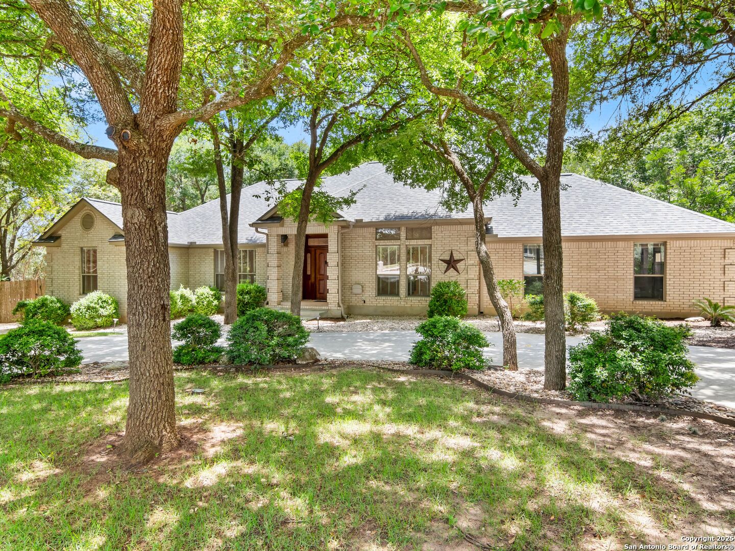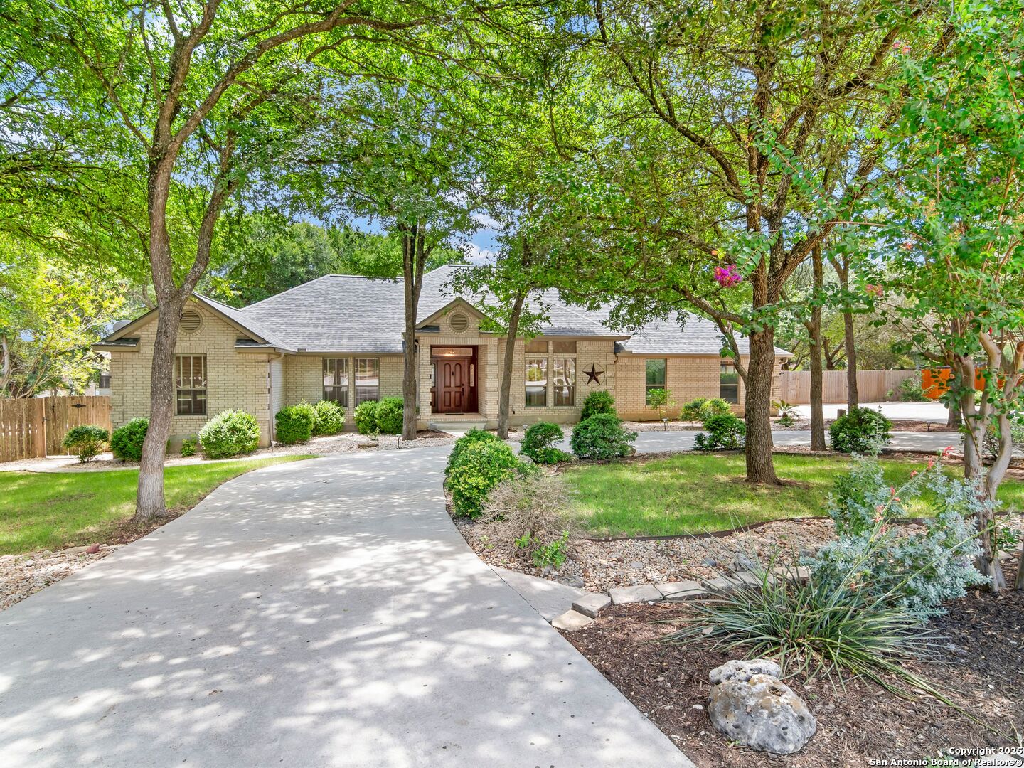 Rare opportunity in Cibolo to own an immaculate one-story on .77 acres - a true retreat in the midst of the city, spotted with majestic trees, circle drive, and spacious backyard. Freshly painted interior and upgraded lighting throughout. Family space with vaulted ceilings, custom shelving, wood burning fireplace, dual chandeliers, and rich wood flooring. The kitchen is centrally located and open to both dining and living areas with upgraded appliances, making it ideal for everyday living and entertaining. Primary suite offers outdoor access, updated primary bath, and a walk-in closet with built-ins. Secondary bedrooms boasts soaring ceilings. 4th bedroom could be used as office space/game room. Utility room offers great storage space with sink. Expansive covered patio, fire pit area, and additional outdoor living space. Pool built by renowned pool builder, Keith Zars, boasts waterfall feature and anchors the backyard while providing a true resort style amenity. Two storage buildings provide added utility-one with electricity, ideal for a workshop or studio. Located close to schools, shopping, restaurants, and major employers, with easy access to San Antonio International Airport just 25 minutes away.