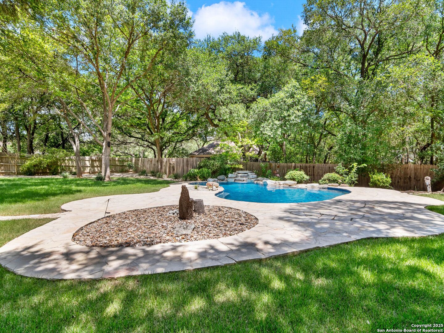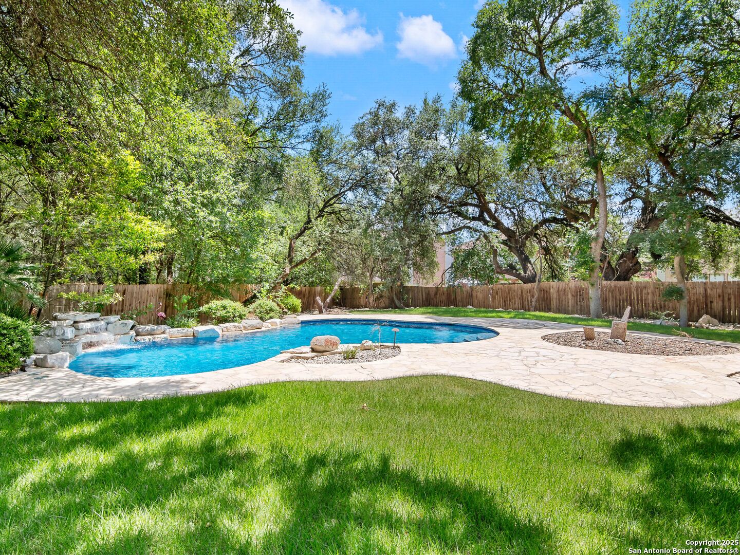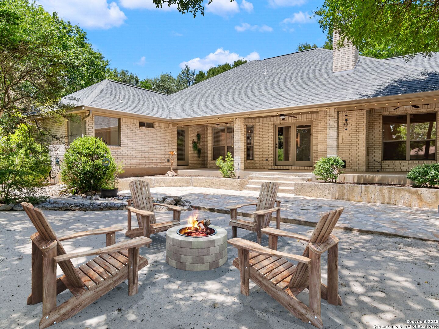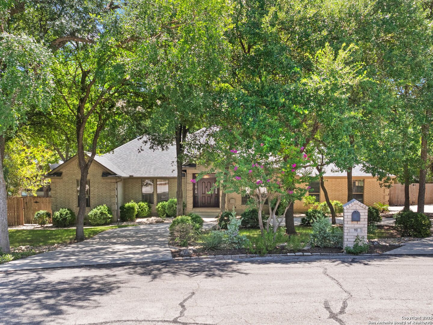 Rare opportunity in Cibolo to own an immaculate one-story on .77 acres - a true retreat in the midst of the city, spotted with majestic trees, circle drive, and spacious backyard. Freshly painted interior and upgraded lighting throughout. Family space with vaulted ceilings, custom shelving, wood burning fireplace, dual chandeliers, and rich wood flooring. The kitchen is centrally located and open to both dining and living areas with upgraded appliances, making it ideal for everyday living and entertaining. Primary suite offers outdoor access, updated primary bath, and a walk-in closet with built-ins. Secondary bedrooms boasts soaring ceilings. 4th bedroom could be used as office space/game room. Utility room offers great storage space with sink. Expansive covered patio, fire pit area, and additional outdoor living space. Pool built by renowned pool builder, Keith Zars, boasts waterfall feature and anchors the backyard while providing a true resort style amenity. Two storage buildings provide added utility-one with electricity, ideal for a workshop or studio. Located close to schools, shopping, restaurants, and major employers, with easy access to San Antonio International Airport just 25 minutes away.