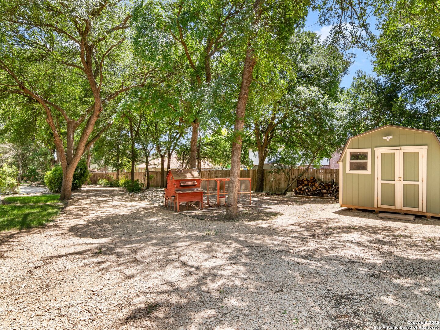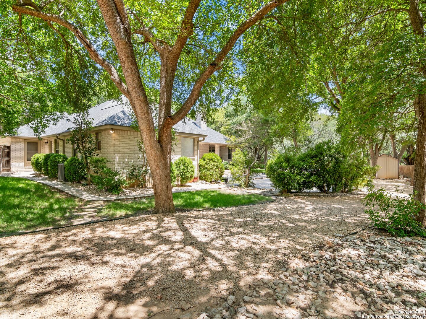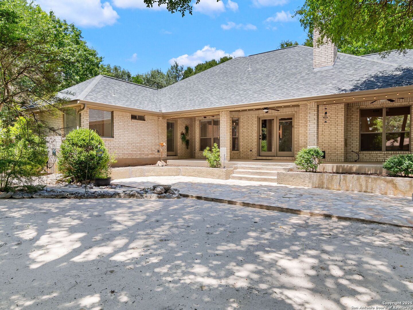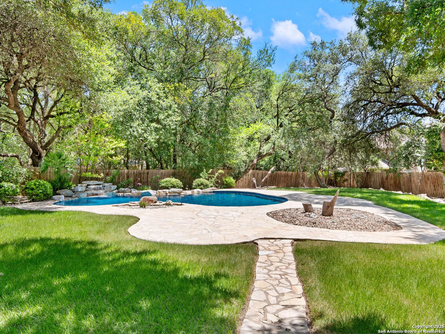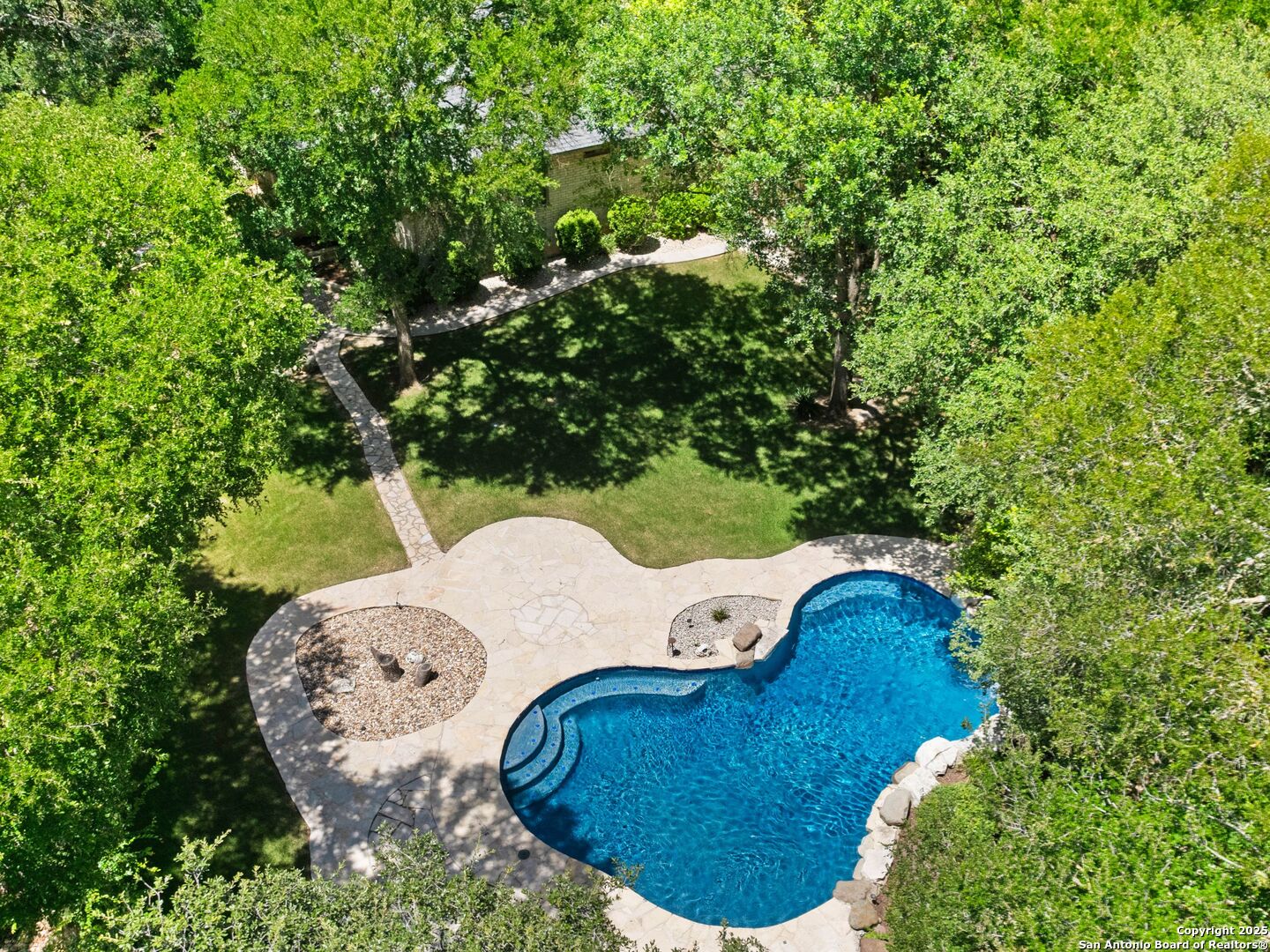 Rare opportunity in Cibolo to own an immaculate one-story on .77 acres - a true retreat in the midst of the city, spotted with majestic trees, circle drive, and spacious backyard. Freshly painted interior and upgraded lighting throughout. Family space with vaulted ceilings, custom shelving, wood burning fireplace, dual chandeliers, and rich wood flooring. The kitchen is centrally located and open to both dining and living areas with upgraded appliances, making it ideal for everyday living and entertaining. Primary suite offers outdoor access, updated primary bath, and a walk-in closet with built-ins. Secondary bedrooms boasts soaring ceilings. 4th bedroom could be used as office space/game room. Utility room offers great storage space with sink. Expansive covered patio, fire pit area, and additional outdoor living space. Pool built by renowned pool builder, Keith Zars, boasts waterfall feature and anchors the backyard while providing a true resort style amenity. Two storage buildings provide added utility-one with electricity, ideal for a workshop or studio. Located close to schools, shopping, restaurants, and major employers, with easy access to San Antonio International Airport just 25 minutes away.