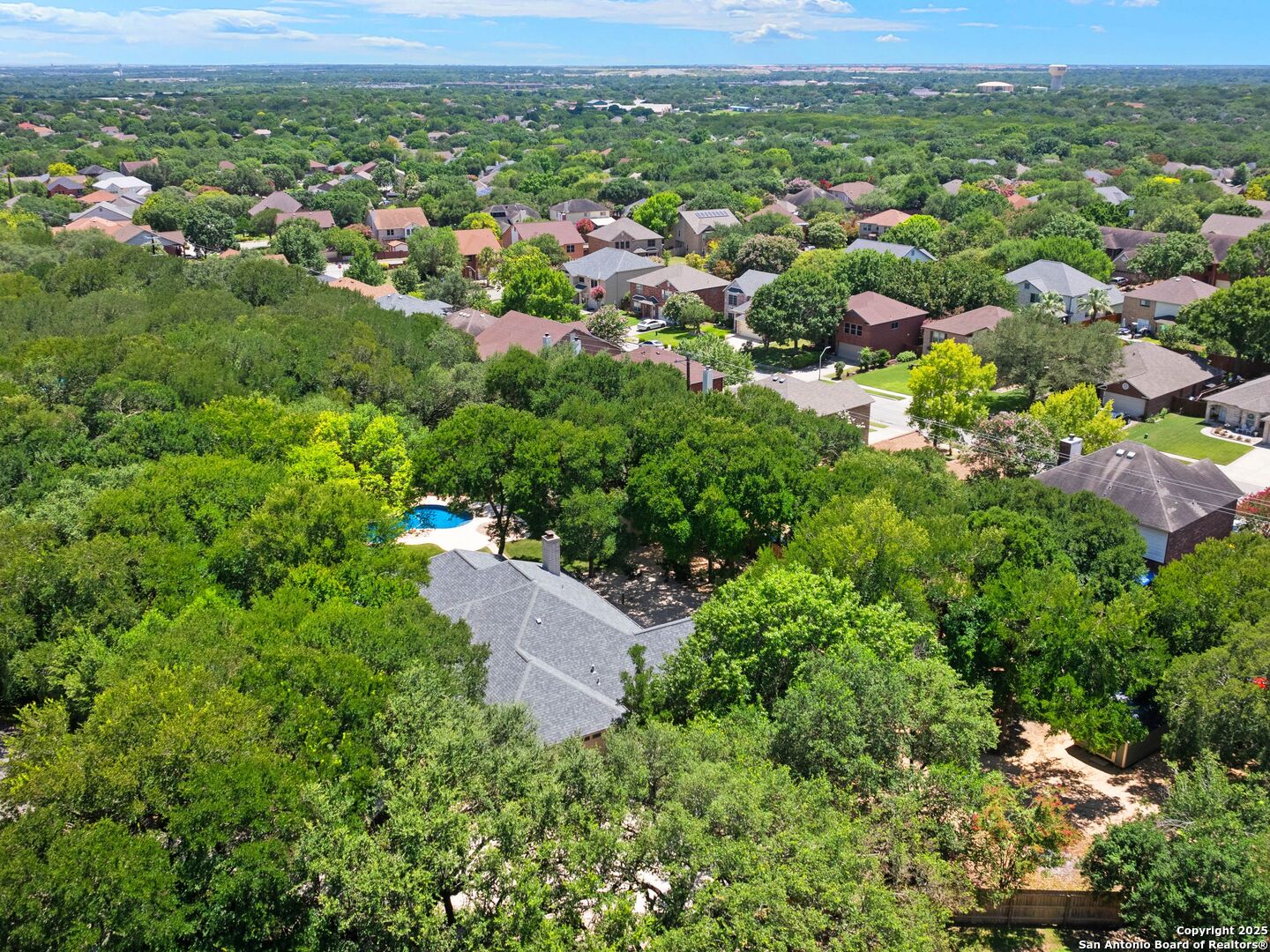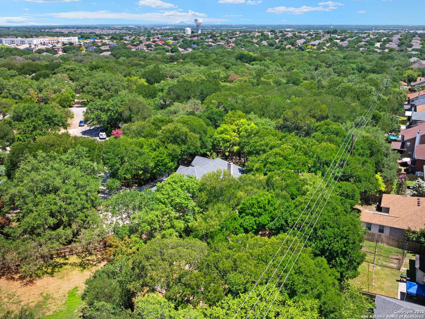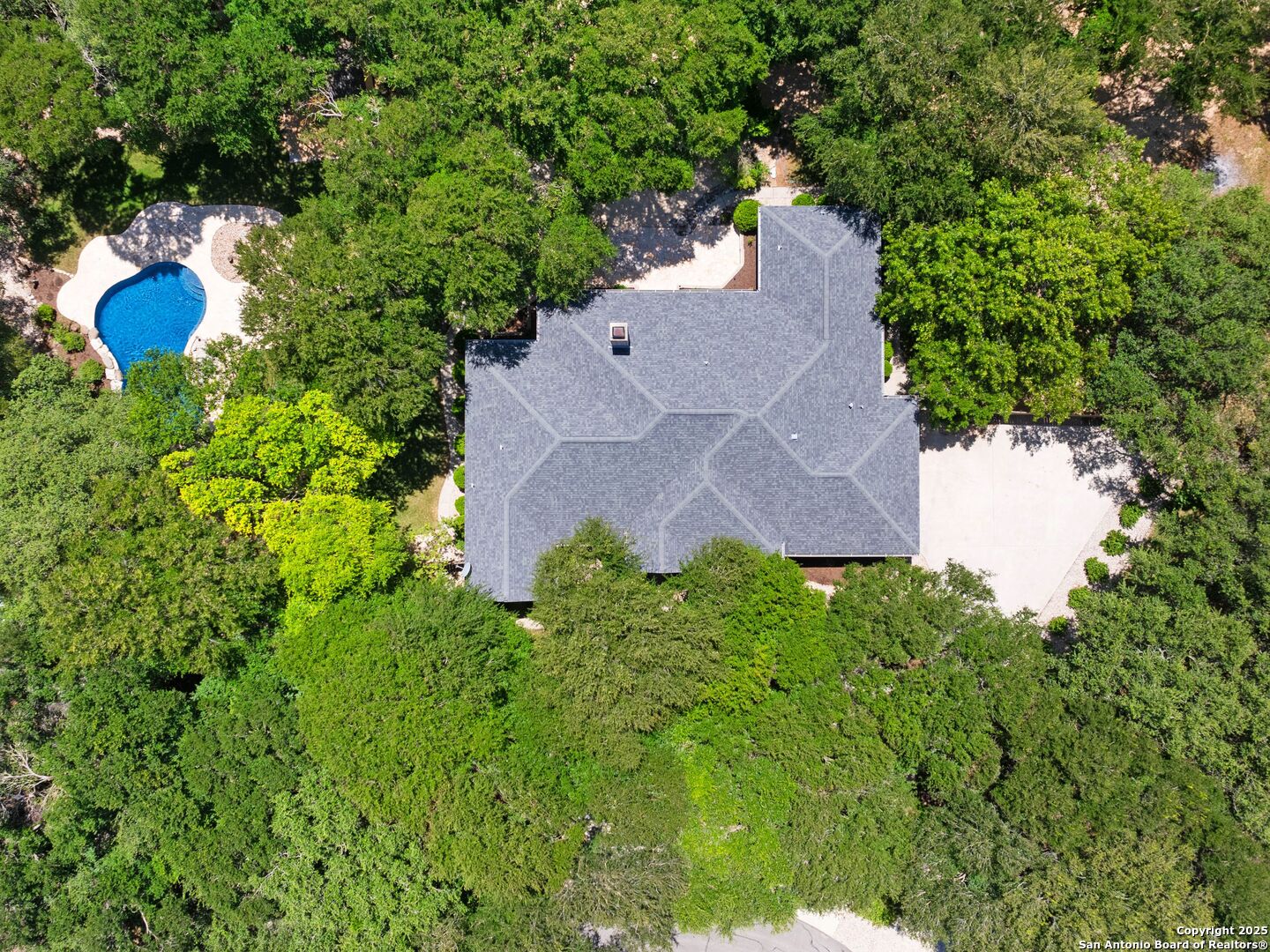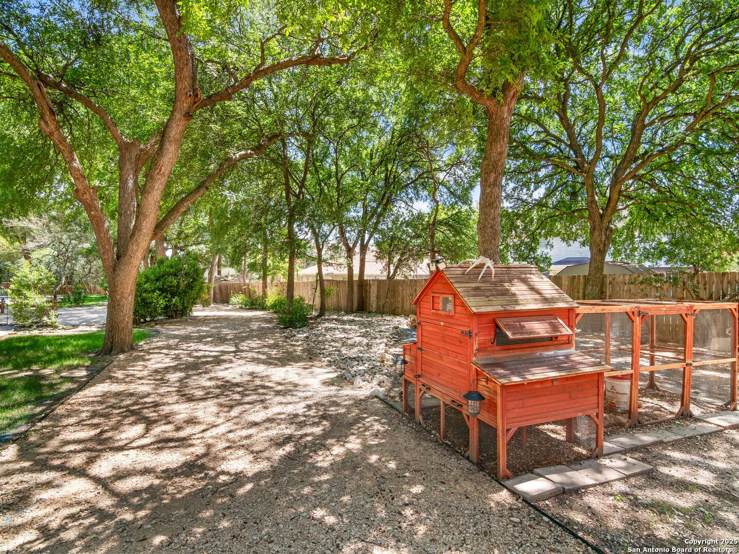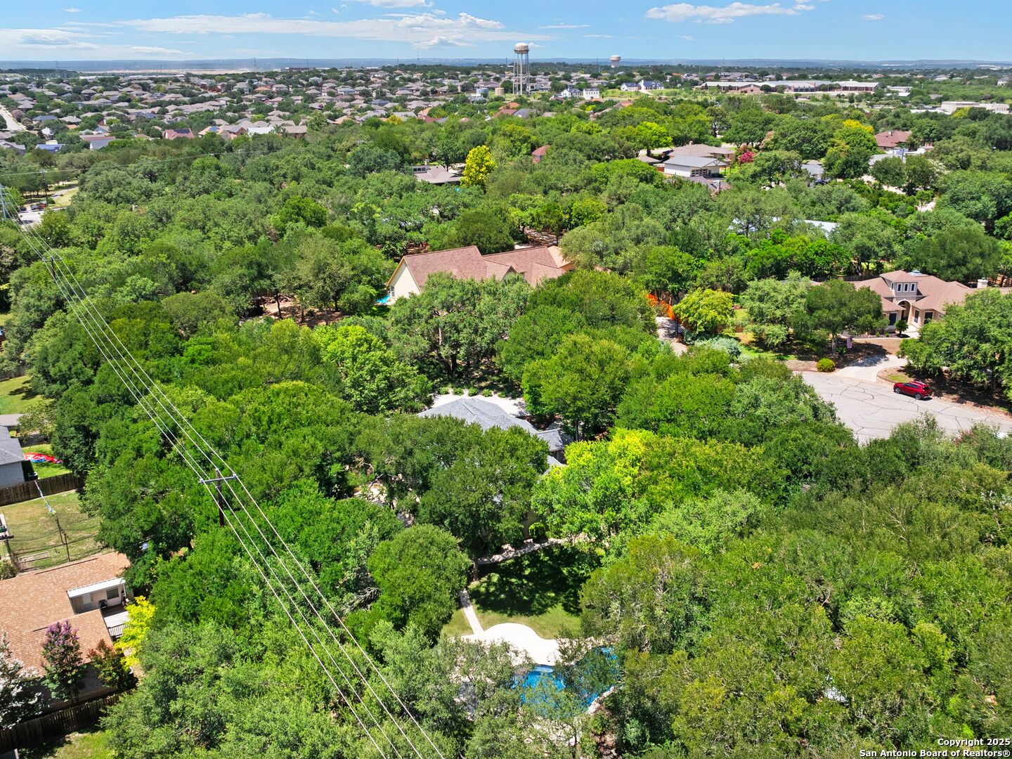 Rare opportunity in Cibolo to own an immaculate one-story on .77 acres - a true retreat in the midst of the city, spotted with majestic trees, circle drive, and spacious backyard. Freshly painted interior and upgraded lighting throughout. Family space with vaulted ceilings, custom shelving, wood burning fireplace, dual chandeliers, and rich wood flooring. The kitchen is centrally located and open to both dining and living areas with upgraded appliances, making it ideal for everyday living and entertaining. Primary suite offers outdoor access, updated primary bath, and a walk-in closet with built-ins. Secondary bedrooms boasts soaring ceilings. 4th bedroom could be used as office space/game room. Utility room offers great storage space with sink. Expansive covered patio, fire pit area, and additional outdoor living space. Pool built by renowned pool builder, Keith Zars, boasts waterfall feature and anchors the backyard while providing a true resort style amenity. Two storage buildings provide added utility-one with electricity, ideal for a workshop or studio. Located close to schools, shopping, restaurants, and major employers, with easy access to San Antonio International Airport just 25 minutes away.