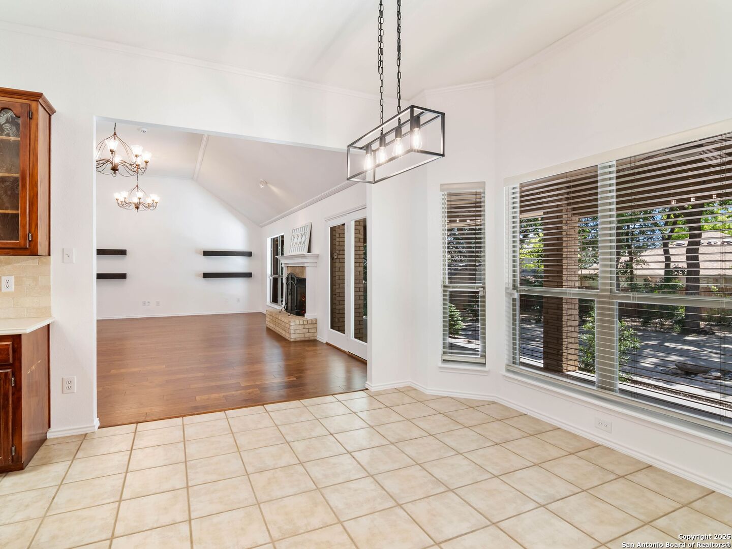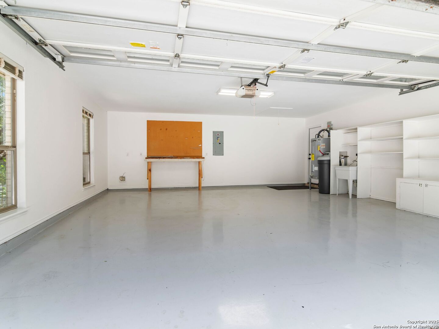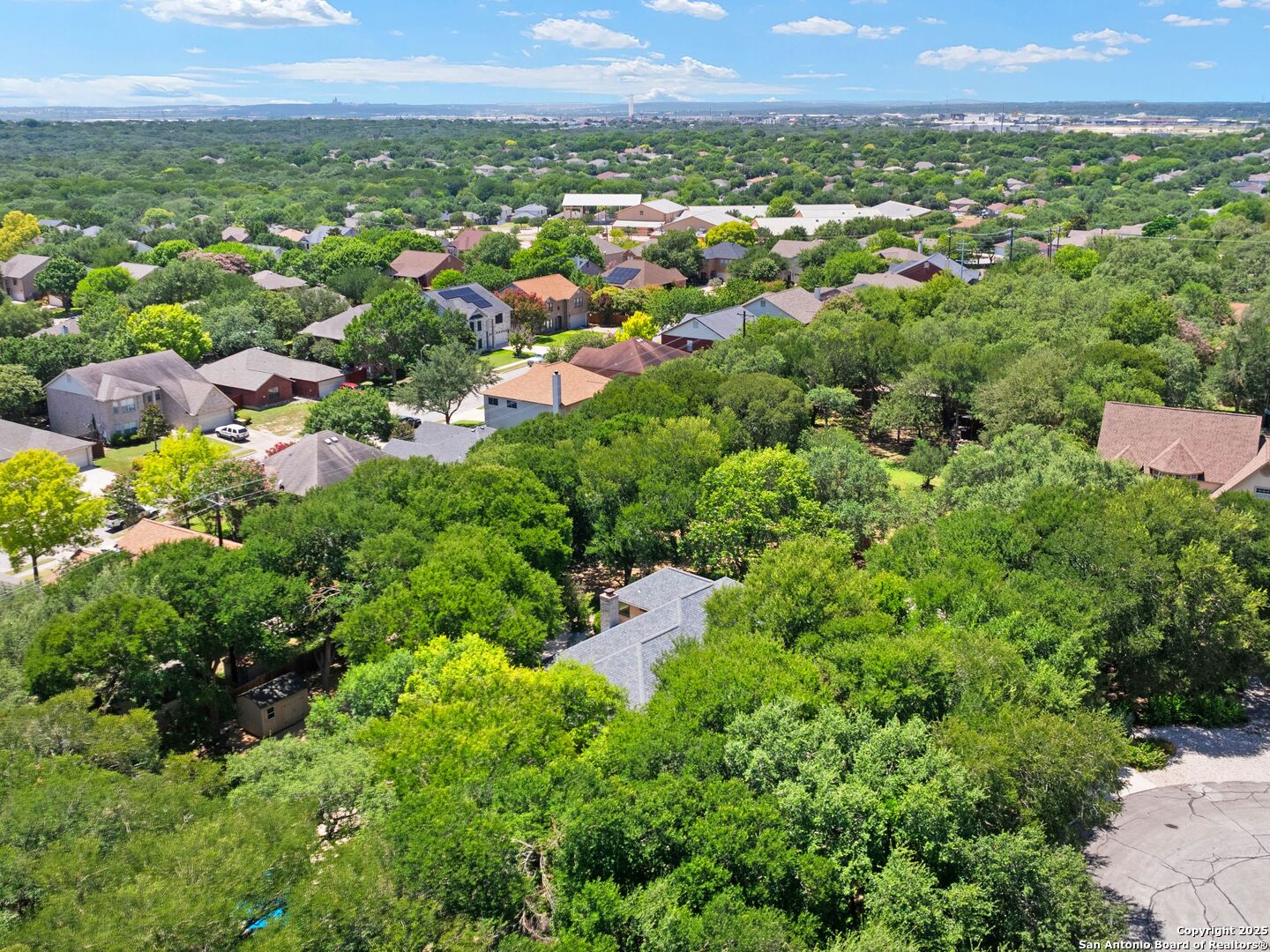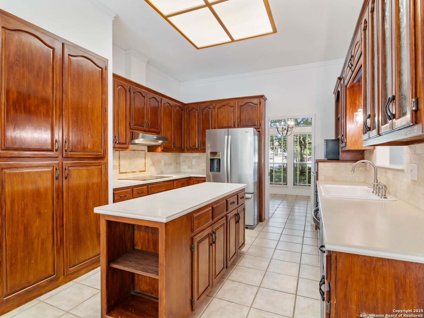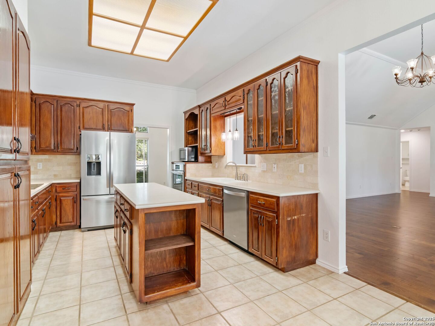 Rare opportunity in Cibolo to own an immaculate one-story on .77 acres - a true retreat in the midst of the city, spotted with majestic trees, circle drive, and spacious backyard. Freshly painted interior and upgraded lighting throughout. Family space with vaulted ceilings, custom shelving, wood burning fireplace, dual chandeliers, and rich wood flooring. The kitchen is centrally located and open to both dining and living areas with upgraded appliances, making it ideal for everyday living and entertaining. Primary suite offers outdoor access, updated primary bath, and a walk-in closet with built-ins. Secondary bedrooms boasts soaring ceilings. 4th bedroom could be used as office space/game room. Utility room offers great storage space with sink. Expansive covered patio, fire pit area, and additional outdoor living space. Pool built by renowned pool builder, Keith Zars, boasts waterfall feature and anchors the backyard while providing a true resort style amenity. Two storage buildings provide added utility-one with electricity, ideal for a workshop or studio. Located close to schools, shopping, restaurants, and major employers, with easy access to San Antonio International Airport just 25 minutes away.