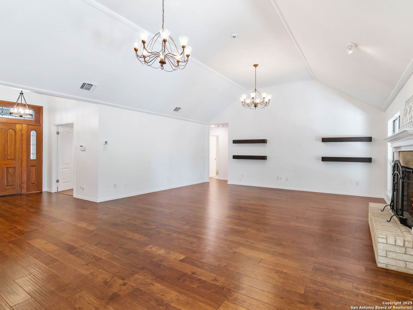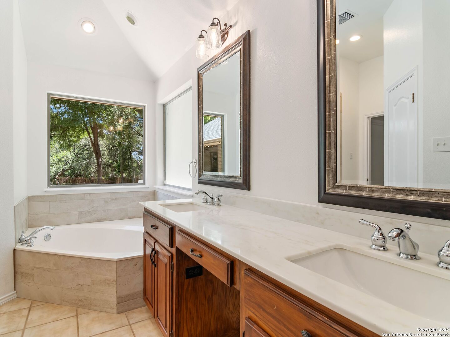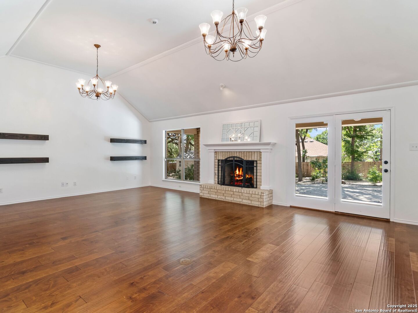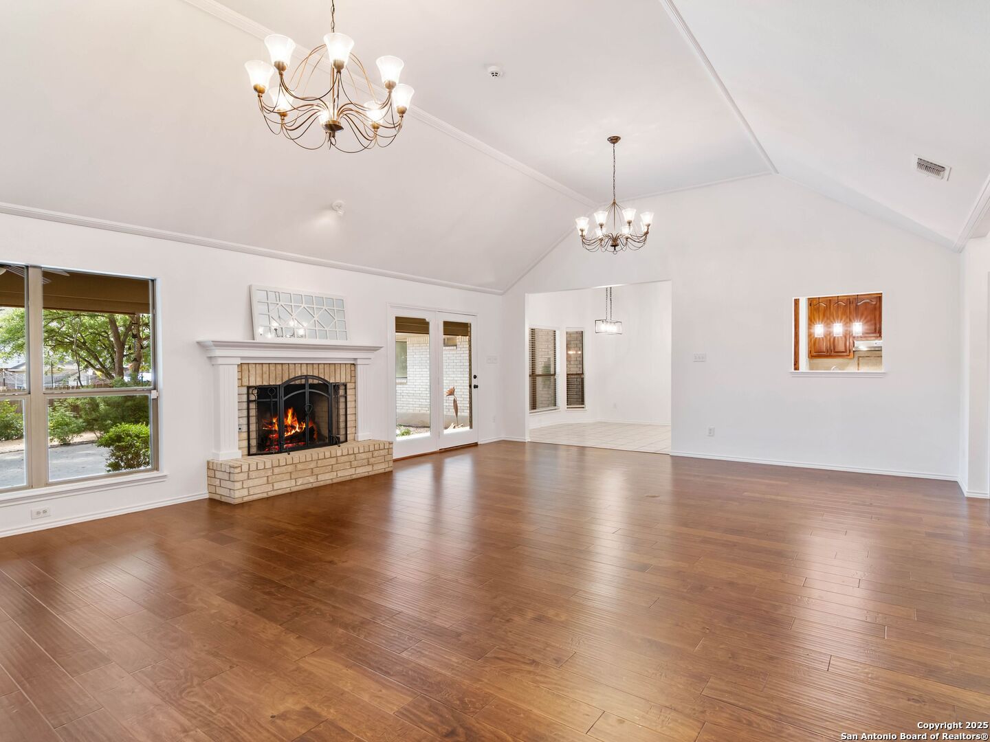 Rare opportunity in Cibolo to own an immaculate one-story on .77 acres - a true retreat in the midst of the city, spotted with majestic trees, circle drive, and spacious backyard. Freshly painted interior and upgraded lighting throughout. Family space with vaulted ceilings, custom shelving, wood burning fireplace, dual chandeliers, and rich wood flooring. The kitchen is centrally located and open to both dining and living areas with upgraded appliances, making it ideal for everyday living and entertaining. Primary suite offers outdoor access, updated primary bath, and a walk-in closet with built-ins. Secondary bedrooms boasts soaring ceilings. 4th bedroom could be used as office space/game room. Utility room offers great storage space with sink. Expansive covered patio, fire pit area, and additional outdoor living space. Pool built by renowned pool builder, Keith Zars, boasts waterfall feature and anchors the backyard while providing a true resort style amenity. Two storage buildings provide added utility-one with electricity, ideal for a workshop or studio. Located close to schools, shopping, restaurants, and major employers, with easy access to San Antonio International Airport just 25 minutes away.