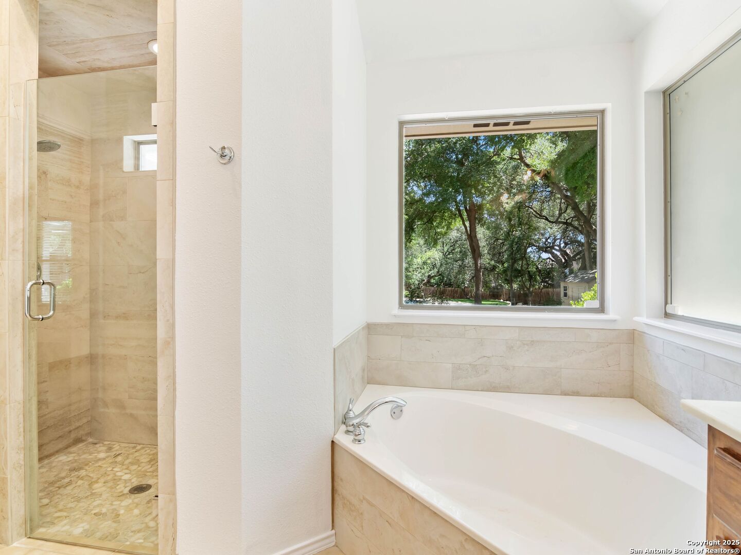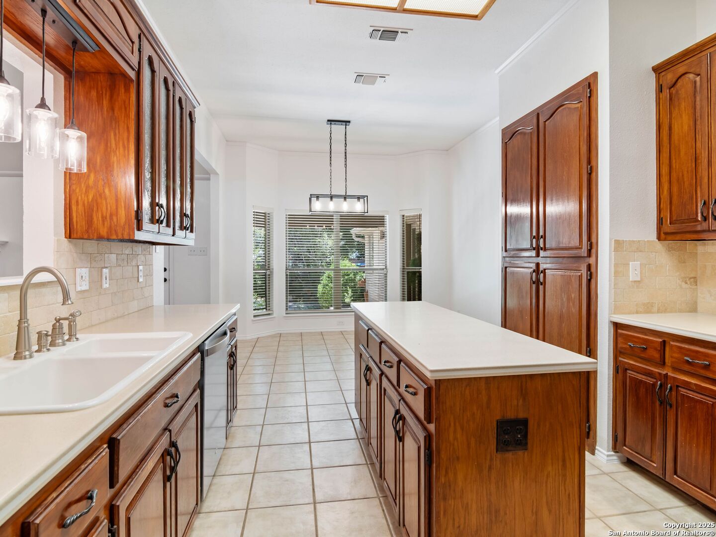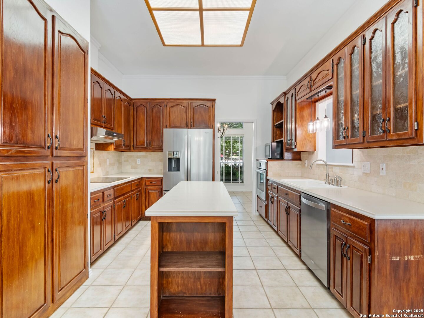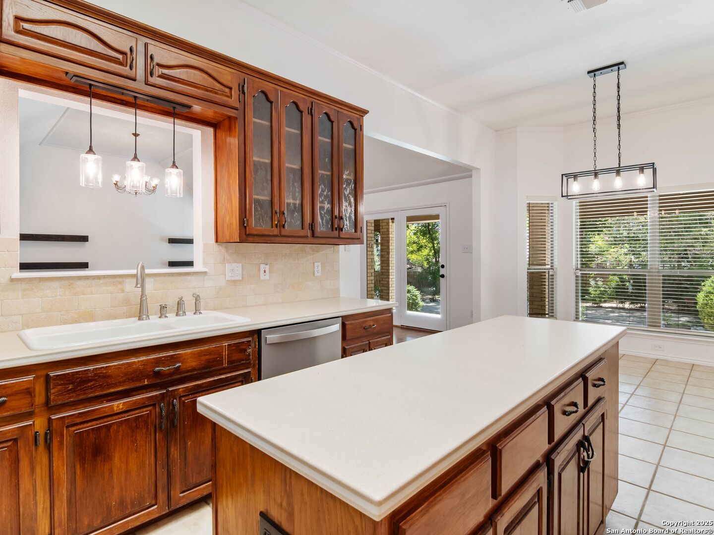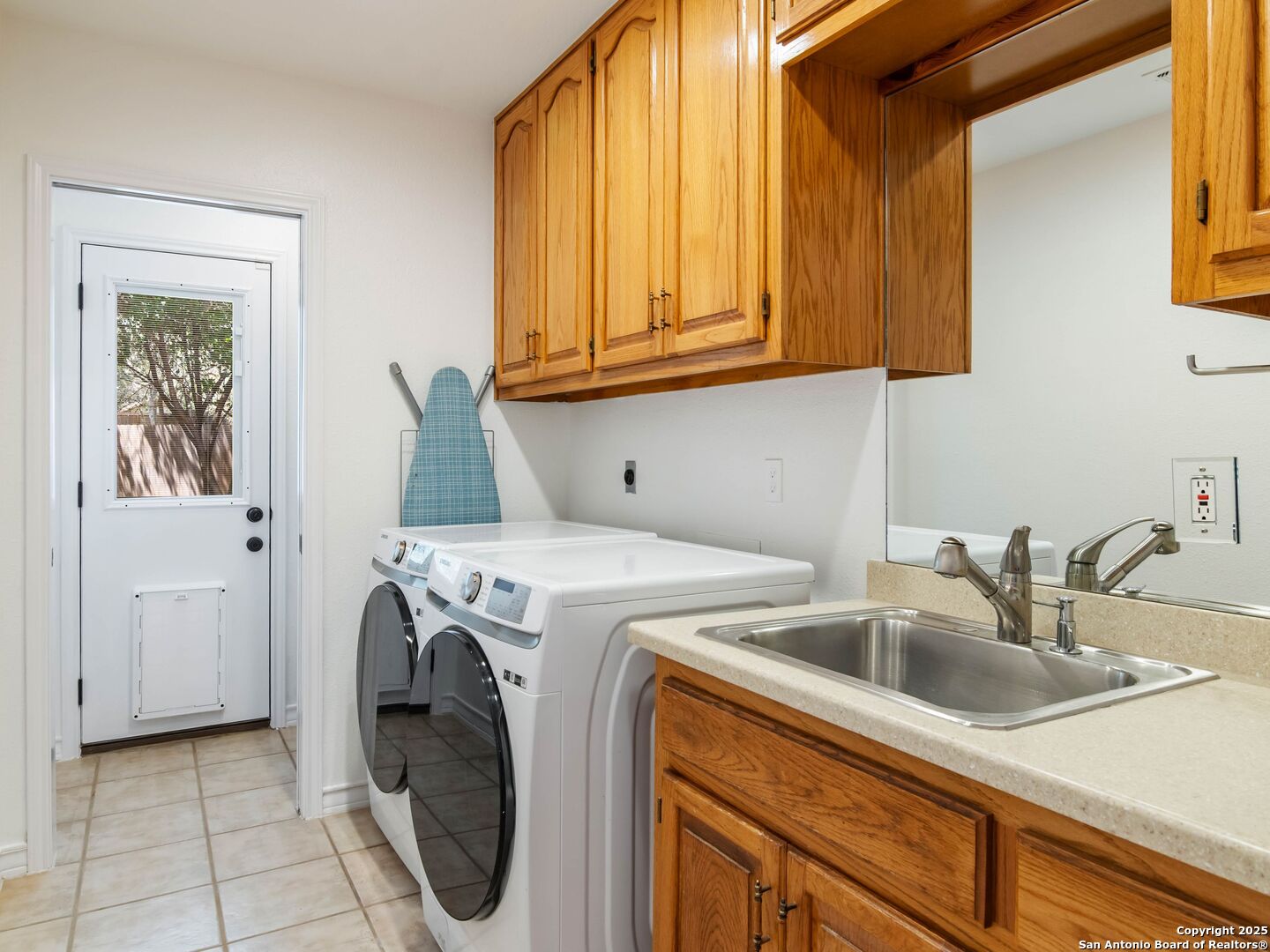 Rare opportunity in Cibolo to own an immaculate one-story on .77 acres - a true retreat in the midst of the city, spotted with majestic trees, circle drive, and spacious backyard. Freshly painted interior and upgraded lighting throughout. Family space with vaulted ceilings, custom shelving, wood burning fireplace, dual chandeliers, and rich wood flooring. The kitchen is centrally located and open to both dining and living areas with upgraded appliances, making it ideal for everyday living and entertaining. Primary suite offers outdoor access, updated primary bath, and a walk-in closet with built-ins. Secondary bedrooms boasts soaring ceilings. 4th bedroom could be used as office space/game room. Utility room offers great storage space with sink. Expansive covered patio, fire pit area, and additional outdoor living space. Pool built by renowned pool builder, Keith Zars, boasts waterfall feature and anchors the backyard while providing a true resort style amenity. Two storage buildings provide added utility-one with electricity, ideal for a workshop or studio. Located close to schools, shopping, restaurants, and major employers, with easy access to San Antonio International Airport just 25 minutes away.