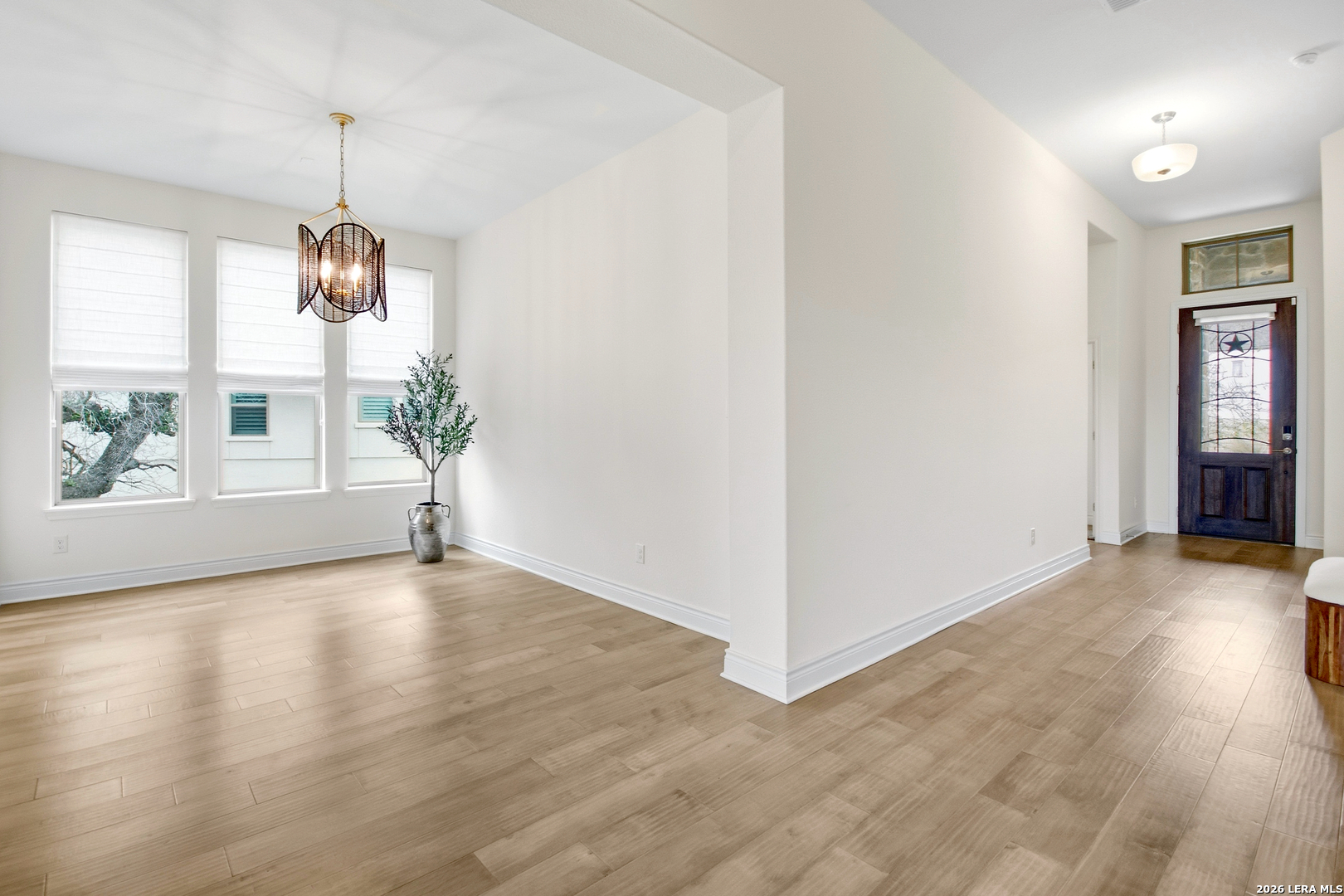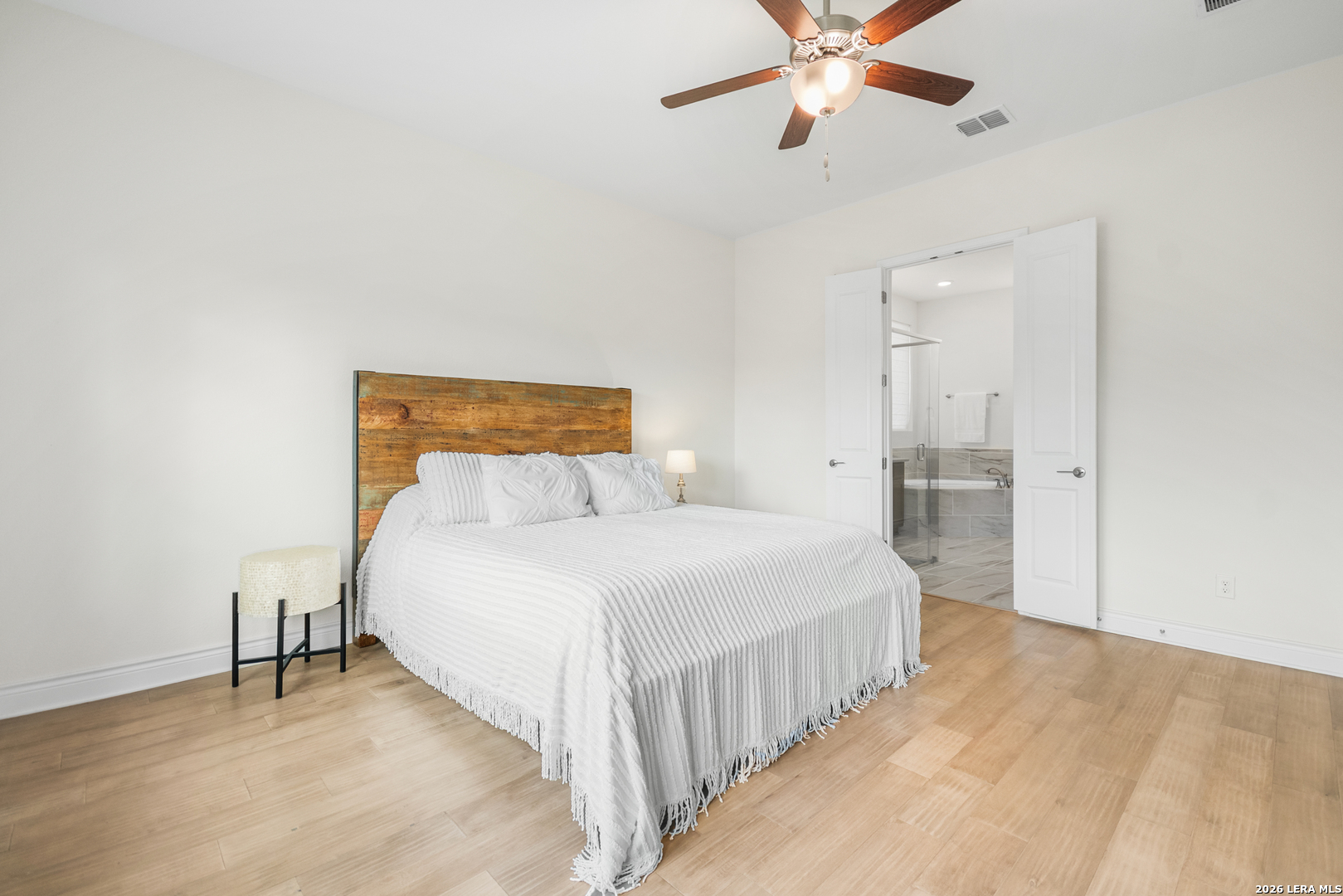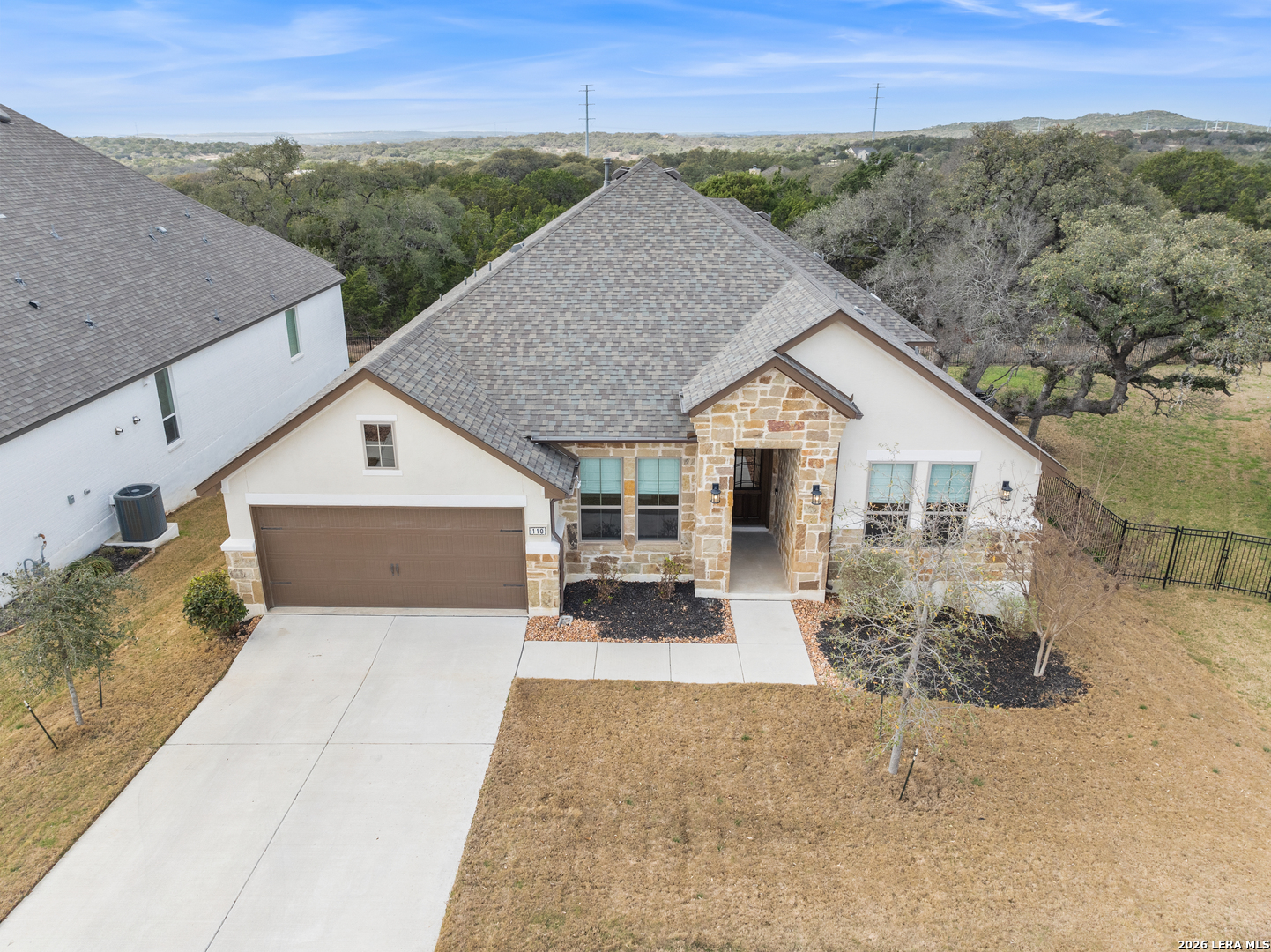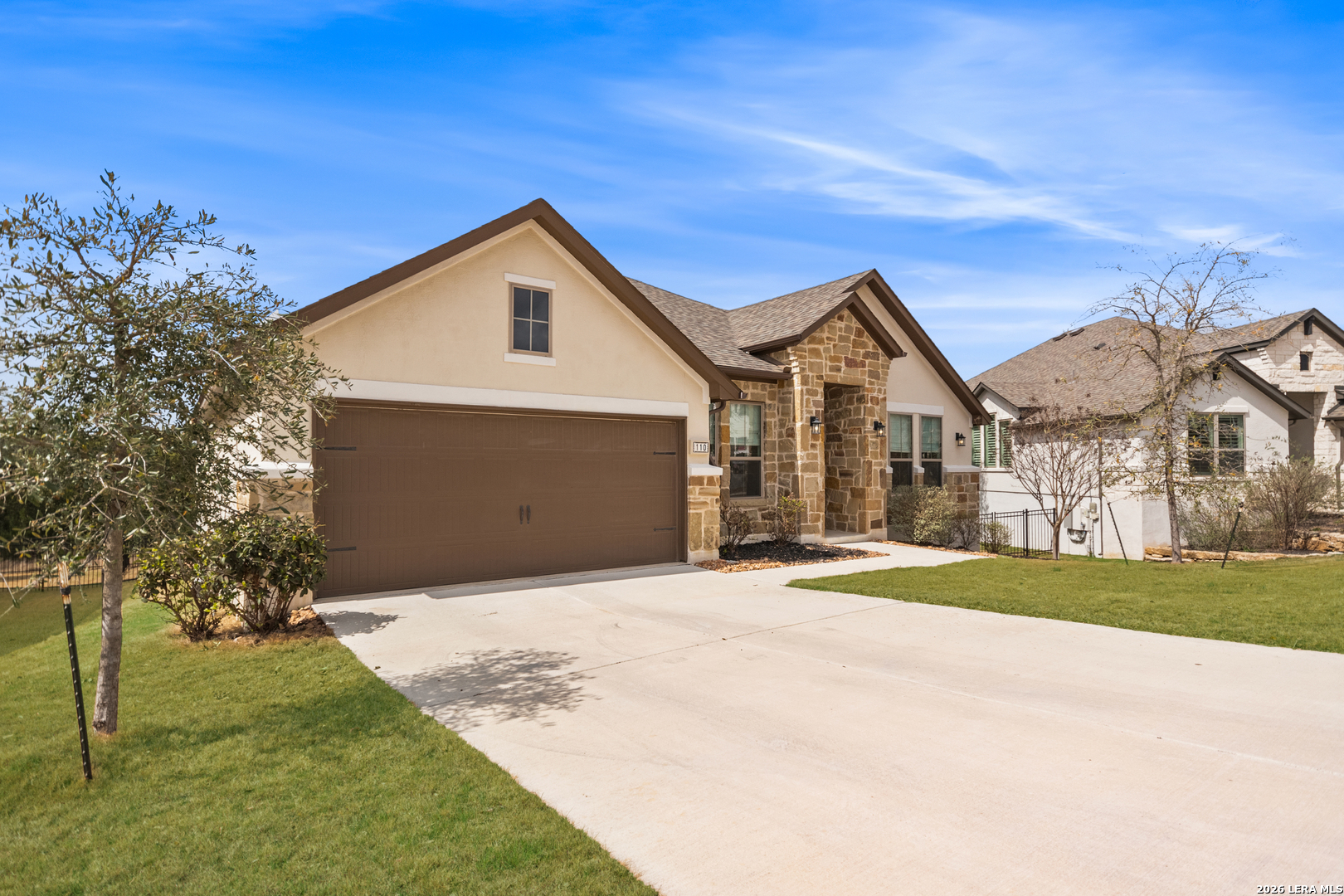 Located in the highly desirable Esperanza community, this 4-bedroom, 3-bathroom single-story home offers 2,645 square feet of well-designed living space. Built in 2023 by Monticello Homes, the open floor plan features high ceilings, wood flooring in the main living areas, and abundant natural light from a wall of windows overlooking the backyard. The kitchen includes a large island, quartz countertops, dark cabinetry, stainless steel appliances, and gas cooking, and opens directly to the main living and dining areas-ideal for everyday living and entertaining. A separate game room provides additional flexible living space. The primary suite is privately located at the back of the home and features a spacious bathroom with a soaking tub, oversized shower, dual vanities, and a walk-in closet. Two secondary bedrooms share a Jack-and-Jill bathroom, while a fourth bedroom and full bath are located near the front of the home, making it a great option for guests or a home office. Outside, the covered patio is ideal for entertaining, surrounded by metal wrought iron fencing and a private, tree-lined backyard. The home also includes a three-car tandem garage, water softener, tankless water heater, and a full sprinkler system. Located in Boerne ISD and just minutes from shopping, dining, and downtown Boerne. Esperanza residents enjoy access to resort-style amenities including a pool, lazy river, clubhouse, fitness center, dog park, and jogging trails.