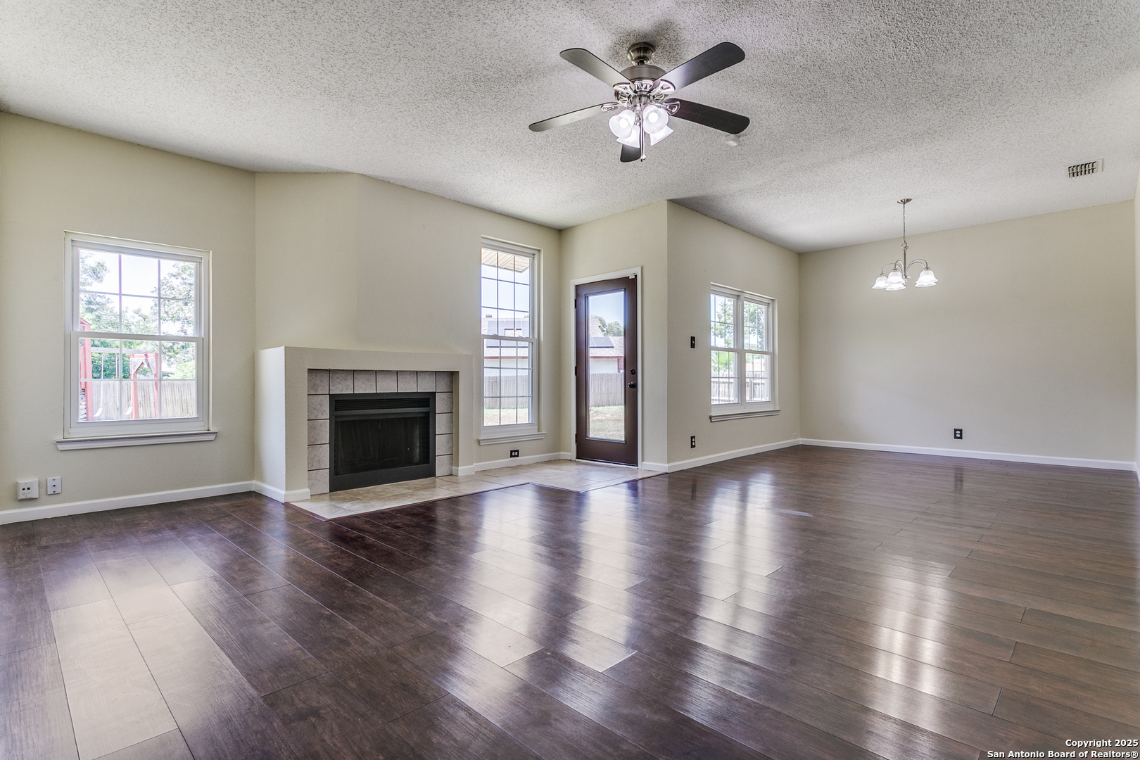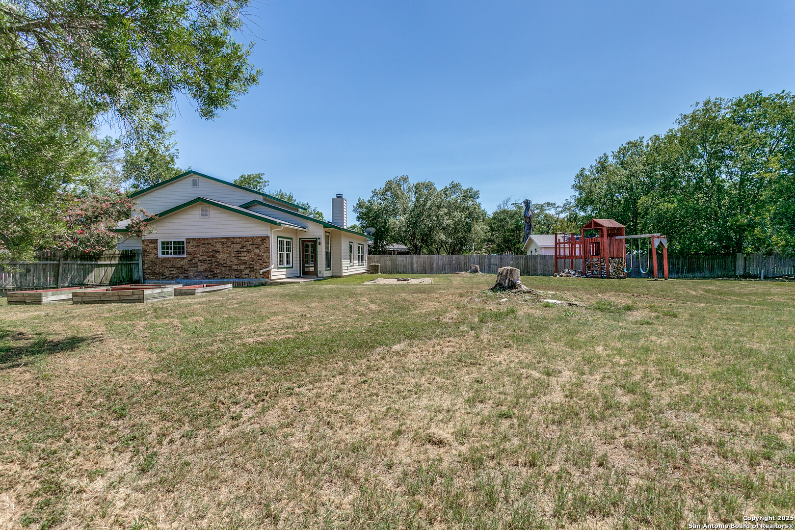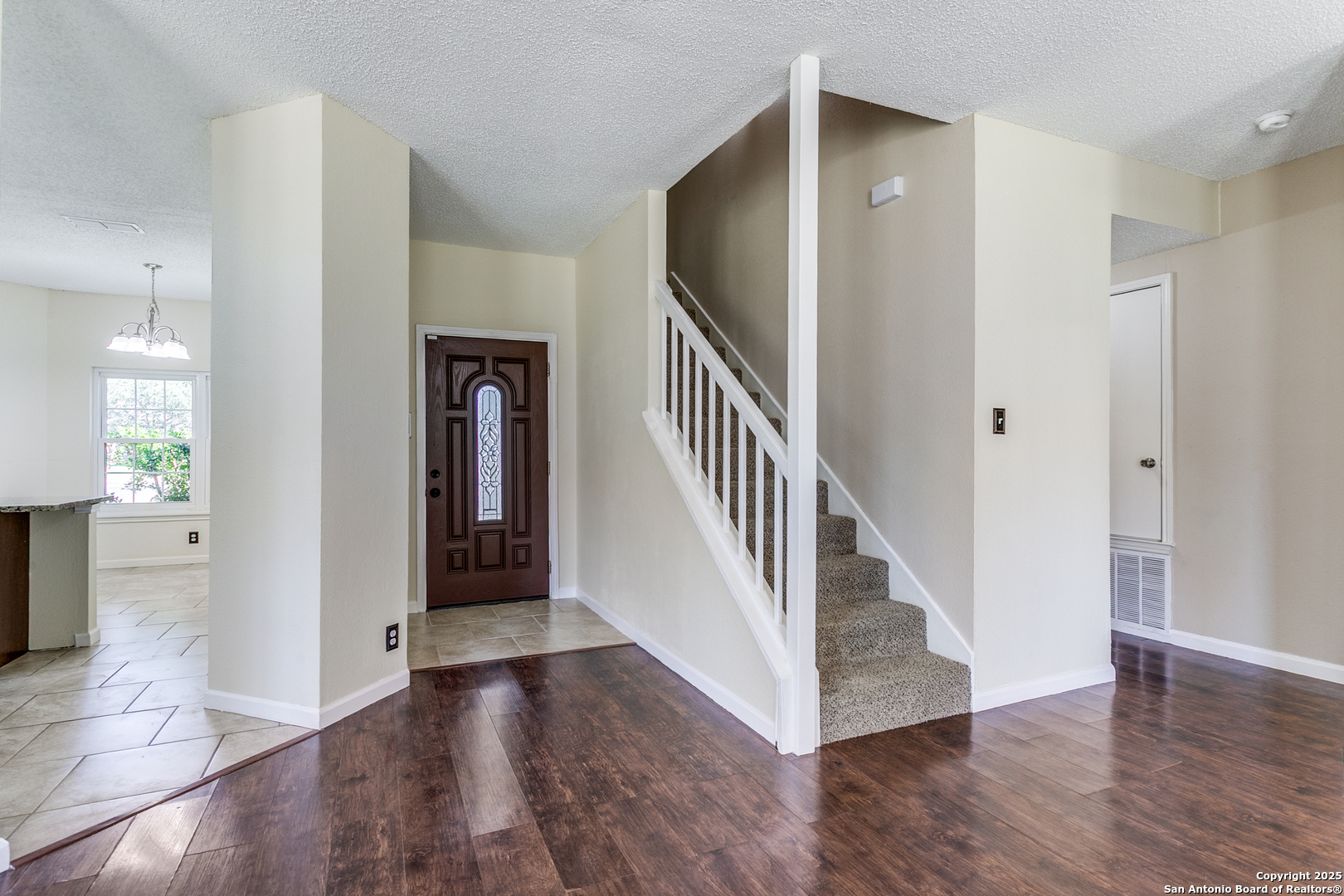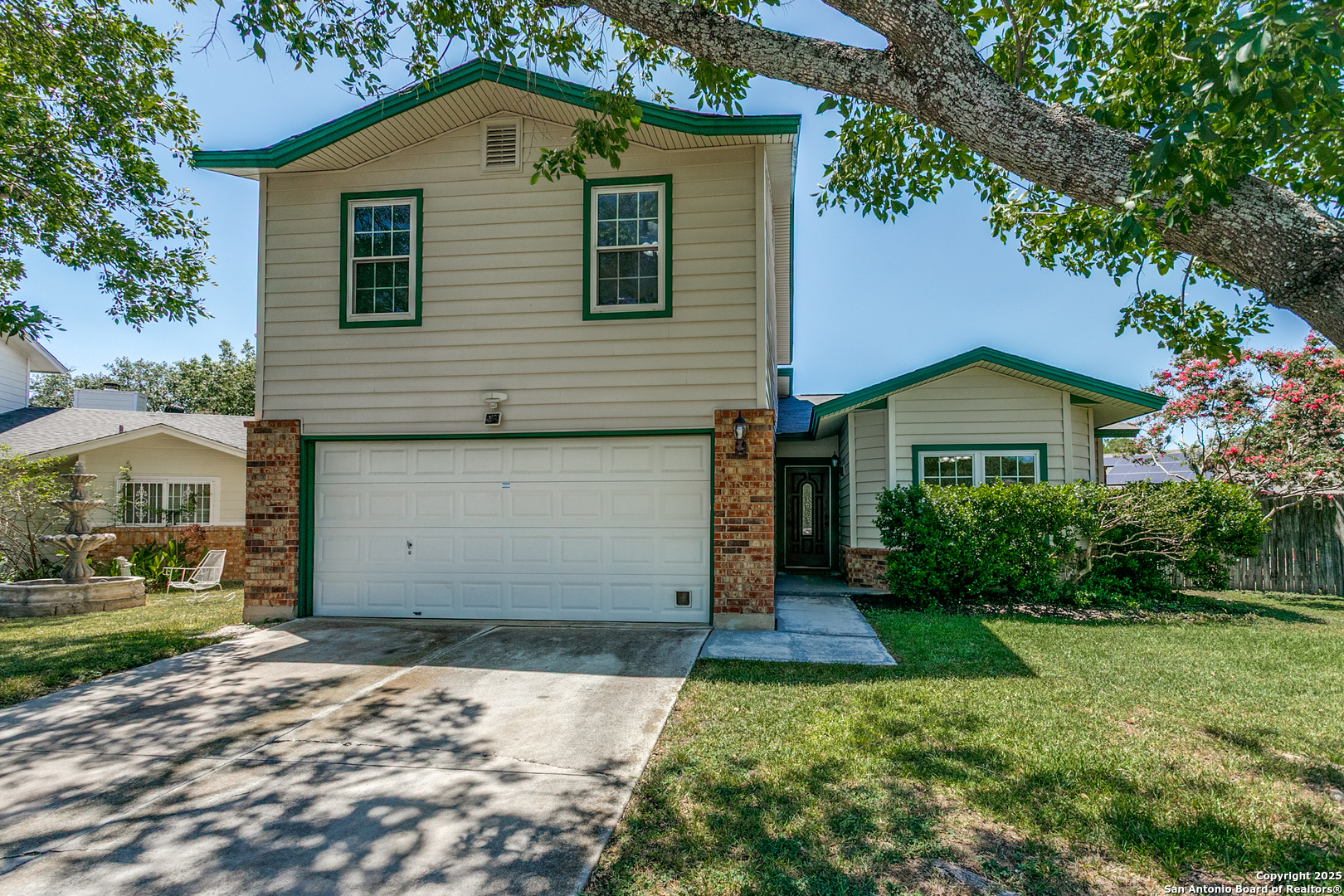 RARE 1/3 ACRE LOT & PRICED BELOW APPRAISED VALUE - COME & TOUR - MOVE IN READY home in Parkwood subdivision, offering four bedrooms, two and half bathrooms, and an attached two car garage. Nestled on a rare 1/3-acre lot. Step inside to a welcoming foyer that opens to a living area with high ceilings, natural light, beautiful laminate flooring, and a cozy fireplace. Eat in kitchen features granite countertops, a tiled backsplash, and a seamless flow into the informal dining area. The primary suite, located on the first floor, offers a large walk-in closet, oversized vanity with single sink, and a private stand-alone shower. Upstairs, you'll find three additional bedrooms and a full bath. Step outside to your own private fenced in backyard with plenty of green space, and a permanently installed play fort, perfect for weekend BBQs, outdoor entertaining, or peaceful evenings under the Texas sky. Conveniently located near UTSA, The Rim, La Cantera, the medical center, and easy access to major highways.