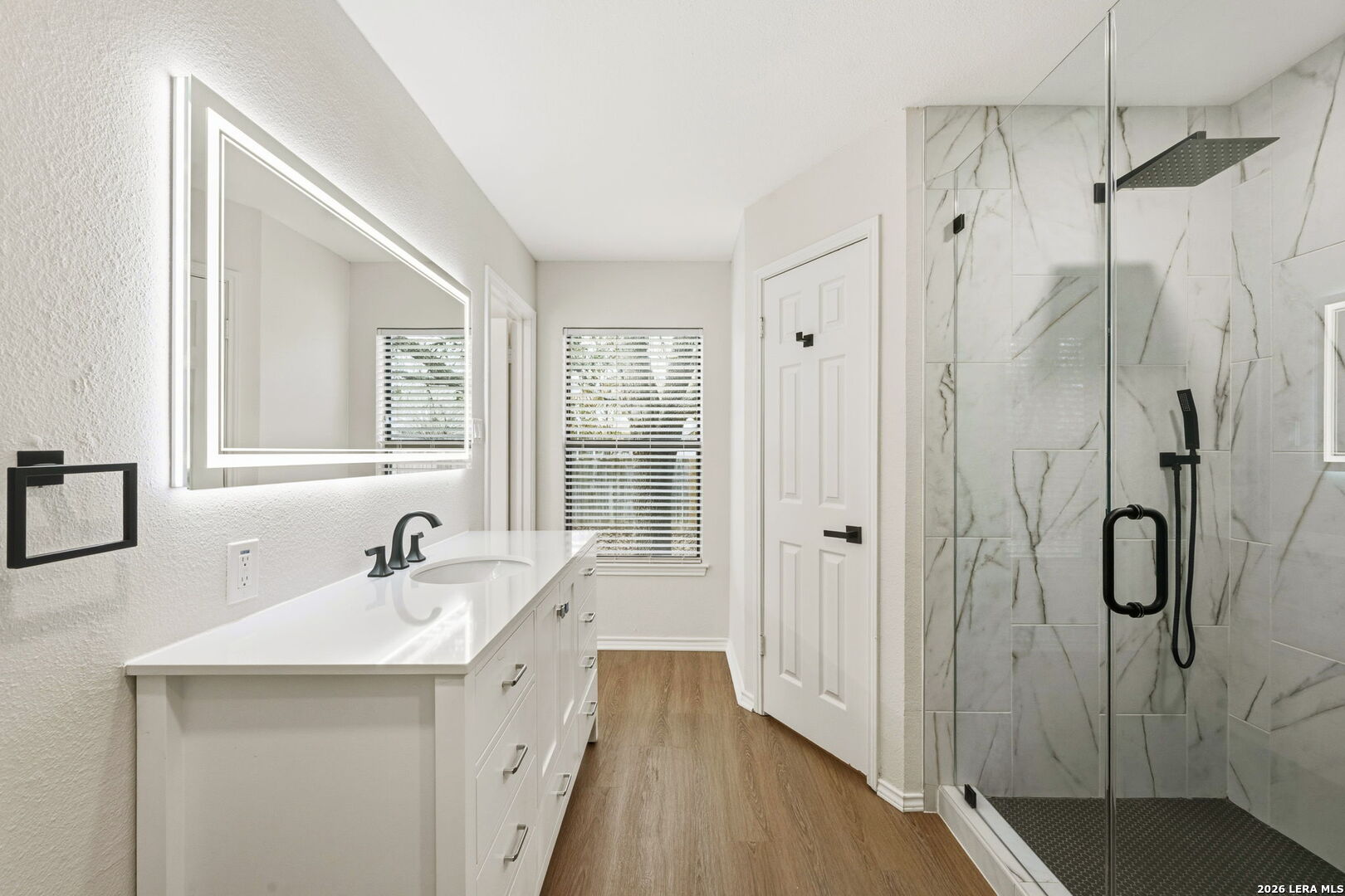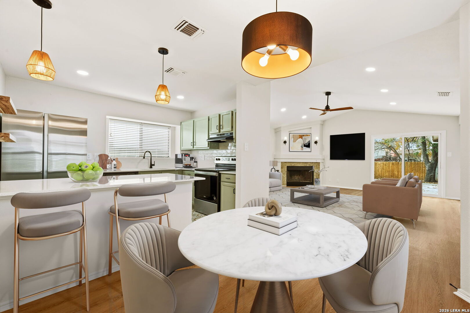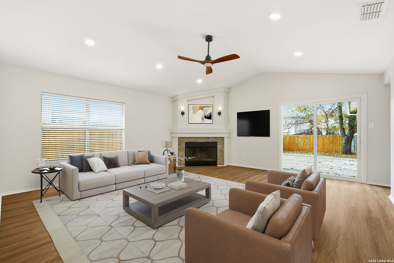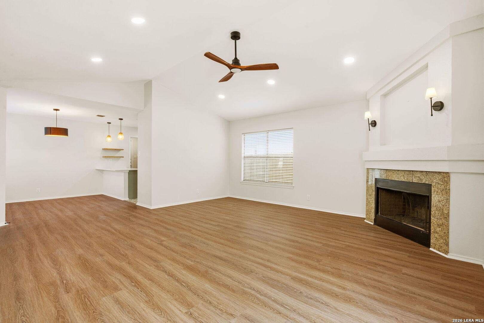 Beautifully refreshed and meticulously maintained, this single-story home is tucked away on a quiet street in the heart of Parkwood, just a short walk to neighborhood amenities including the pool, sports courts, and nature trails. Inside, serene and spacious living areas create an inviting atmosphere. The living room features dramatic vaulted ceilings and a cozy fireplace, adding warmth and architectural interest. The bright, airy kitchen shines with quartz countertops and refinished cabinetry, offering both style and functionality. The primary suite is a true retreat, complete with a spacious ensuite bath featuring an oversized shower, abundant storage, and dual walk-in closets. Every space has been thoughtfully cared for and optimized to make this home feel clean, calm, and move-in ready. Schedule your showing today!