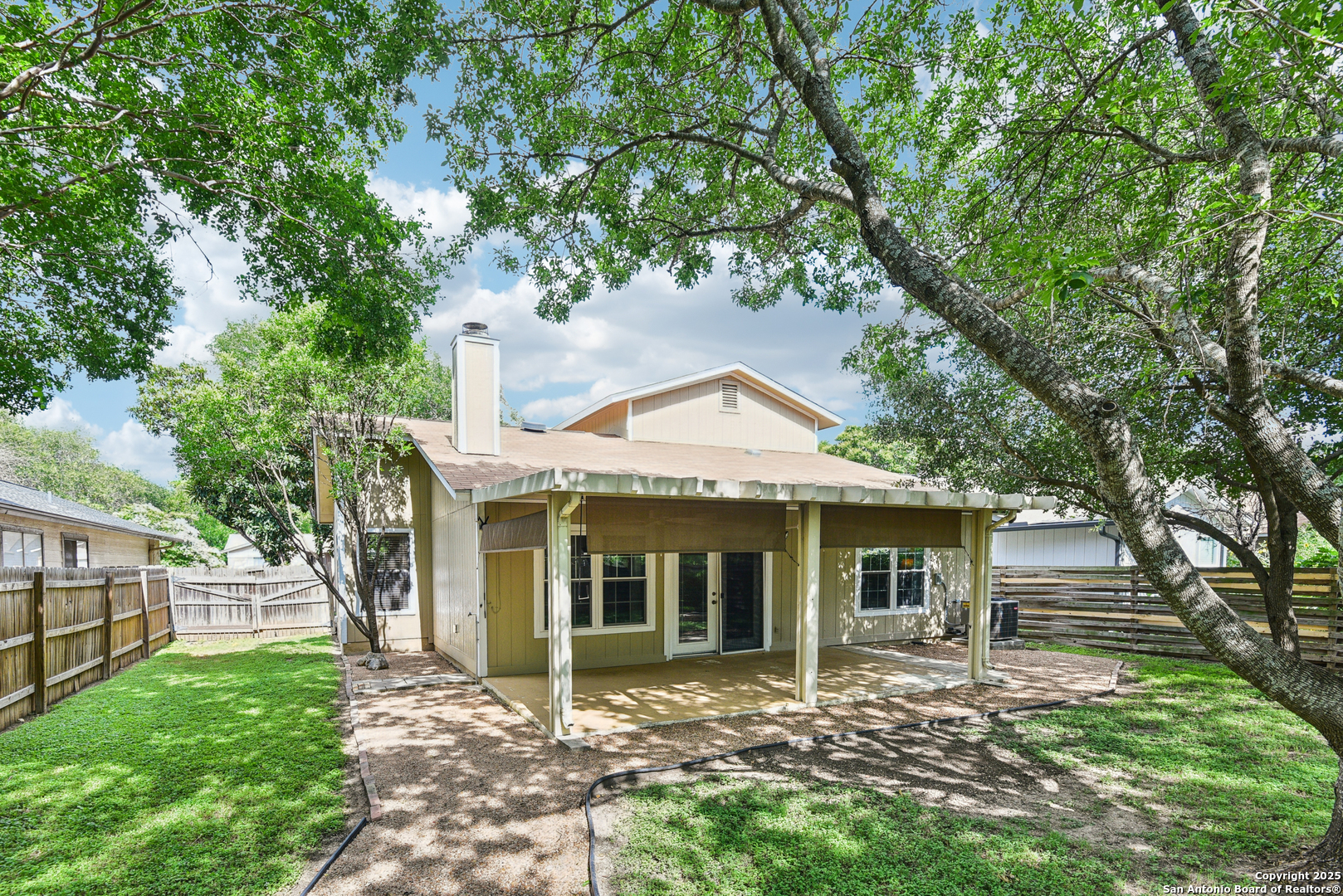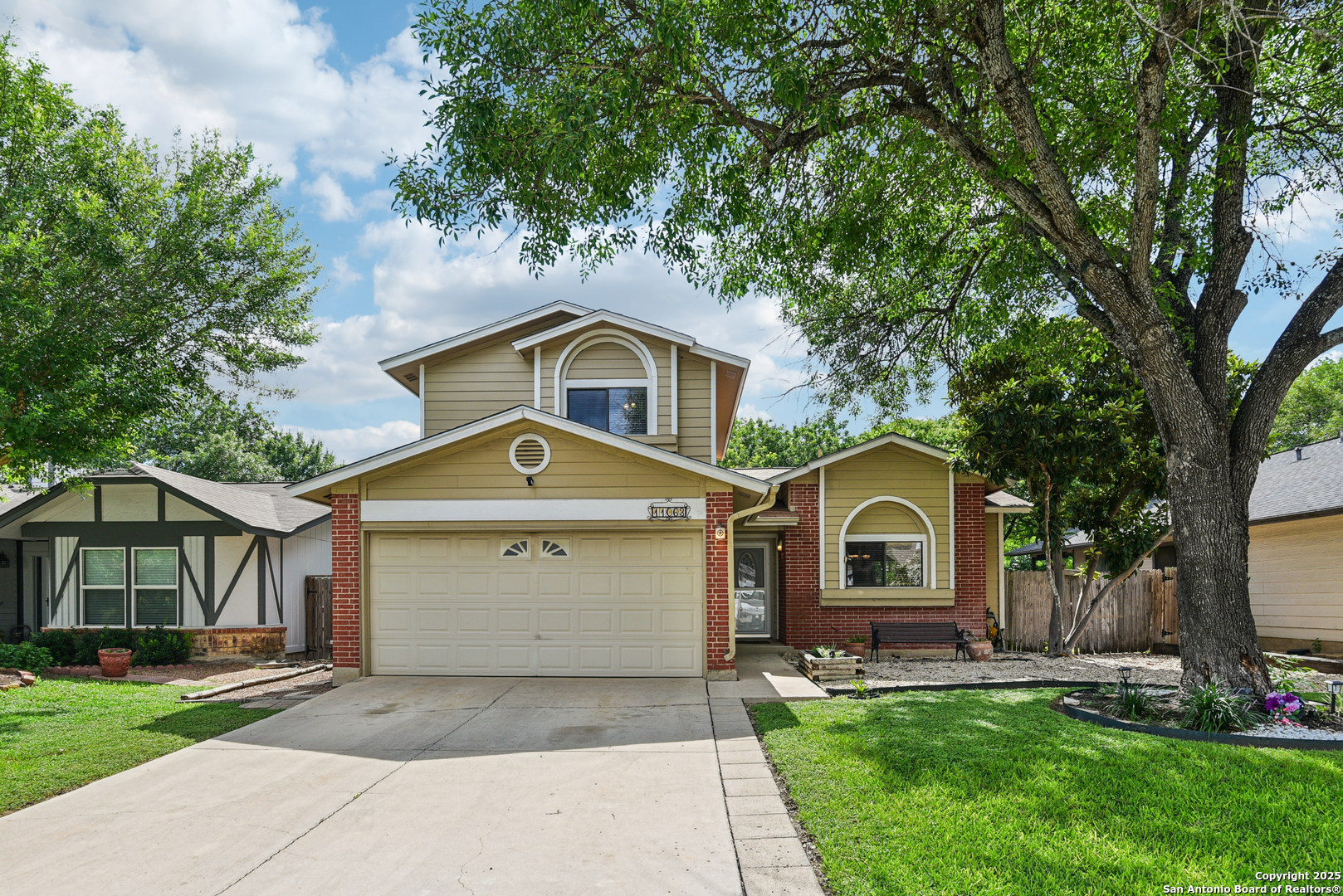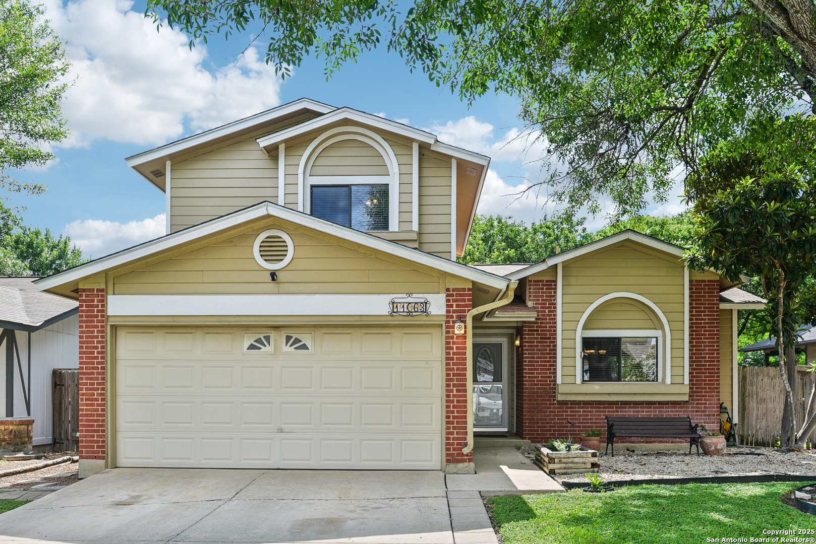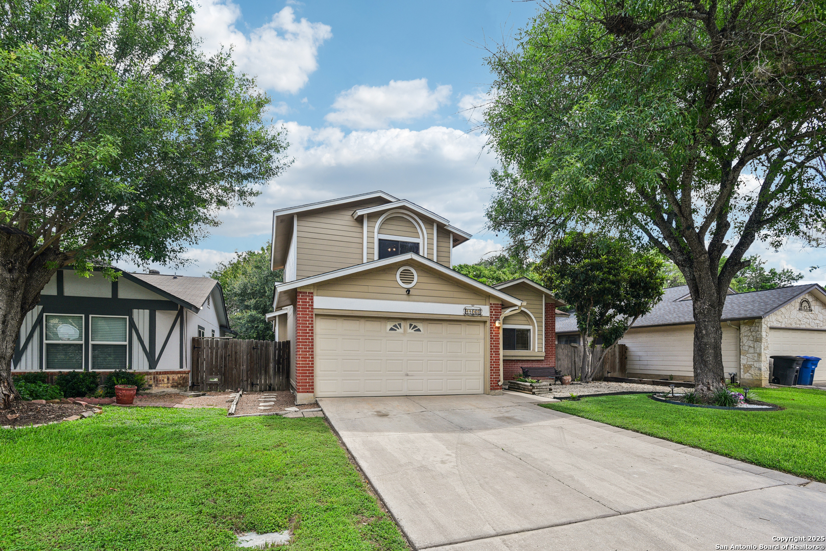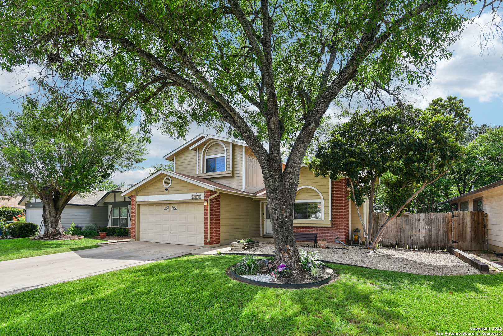 Welcome to your dream home in the highly sought-after Parkwood neighborhood! This stunning 3-bedroom, 2.5-bathroom residence is nestled amidst beautiful mature oak trees and meticulously maintained homes, offering an idyllic setting. Step inside and be greeted by brand new vinyl plank flooring, installed in 2025, that flows seamlessly through the dining room and into the spacious kitchen. The kitchen boasts ample counter space and abundant cabinetry, perfect for all your culinary needs. Relax and entertain in the generously sized living room, featuring impressive built-ins and a cozy wood-burning fireplace. The private primary bedroom, conveniently located on the first floor, is a true retreat with vaulted ceilings and a refreshing ceiling fan. Its ensuite bathroom offers a bath and shower combo, a single vanity with extra counter space, and a large walk-in closet. Upstairs, you'll find two spacious secondary bedrooms, each with closets and ceiling fans, along with a convenient secondary bathroom. A half bath downstairs provides added convenience for guests. The exterior is equally inviting, showcasing a gorgeous backyard with mature trees and an expansive covered patio, ideal for outdoor living and entertaining. Located close to shopping, grocery stores and restaurants! Easy Commute to Lackland Air Force Base, USAA, Medical Center, I-10, and Loop 1604. Discover the perfect blend of comfort and charm in this beautiful Parkwood home!