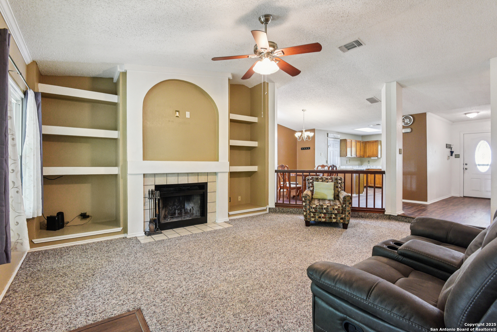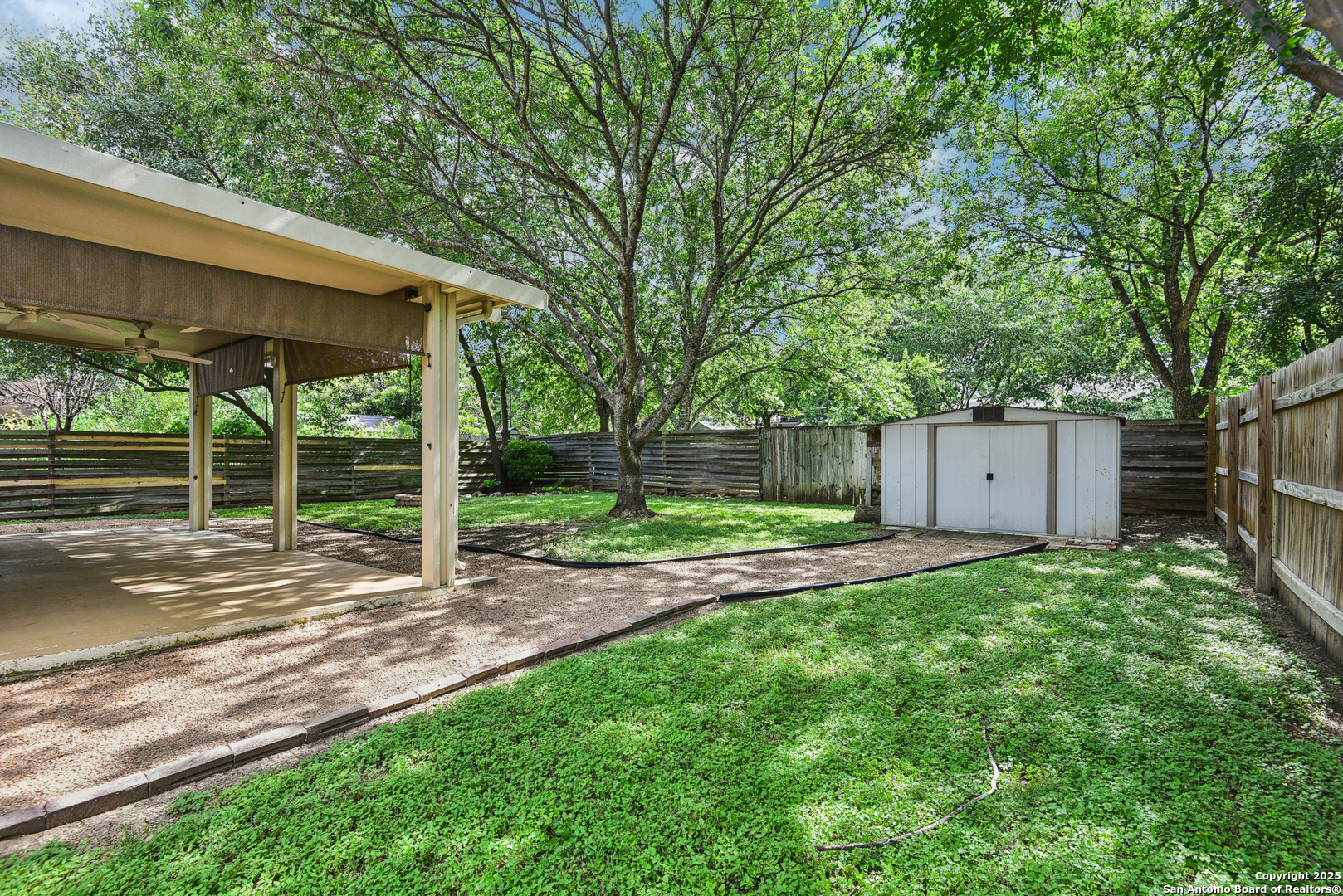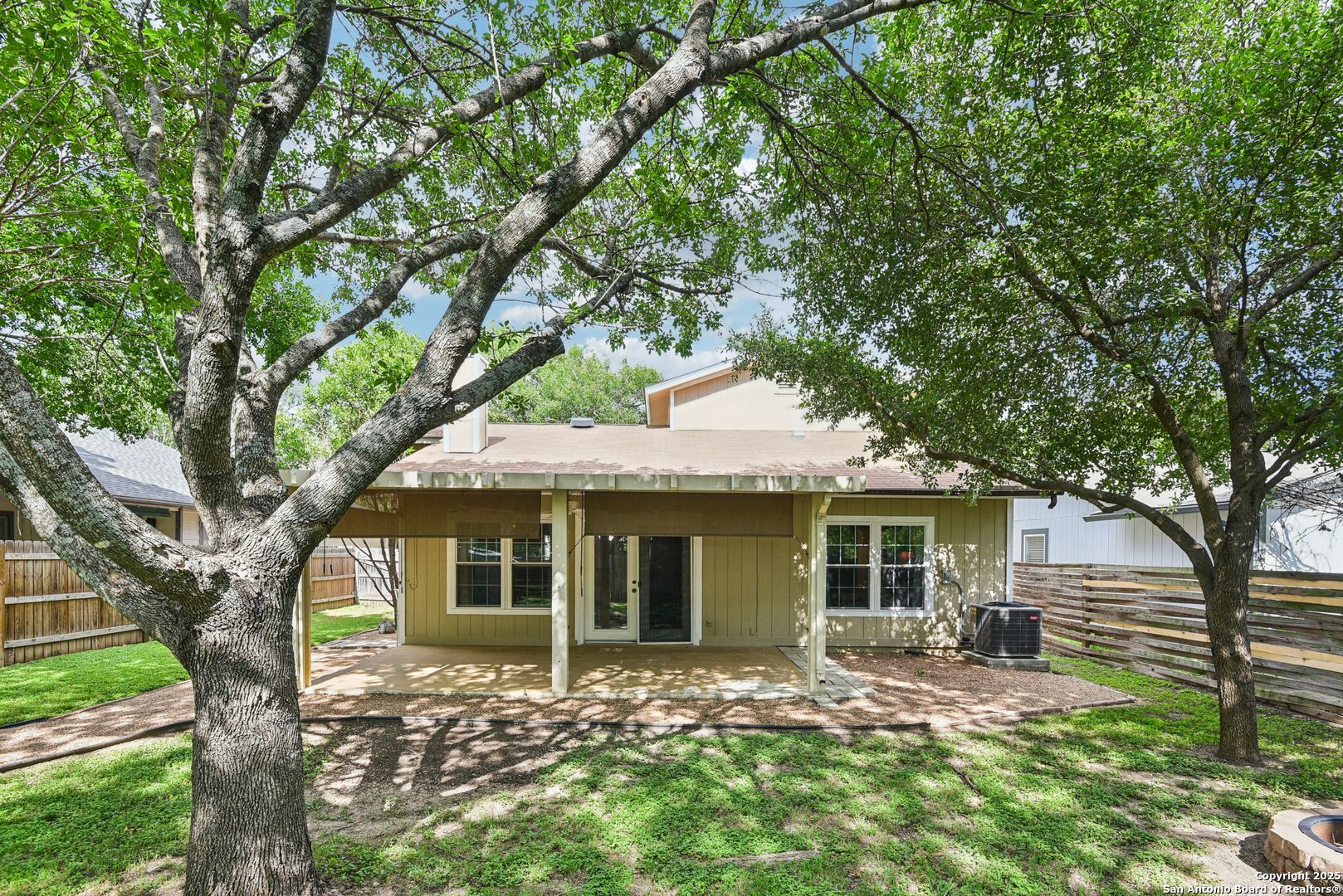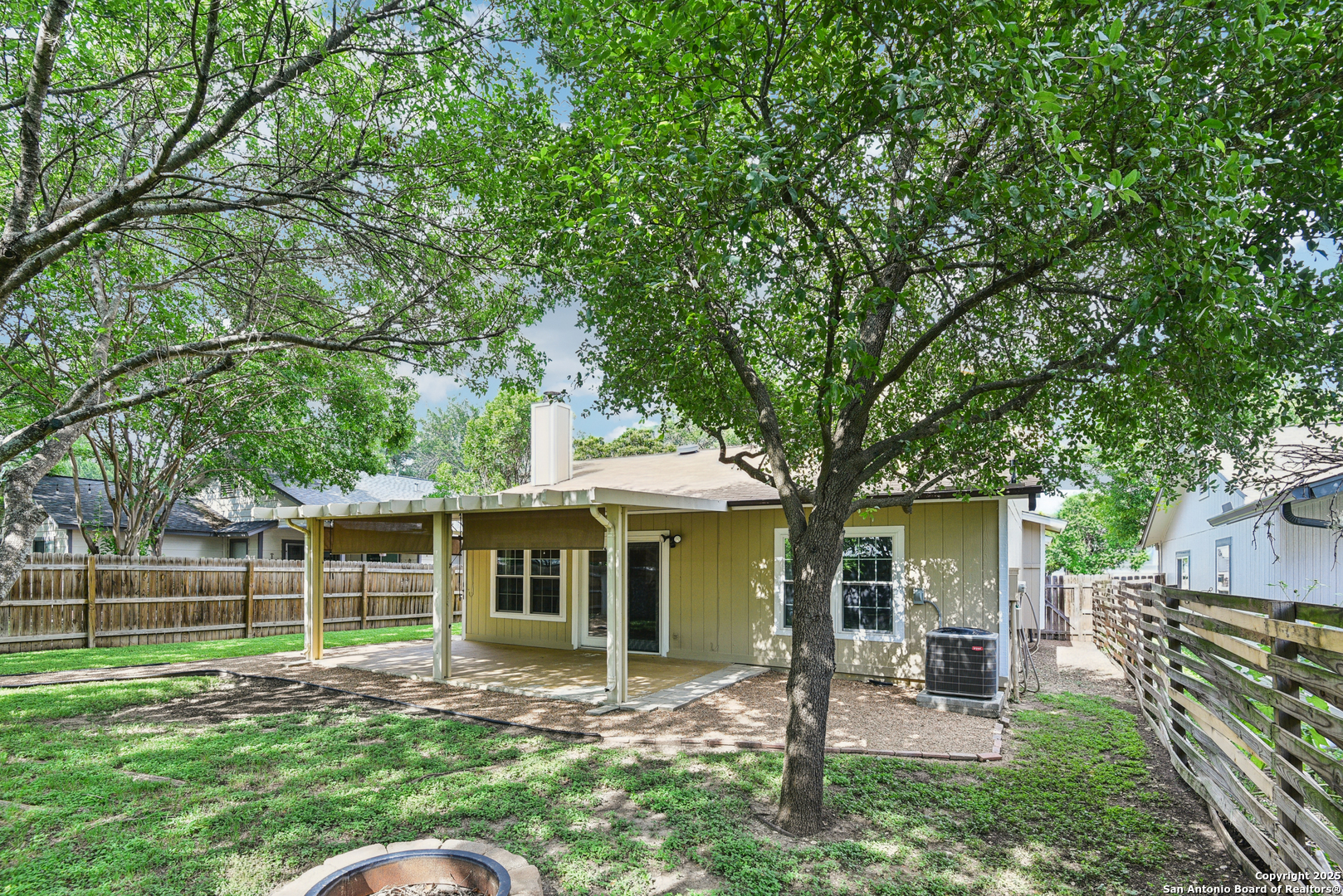 Welcome to your dream home in the highly sought-after Parkwood neighborhood! This stunning 3-bedroom, 2.5-bathroom residence is nestled amidst beautiful mature oak trees and meticulously maintained homes, offering an idyllic setting. Step inside and be greeted by brand new vinyl plank flooring, installed in 2025, that flows seamlessly through the dining room and into the spacious kitchen. The kitchen boasts ample counter space and abundant cabinetry, perfect for all your culinary needs. Relax and entertain in the generously sized living room, featuring impressive built-ins and a cozy wood-burning fireplace. The private primary bedroom, conveniently located on the first floor, is a true retreat with vaulted ceilings and a refreshing ceiling fan. Its ensuite bathroom offers a bath and shower combo, a single vanity with extra counter space, and a large walk-in closet. Upstairs, you'll find two spacious secondary bedrooms, each with closets and ceiling fans, along with a convenient secondary bathroom. A half bath downstairs provides added convenience for guests. The exterior is equally inviting, showcasing a gorgeous backyard with mature trees and an expansive covered patio, ideal for outdoor living and entertaining. Located close to shopping, grocery stores and restaurants! Easy Commute to Lackland Air Force Base, USAA, Medical Center, I-10, and Loop 1604. Discover the perfect blend of comfort and charm in this beautiful Parkwood home!