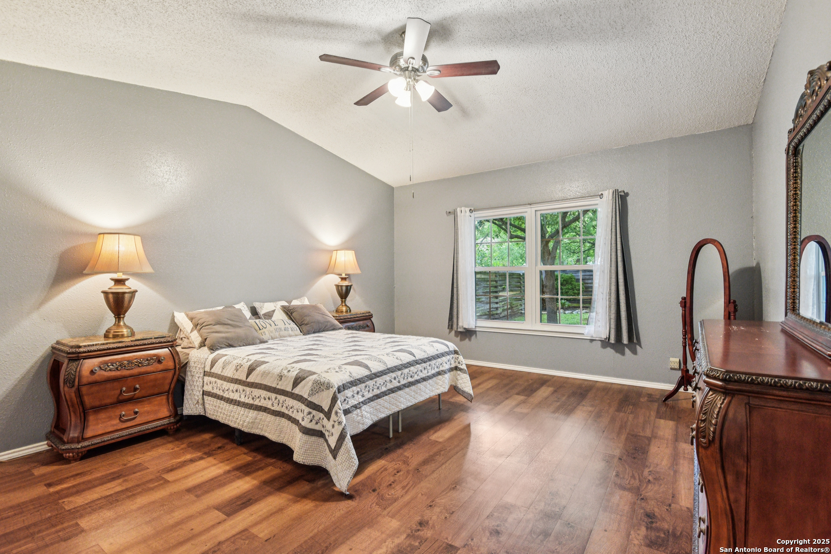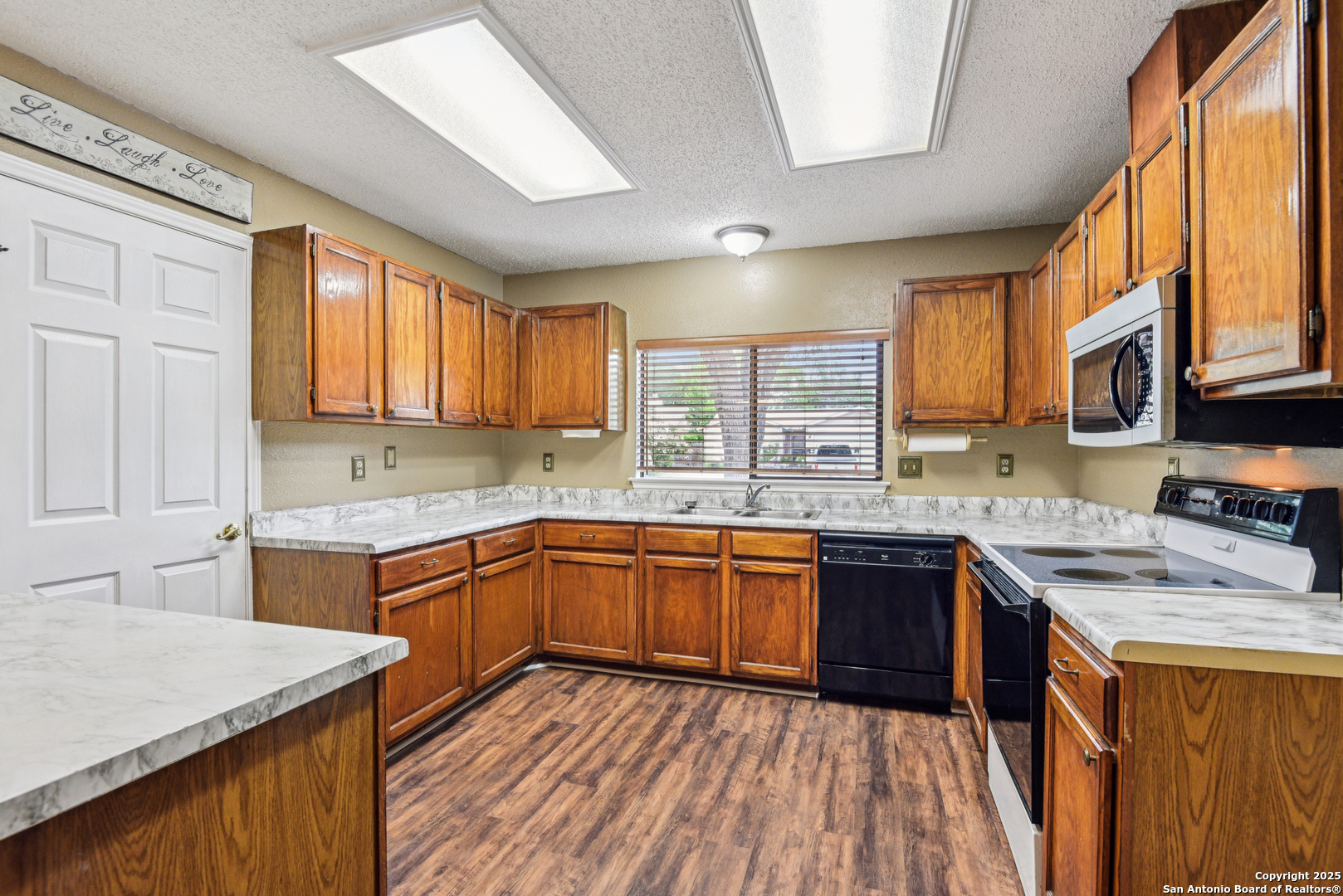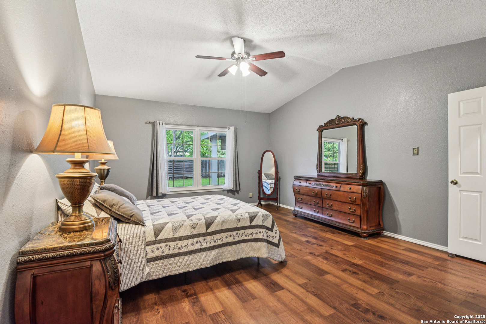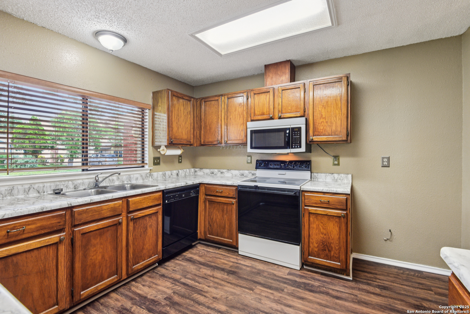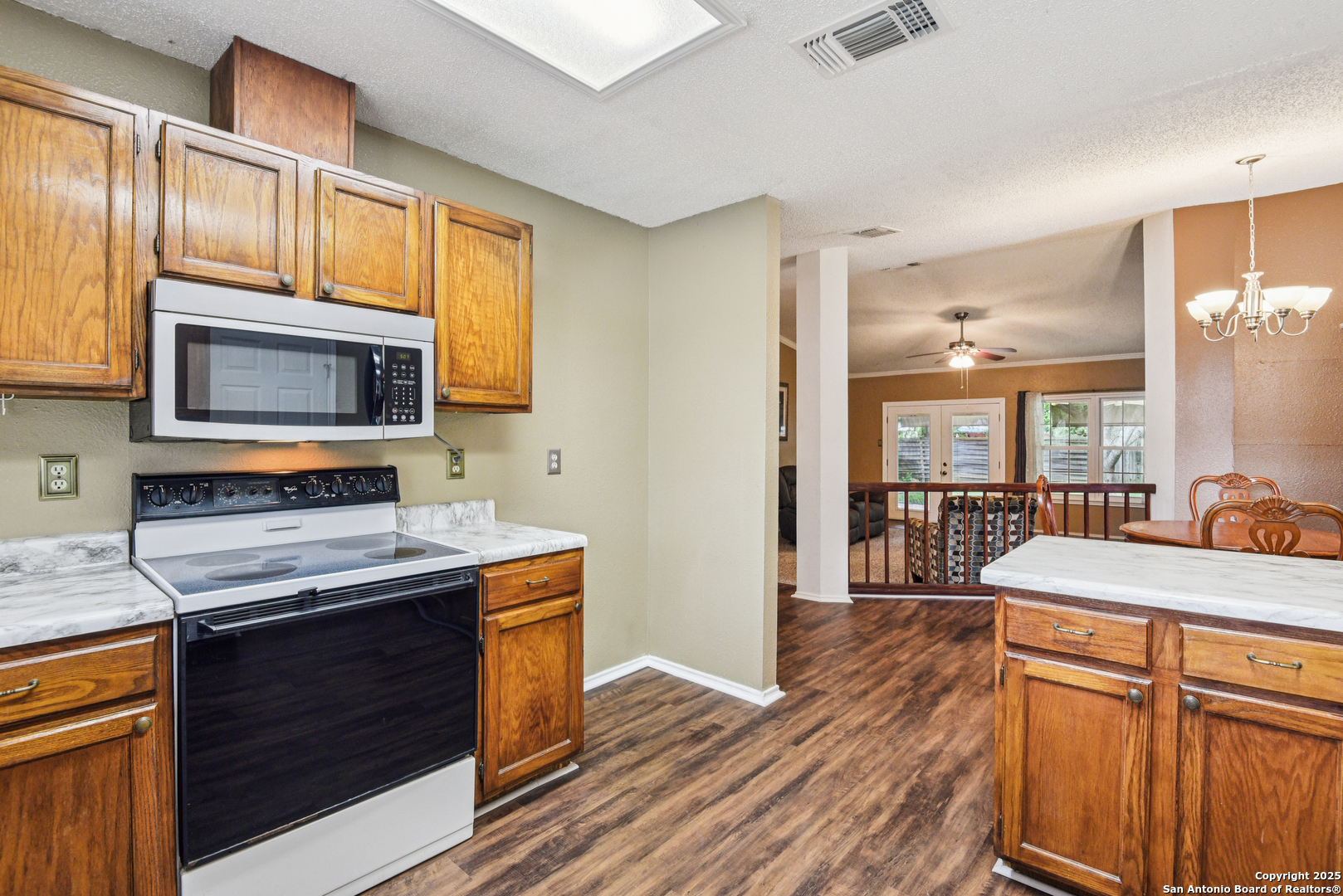 Welcome to your dream home in the highly sought-after Parkwood neighborhood! This stunning 3-bedroom, 2.5-bathroom residence is nestled amidst beautiful mature oak trees and meticulously maintained homes, offering an idyllic setting. Step inside and be greeted by brand new vinyl plank flooring, installed in 2025, that flows seamlessly through the dining room and into the spacious kitchen. The kitchen boasts ample counter space and abundant cabinetry, perfect for all your culinary needs. Relax and entertain in the generously sized living room, featuring impressive built-ins and a cozy wood-burning fireplace. The private primary bedroom, conveniently located on the first floor, is a true retreat with vaulted ceilings and a refreshing ceiling fan. Its ensuite bathroom offers a bath and shower combo, a single vanity with extra counter space, and a large walk-in closet. Upstairs, you'll find two spacious secondary bedrooms, each with closets and ceiling fans, along with a convenient secondary bathroom. A half bath downstairs provides added convenience for guests. The exterior is equally inviting, showcasing a gorgeous backyard with mature trees and an expansive covered patio, ideal for outdoor living and entertaining. Located close to shopping, grocery stores and restaurants! Easy Commute to Lackland Air Force Base, USAA, Medical Center, I-10, and Loop 1604. Discover the perfect blend of comfort and charm in this beautiful Parkwood home!