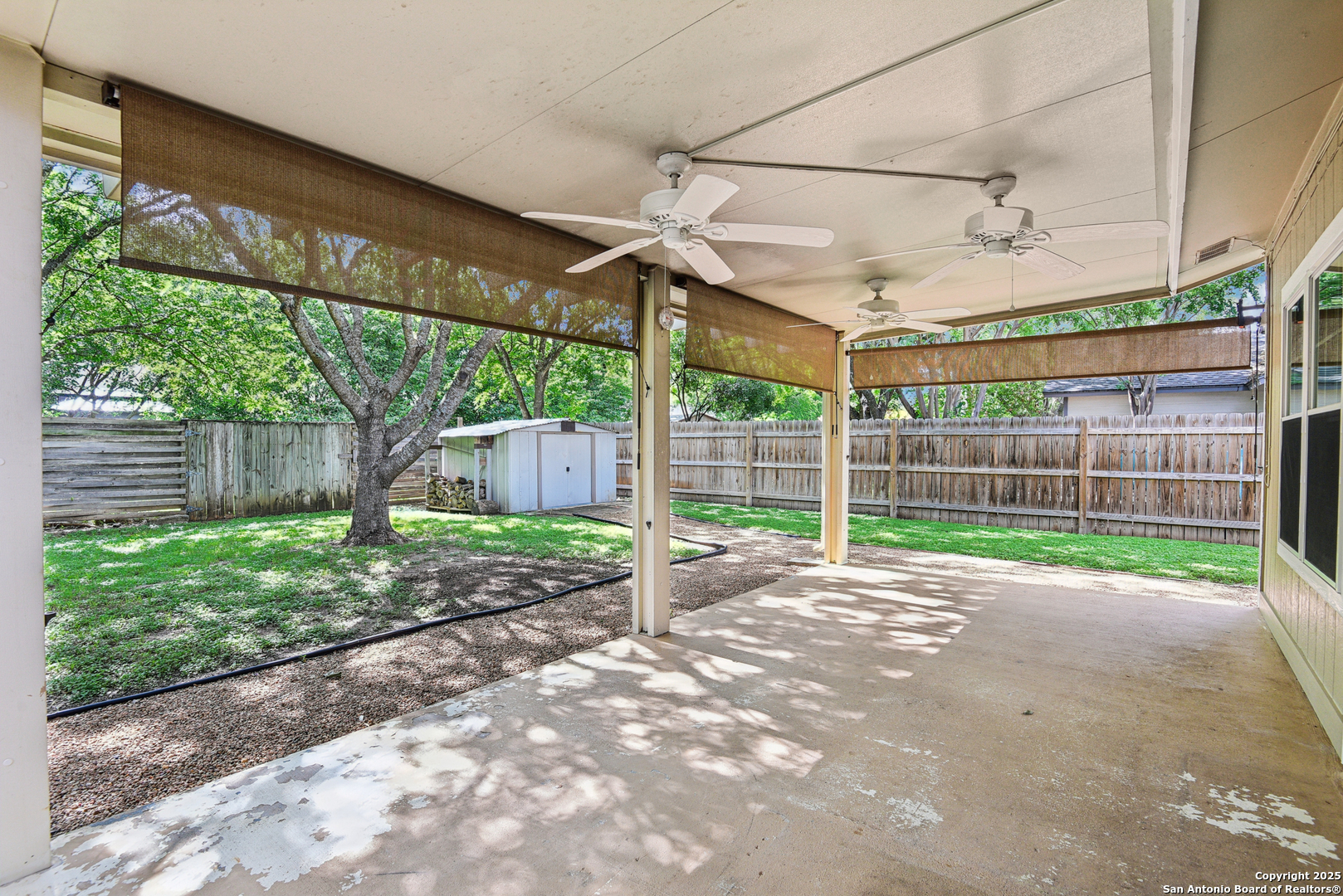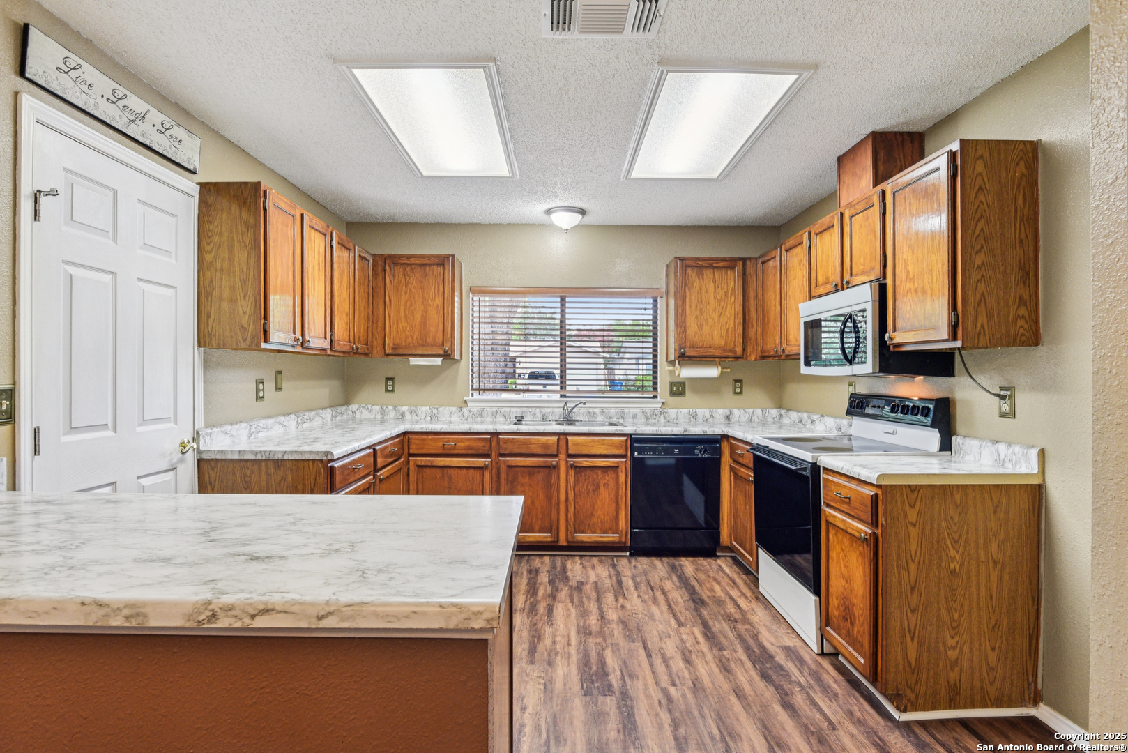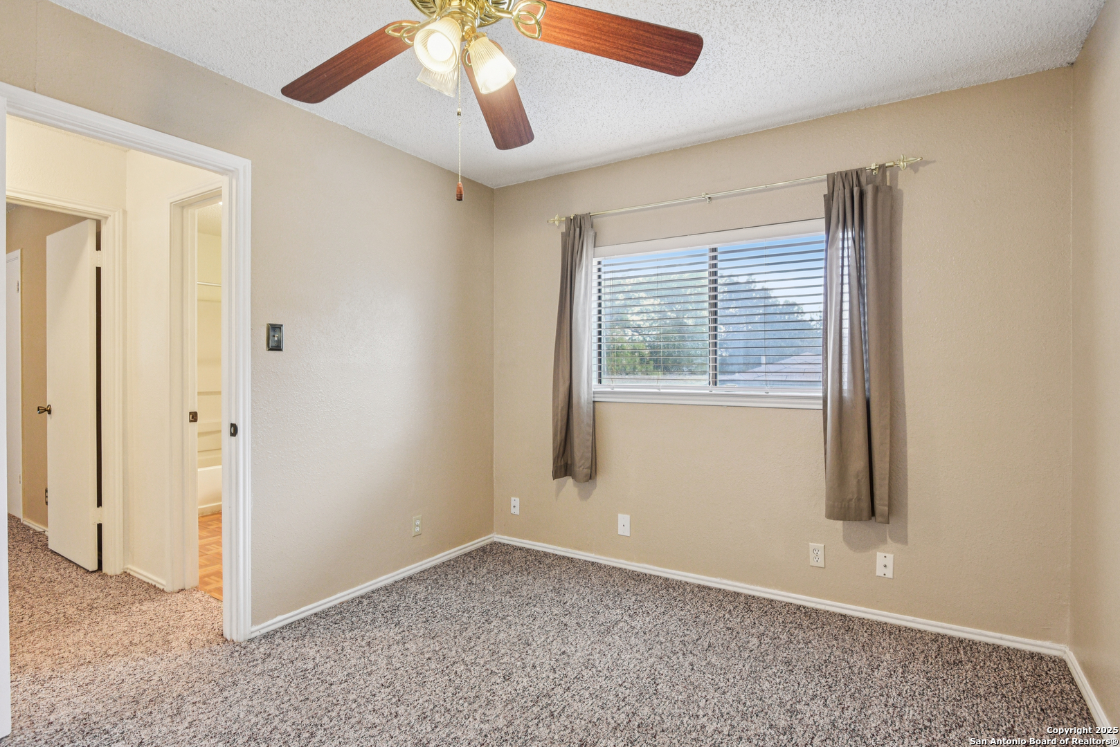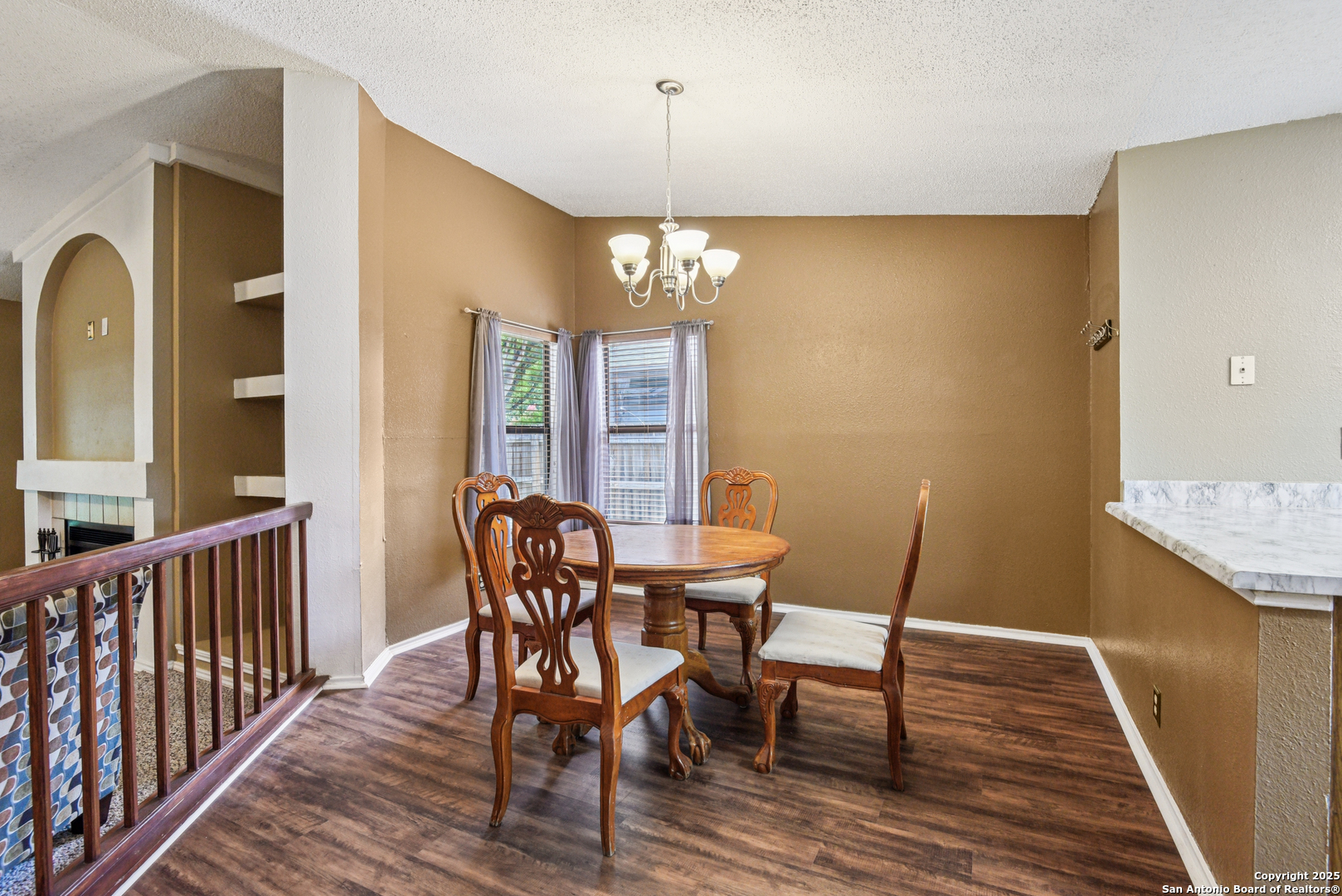 Welcome to your dream home in the highly sought-after Parkwood neighborhood! This stunning 3-bedroom, 2.5-bathroom residence is nestled amidst beautiful mature oak trees and meticulously maintained homes, offering an idyllic setting. Step inside and be greeted by brand new vinyl plank flooring, installed in 2025, that flows seamlessly through the dining room and into the spacious kitchen. The kitchen boasts ample counter space and abundant cabinetry, perfect for all your culinary needs. Relax and entertain in the generously sized living room, featuring impressive built-ins and a cozy wood-burning fireplace. The private primary bedroom, conveniently located on the first floor, is a true retreat with vaulted ceilings and a refreshing ceiling fan. Its ensuite bathroom offers a bath and shower combo, a single vanity with extra counter space, and a large walk-in closet. Upstairs, you'll find two spacious secondary bedrooms, each with closets and ceiling fans, along with a convenient secondary bathroom. A half bath downstairs provides added convenience for guests. The exterior is equally inviting, showcasing a gorgeous backyard with mature trees and an expansive covered patio, ideal for outdoor living and entertaining. Located close to shopping, grocery stores and restaurants! Easy Commute to Lackland Air Force Base, USAA, Medical Center, I-10, and Loop 1604. Discover the perfect blend of comfort and charm in this beautiful Parkwood home!