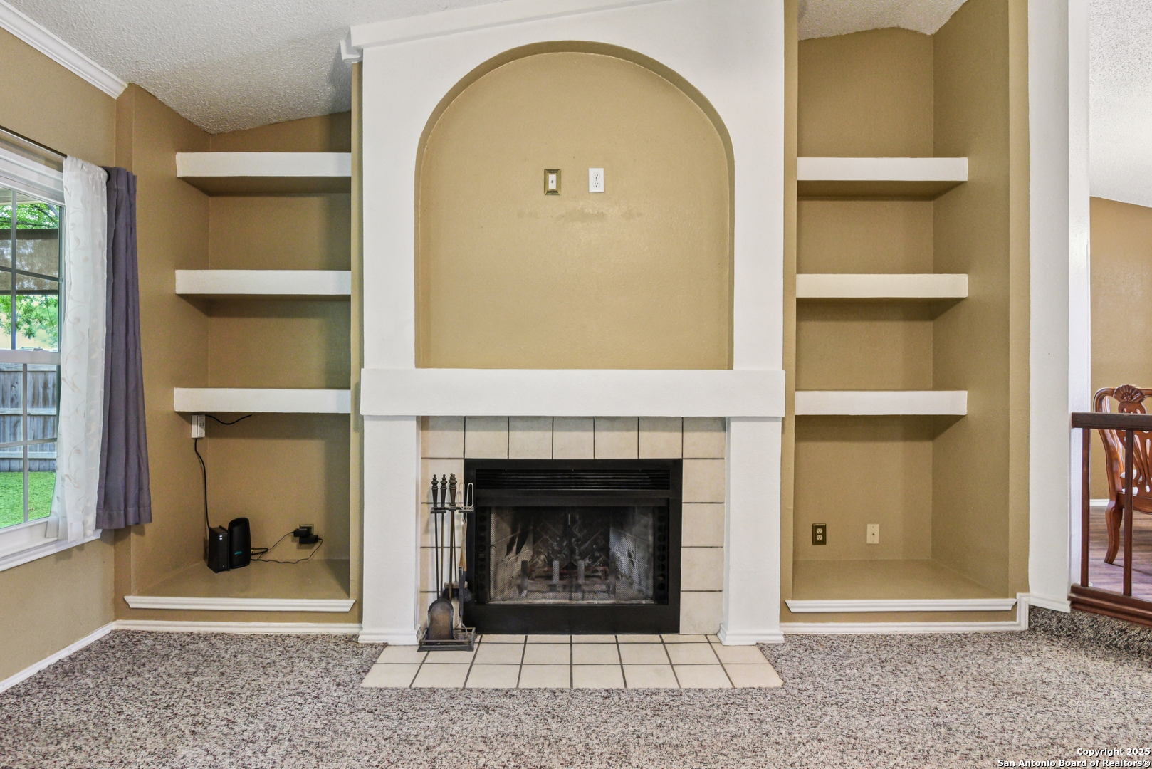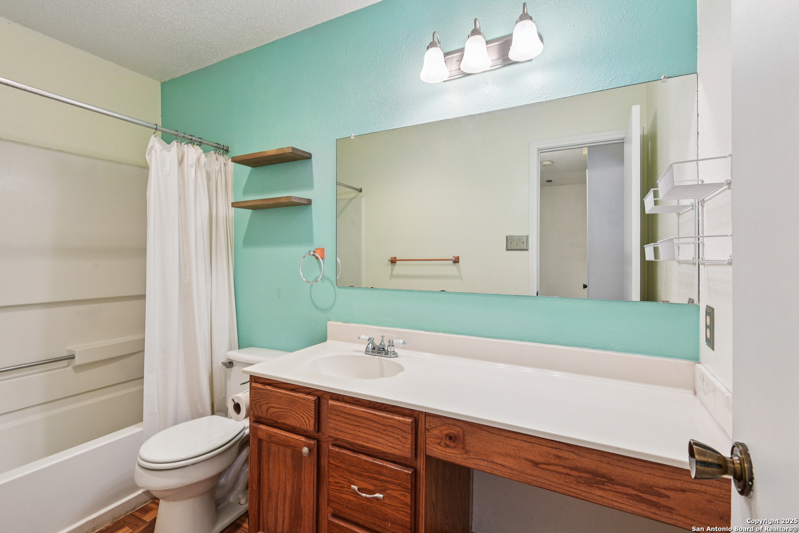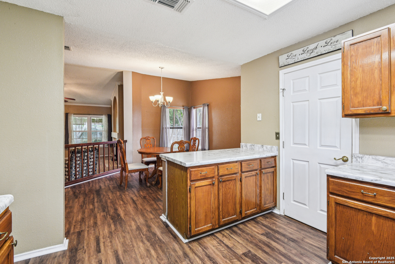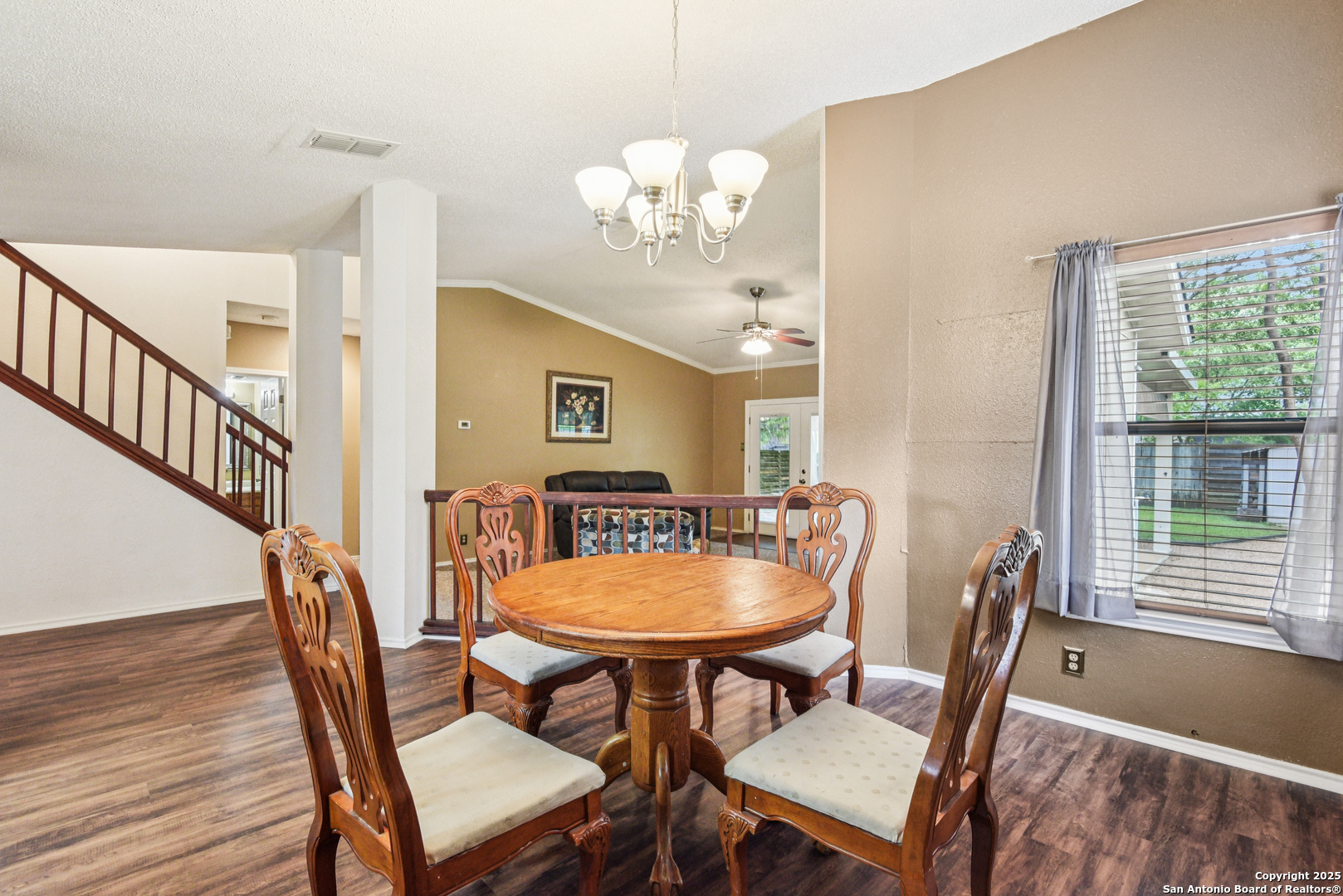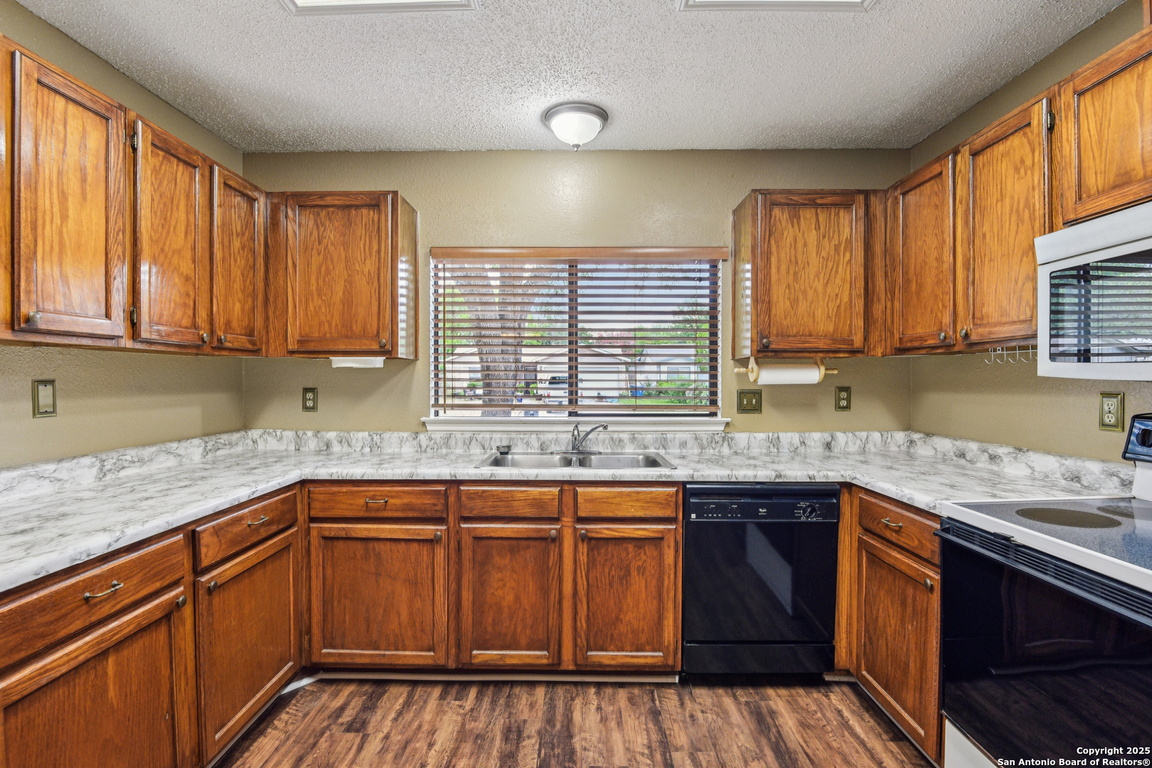 Welcome to your dream home in the highly sought-after Parkwood neighborhood! This stunning 3-bedroom, 2.5-bathroom residence is nestled amidst beautiful mature oak trees and meticulously maintained homes, offering an idyllic setting. Step inside and be greeted by brand new vinyl plank flooring, installed in 2025, that flows seamlessly through the dining room and into the spacious kitchen. The kitchen boasts ample counter space and abundant cabinetry, perfect for all your culinary needs. Relax and entertain in the generously sized living room, featuring impressive built-ins and a cozy wood-burning fireplace. The private primary bedroom, conveniently located on the first floor, is a true retreat with vaulted ceilings and a refreshing ceiling fan. Its ensuite bathroom offers a bath and shower combo, a single vanity with extra counter space, and a large walk-in closet. Upstairs, you'll find two spacious secondary bedrooms, each with closets and ceiling fans, along with a convenient secondary bathroom. A half bath downstairs provides added convenience for guests. The exterior is equally inviting, showcasing a gorgeous backyard with mature trees and an expansive covered patio, ideal for outdoor living and entertaining. Located close to shopping, grocery stores and restaurants! Easy Commute to Lackland Air Force Base, USAA, Medical Center, I-10, and Loop 1604. Discover the perfect blend of comfort and charm in this beautiful Parkwood home!