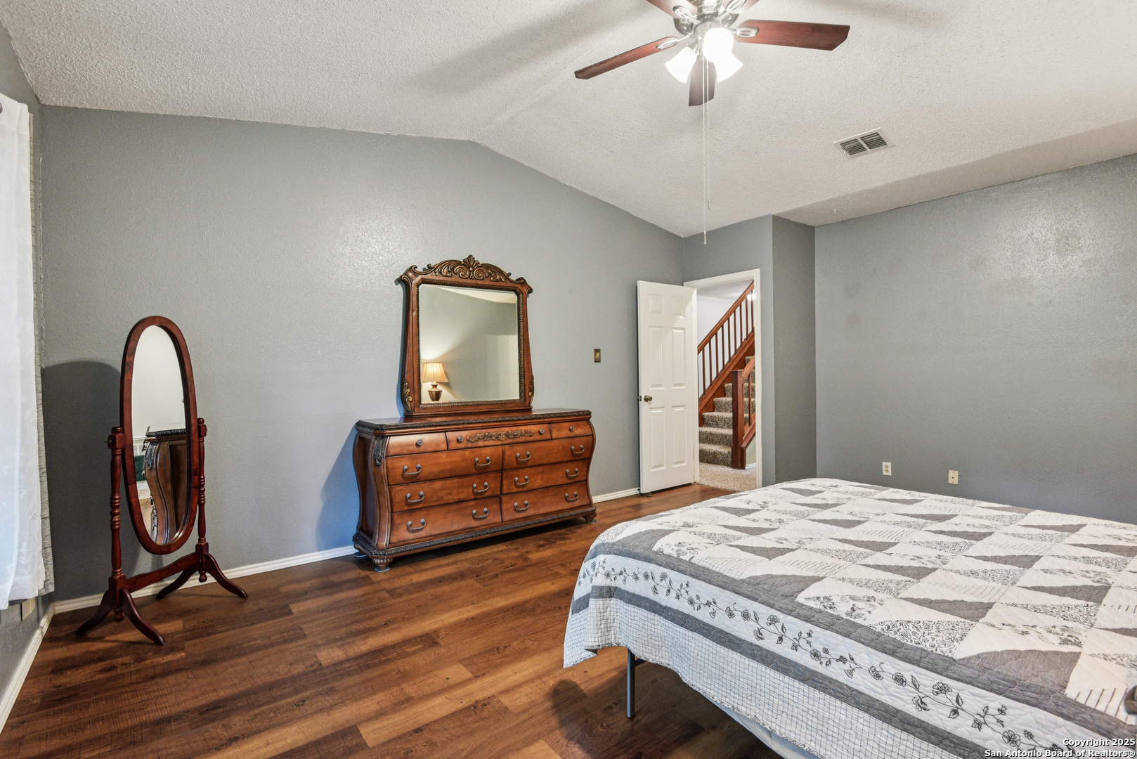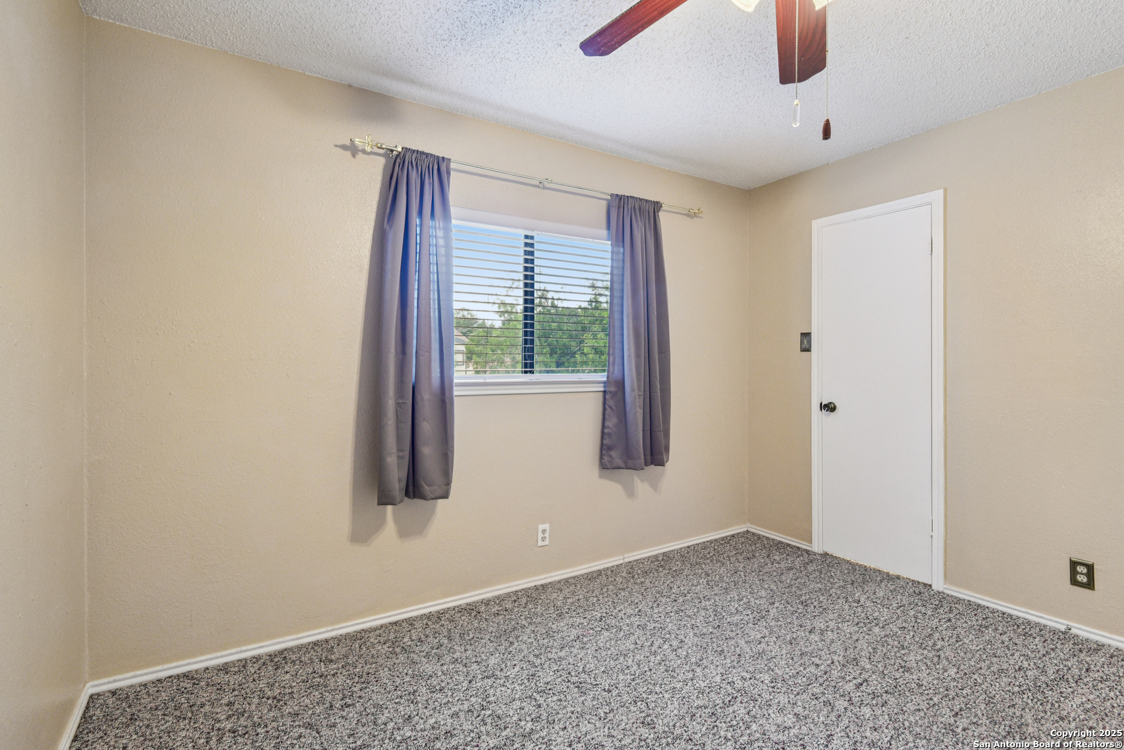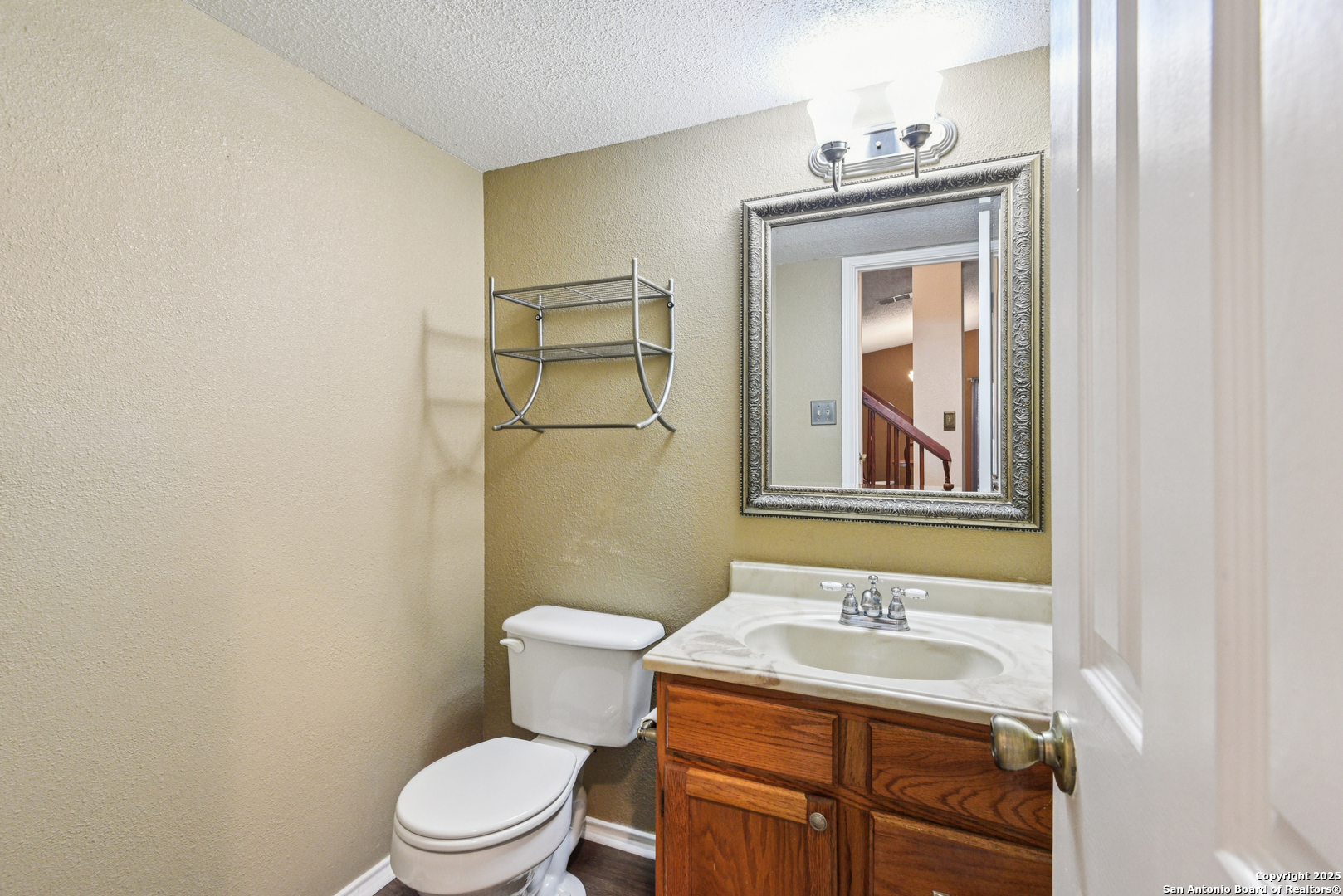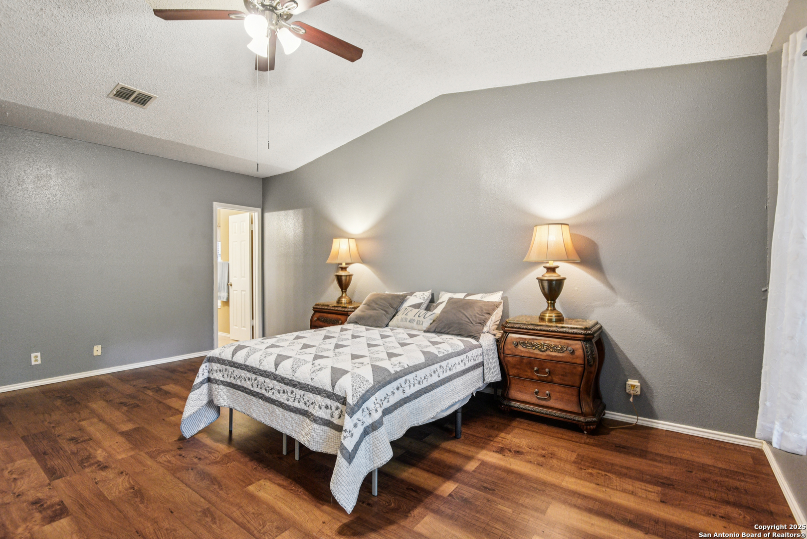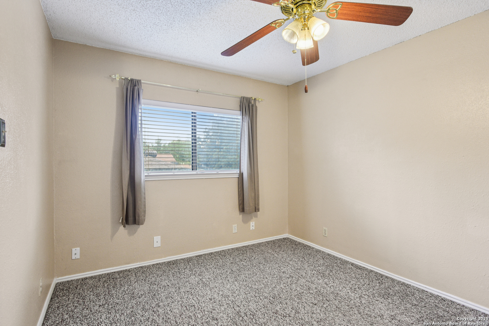 Welcome to your dream home in the highly sought-after Parkwood neighborhood! This stunning 3-bedroom, 2.5-bathroom residence is nestled amidst beautiful mature oak trees and meticulously maintained homes, offering an idyllic setting. Step inside and be greeted by brand new vinyl plank flooring, installed in 2025, that flows seamlessly through the dining room and into the spacious kitchen. The kitchen boasts ample counter space and abundant cabinetry, perfect for all your culinary needs. Relax and entertain in the generously sized living room, featuring impressive built-ins and a cozy wood-burning fireplace. The private primary bedroom, conveniently located on the first floor, is a true retreat with vaulted ceilings and a refreshing ceiling fan. Its ensuite bathroom offers a bath and shower combo, a single vanity with extra counter space, and a large walk-in closet. Upstairs, you'll find two spacious secondary bedrooms, each with closets and ceiling fans, along with a convenient secondary bathroom. A half bath downstairs provides added convenience for guests. The exterior is equally inviting, showcasing a gorgeous backyard with mature trees and an expansive covered patio, ideal for outdoor living and entertaining. Located close to shopping, grocery stores and restaurants! Easy Commute to Lackland Air Force Base, USAA, Medical Center, I-10, and Loop 1604. Discover the perfect blend of comfort and charm in this beautiful Parkwood home!