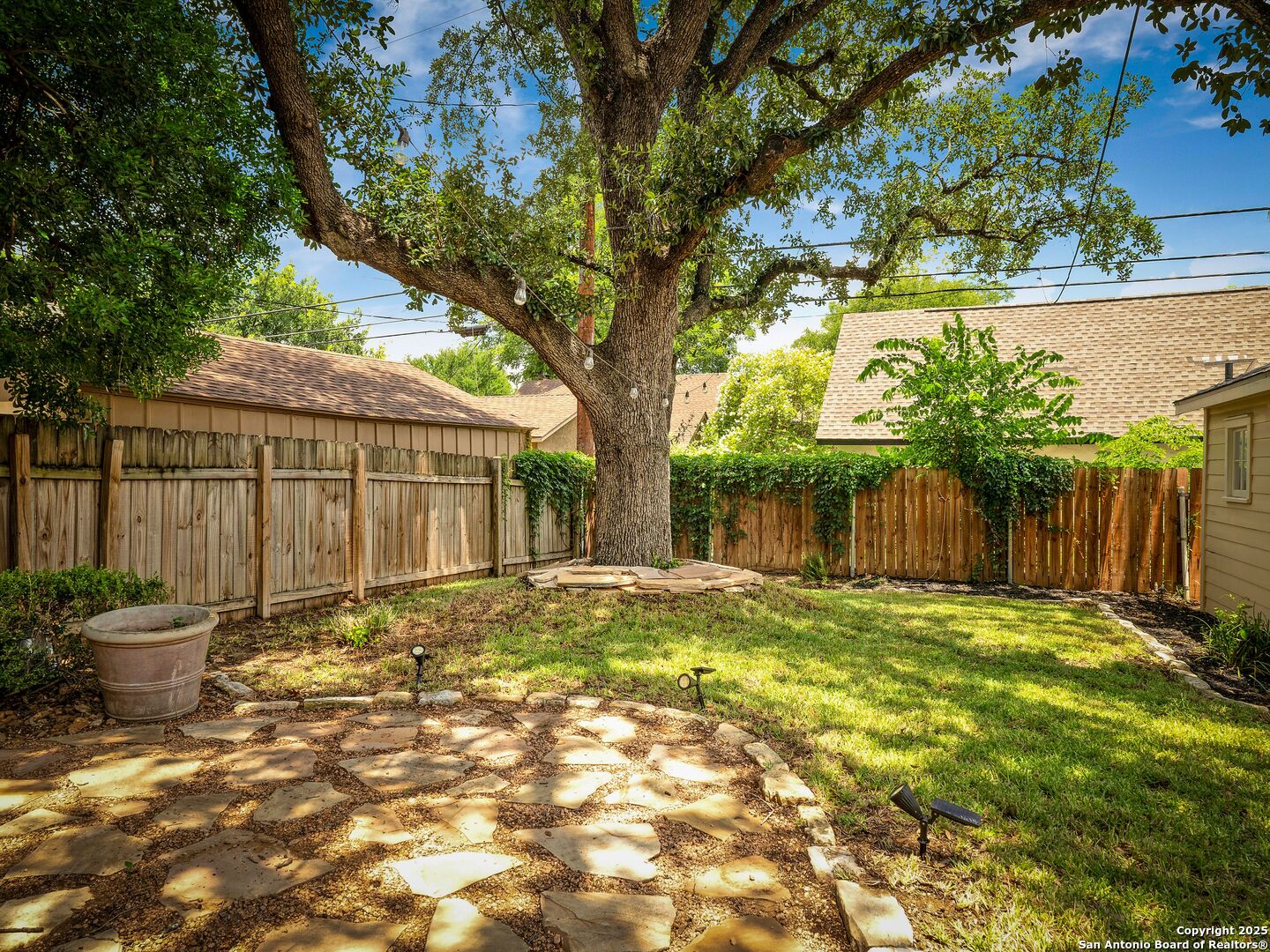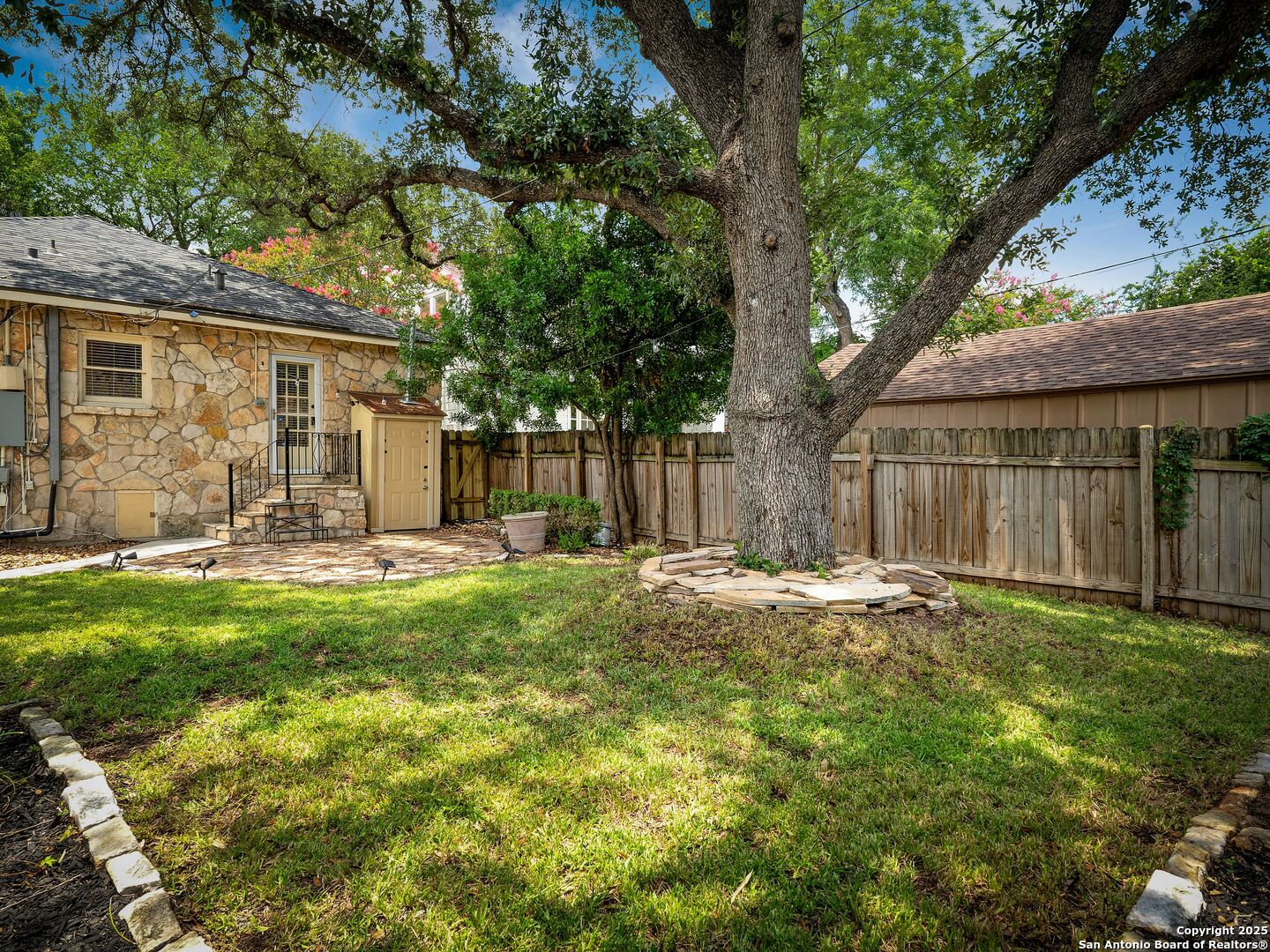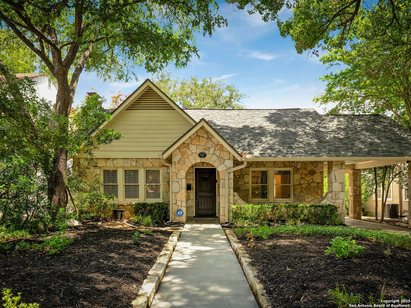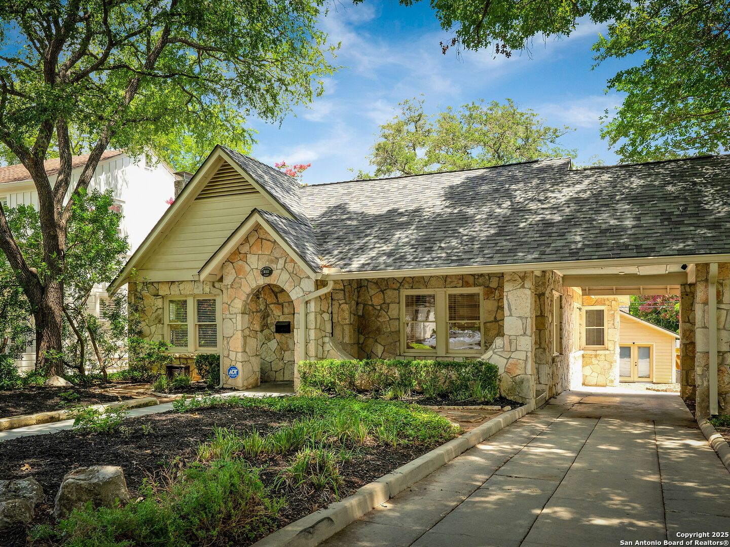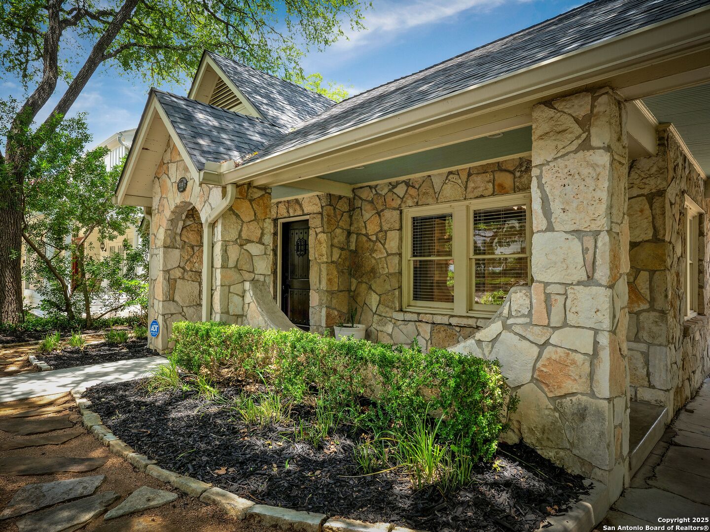 Open House Sunday August 10th 1pm-3pm. Nestled in historic Monte Vista, this enchanting fieldstone cottage blends classic charm with thoughtful updates. With 3 bedrooms and 2 baths, this home invites you in through an inviting front porch that overlooks a beautifully shaded front yard-perfect for morning coffee or evening relaxation. A graceful porte-cochere adds curb appeal and convenience. Inside, timeless details abound: rich hardwood floors flow throughout, picture railing adds vintage character, and a tray ceiling in the living room draws the eye upward. The mock fireplace with its colorful mosaic tiled hearth becomes the cozy centerpiece of the space. The open-concept living and dining area is ideal for entertaining, featuring a striking new chandelier and warm natural light. The updated kitchen delights with newer tile floors, sleek black quartz countertops, stainless steel appliances, gas cooking, and a deep sink beneath a sunny window. Glass-front cabinet doors offer a touch of vintage style with modern function. The bright and serene primary suite boasts a fully renovated bath with a quartz-topped vanity and a beautiful tile shower. A connected flex space-ideal for a nursery, office, or library-features built-in bookshelves that add both charm and utility. The third bedroom and second bath offer privacy and period style, with a clawfoot tub, tiled walls, and vintage-inspired tile floors. Out back, a shaded yard offers endless possibilities-including a potential guest casita with bath, kitchen sink, and soaring cathedral ceilings-just waiting to be finished. This storybook home offers the perfect mix of history and comfort in one of San Antonio's most desirable neighborhoods. Come see this sweet home and make it yours!