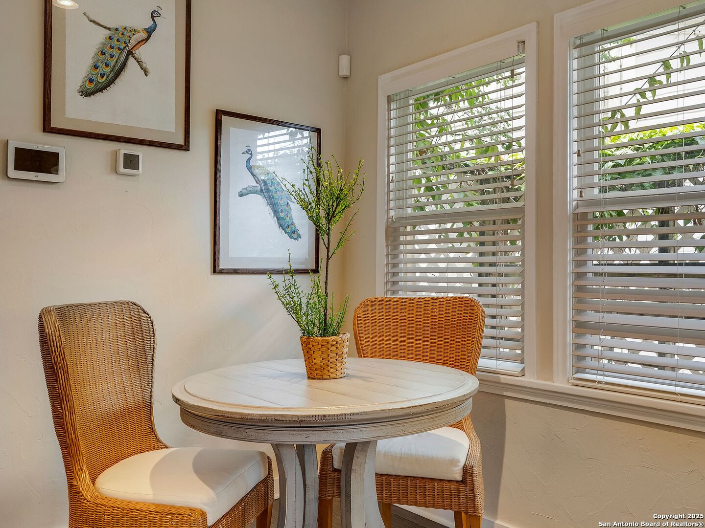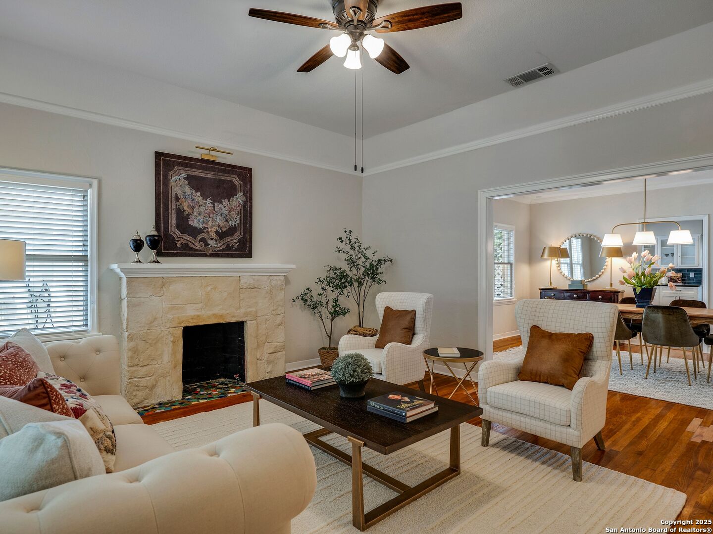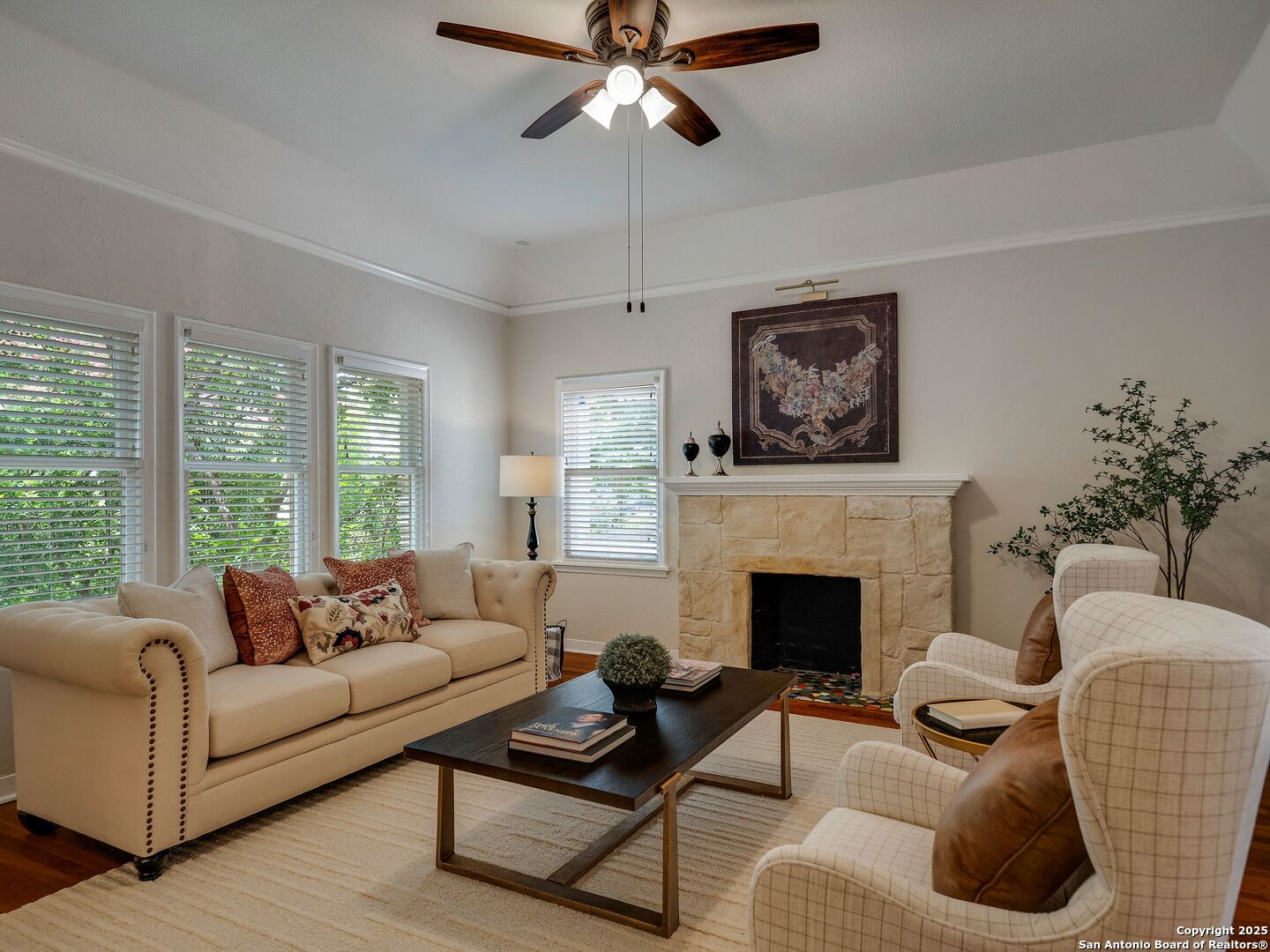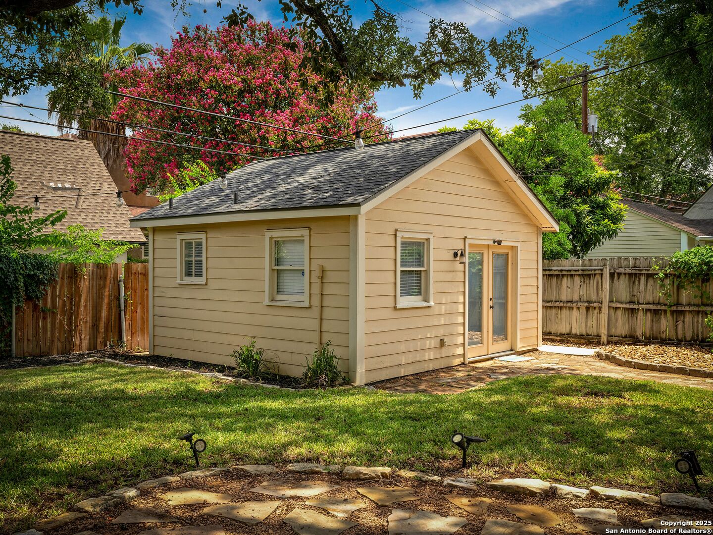 Open House Sunday August 10th 1pm-3pm. Nestled in historic Monte Vista, this enchanting fieldstone cottage blends classic charm with thoughtful updates. With 3 bedrooms and 2 baths, this home invites you in through an inviting front porch that overlooks a beautifully shaded front yard-perfect for morning coffee or evening relaxation. A graceful porte-cochere adds curb appeal and convenience. Inside, timeless details abound: rich hardwood floors flow throughout, picture railing adds vintage character, and a tray ceiling in the living room draws the eye upward. The mock fireplace with its colorful mosaic tiled hearth becomes the cozy centerpiece of the space. The open-concept living and dining area is ideal for entertaining, featuring a striking new chandelier and warm natural light. The updated kitchen delights with newer tile floors, sleek black quartz countertops, stainless steel appliances, gas cooking, and a deep sink beneath a sunny window. Glass-front cabinet doors offer a touch of vintage style with modern function. The bright and serene primary suite boasts a fully renovated bath with a quartz-topped vanity and a beautiful tile shower. A connected flex space-ideal for a nursery, office, or library-features built-in bookshelves that add both charm and utility. The third bedroom and second bath offer privacy and period style, with a clawfoot tub, tiled walls, and vintage-inspired tile floors. Out back, a shaded yard offers endless possibilities-including a potential guest casita with bath, kitchen sink, and soaring cathedral ceilings-just waiting to be finished. This storybook home offers the perfect mix of history and comfort in one of San Antonio's most desirable neighborhoods. Come see this sweet home and make it yours!