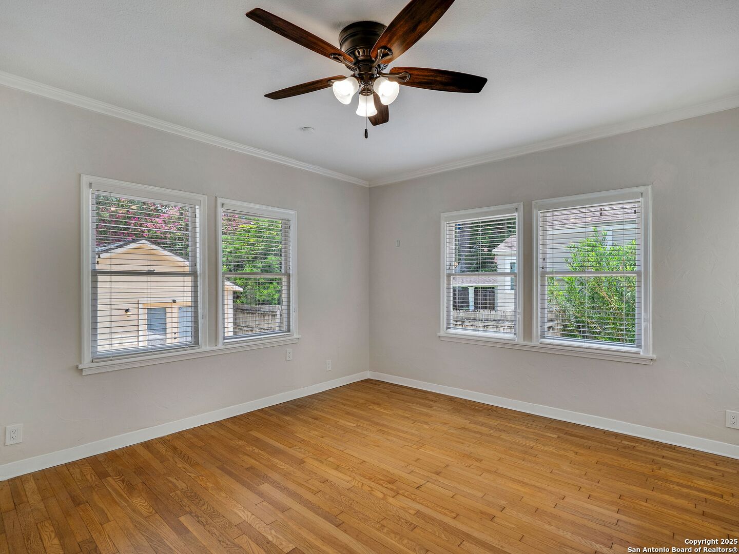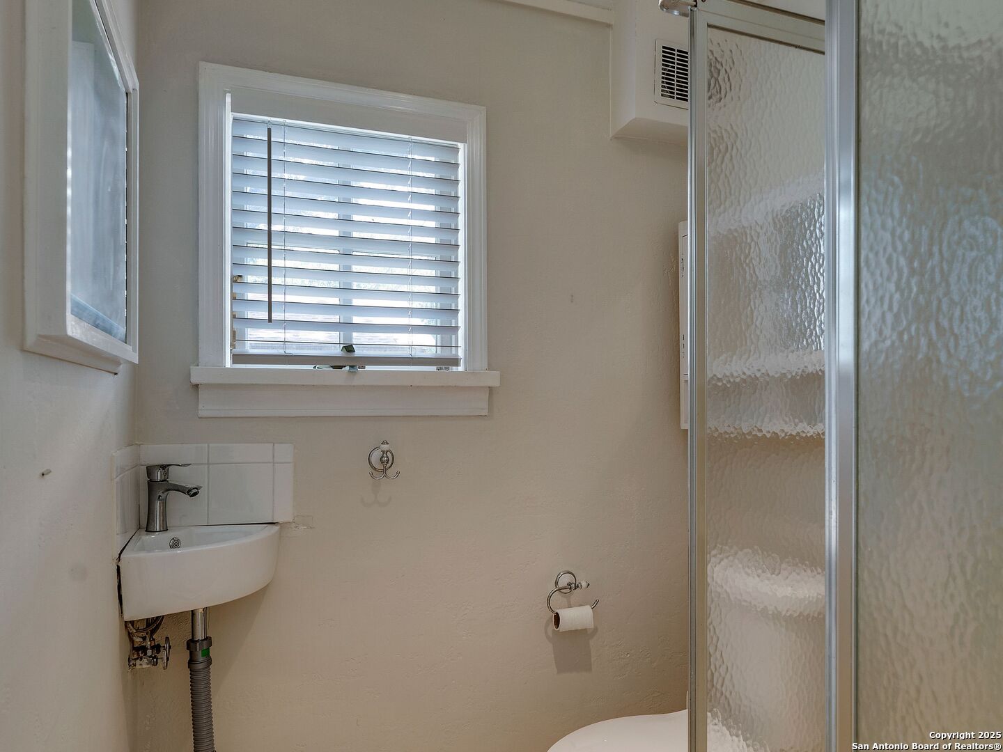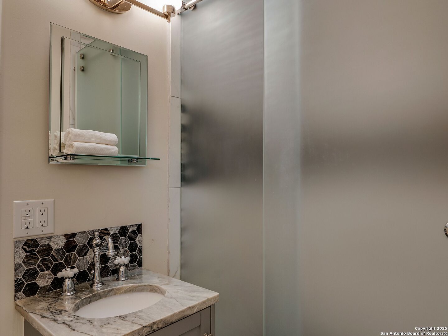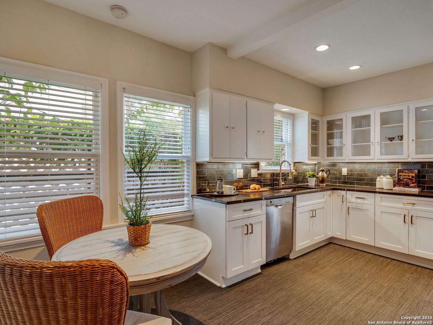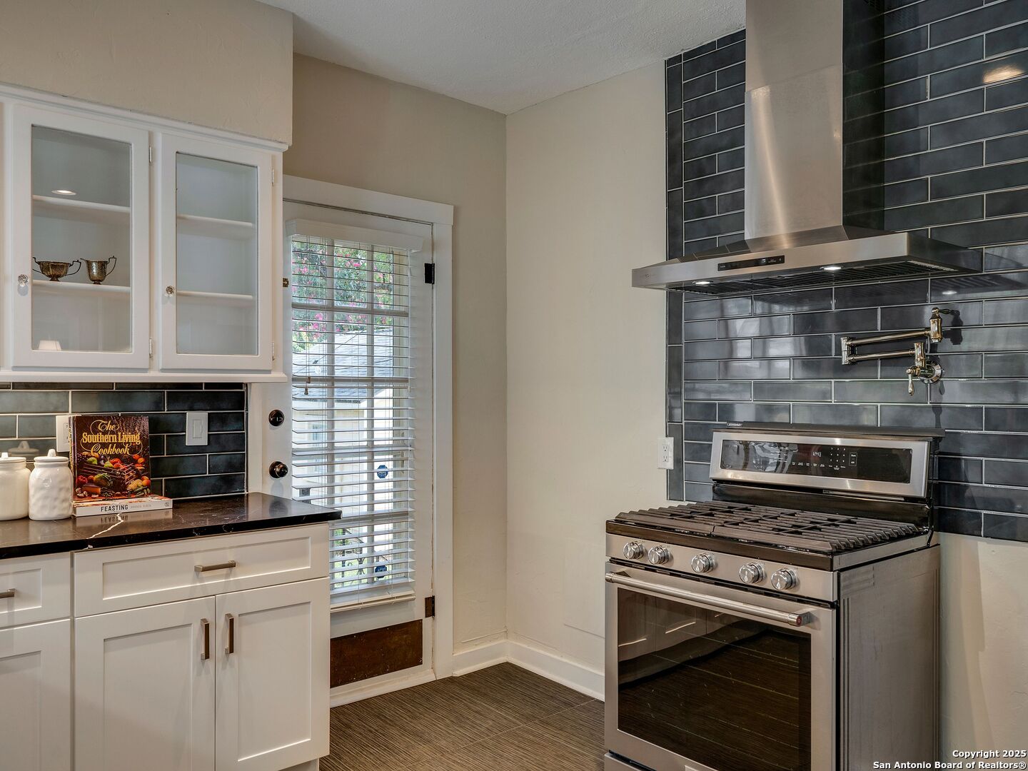 Open House Sunday August 10th 1pm-3pm. Nestled in historic Monte Vista, this enchanting fieldstone cottage blends classic charm with thoughtful updates. With 3 bedrooms and 2 baths, this home invites you in through an inviting front porch that overlooks a beautifully shaded front yard-perfect for morning coffee or evening relaxation. A graceful porte-cochere adds curb appeal and convenience. Inside, timeless details abound: rich hardwood floors flow throughout, picture railing adds vintage character, and a tray ceiling in the living room draws the eye upward. The mock fireplace with its colorful mosaic tiled hearth becomes the cozy centerpiece of the space. The open-concept living and dining area is ideal for entertaining, featuring a striking new chandelier and warm natural light. The updated kitchen delights with newer tile floors, sleek black quartz countertops, stainless steel appliances, gas cooking, and a deep sink beneath a sunny window. Glass-front cabinet doors offer a touch of vintage style with modern function. The bright and serene primary suite boasts a fully renovated bath with a quartz-topped vanity and a beautiful tile shower. A connected flex space-ideal for a nursery, office, or library-features built-in bookshelves that add both charm and utility. The third bedroom and second bath offer privacy and period style, with a clawfoot tub, tiled walls, and vintage-inspired tile floors. Out back, a shaded yard offers endless possibilities-including a potential guest casita with bath, kitchen sink, and soaring cathedral ceilings-just waiting to be finished. This storybook home offers the perfect mix of history and comfort in one of San Antonio's most desirable neighborhoods. Come see this sweet home and make it yours!