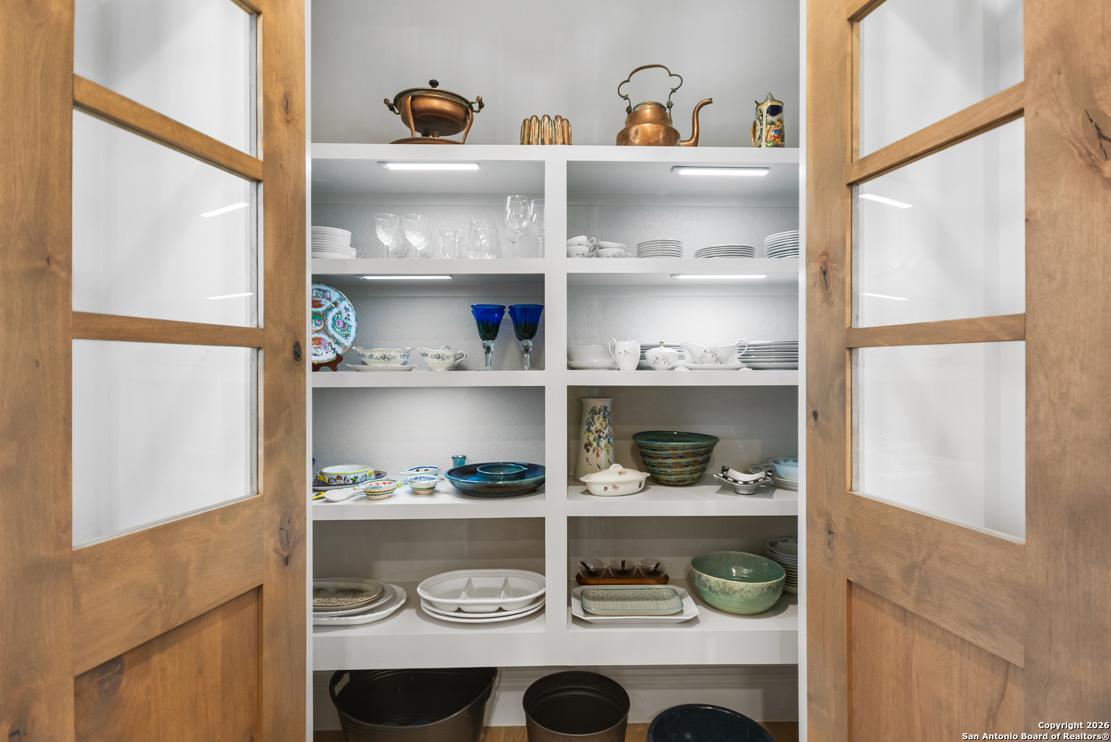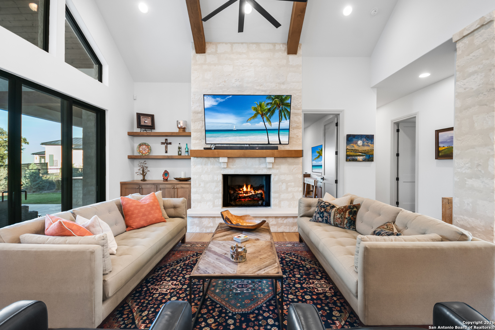 An exceptional Hill Country estate on the most coveted street in Pecan Springs, this one-story residence delivers refined craftsmanship, privacy, and resort-style living on just over an acre. Positioned on a quiet cul-de-sac street with minimal traffic, the home enjoys long-distance views and no rear neighbors, offering a rare sense of seclusion. The exterior makes a striking first impression with German-smeared limestone covering approximately 80% of the home, a timeless metal roof, circular drive, and an oversized three-car garage providing abundant parking. Impeccable landscaping with stone-bordered flowerbeds frames the property, while the north-south orientation enhances year-round comfort and helps beat the Texas summer heat. Inside, architectural details and elevated finishes define every space. A dramatic glass-and-iron front door opens to a double-height entry, wide-plank oak floors, hand-scraped walls, and cathedral ceilings accented by wood beams. German-smeared limestone columns and Michael Edwards cabinetry reflect thoughtful design and artisan quality throughout. The living area is both grand and inviting, designed to showcase the home's natural light and views. The kitchen is a true centerpiece, anchored by a stunning 9-foot marble island with apron-front sink, JennAir built-in appliances, and a six-burner gas cooktop. A fully functioning working pantry with sink and generous counter space keeps everyday appliances tucked away while enhancing functionality for entertaining. The primary suite is a private retreat with direct outdoor access and serene views of the pool and Texas Hill Country. The spa-inspired bath features a freestanding garden tub, walk-in shower, and an impressive 180-square-foot closet complete with a center island. Three secondary bedrooms provide flexible living options, including one with custom built-in bunk beds that doubles as a media or flex space with an en-suite bath and exterior access-ideal as a pool bath. The remaining bedrooms share a Jack-and-Jill bath, with one thoughtfully designed as a flex room featuring a Murphy bed, built-in desk, and bookshelves. Outdoor living is equally exceptional. A covered back patio spanning the full width of the home offers multiple seating and entertaining areas, along with a dedicated storage room for pool and outdoor essentials. The resort-style pool and hot tub are complemented by an outdoor cooking area, while a level section of the property provides the perfect spot for a children's play area or open lawn activities. Blending timeless materials, functional luxury, and an unbeatable setting, this Pecan Springs home offers privacy, views, and craftsmanship rarely found-all on one of the neighborhood's finest streets.