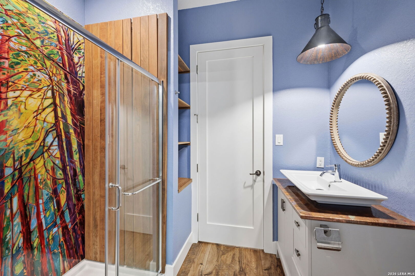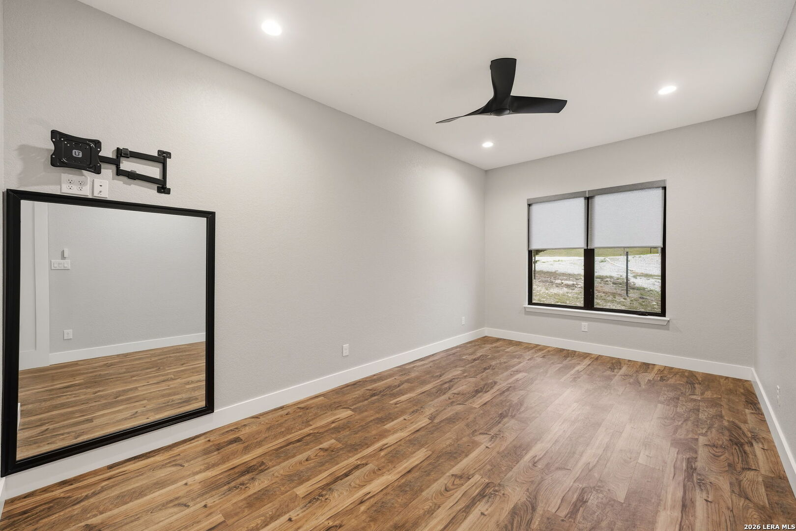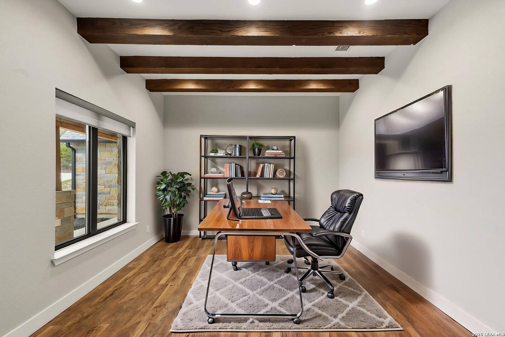 Welcome to 1119 Sunrise Place! Set on 2.86 acres in prestigious Mystic Shores this beautifully designed single-story estate offers over 3,500 square feet, 4 bedrooms, 3 bathrooms, and sweeping Texas Hill Country views. The open floor plan is anchored by a striking kitchen with a center island, prep sink, induction cooktop, GE Cafe double ovens, separate refrigerator and freezer, abundant maple cabinetry, and a sink perfectly positioned at the window to take in the scenery, all flowing into a spacious living room with Douglas Fir wood-beamed ceilings and dramatic sliding glass doors to the covered back patio. The private study also features wood beams, while the luxurious primary suite showcases a vaulted ceiling with beam detail, two ceiling fans, and a spa-inspired bath with dual vessel sinks, a jetted cast-iron tub and an oversized walk-in shower. Thoughtfully built with spray foam insulation, post-tension foundation, luxury vinyl plank flooring throughout, solar panels, whole-house surge and lightning protection, 3-zone Wi-Fi HVAC, and extensive smart-home wiring, this home blends craftsmanship and efficiency at every turn. Pet lovers will appreciate the thoughtful amenities, including built-in dog crates, a convenient dog washing station, a doggy door for easy outdoor access, and a fully fenced yard. Outside, enjoy a expansive covered patio with beautiful stone wood burning fireplace, hot tub, mature oaks, and large pond. This home has all these features as well as access to Mystic Shores amenities including pools, lakeside park and playground, sport courts, tennis, basketball, trails, boat ramp, pavilions, and picnic areas.
