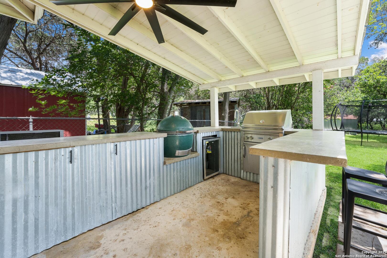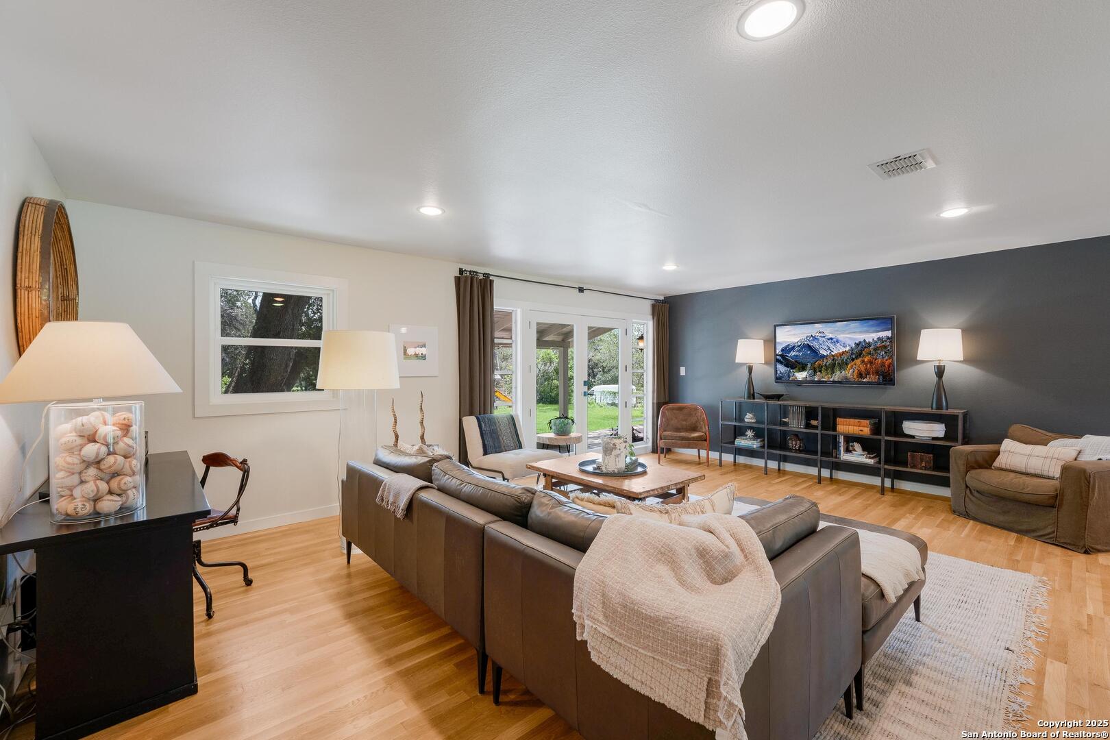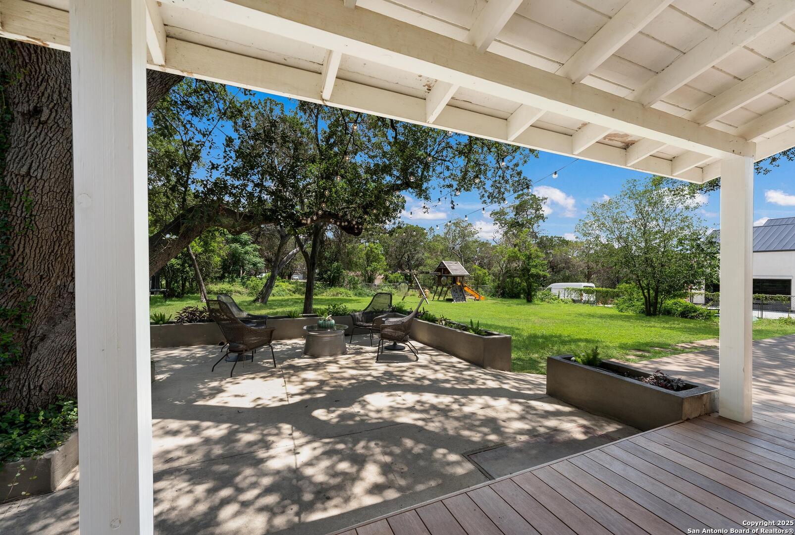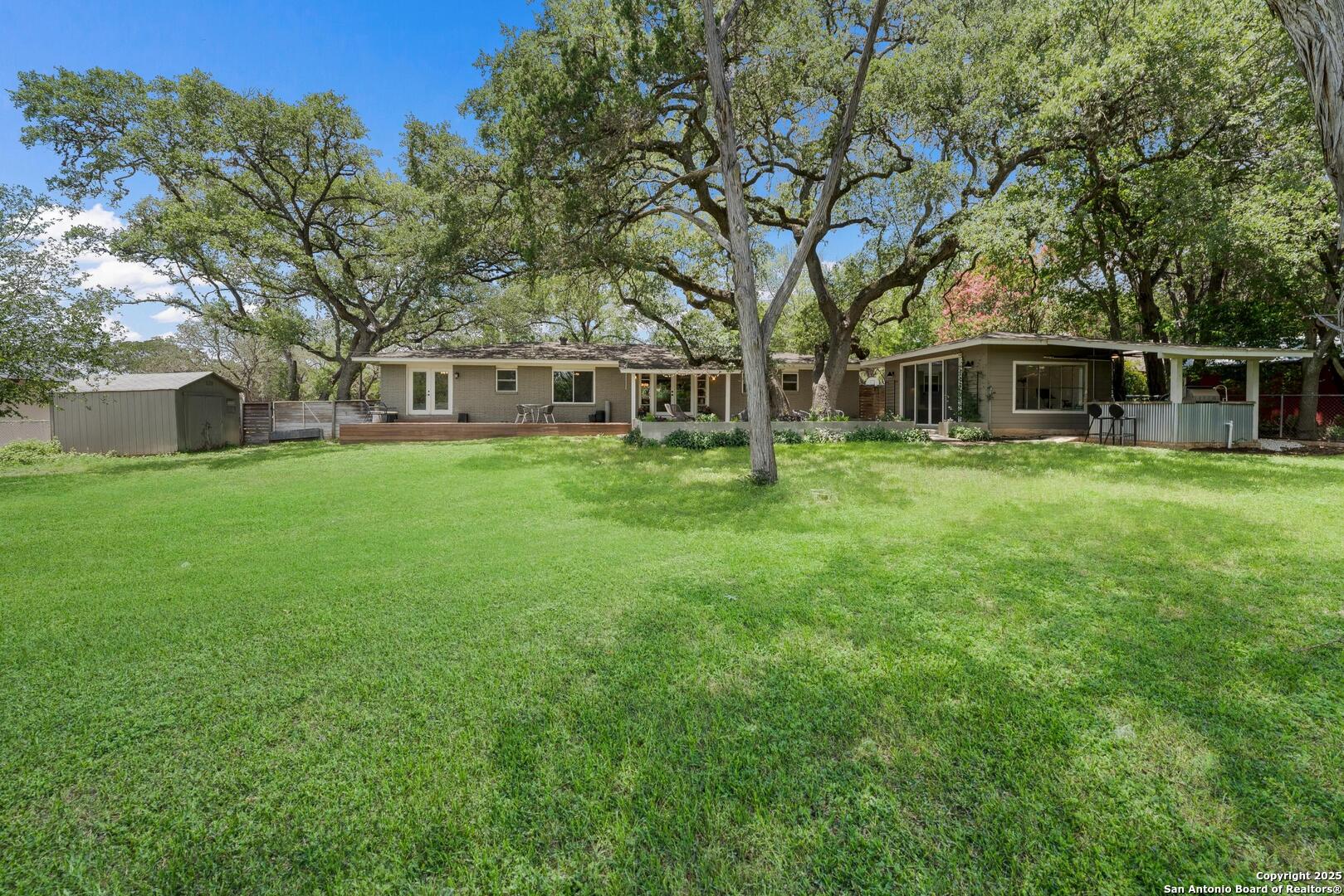 Tucked away on a quiet dead-end street, this 0.69-acre gem offers the perfect blend of privacy, location, and lifestyle-just a golf cart ride from Landa Park and minutes to downtown New Braunfels, Schlitterbahn, and Wurstfest. Whether you're after weekend fun or everyday ease, this home delivers. Plus, you're covered with a recently installed roof! Out back, the good life unfolds. A raised Ipe wood deck-partially covered-sets the stage for laid-back lounging or dinner under the stars. The outdoor kitchen is ready to impress with a built-in grill, sink, space for a wine fridge, and tons of counter space for prepping and serving. Game days, parties, or just soaking in the breeze-the finished out game room is your extra hangout zone, flooded with natural light through oversized sliders. Inside, modern design meets functional flow. The open-concept living area connects seamlessly to a chef-inspired kitchen with a massive island, concrete countertops, custom cabinetry, and smart storage like a built-in sliding trash bin. Wood flooring, recessed lighting, and tinted windows add warmth and energy efficiency throughout. The owner's suite offers a calming retreat with a slat wood accent wall, walk-in closet, and stylish en suite bath. Every detail-indoors and out-is dialed in for comfortable living and easy entertaining, right in the heart of one of New Braunfels' most sought-after neighborhoods.