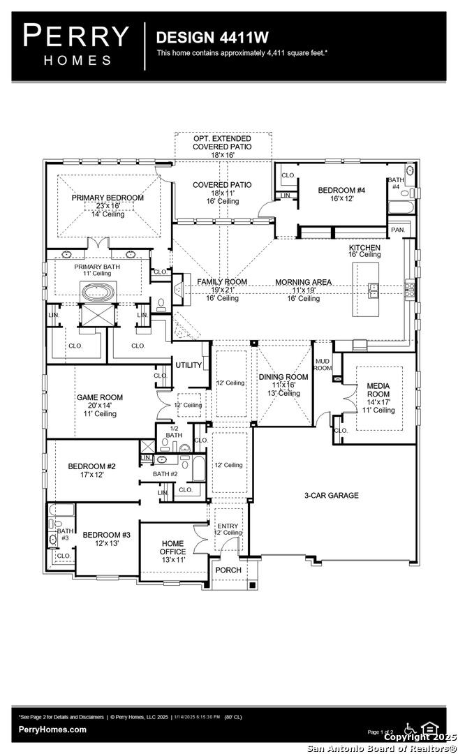 Entry framed by home office with French doors. Extended entry with 12-foot coffered ceiling flows past large game room with French doors and formal dining room. Spacious family room with a corner fireplace opens to morning area. Island kitchen with built-in seating space and a corner pantry. Secluded primary suite boasts a beautiful wall of windows. Primary bath offers dual vanities, garden tub, separate glass enclosed shower, two linen closets and two walk-in closets. Media room just off the kitchen area. Secondary bedrooms all offer full bathroom and walk-in closet. Utility room. Covered backyard patio. Mud room just off the three-car garage.