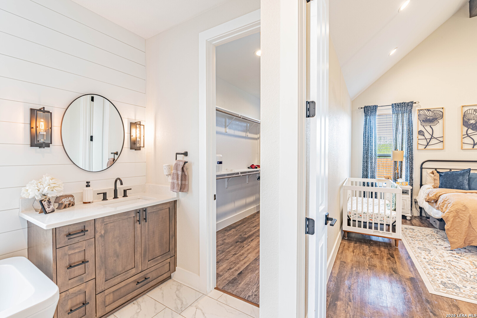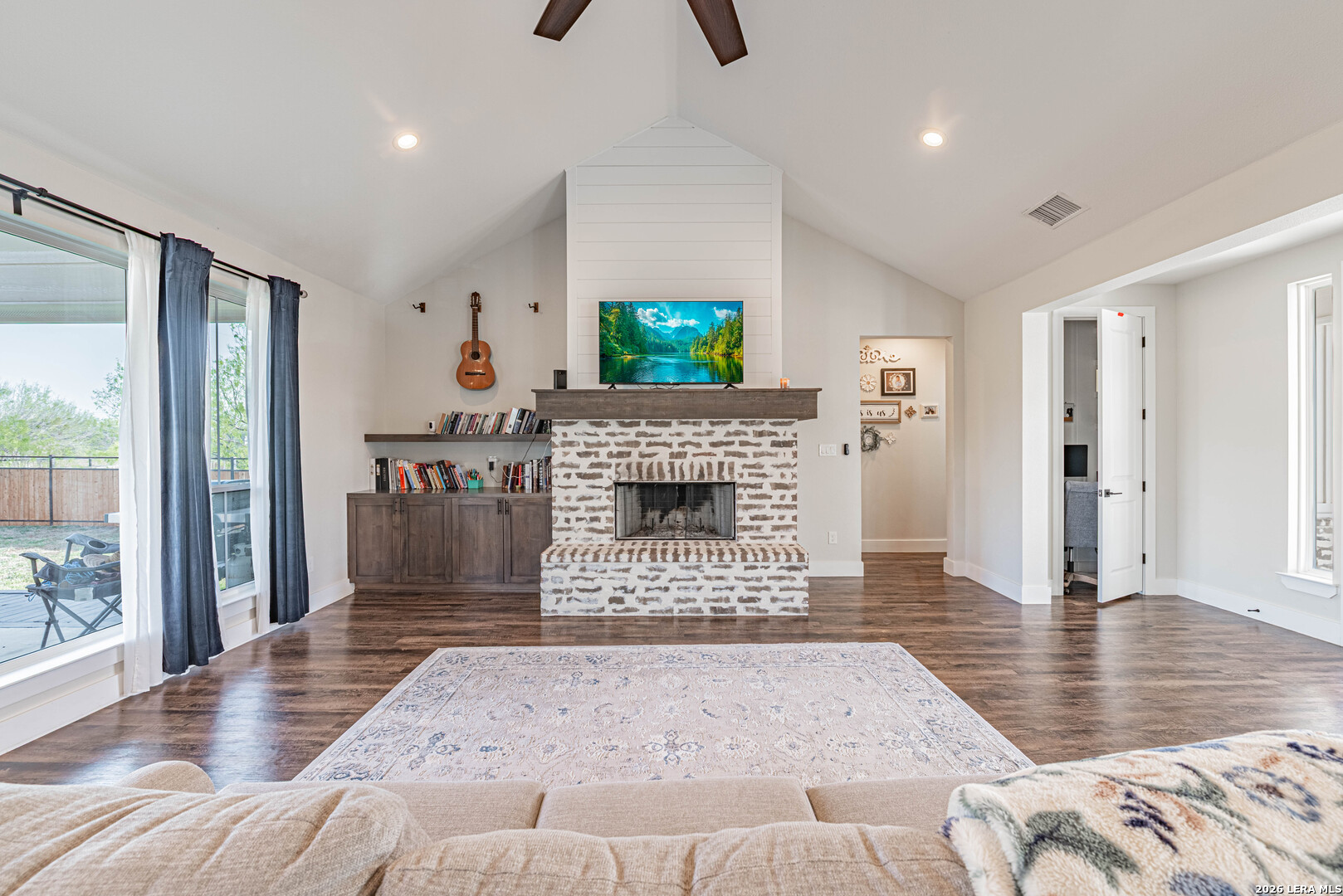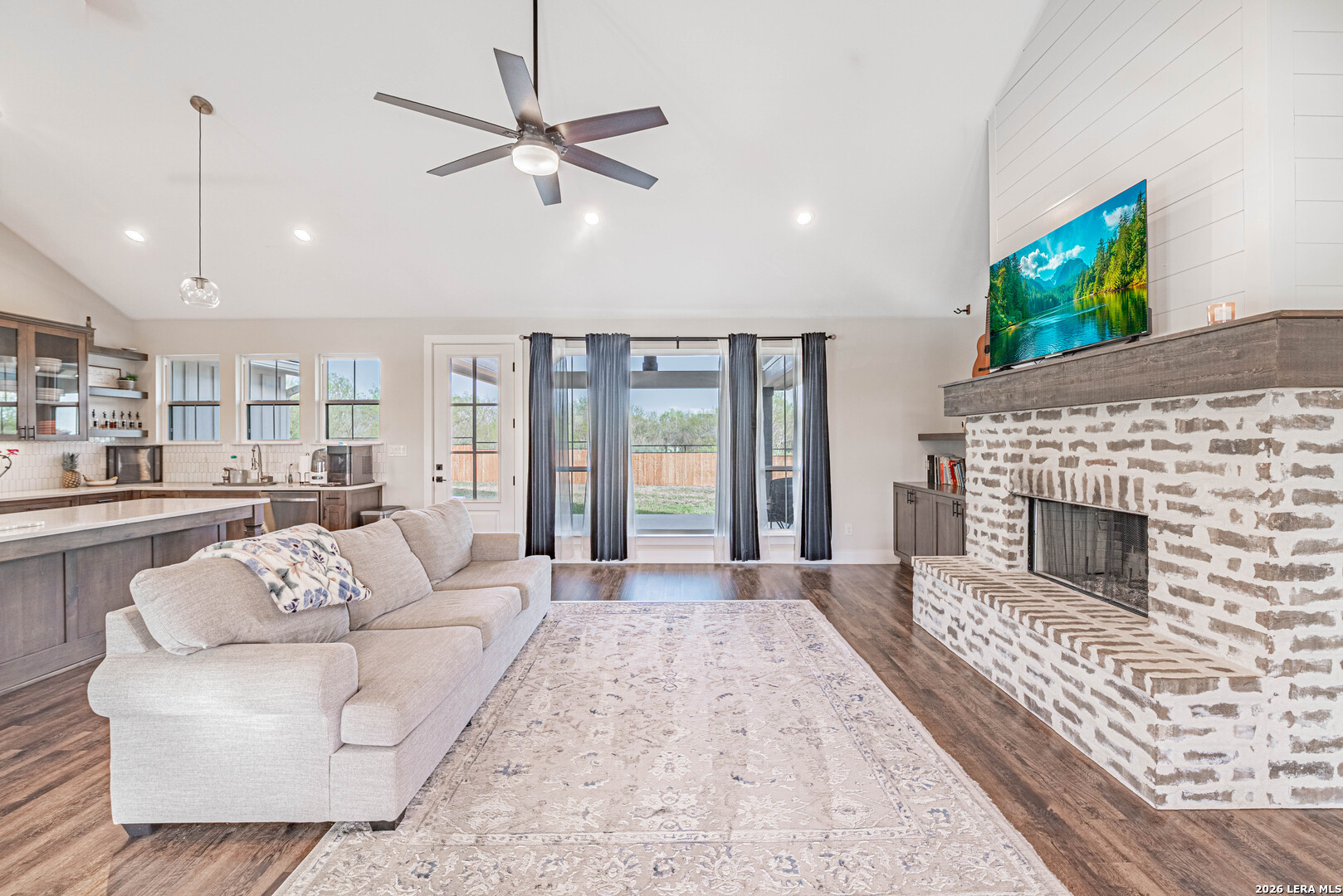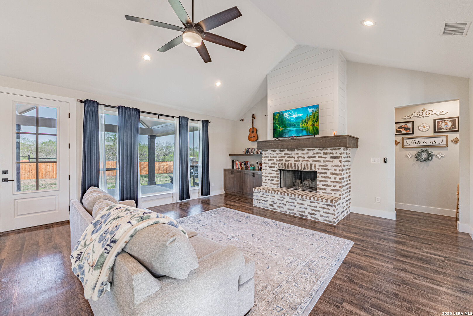 Prepare to be captivated! The perfect blend of farmhouse charm and contemporary design, boasting beautiful curb appeal in the coveted Woodbridge Farms community! Step inside and be greeted by a highly functional and inviting open floor plan, featuring 3 spacious bedrooms with 2 full bathrooms, and 1 half bathroom, alongside a versatile dining/flex room. Luxury vinyl plank flooring flows seamlessly throughout the main living areas, complemented by stylish tile in the laundry room and bathrooms. The heart of the home is the kitchen, a true sanctuary, overlooking an oversized living room warmed by a cozy wood-burning fireplace. Gourmet kitchen features include solid wood shaker cabinets, gleaming quartz countertops, and a chef-inspired walk-in pantry accessible through a charming barn door. The primary suite is a true retreat, complete with two generous walk-in closets and a lavish primary bathroom. Indulge in the separate vanities, a separate free-standing soaking tub, and a luxurious walk-in shower with bench seat. And now, the outdoor oasis! Spacious backyard with a covered patio, additional decking, and no direct neighbors behind you! Sprinkler system! Close proximity to subdivision park with outdoor seating/gazebo and walking trails. Conveniently located and walking distance to schools, shopping and local restaurants!