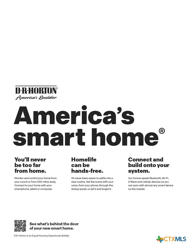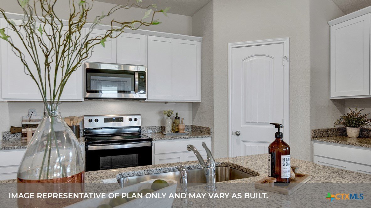 MARCH/APRIL COMPLETION. COMMUNITY HAS LOT OF AMENITIES AND ELEMENTARY SCHOOL IS IN THE COMMUNITY. EASY ACCESS TO I-35. The Lakeway is our most popular floorplan and is available at Trace in San Marcos, Texas. This one-story home offers 2,034 square feet of living space across 4 bedrooms, 3 bathrooms, a study, and 2-car garage. Our homes in Trace feature farmhouse exteriors. As you enter the home from the covered front porch, you’ll step into the spacious foyer and will find the open study, bathroom 2 and bedroom 2. Use the study as a home office, library, or extra play area for the kids. Stepping further into the home, you’ll discover the dining room, kitchen and family room laid out in an open concept design. Built to make cooking, eating, and entertaining a pleasant experience for family and friends, you’re sure to make many memories in this beautiful space. The kitchen includes quartz countertops, a large island facing the family room, a walk-in pantry, stainless-steel appliances and 36’’ upper cabinets. Located privately off the dining room are bedrooms 3 and 4, as well as bathroom 3. The primary bedroom is at the back of the house, off the family room, and includes a private bathroom. This relaxing bathroom space features a 5’ walk in shower, vanity, private toilet area with a door, and a walk-in closet. The utility room is outside the primary bedroom, allowing for the laundry chores to be completed with ease. The Lakeway includes vinyl flooring throughout the common areas of the home, and carpet in the bedrooms. All our new homes feature a covered back patio, full sod, irrigation system in the front and back yard, and a 6’ privacy fence around the back yard. This home features our America’s Smart Home base package, which includes the Video Front Doorbell, Front Door Deadbolt Lock, Home Hub, Thermostat.