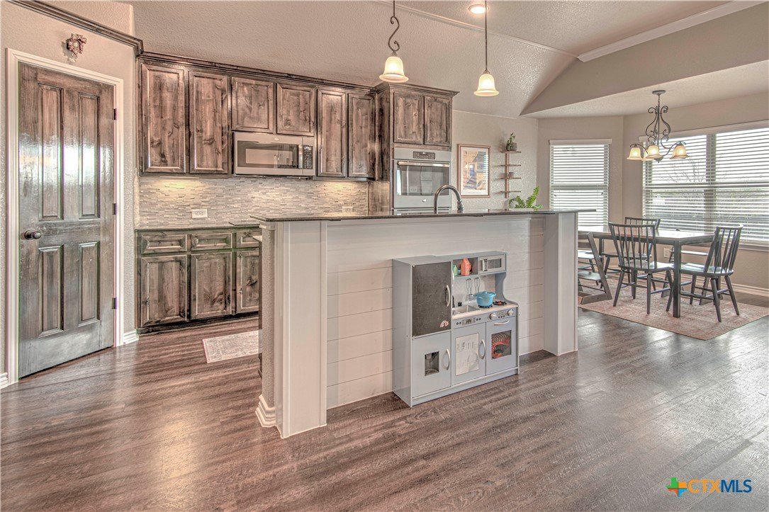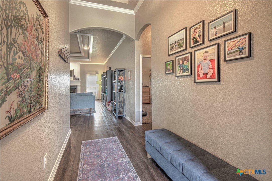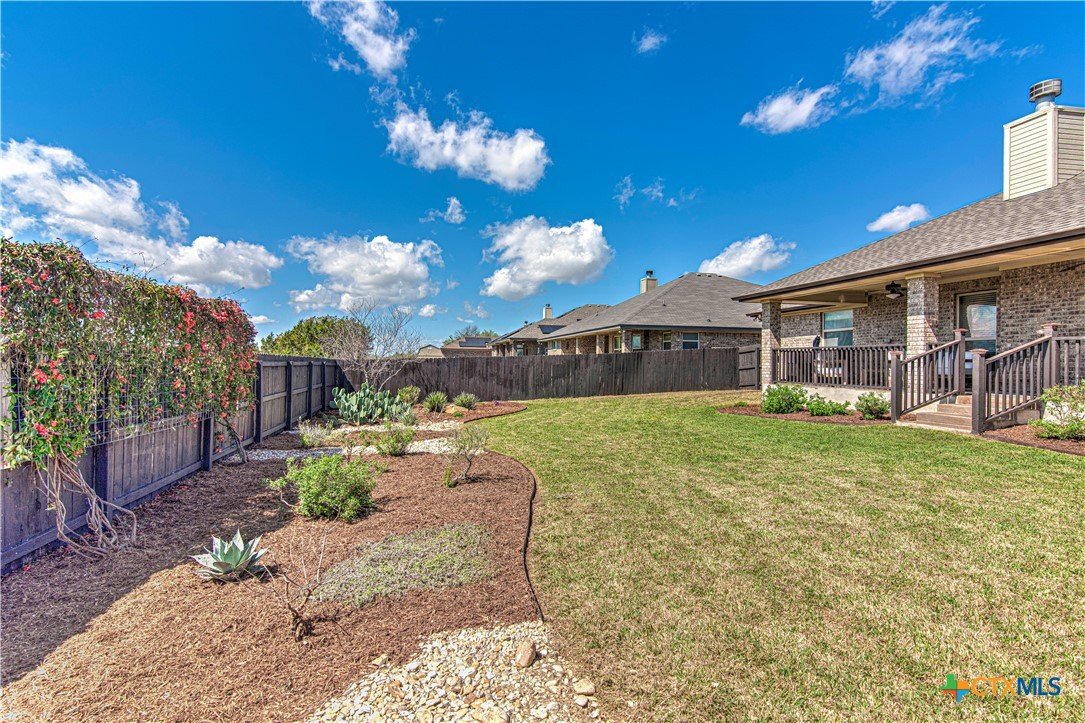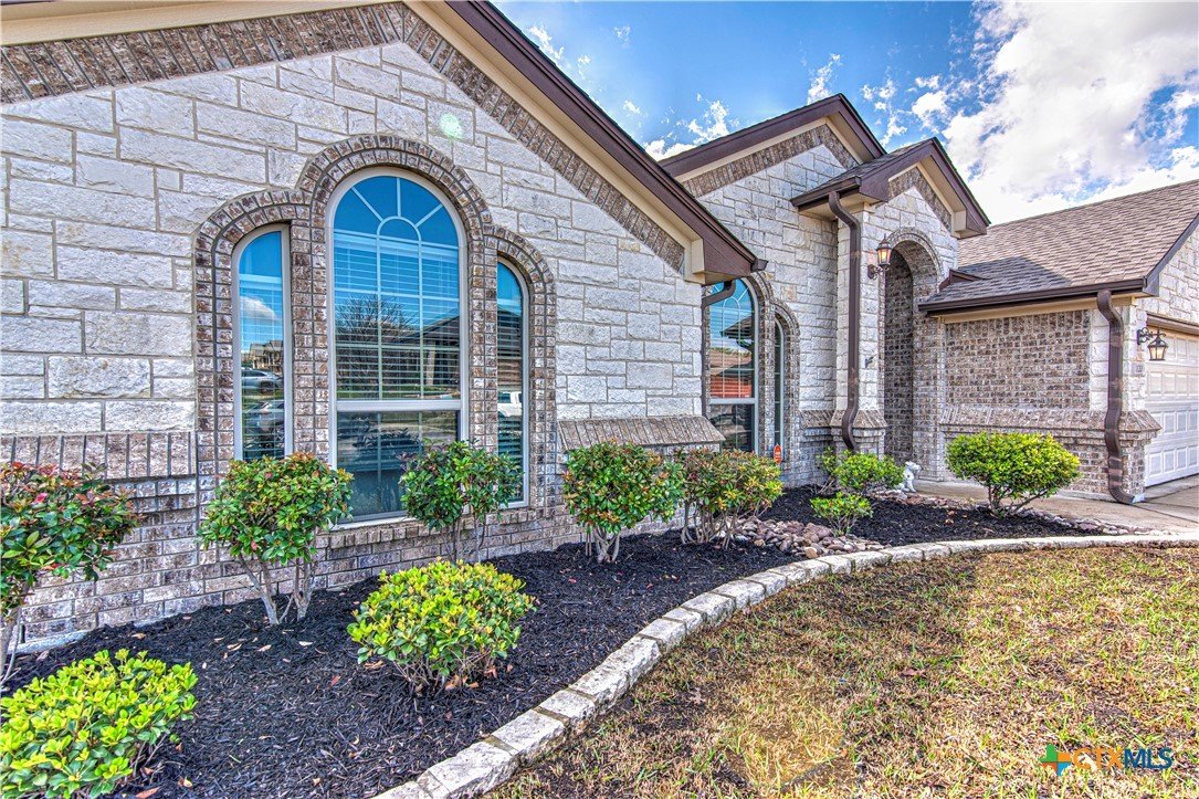 Located in The Grove at Whitten Place in Harker Heights with NO HOA, this beautiful 4-bedroom, 2.5-bath home built by Carothers Home Builders offers 2,357 sq ft of thoughtfully designed living space on a generous 0.27-acre lot. The home features a desirable split floorplan with spacious living areas and stylish LVP flooring throughout the main living areas, while the bedrooms offer comfortable carpet. The open-concept kitchen overlooks the dining and living areas and is equipped with granite countertops, double ovens, and a large corner pantry—perfect for cooking and entertaining. A formal dining room provides flexibility and can easily serve as an office, flex space, or additional living area. The living room features a cozy fireplace that can be wood-burning or used with the electric insert. The private primary suite includes a large shower, jetted soaking tub, dual closets, and a spacious layout designed for comfort. Additional features include a utility sink located in the garage, along with a dedicated plug ready for an electric vehicle charger. Outside, enjoy the large covered back porch complete with two ceiling fans, an outdoor sink with granite counter space, and room for a mini fridge—ideal for outdoor entertaining. The well-maintained yard features easy-care landscaping, a full sprinkler system, gutters, and durable four-sided brick construction. This move-in ready home offers comfort, functionality, and space both inside and out in one of Harker Heights’ desirable neighborhoods.