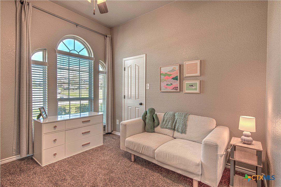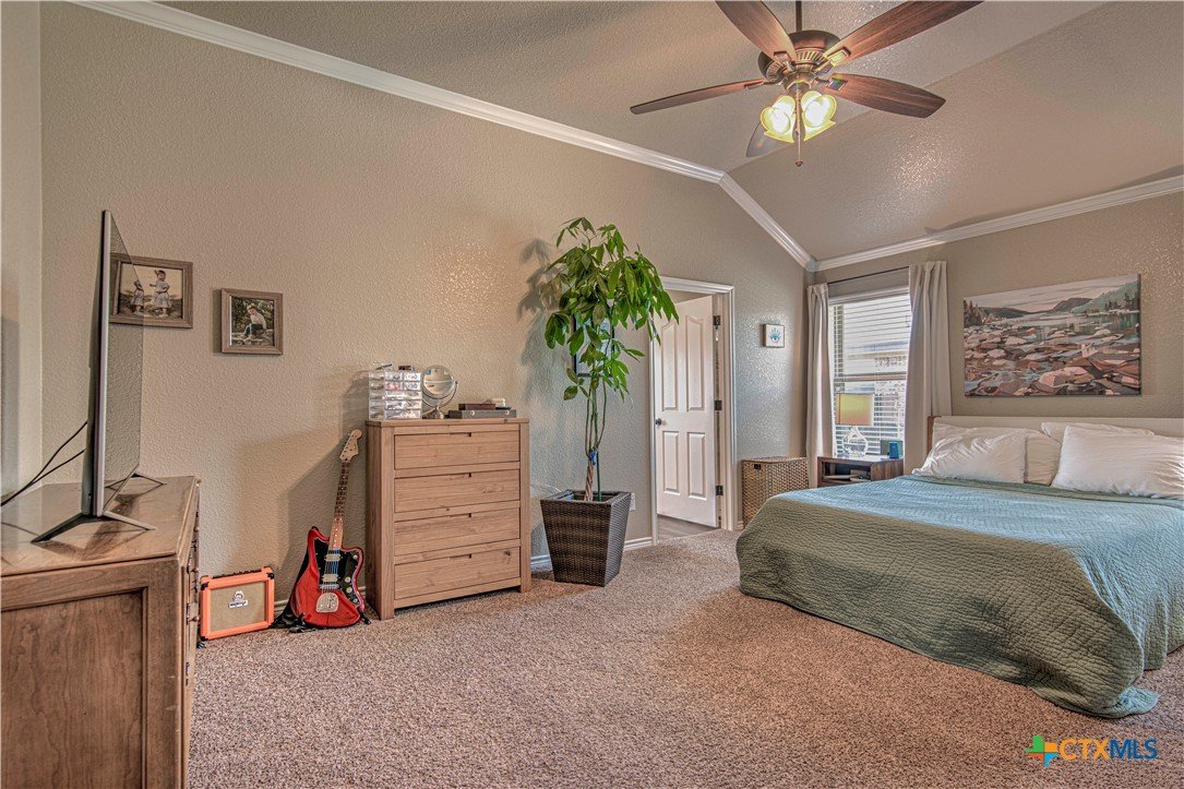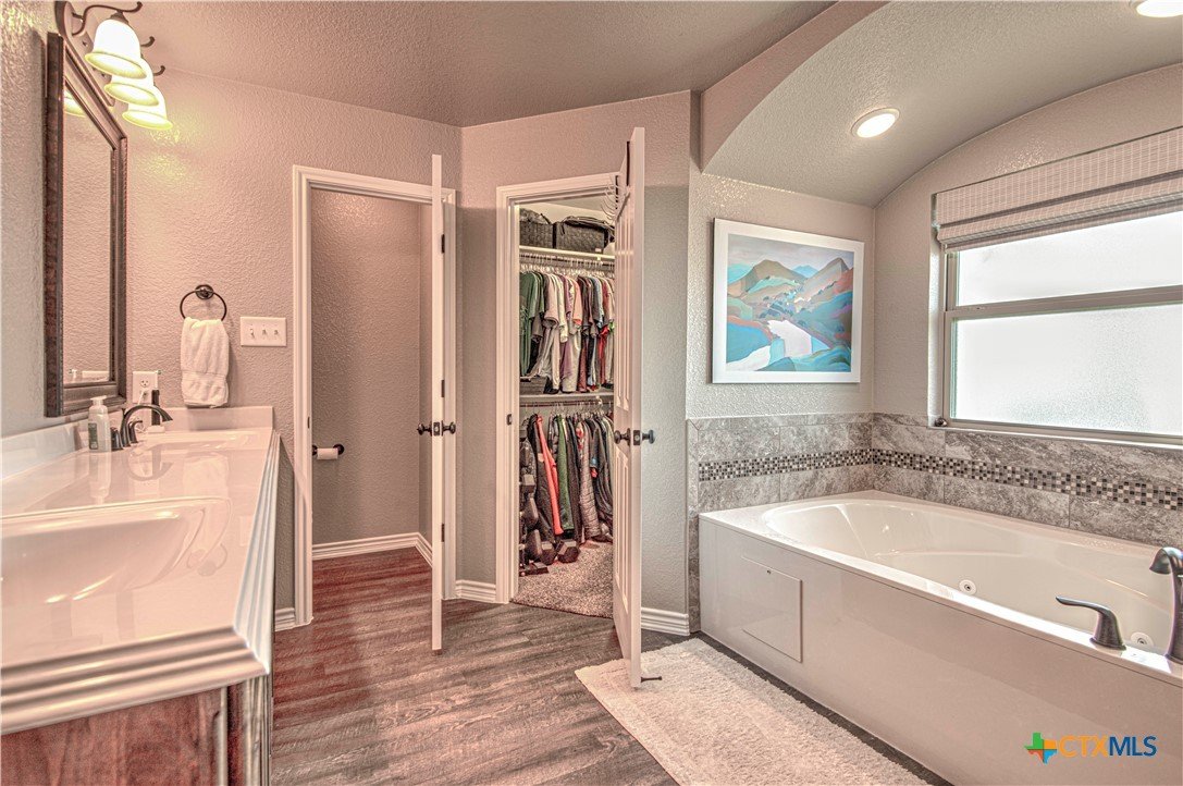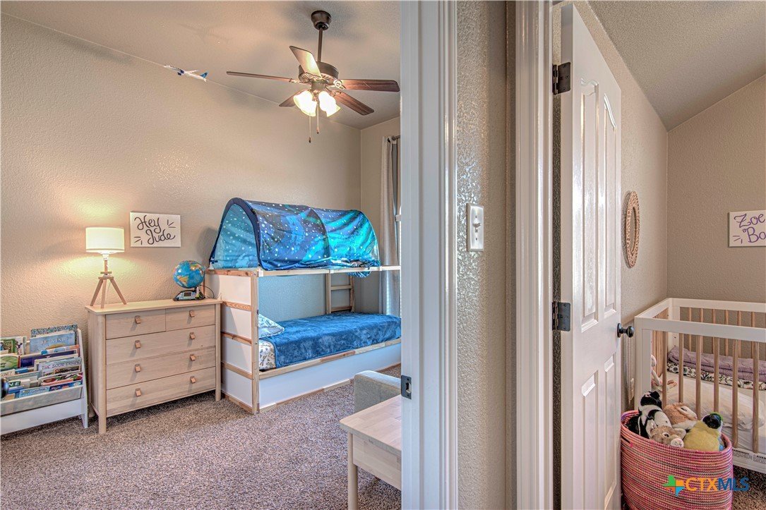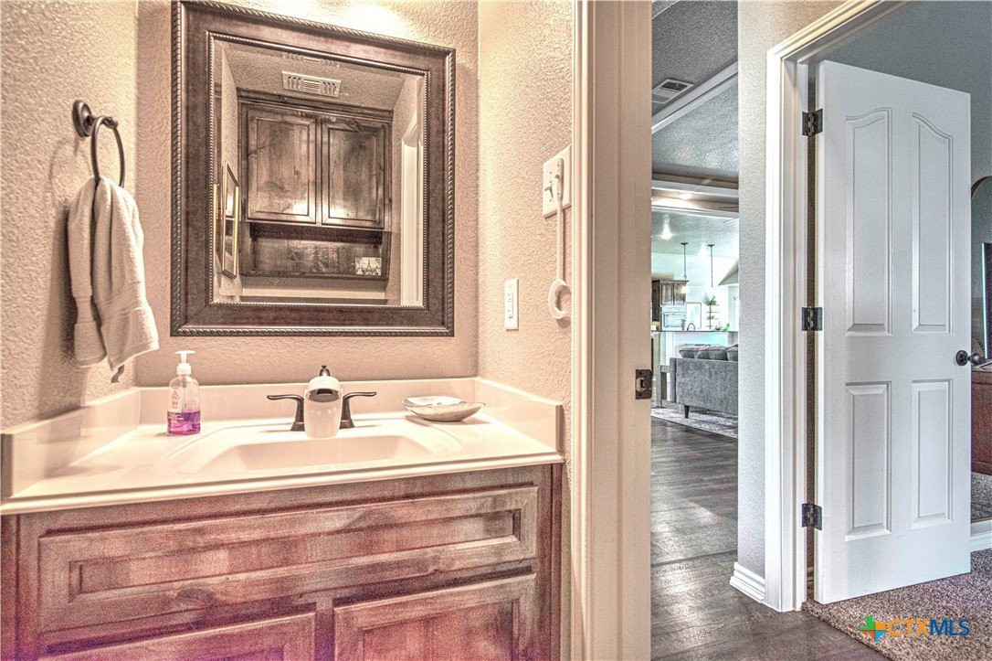Located in The Grove at Whitten Place in Harker Heights with NO HOA, this beautiful 4-bedroom, 2.5-bath home built by Carothers Home Builders offers 2,357 sq ft of thoughtfully designed living space on a generous 0.27-acre lot. The home features a desirable split floorplan with spacious living areas and stylish LVP flooring throughout the main living areas, while the bedrooms offer comfortable carpet. The open-concept kitchen overlooks the dining and living areas and is equipped with granite countertops, double ovens, and a large corner pantry—perfect for cooking and entertaining. A formal dining room provides flexibility and can easily serve as an office, flex space, or additional living area. The living room features a cozy fireplace that can be wood-burning or used with the electric insert. The private primary suite includes a large shower, jetted soaking tub, dual closets, and a spacious layout designed for comfort. Additional features include a utility sink located in the garage, along with a dedicated plug ready for an electric vehicle charger. Outside, enjoy the large covered back porch complete with two ceiling fans, an outdoor sink with granite counter space, and room for a mini fridge—ideal for outdoor entertaining. The well-maintained yard features easy-care landscaping, a full sprinkler system, gutters, and durable four-sided brick construction. This move-in ready home offers comfort, functionality, and space both inside and out in one of Harker Heights’ desirable neighborhoods.