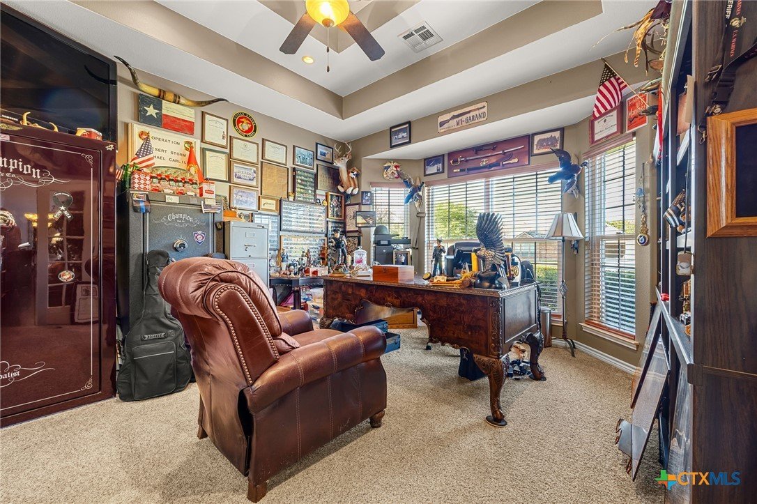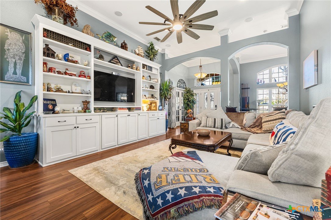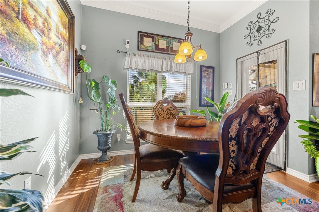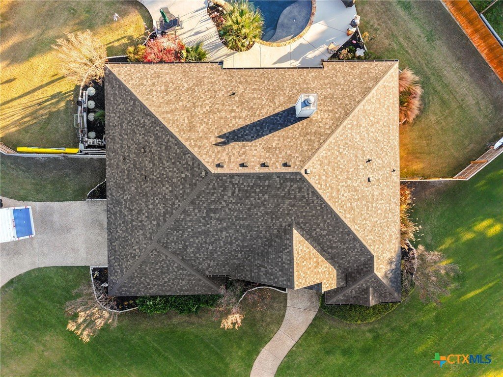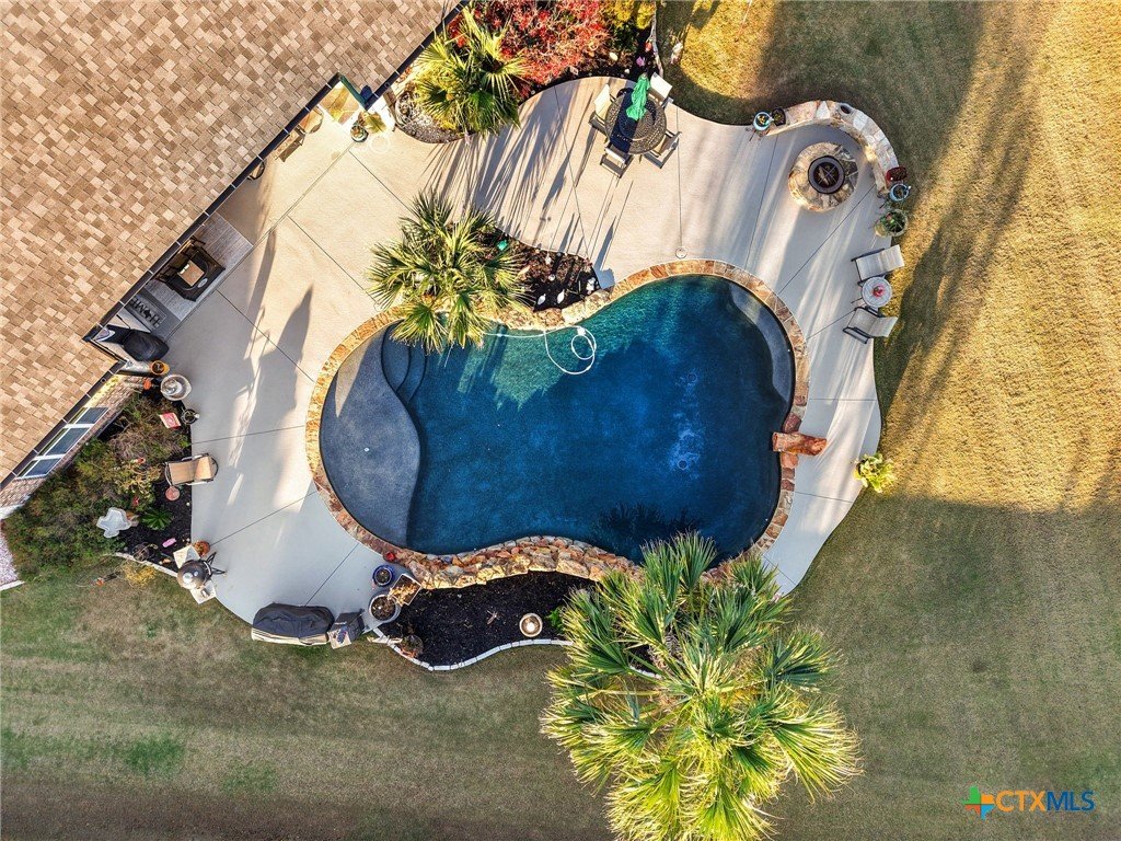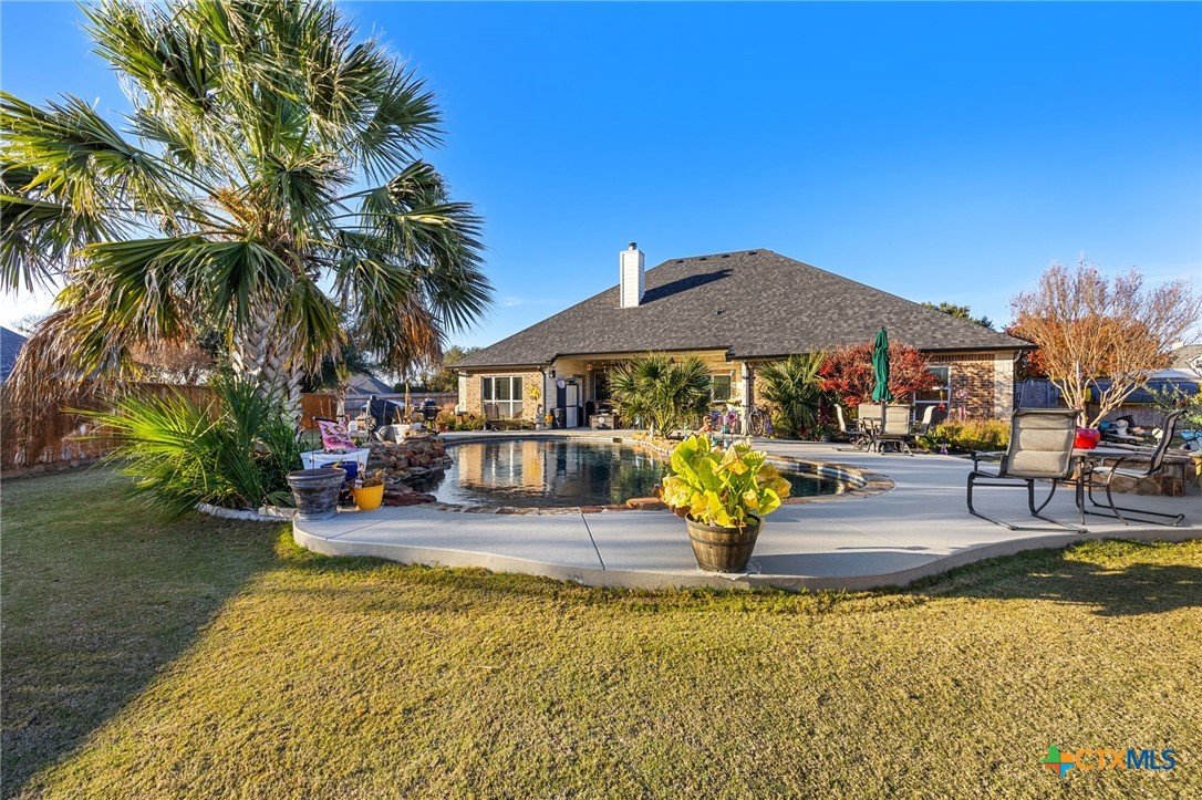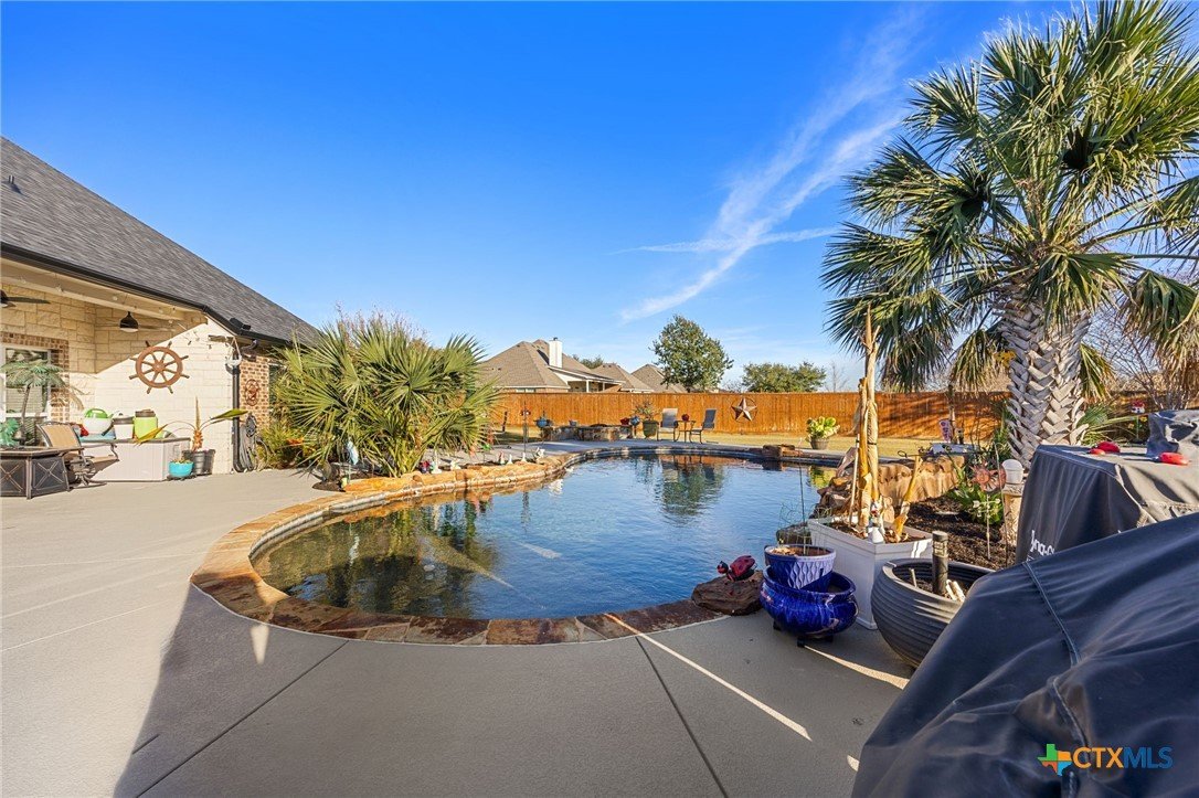 Located in a highly desirable neighborhood, this beautiful 4-bedroom, 2-bath home is just steps from Lakewood Elementary and minutes from Lake Belton. At the front of the home, a circle drive along with an additional side driveway provides convenient parking and added flexibility for guests. Inside, a split floor plan offers versatility and separation of space, with the primary suite and a flexible room on one side and secondary bedrooms on the other. The main living area features a custom built-in entertainment center that serves as a focal point for everyday use or entertaining. The primary bathroom includes a jacuzzi tub, separate shower, double vanity, walk-in closet, and natural light from a large window. Throughout the home, Pella windows paired with real wood blinds contribute to a bright and welcoming interior. Two dining areas enhance flexibility, with the formal dining space currently arranged as a pool table area, illustrating how the space can be adapted to suit a variety of needs, alongside a dine-in kitchen suitable for daily use or casual gatherings. The dining area open to a large patio, supporting seamless indoor-outdoor flow. The fenced backyard extends the usable living space outdoors and includes an inground pool, and outdoor fireplace, creating a comfortable setting for year-round entertaining and relaxed evenings. With convenient access to Lake Belton’s boating, fishing, hiking, and scenic views, this property combines practical design, outdoor amenities, and proximity to local attractions offering a well-rounded setting for a variety of lifestyles.