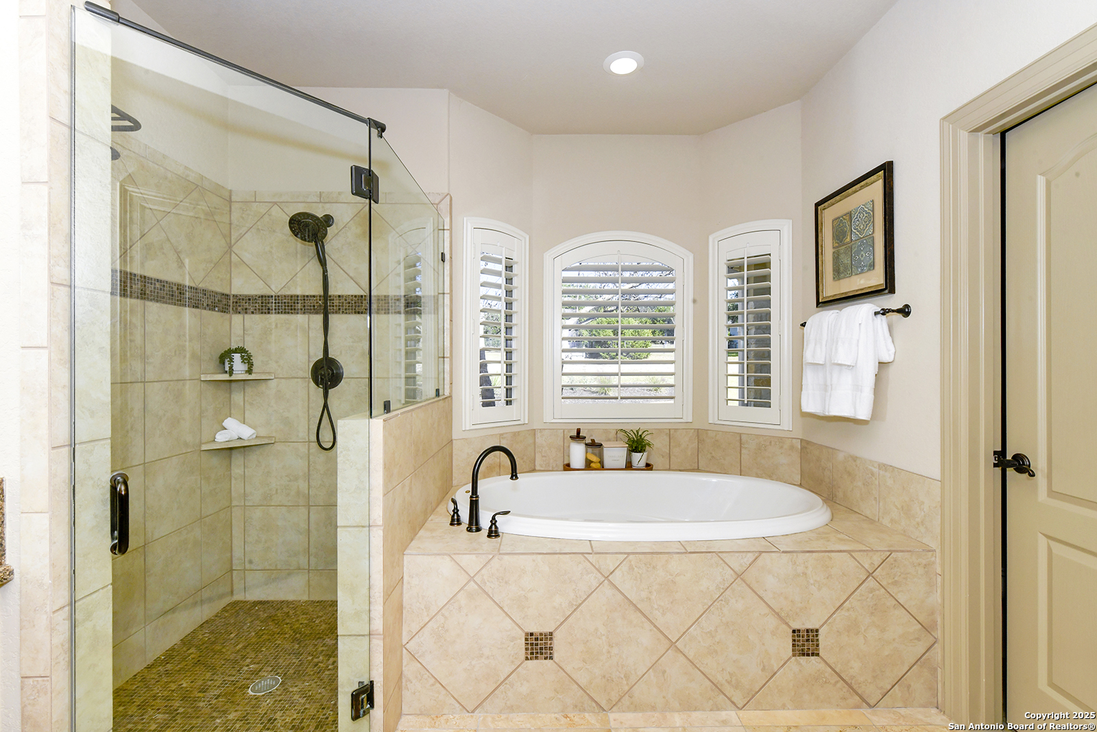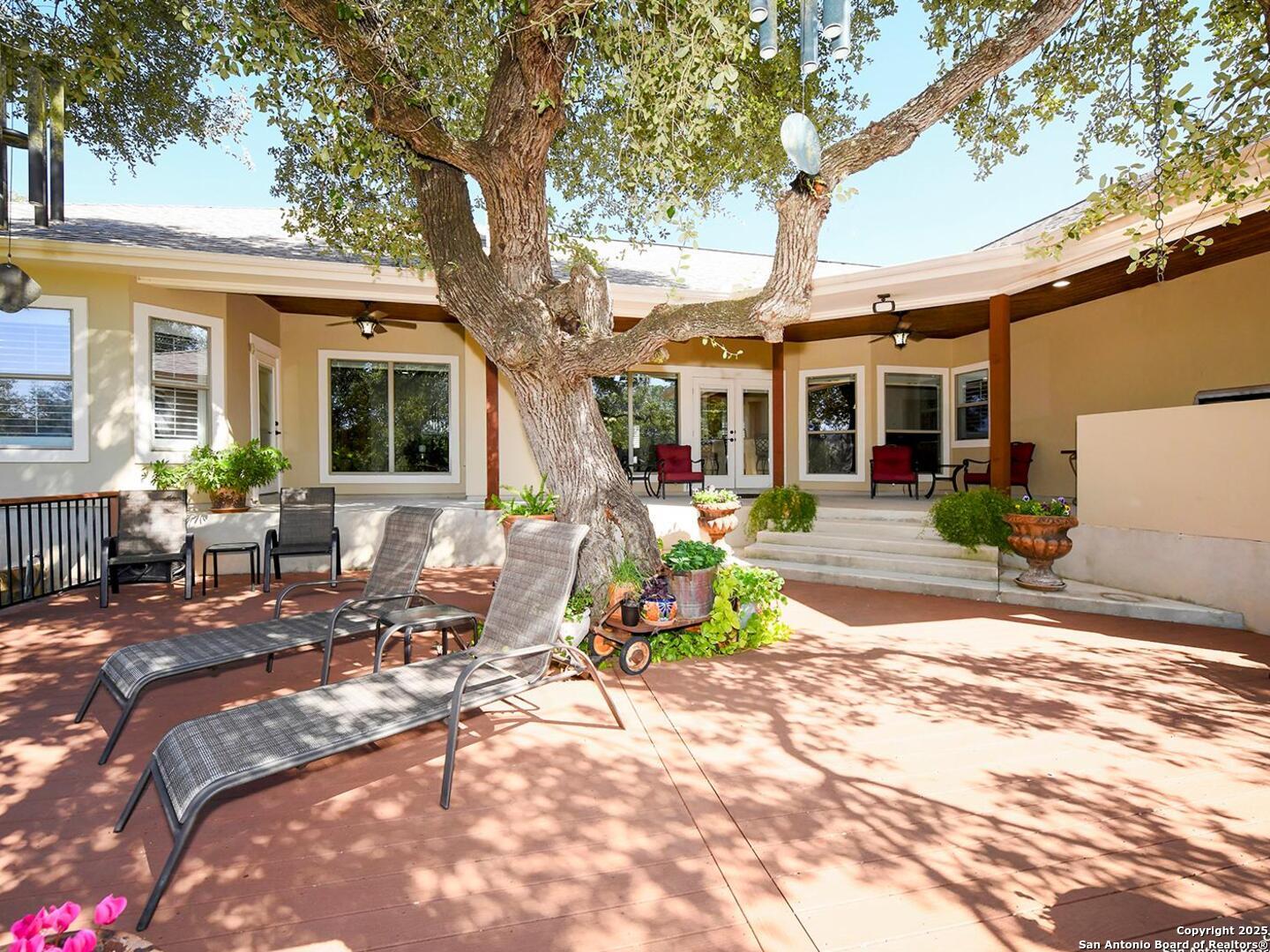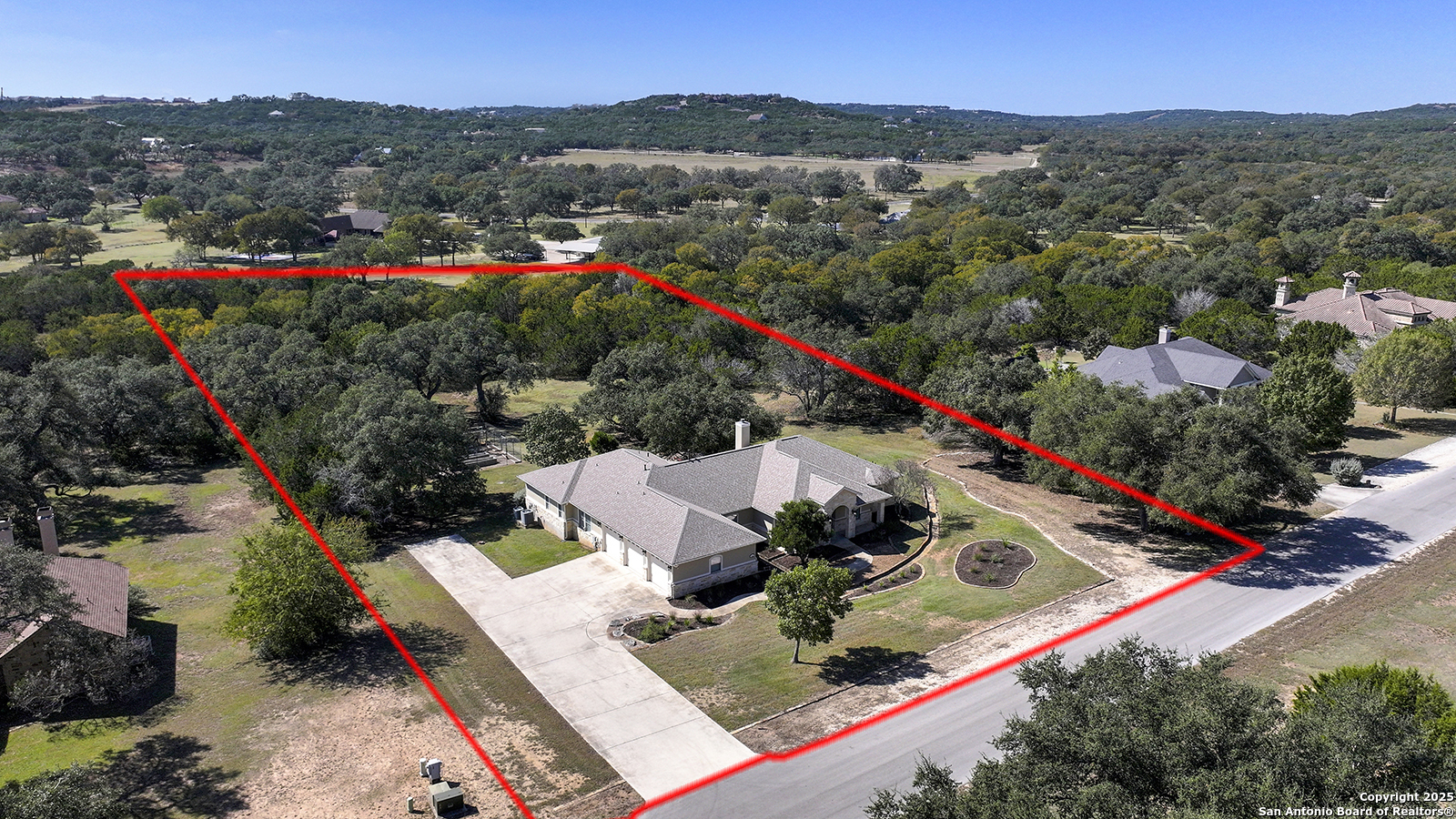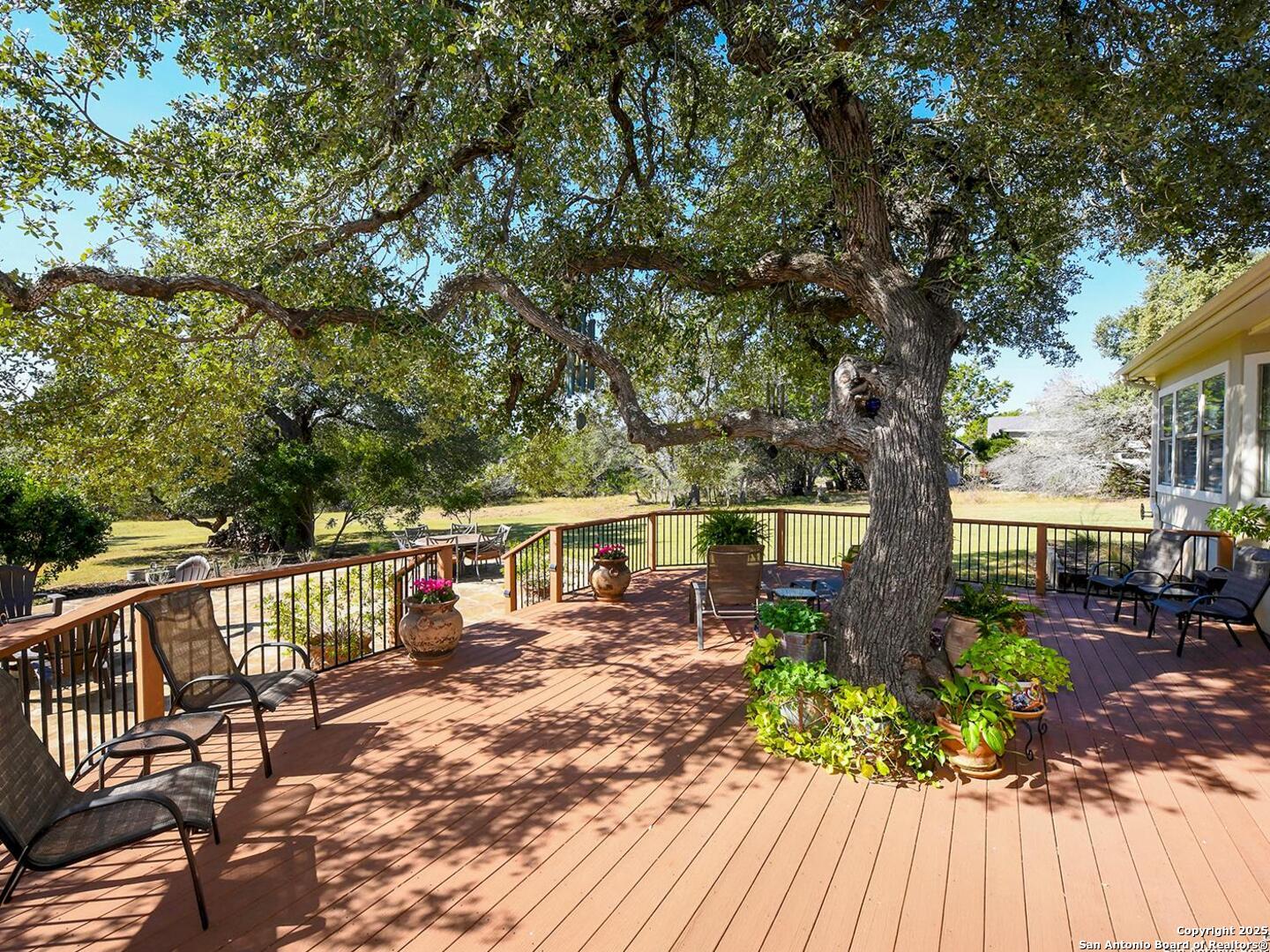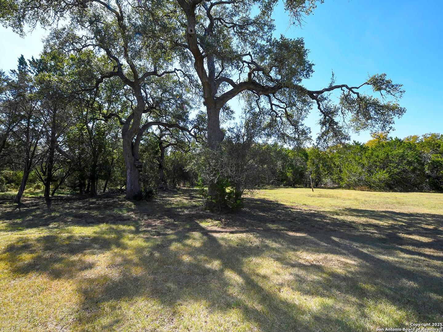 Rare opportunity for Hill Country living on 2.67 acres in The Heights at Comal Trace! Homes in this section rarely come on the market, making this a unique chance to own a custom single-story home in one of Comal County's most desirable locations. Nestled at the back of the community, the property offers exceptional privacy while keeping you close to shopping and dining. Surrounded by mature oaks and a wooded greenbelt, the setting feels like a Hill Country retreat with abundant wildlife including deer and turkey. The open-concept layout features 4 bedrooms plus an office, 3.5 baths, and abundant natural light. The chef's kitchen is a true centerpiece with an oversized island, gas cooktop, double ovens, and walk-in pantry, flowing into a spacious living area with Austin stone accents and a wood-burning fireplace with gas starter. Elegant finishes include polished travertine tile, plantation shutters, and large windows framing serene views. The primary suite offers porch access and a spa-inspired bath with jetted tub, walk-in shower, and dual walk-in closets. Secondary bedrooms provide generous storage, including two walk-ins, and one features bamboo flooring ideal for a craft or art space. The laundry room includes a utility sink, built-in ironing board, space for an extra refrigerator or freezer, and a walk-in storage closet. Outdoor living shines with a covered porch, composite deck, oversized flagstone patio, and a large deer-proof fenced garden with raised beds and timed irrigation. The whimsical flagstone drainage feature adds charm. The 3-car garage includes a workbench, and the extended, widened driveway offers extra parking and RV-friendly features including a 30-amp outlet for convenient trip preparation. Plenty of room to add a pool, RV garage, or casita (subject to ACC approval). This property blends Hill Country charm with modern convenience-a rare find in Comal County!