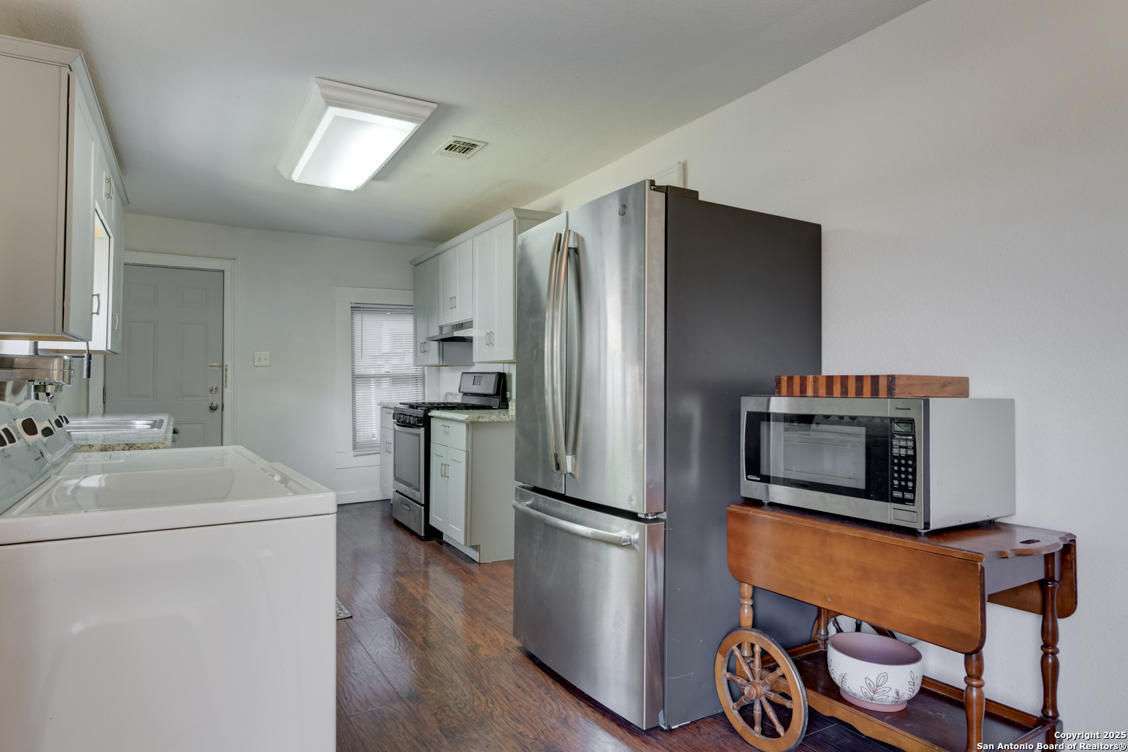 This charming cottage-style home greets you with a welcoming front porch shaded by a mature tree and framed by colorful landscaping. The inviting front porch offers a cozy spot to relax with room for seating. A long driveway with a gated carport provides ample parking and leads to the backyard. Inside, the living area features soaring 10-foot ceilings, abundant natural light, and original pine floors that bring warmth and character. A smart thermostat helps maintain ideal comfort year-round, and ceiling fans have been added in the living room and each bedroom for enhanced airflow. The spacious layout flows seamlessly to the kitchen, creating a comfortable and connected feel. The kitchen is bright and well-appointed with modern cabinetry, sleek appliances, an updated vent hood, and plenty of storage, and it extends into an open dining area with space for a large table and additional windows that bring in natural light. Just to the left of the front door, the primary suite offers a serene retreat with wood floors, soft natural light, and ample space for furnishings. The beautifully renovated bathroom showcases stylish tilework, a rainfall shower head, and a walk-in shower enclosed with glass, adding a touch of modern elegance. A second bedroom provides additional versatility and comfort, ideal for guests, a home office, or personal hobbies. Out back, a spacious yard offers endless possibilities with mature trees and room to play or garden. A sizable 10' x 18' storage shed adds practicality, while the fully fenced yard provides privacy. Thoughtful improvements throughout include refreshed exterior paint, an upgraded water heater, updated electrical service panel, hardwired smoke detectors on the same circuit, newly leveled foundation with 17 added concrete piers, injected foam insulation throughout the walls, and updated blinds on all windows for a polished finish. This home is located in the sought-after Dignowity Hill Historic District, offering the perfect blend of historic charm and modern comfort. It's just minutes from downtown's vibrant destinations including the Riverwalk, the Pearl, the Museum Reach, and the Botanical Gardens. Dignowity Park is only a few blocks away with a revitalized playground, sprawling dog park, and basketball court, while local coffee shops, restaurants, and boutiques are all within walking distance.