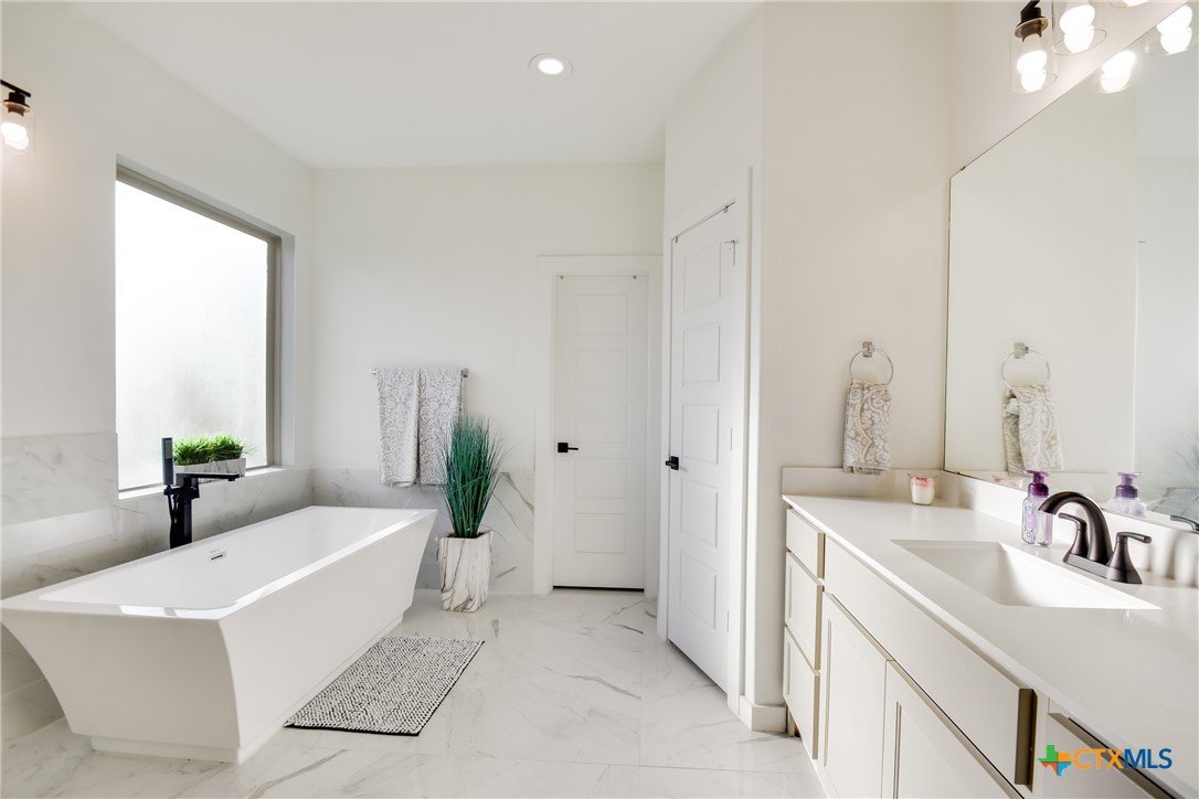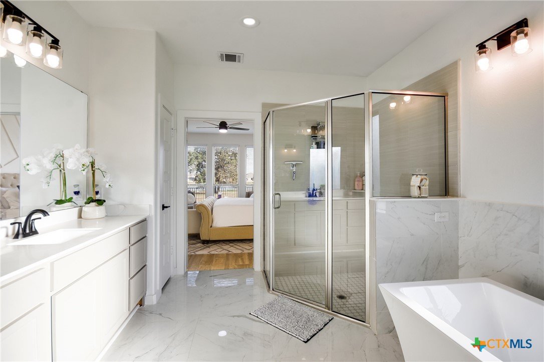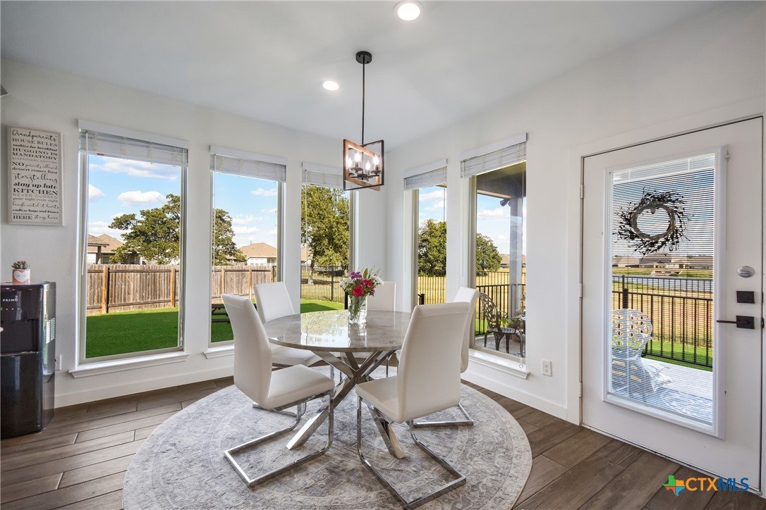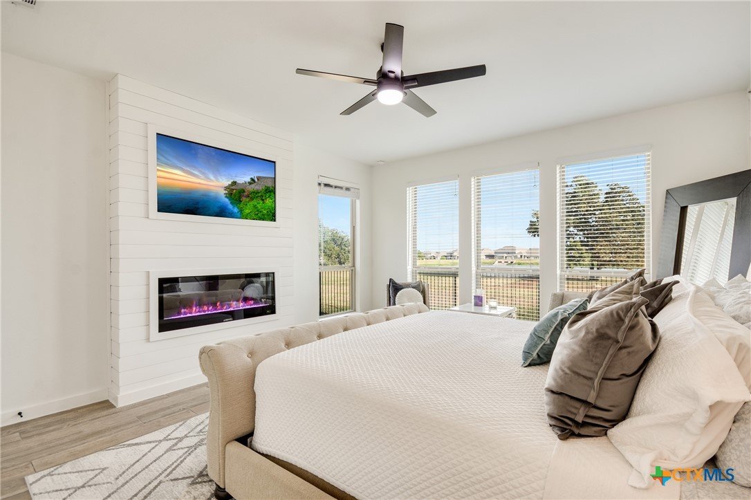 Buyer Incentive: Use our preferred mortgage lender and get 1% credit toward closing costs (see attached flyer). This home is on one of the best lots in Santa Rita, being situated on a cul-de-sac with no through traffic, on a very large lot (just under a quarter acre) and with a back yard that faces a large greenbelt area and pond, all of which combine to provide a feeling of seclusion when sitting in the back yard. The view in the mornings is just so unique, looking out at the greenbelt and pond, relaxing on the porch while drinking a morning cup of coffee or when entertaining friends in the evening; you will love it! The open floorplan is great for gatherings. This home is in immaculate condition and has had numerous owner upgrades added since the home was purchased (over $57000 of improvements and upgrades). Flooring (changed carpet to tile) $13000, Master Bath Remodeled (floor, tub and commode) $8000, Baseboard and Door Upgrades $4500, Door Hardware Upgrads $1500, Light Fixture Upgrades $1000, Bedroom Fans Added $2450, Wood Accents added to all Bedrooms, Dining, Living and Game rooms $5000, Electric Fireplace added to Master Bedroom $2500, Garage floor epoxied $2000, Stove and Dishwasher upgraded $2500, Fresh paint throughout (2023) $12000, Kitchen Backsplash added $1000, Master closet shelves $1500, plus a considerable amount of landscape work was contracted. The wood accents added to the rooms make each room unique and different and must be seen to be appreciated. The shelves added to the master closet are super helpful in allowing you to stay organized. So don't miss the opportunity to view a truly unique and immaculate home in the award winning Santa Rita Ranch community with all of its amenities and awards.